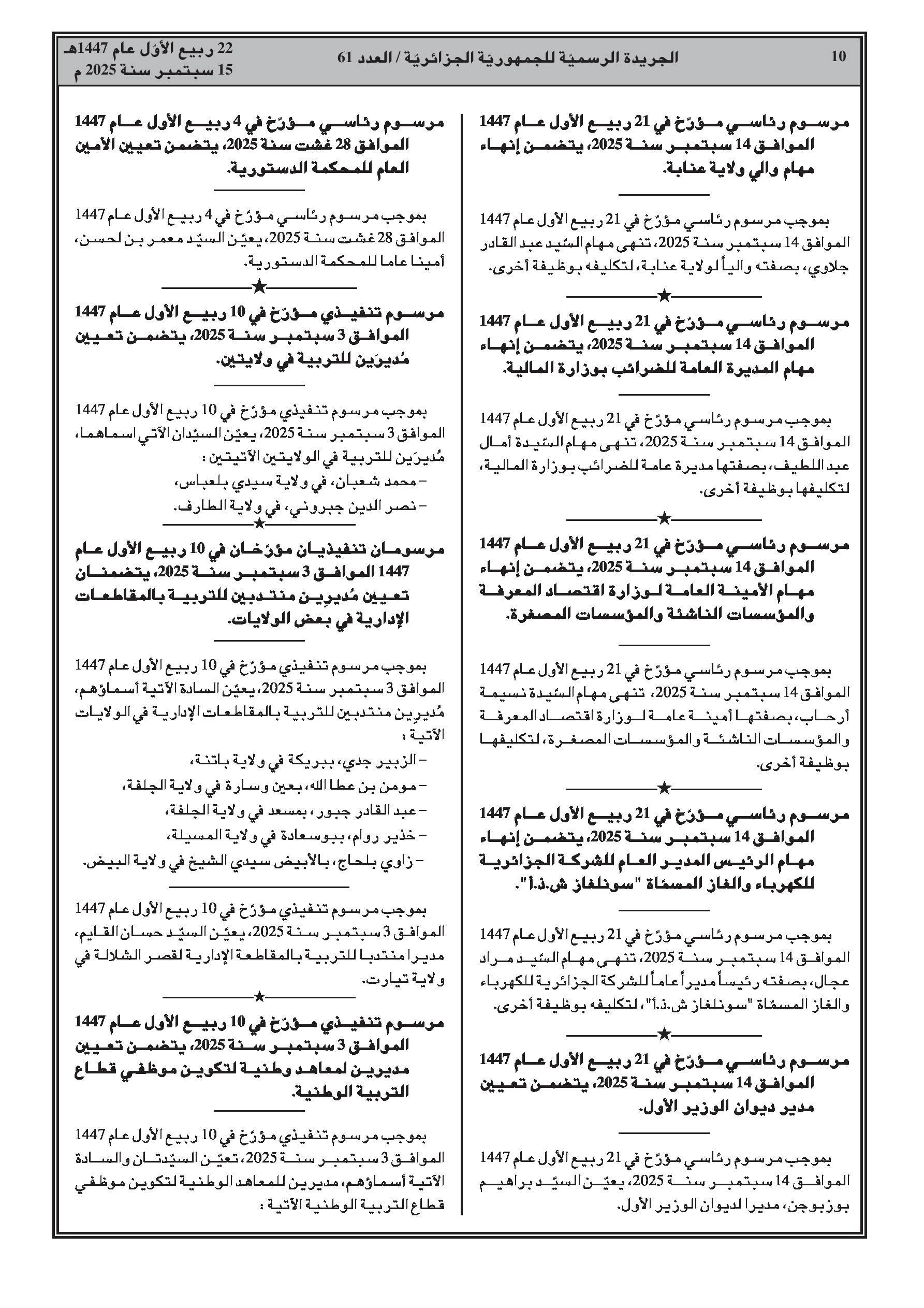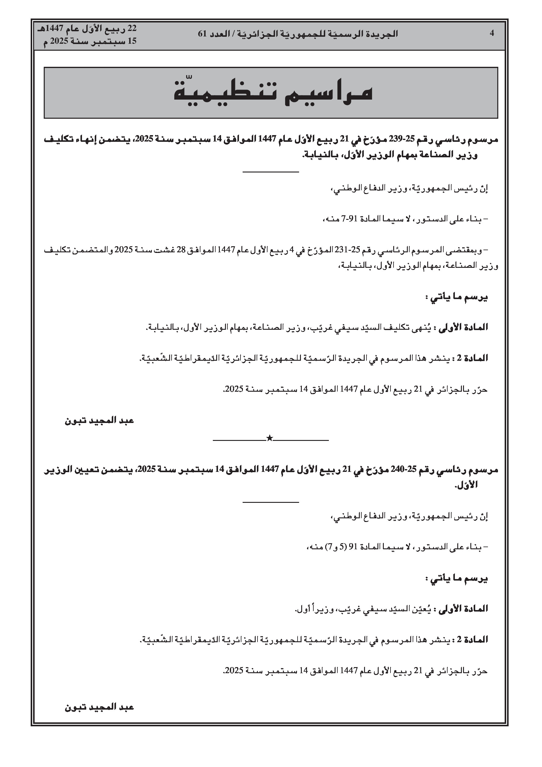 - مرسوم رئاسي رقم 25-239 ينهي مهام وزير الصناعة كوزير أول بالنيابة.