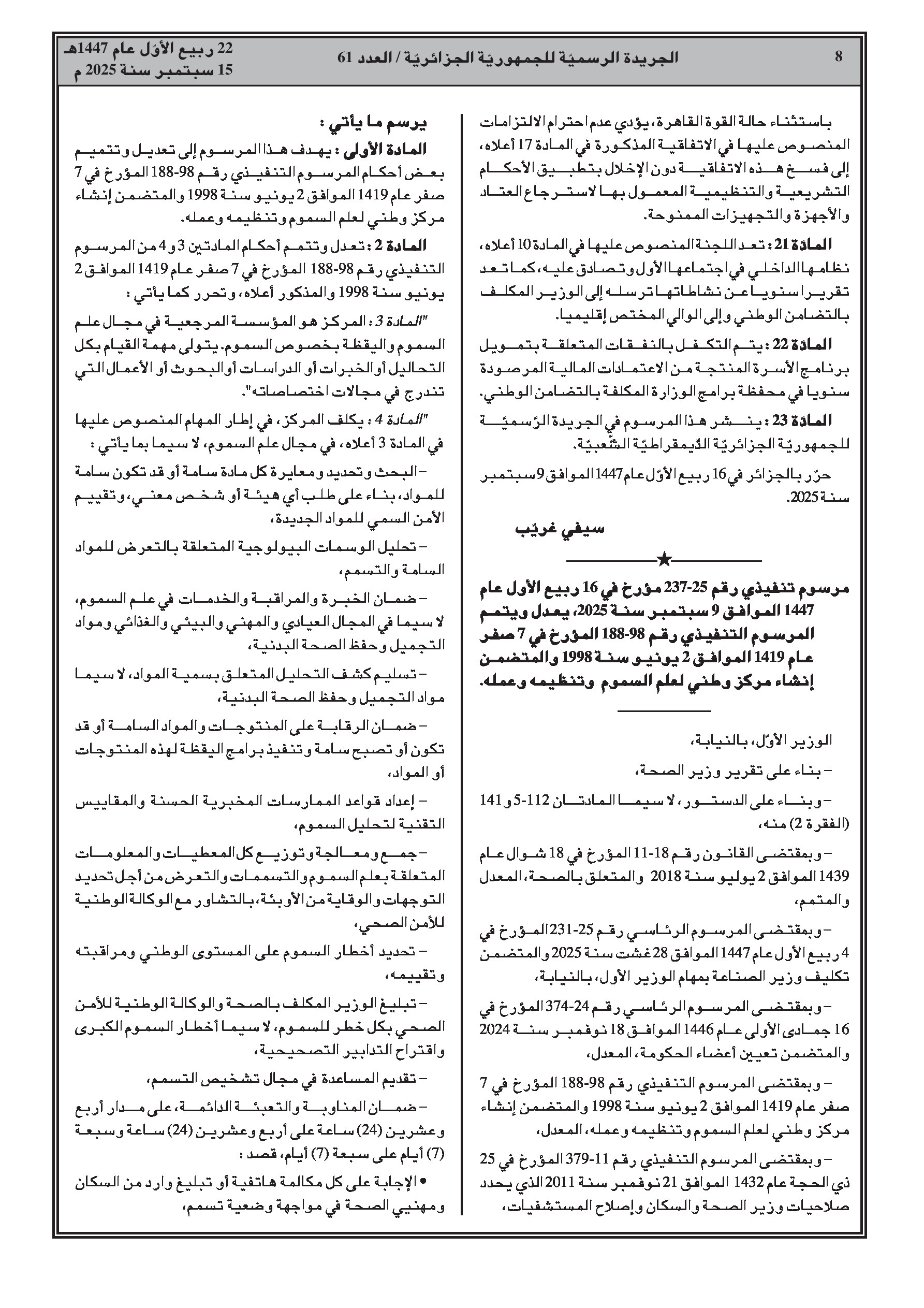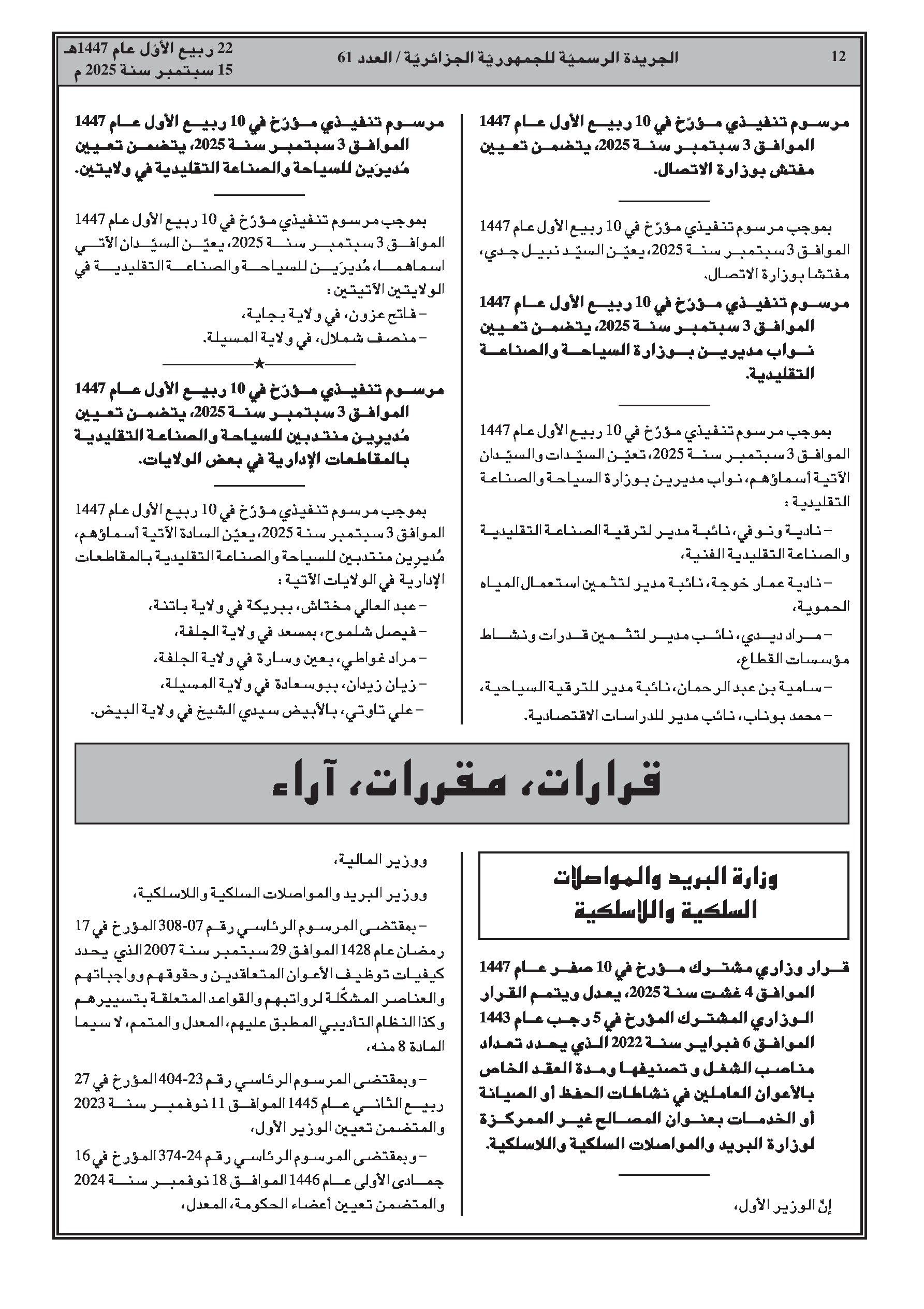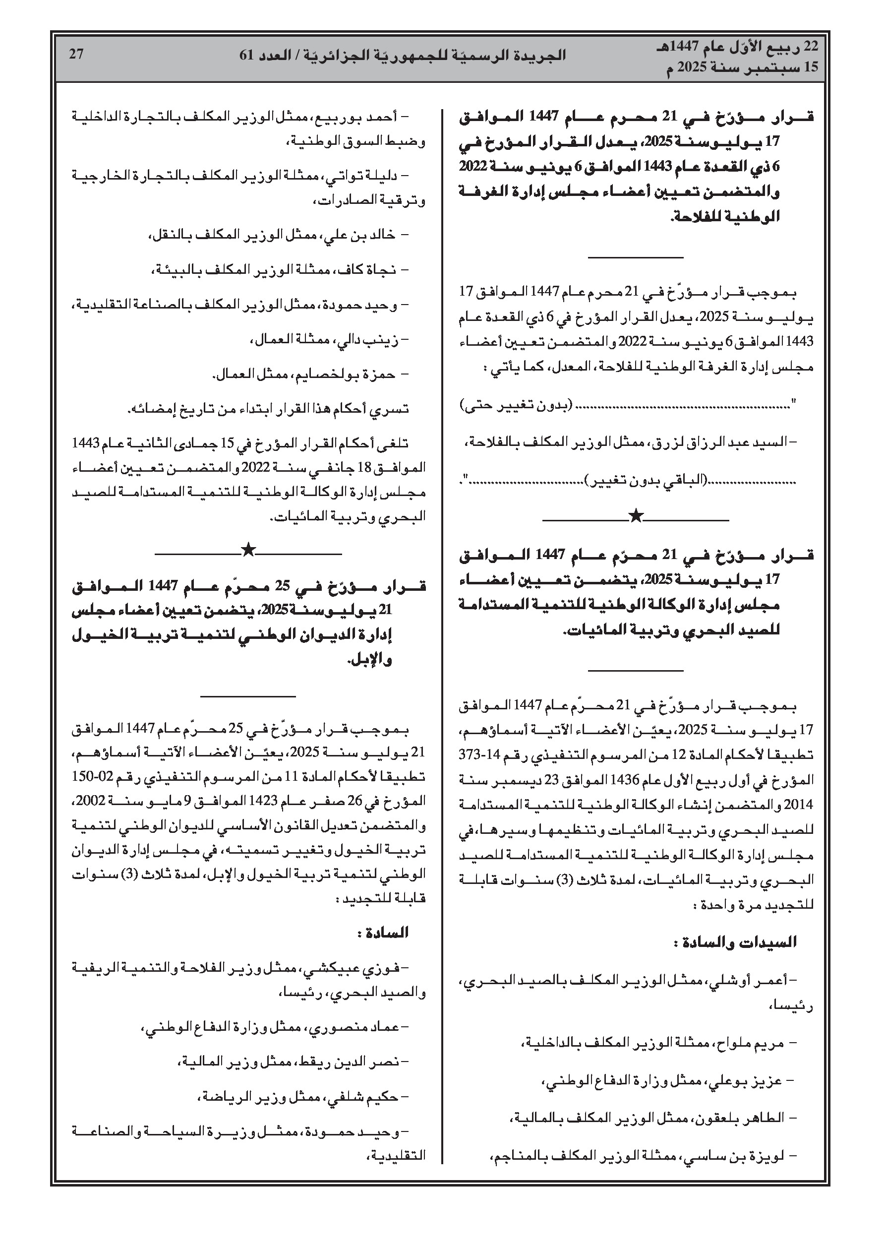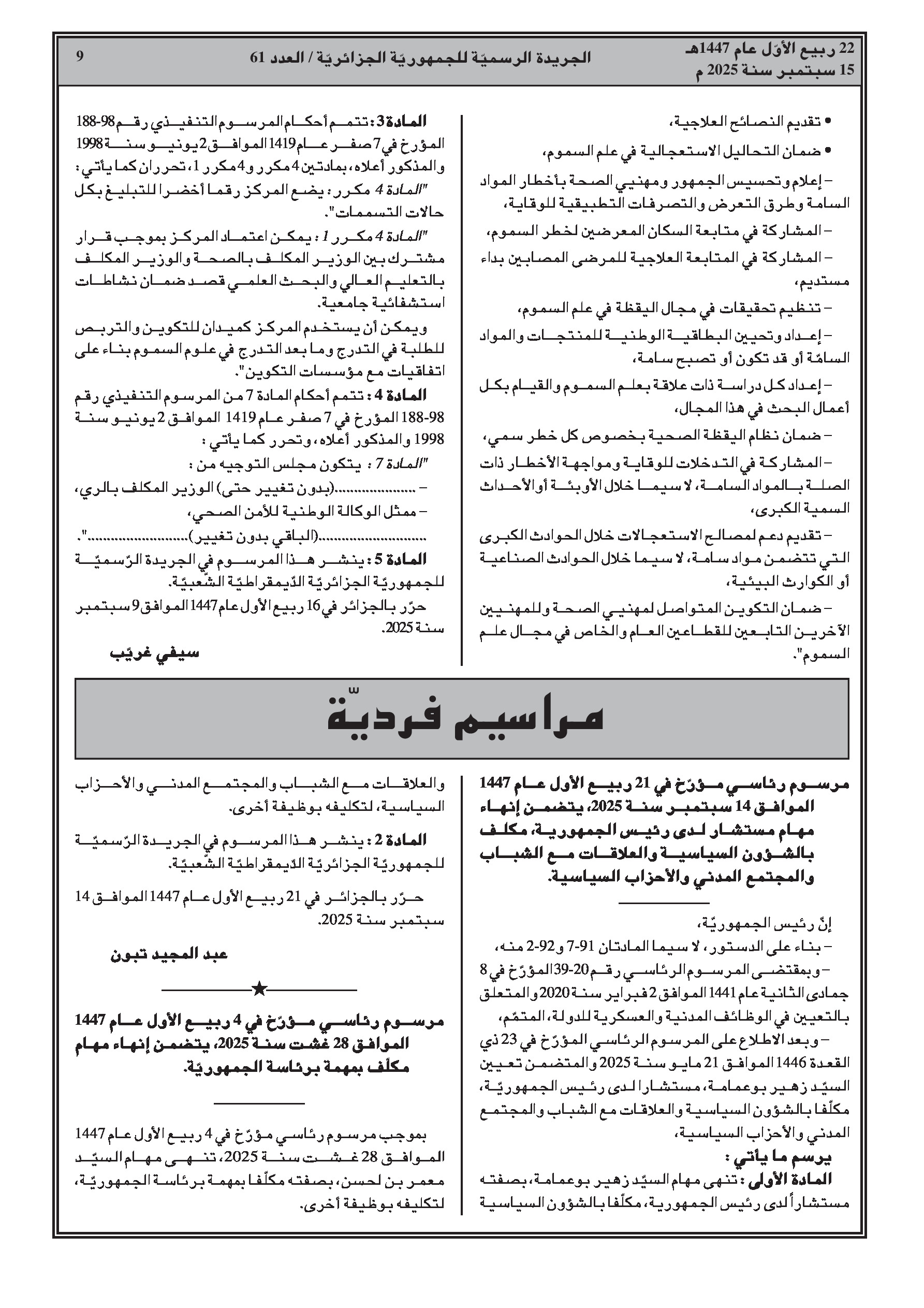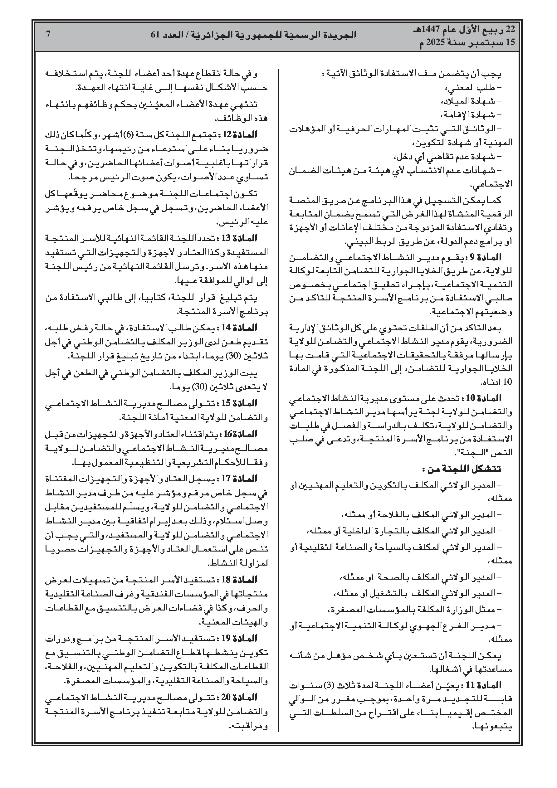 العدد 61 من الجريدة الرسمية الجزائرية الصادرة بتاريخ 15 سبتمبر 2025: تعديل حكومي، إطلاق برنامج دعم الأسر المنتجة، وتوسيع مهام هيئات وطنية