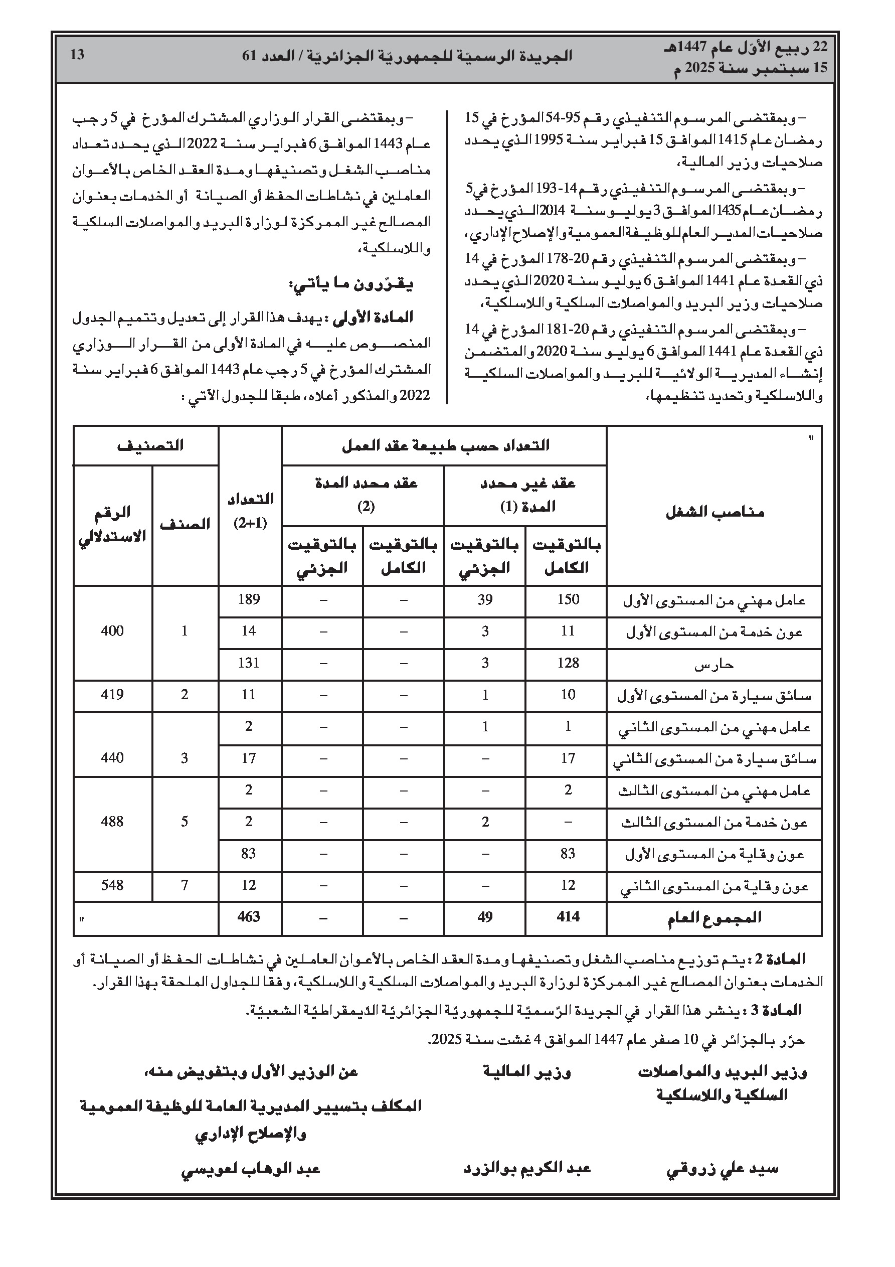 - البريد والمواصلات: تعديل القرار المحدد لتعداد مناصب الشغل وتصنيفها ومدة عقود الأعوان المتعاقدين في المصالح الخارجية للوزارة.
