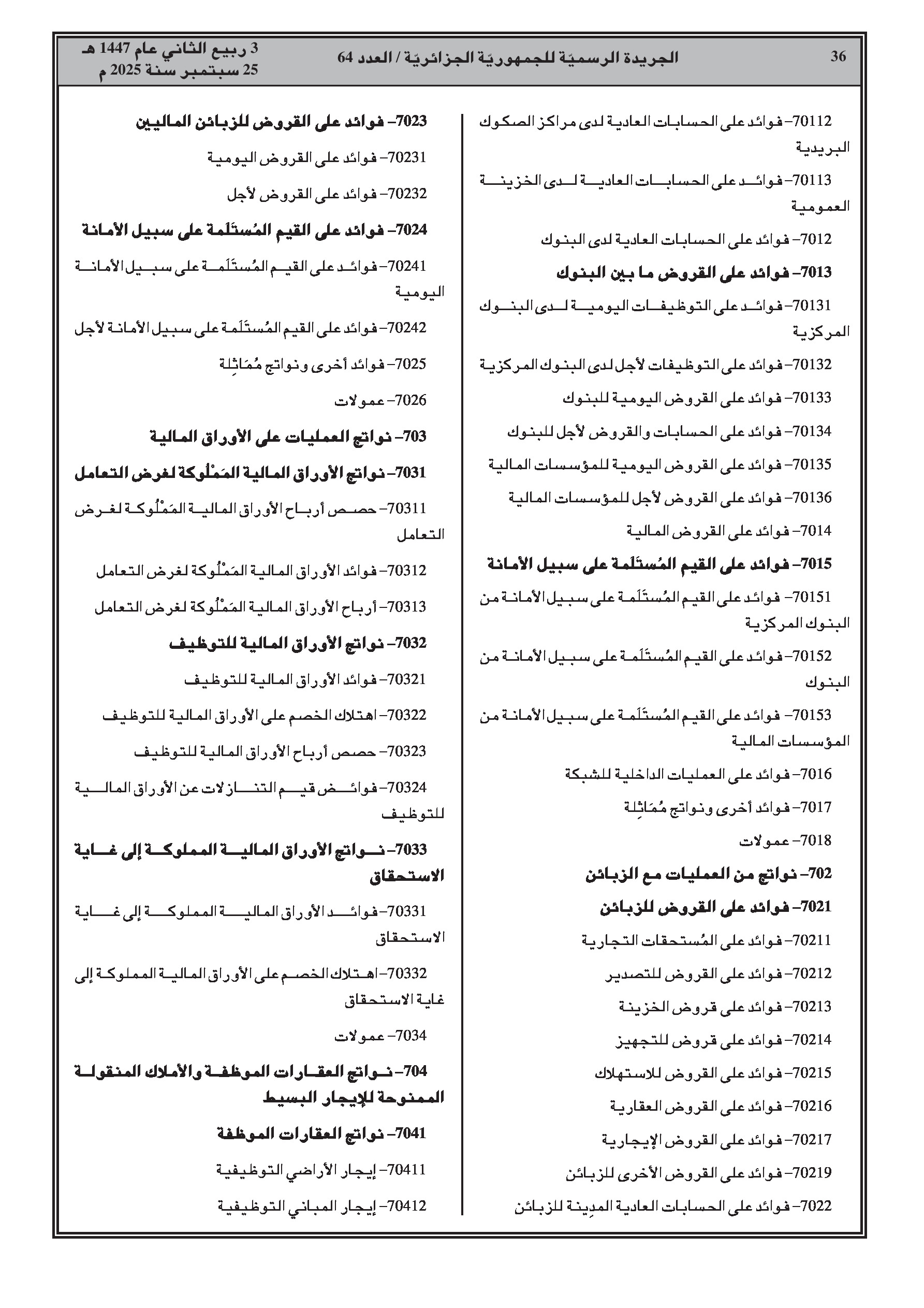 إصدار ثلاثة لوائح جديدة من بنك الجزائر لتحديث المحاسبة البنكية، وتحويل اعتمادات مالية هامة لقطاع الفلاحة، بالإضافة إلى سلسلة واسعة من إنهاء المهام والتعيينات في مختلف القطاعات الحكومية.