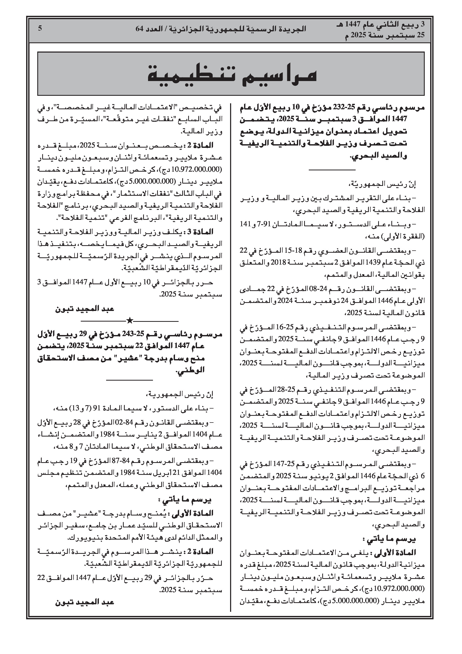 مرسوم رئاسي يأمر بتحويل اعتمادات مالية من ميزانية الدولة لدعم برامج الاستثمار في وزارة الفلاحة والتنمية الريفية والصيد البحري.