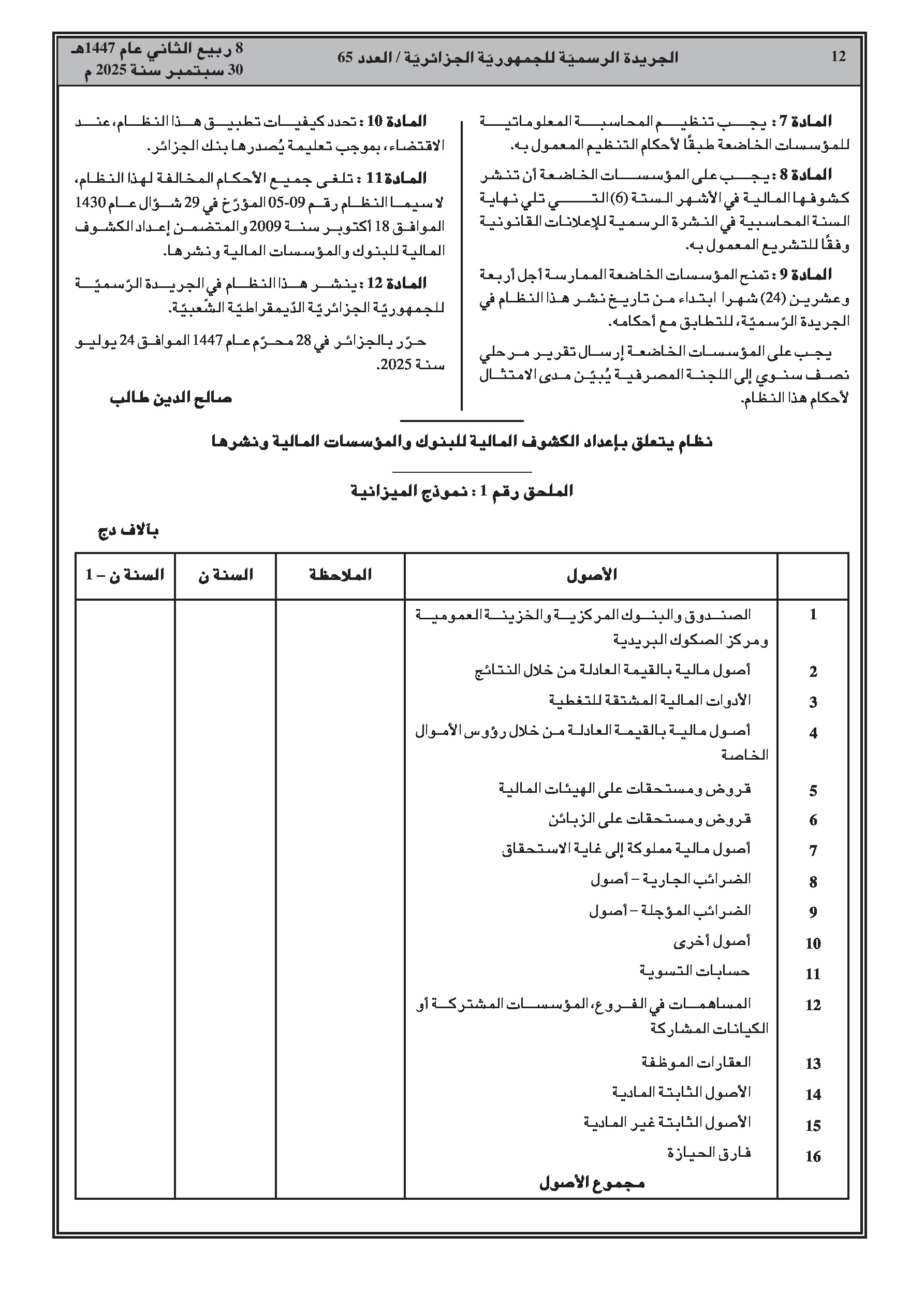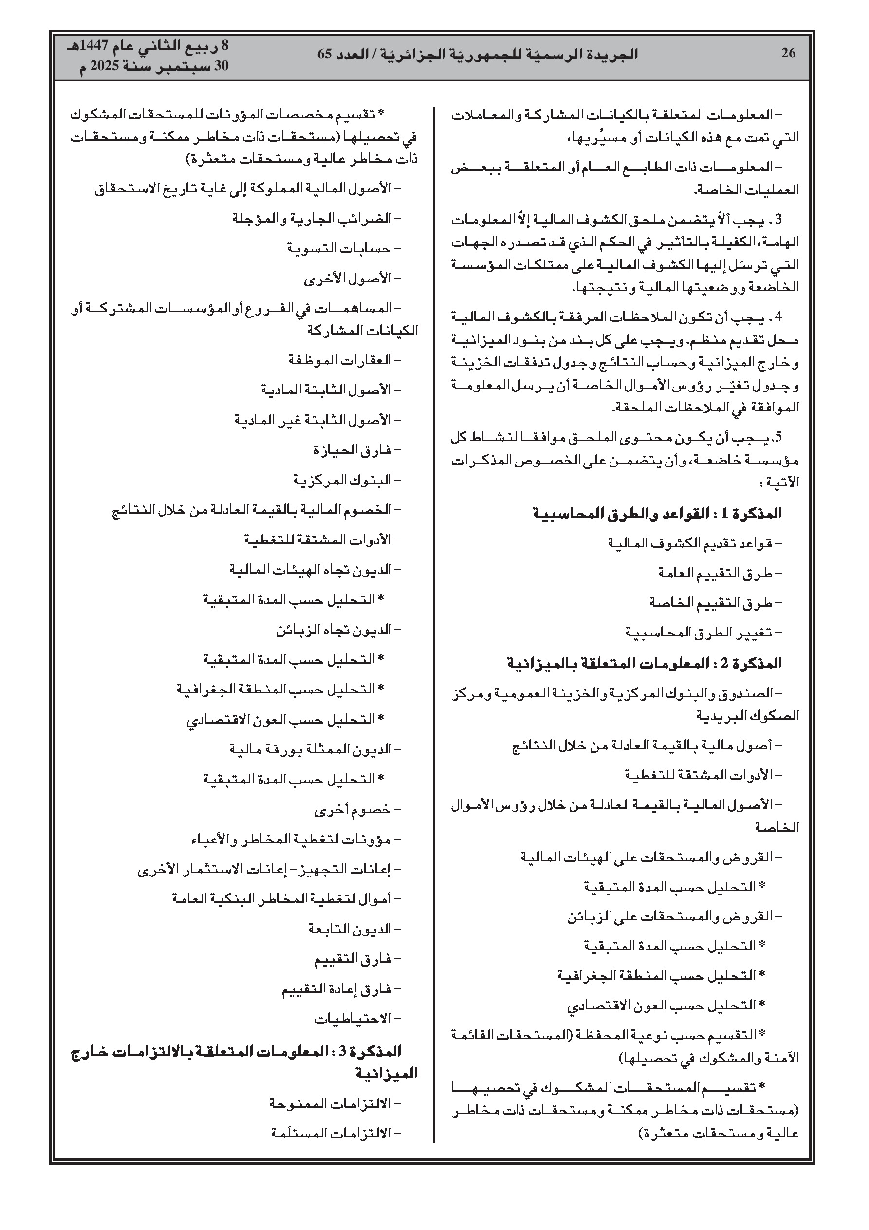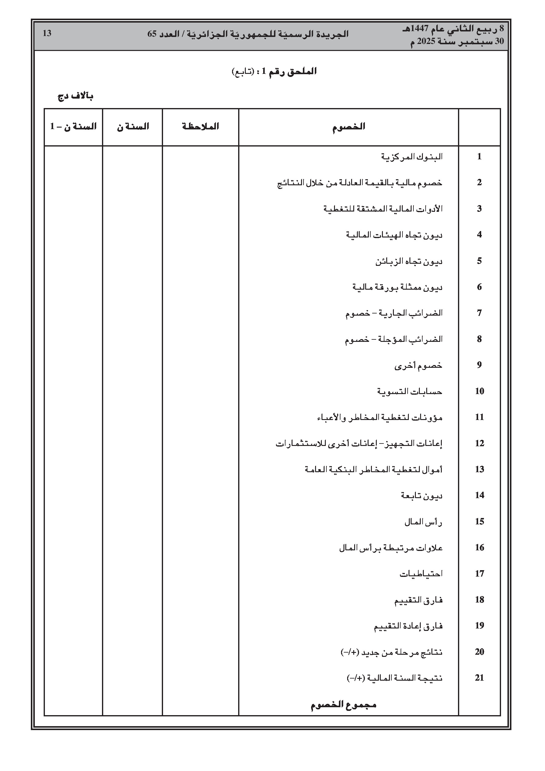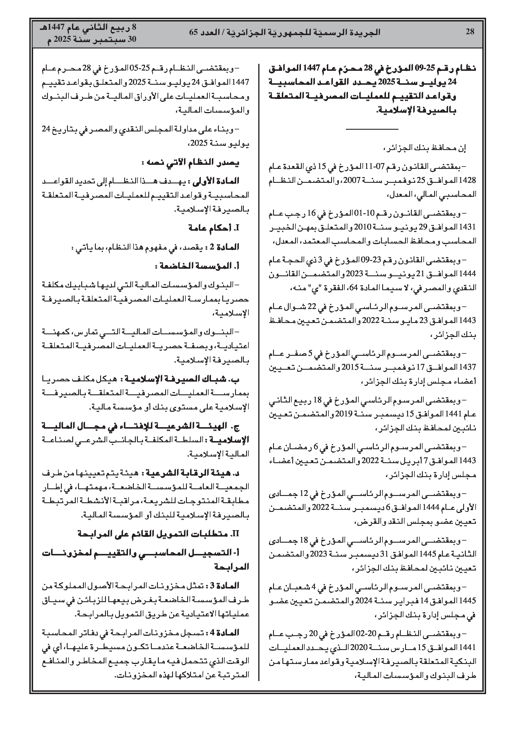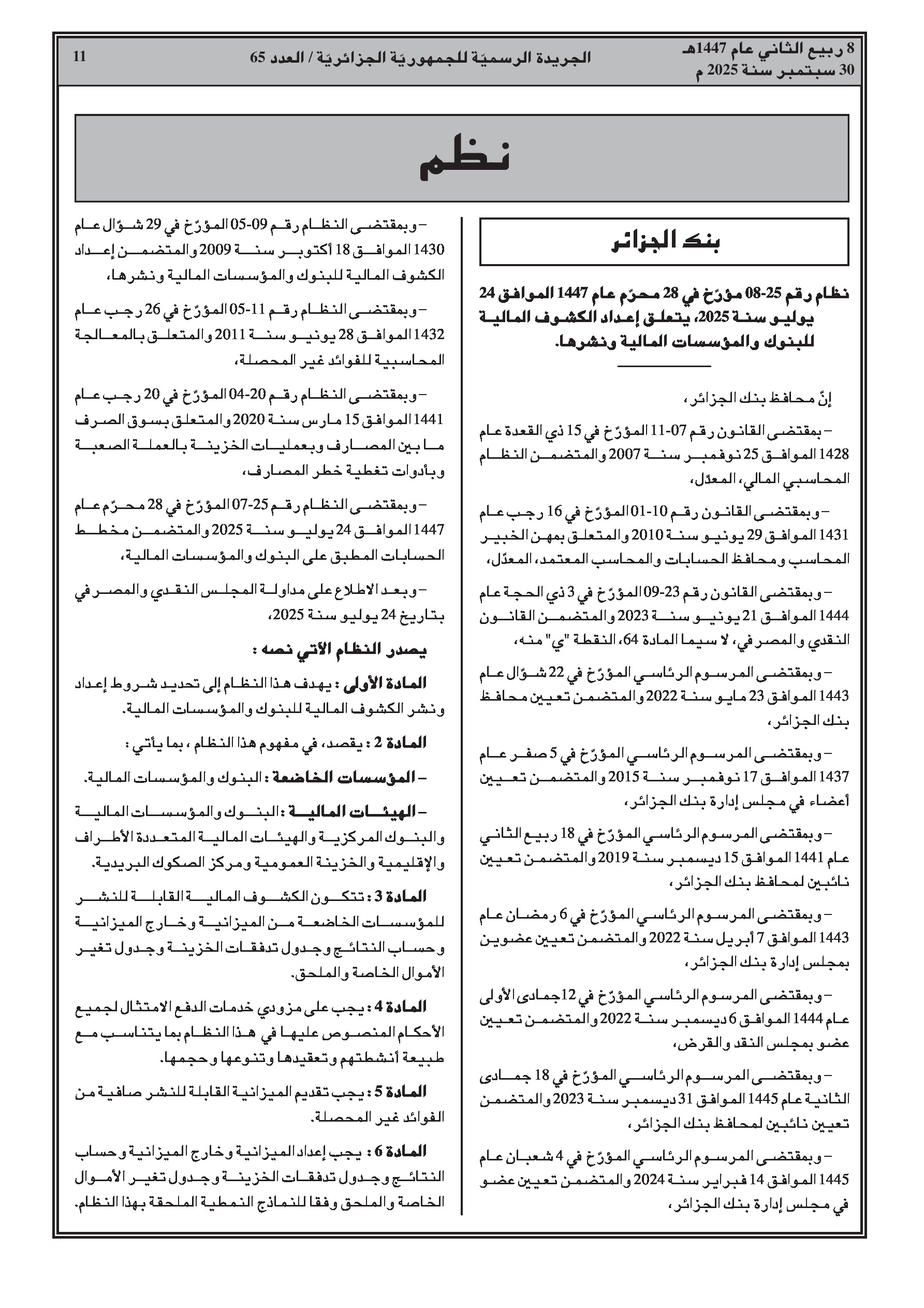العدد 65 من الجريدة الرسمية الجزائرية الصادرة بتاريخ 30 سبتمبر 2025: تنظيمات بنكية جديدة: إصلاح شامل للقوائم المالية وقواعد الصيرفة الإسلامية