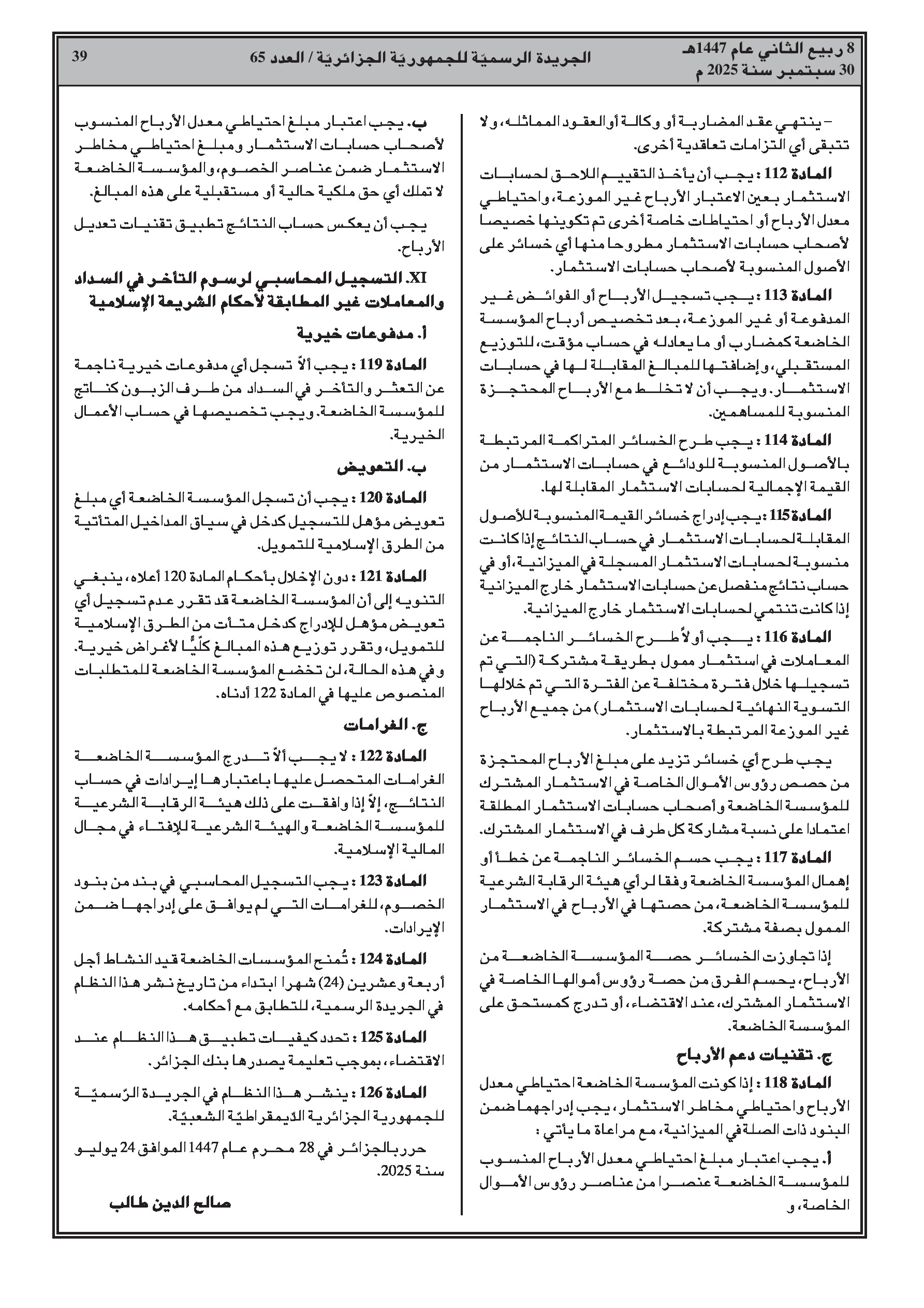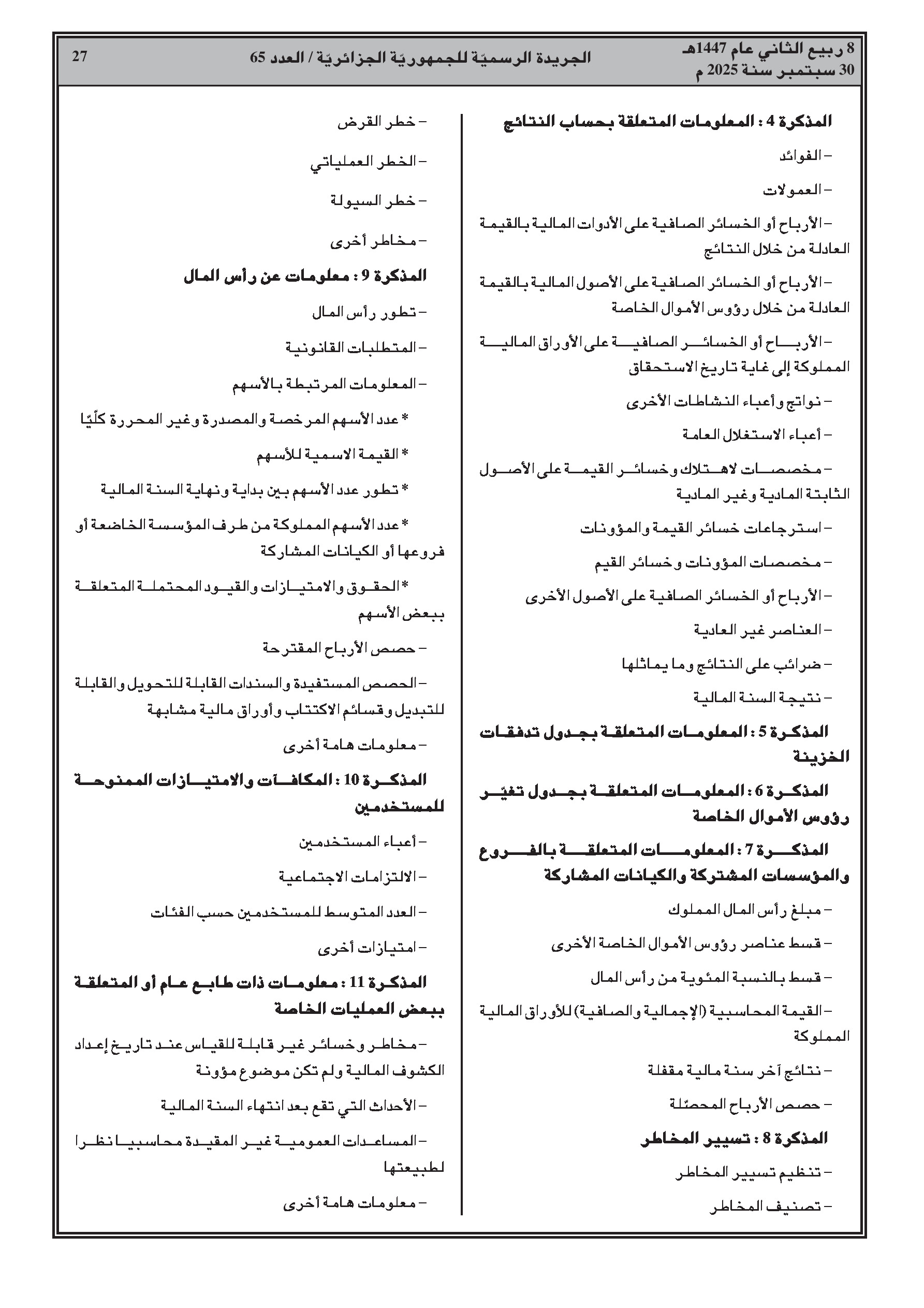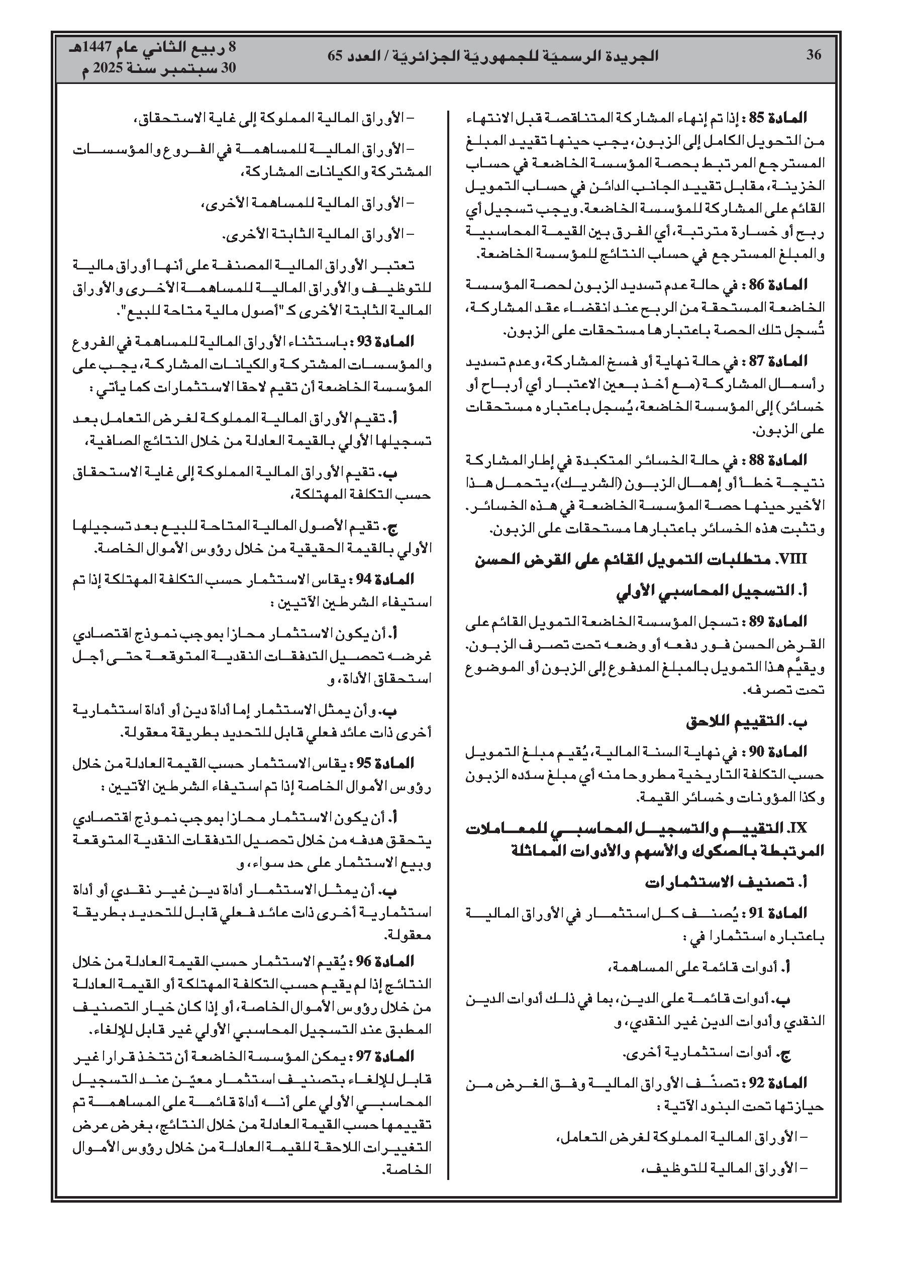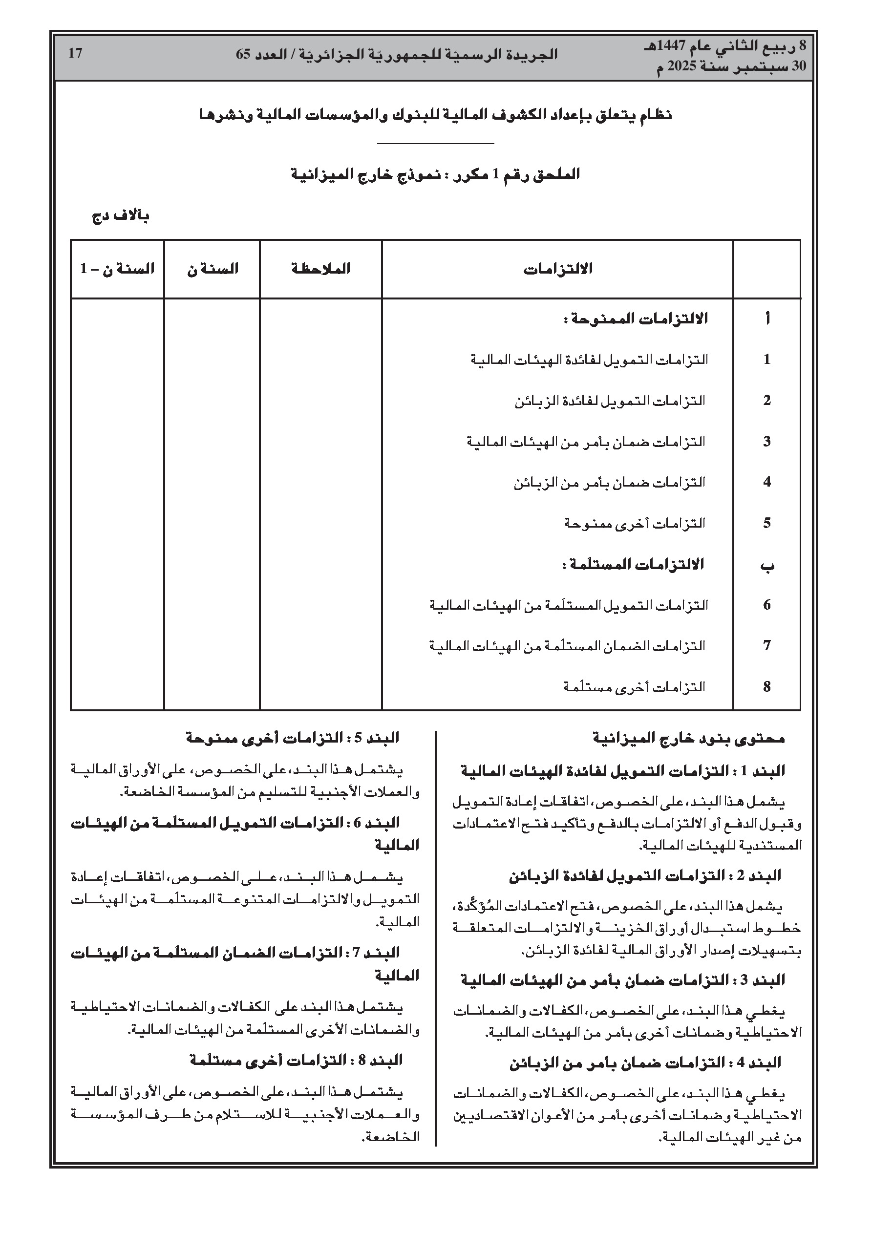 العدد 65 من الجريدة الرسمية الجزائرية الصادرة بتاريخ 30 سبتمبر 2025: تنظيمات بنكية جديدة: إصلاح شامل للقوائم المالية وقواعد الصيرفة الإسلامية