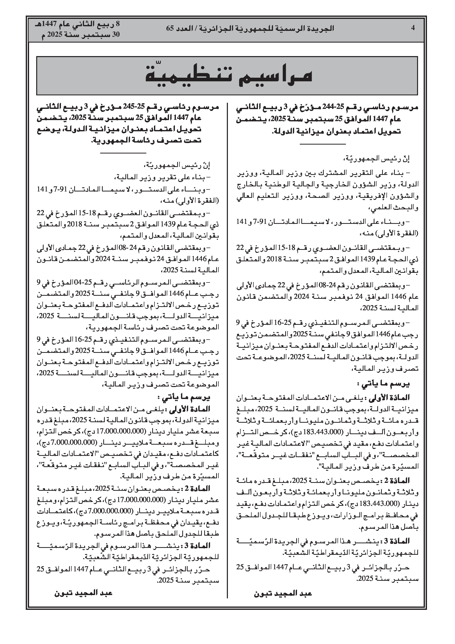 مراسيم رئاسية تجيز تحويل اعتمادات مالية ضمن ميزانية الدولة لعام 2025 لصالح رئاسة الجمهورية وقطاعات وزارية أخرى. كما تم الإعلان عن سلسلة من التعيينات وإنهاء المهام في مناصب عليا، أبرزها في وزارة المالية والمؤسسات الجامعية.