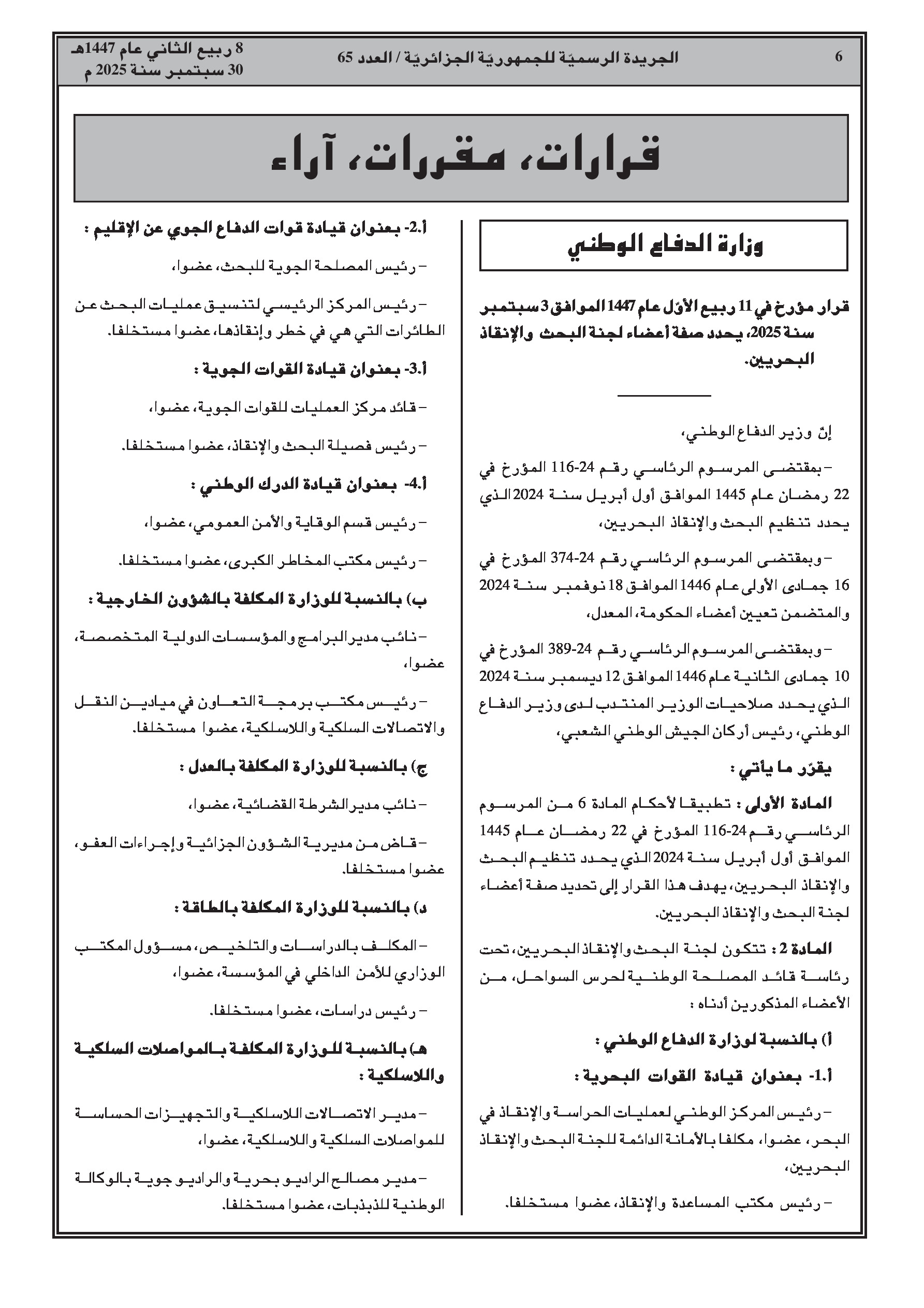 - الدفاع: تحديد أعضاء لجنة البحث والإنقاذ البحري من مختلف الهيئات العسكرية والمدنية.