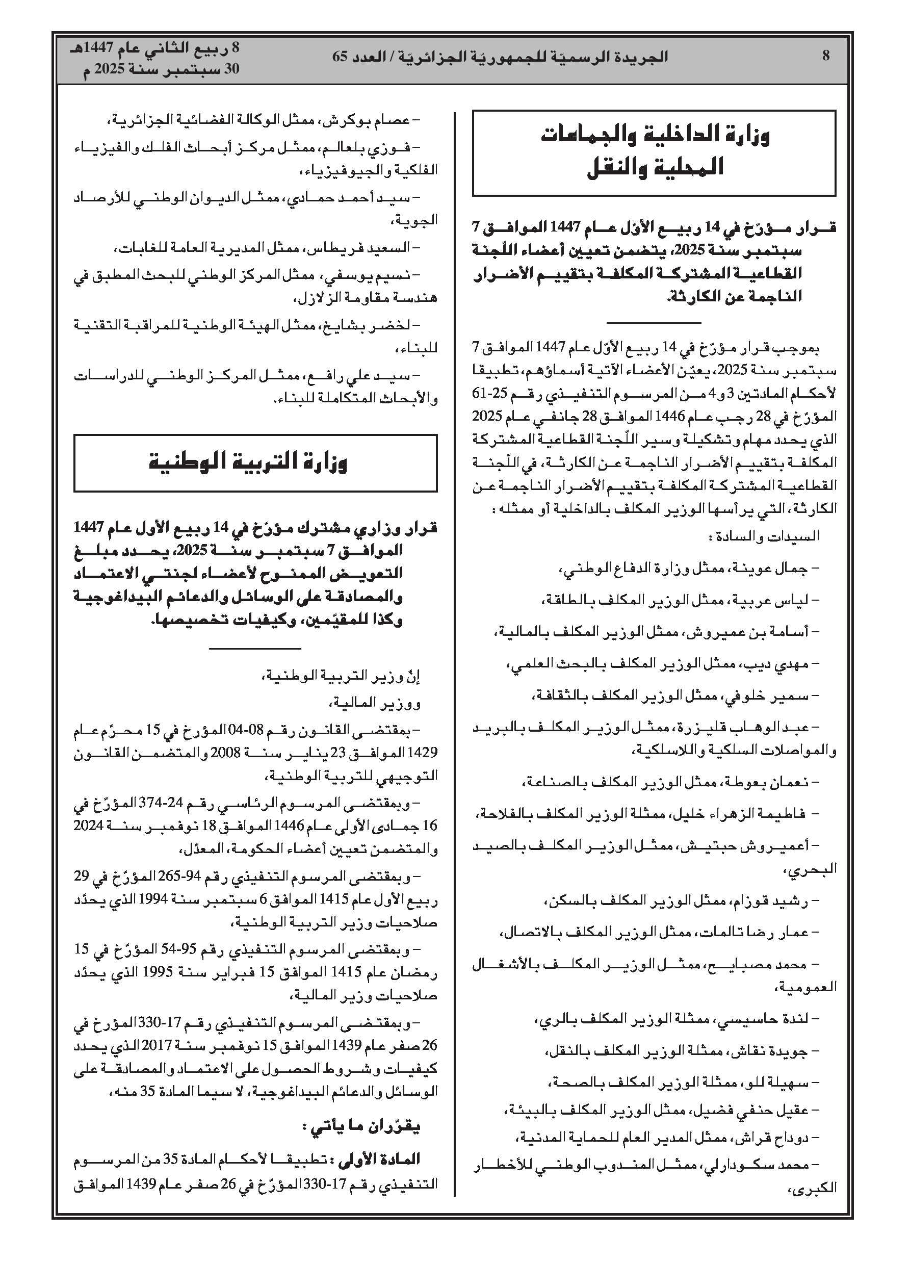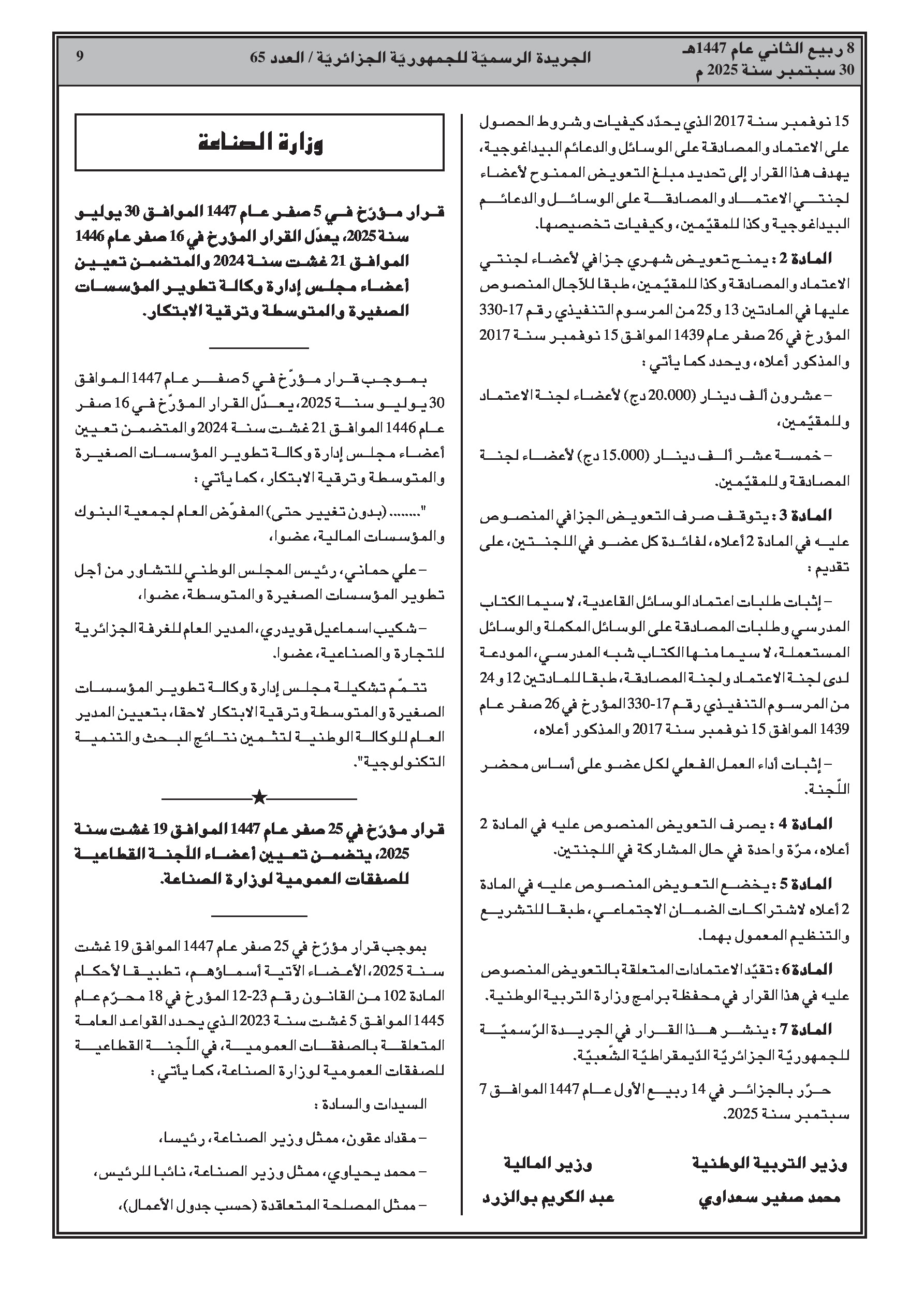 - التعليم: تحديد تعويض شهري لأعضاء لجان اعتماد الوسائل التعليمية (20,000 دج) والمصادقة عليها (15,000 دج).