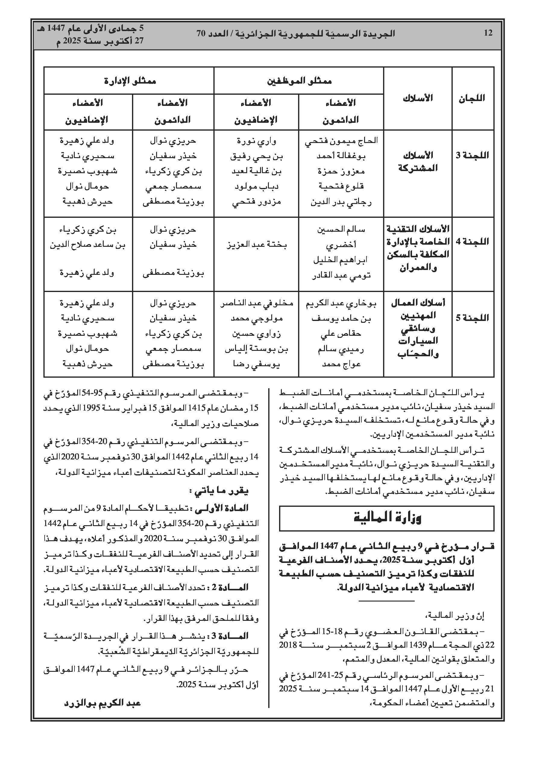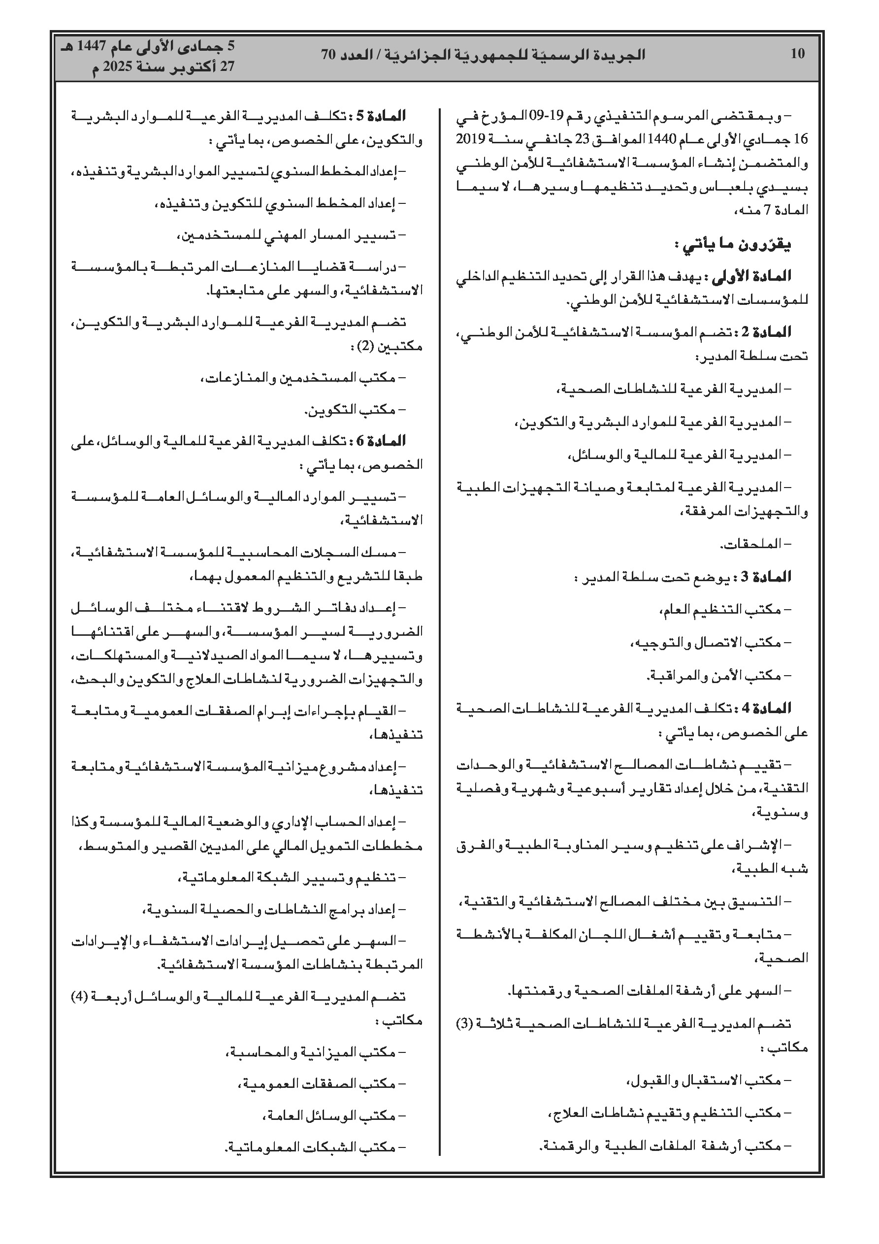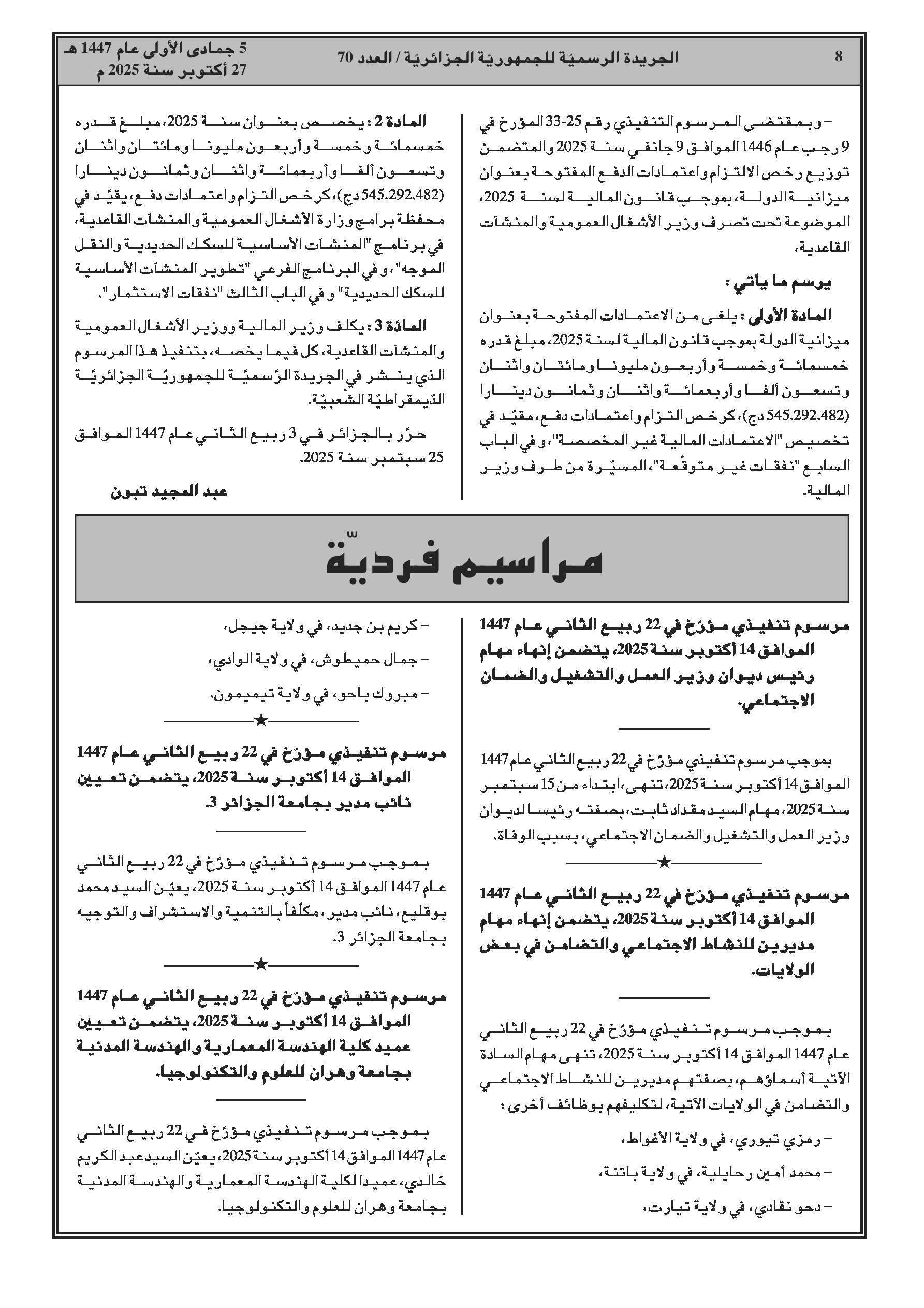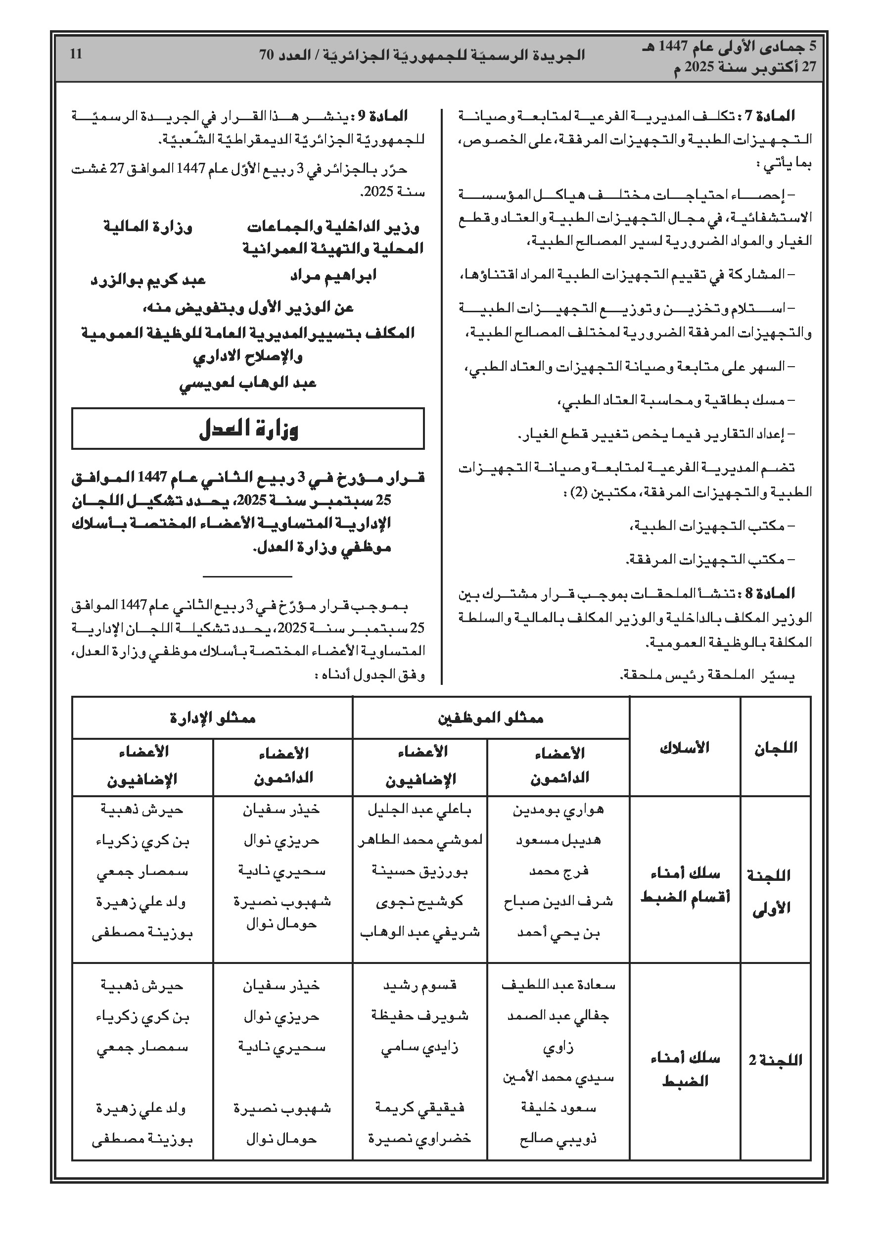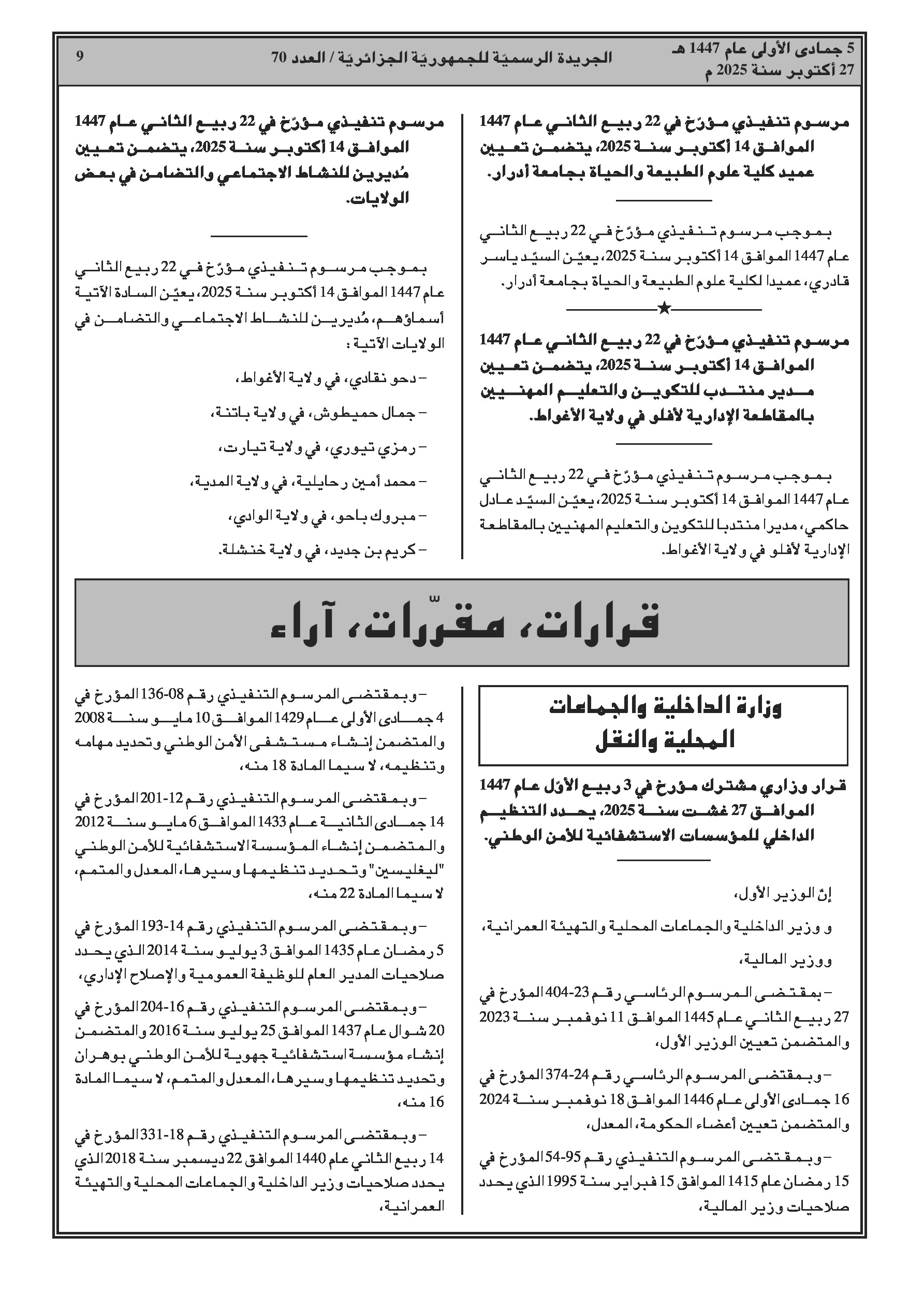 إنهاء مهام رئيس ديوان وزير العمل ومديري النشاط الاجتماعي في عدة ولايات، وتعيينات جديدة لنواب مديري وعمداء جامعات. قرار مشترك يفصل التنظيم الداخلي للمؤسسات الاستشفائية للأمن الوطني. كما تم تحديد تشكيلة اللجان المتساوية الأعضاء لموظفي وزارة العدل.