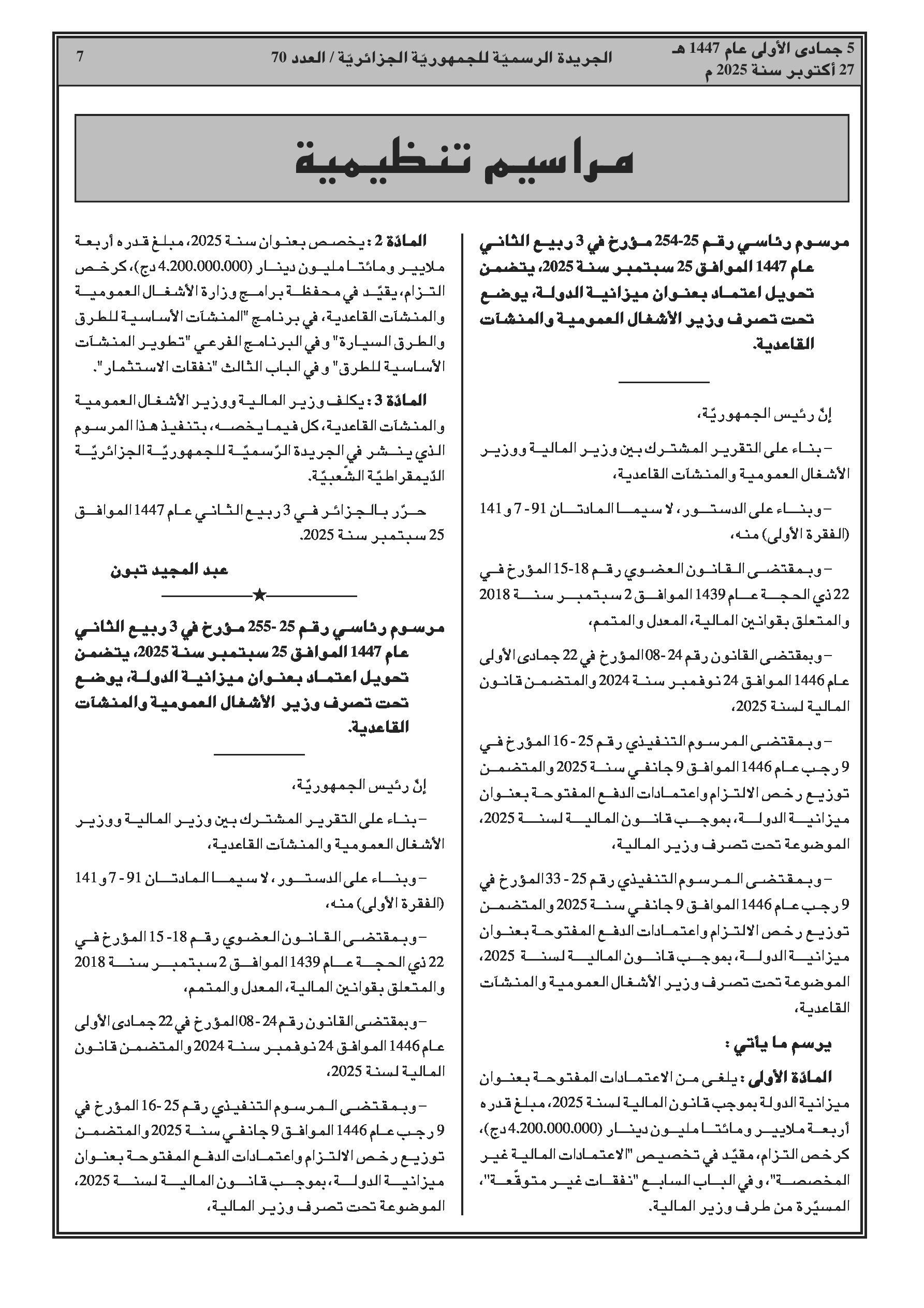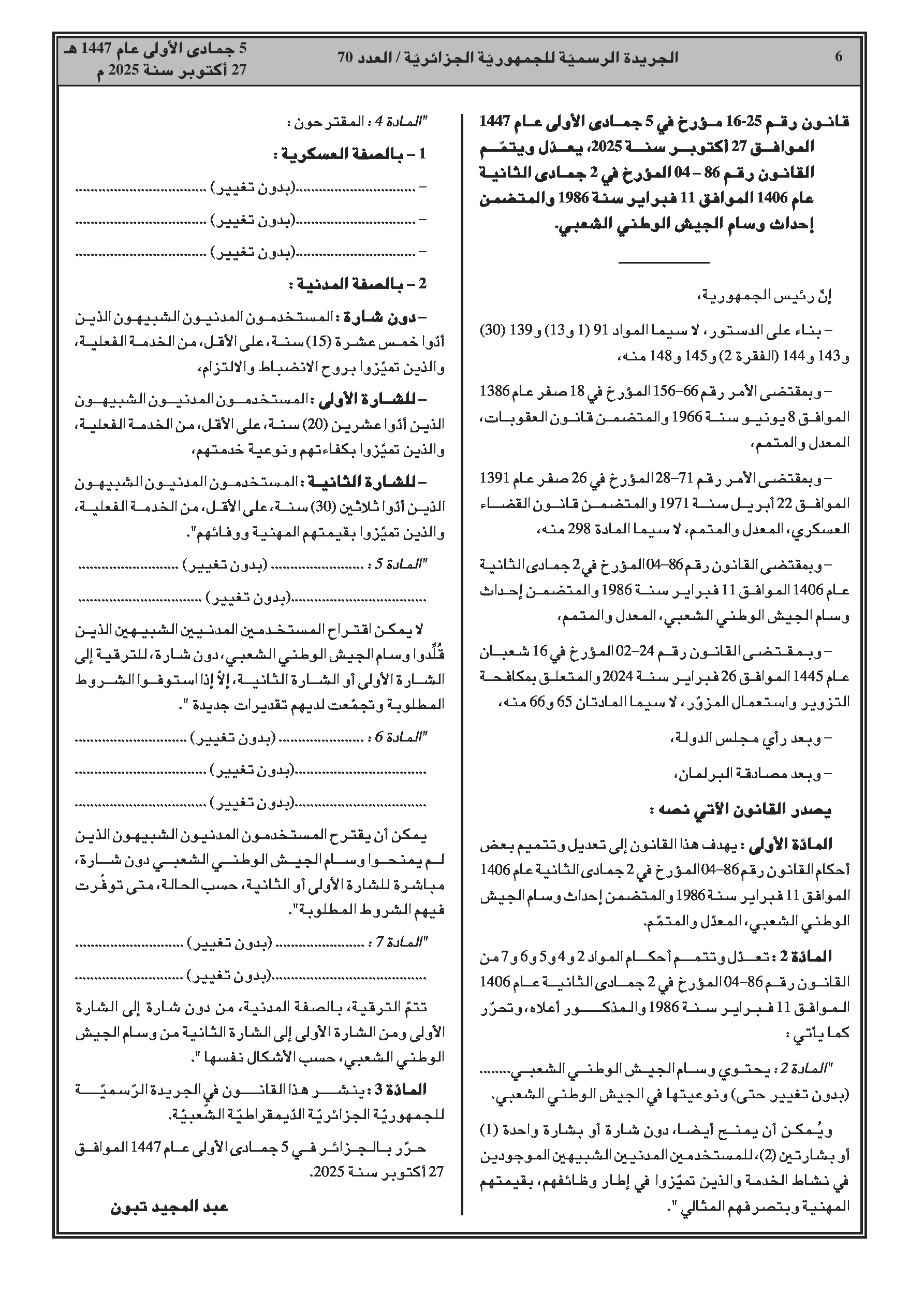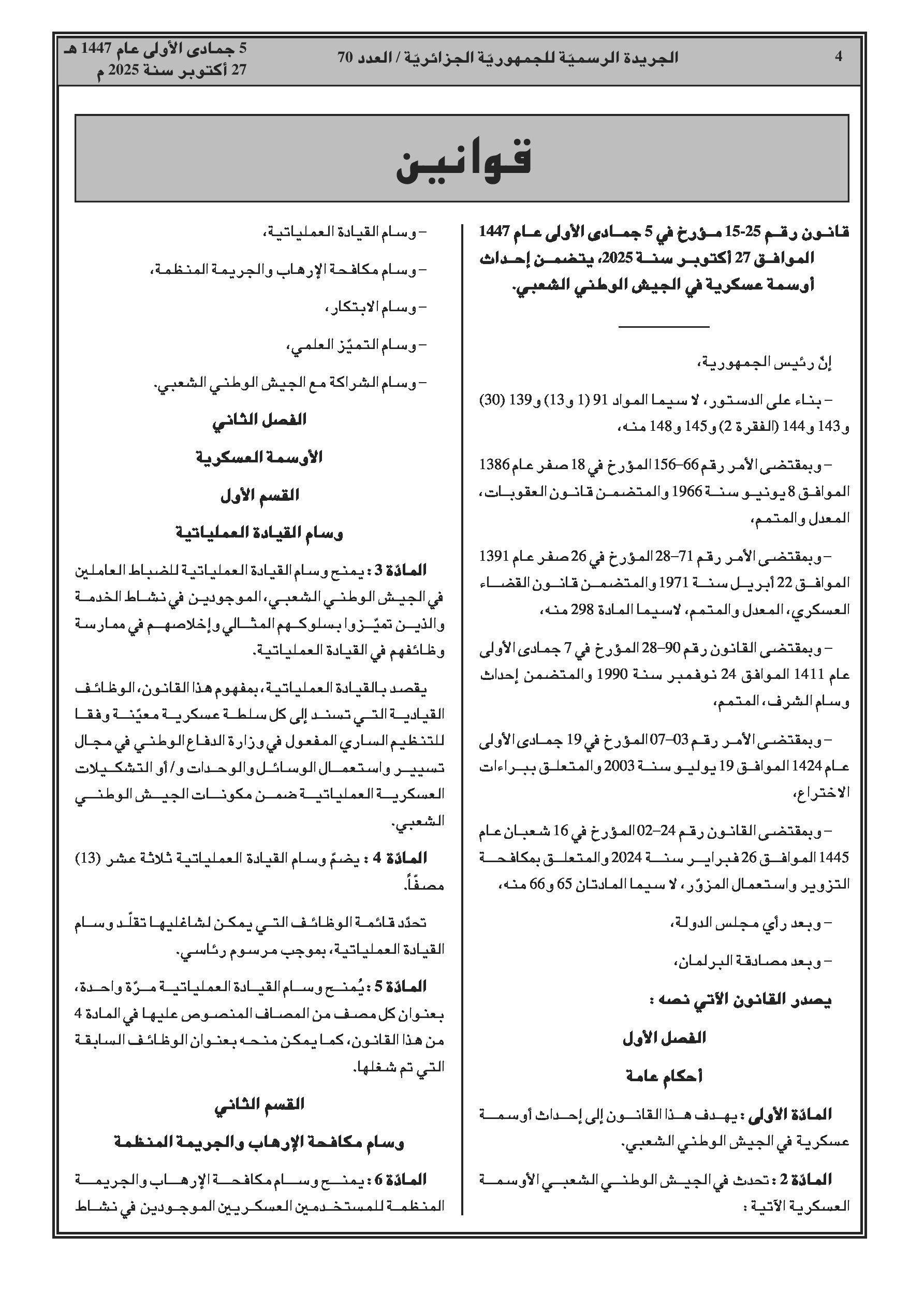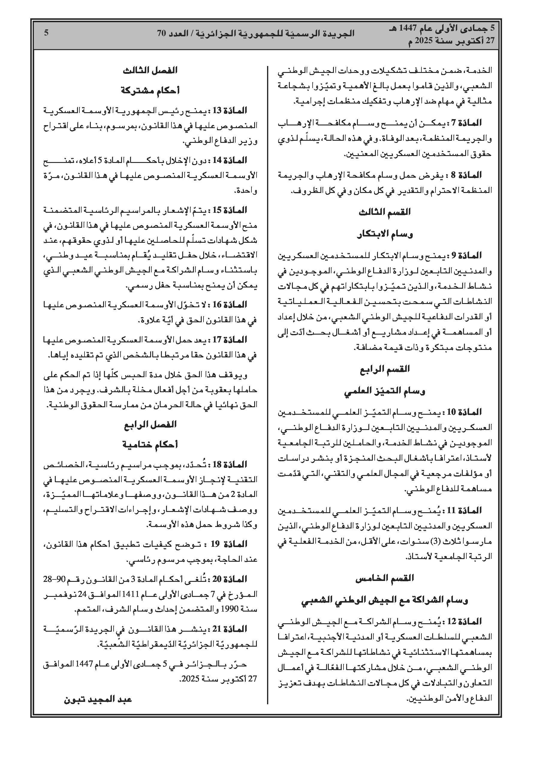 العدد 70 من الجريدة الرسمية الجزائرية الصادرة بتاريخ 27 أكتوبر 2025: أوسمة عسكرية جديدة لتكريم الخدمة، الابتكار والشراكة في الجيش الوطني الشعبي