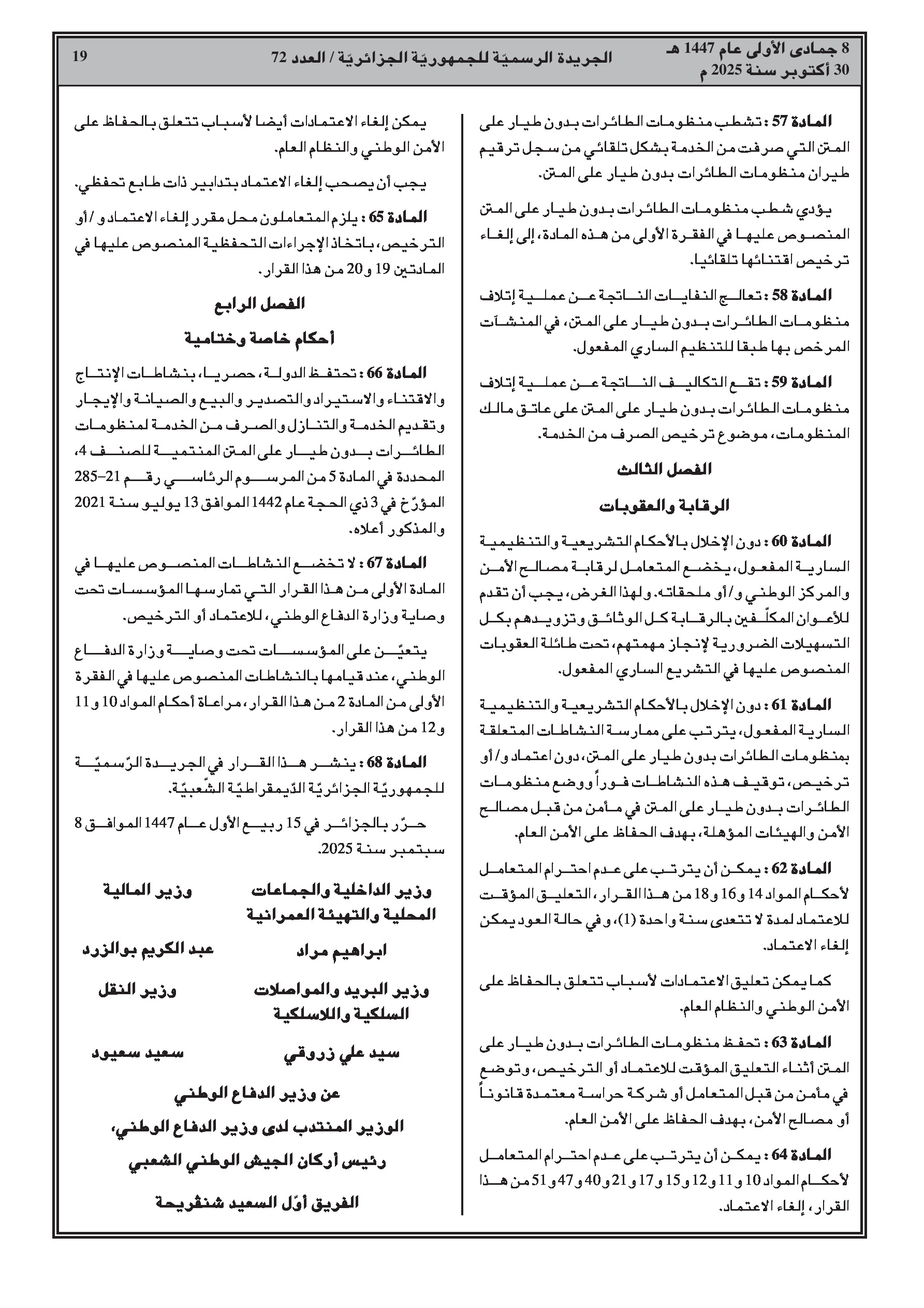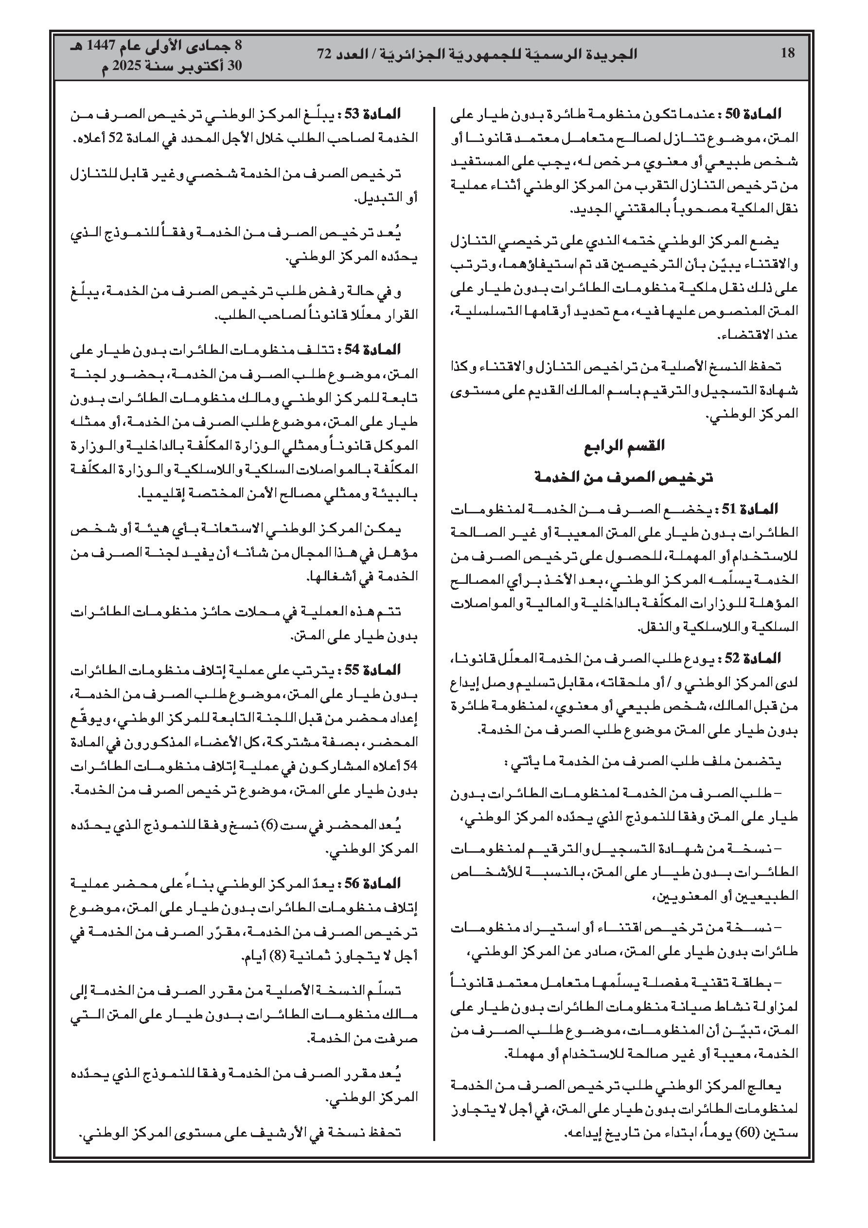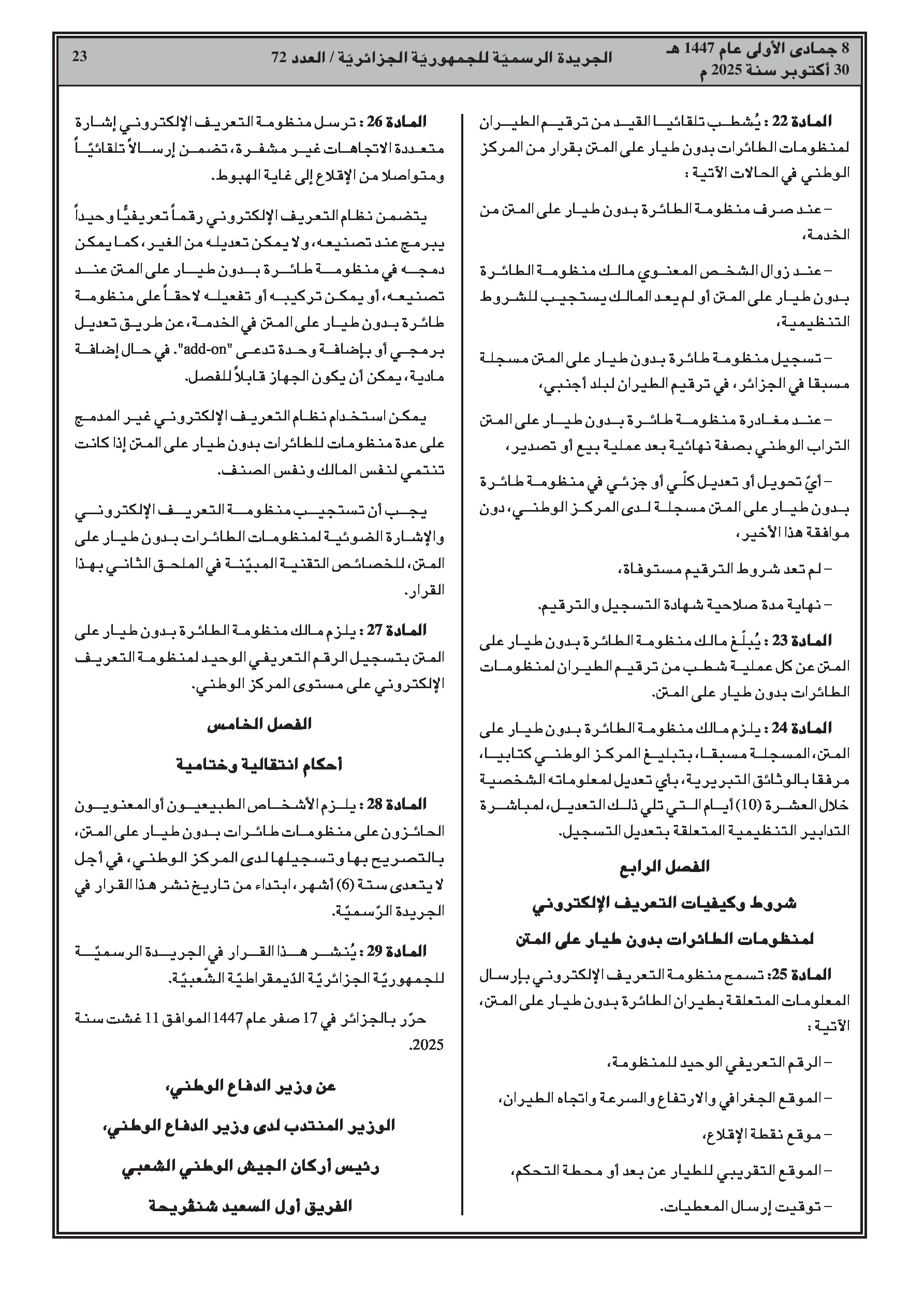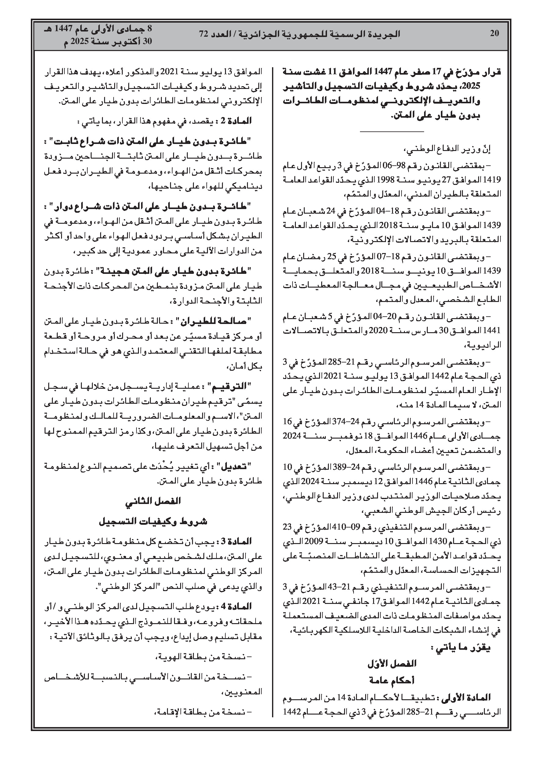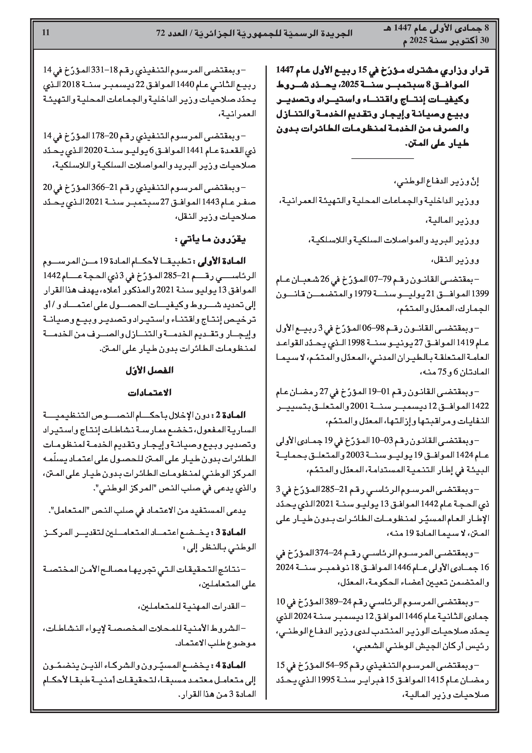 هذا العدد يقدم إطارًا قانونيًا شاملًا للطائرات بدون طيار، يغطي كل شيء من الشراء والتسجيل إلى الاستخدام. كما تم تعيين رئيس مدير عام جديد لسوناطراك وتخصيص ميزانية هامة للأشغال العمومية.