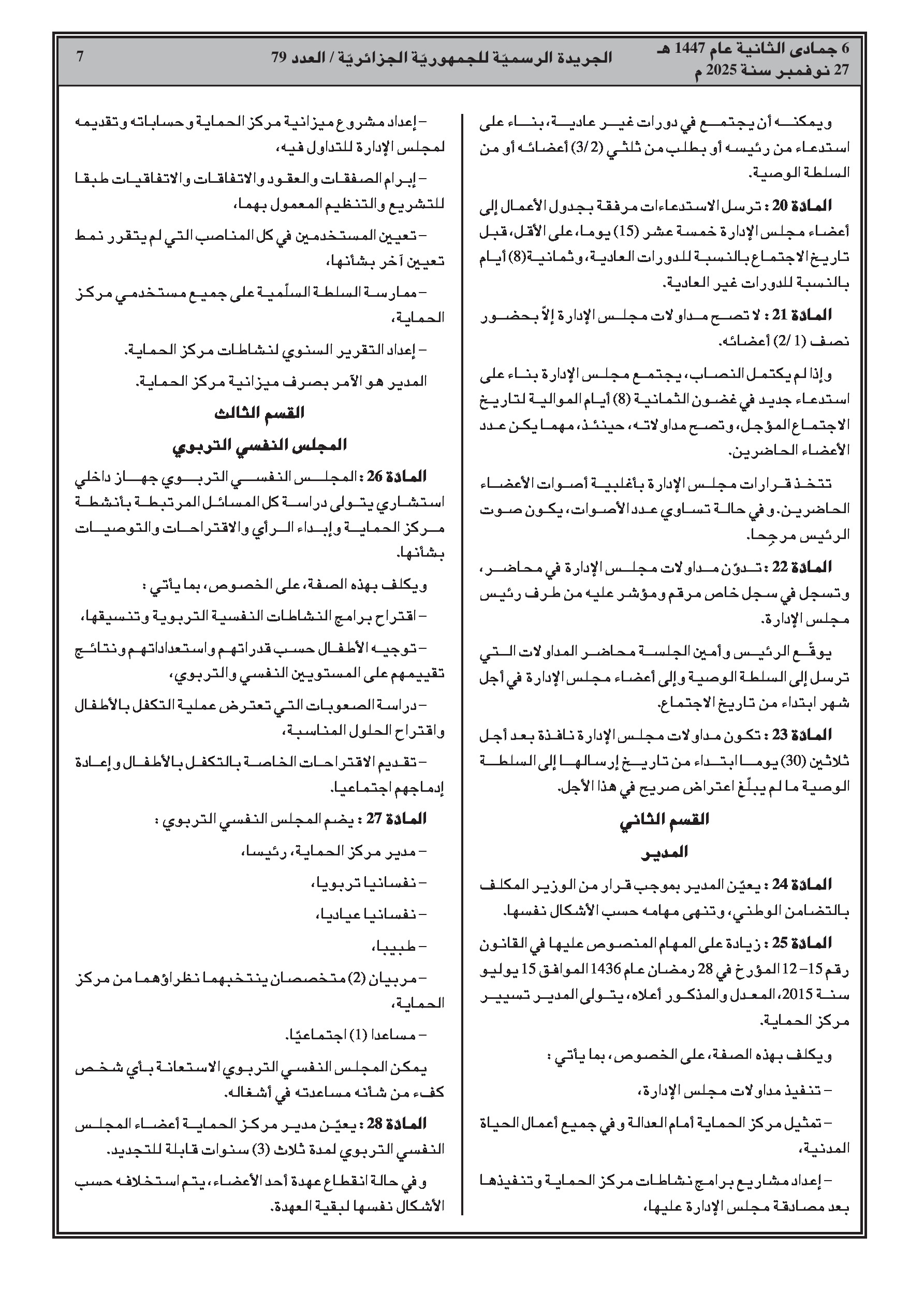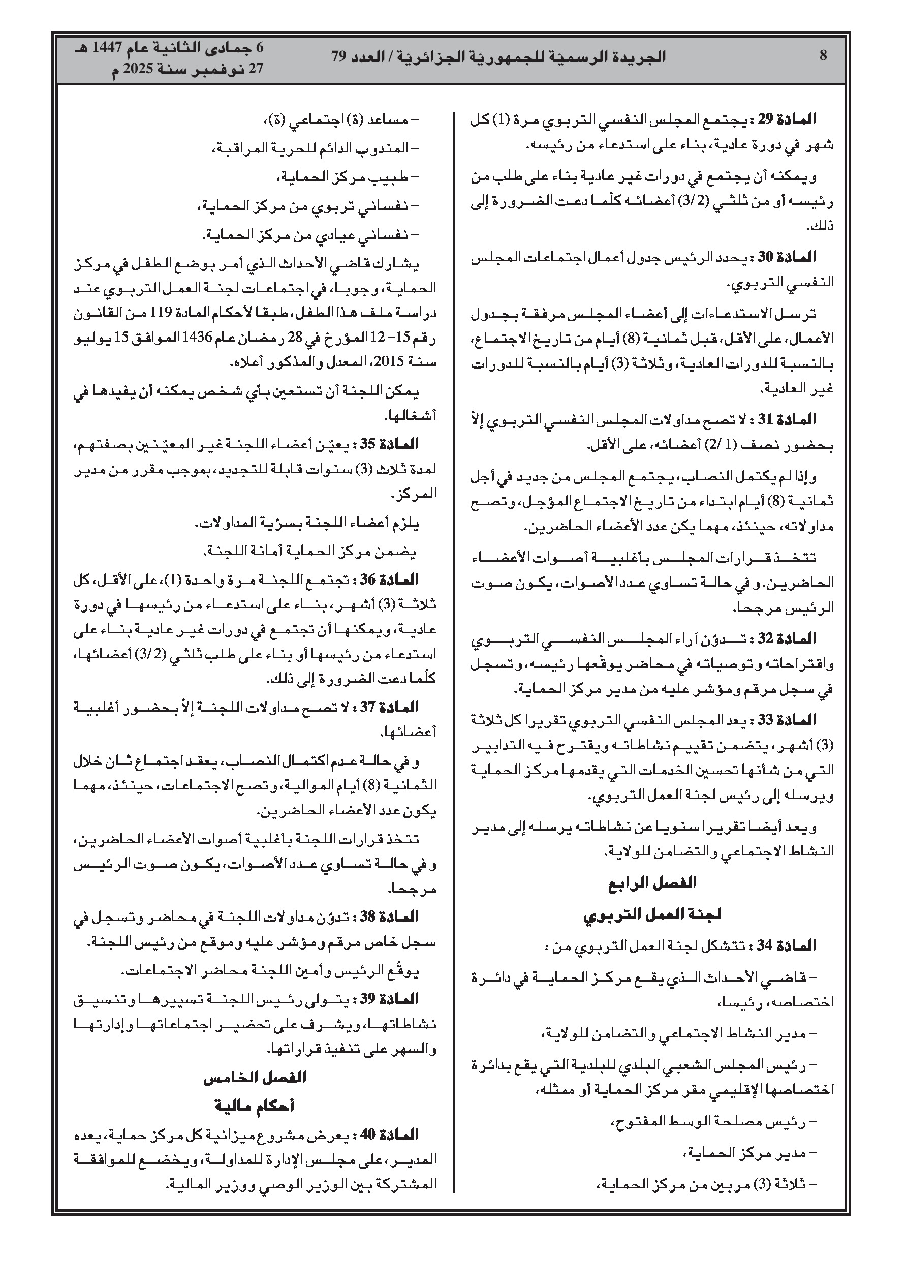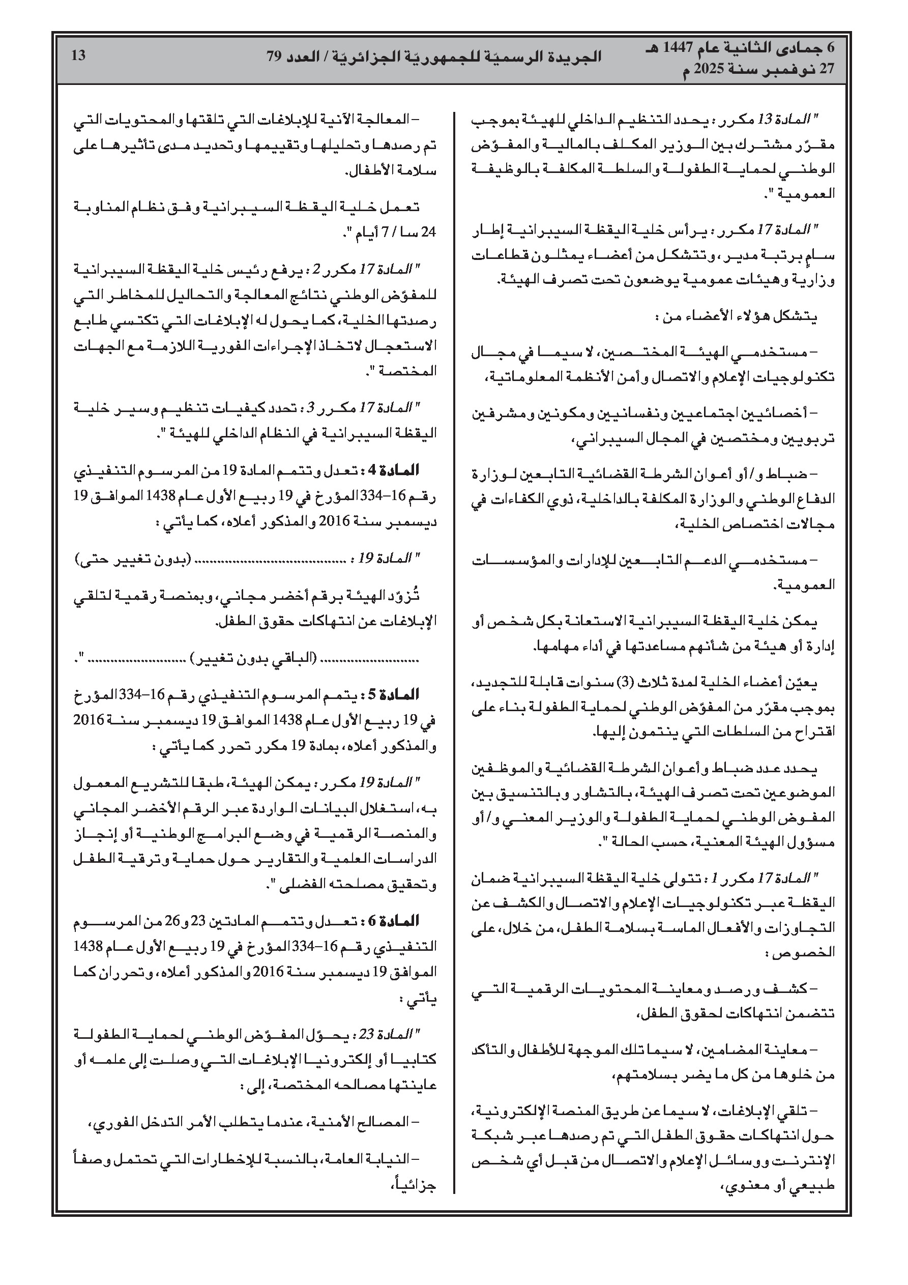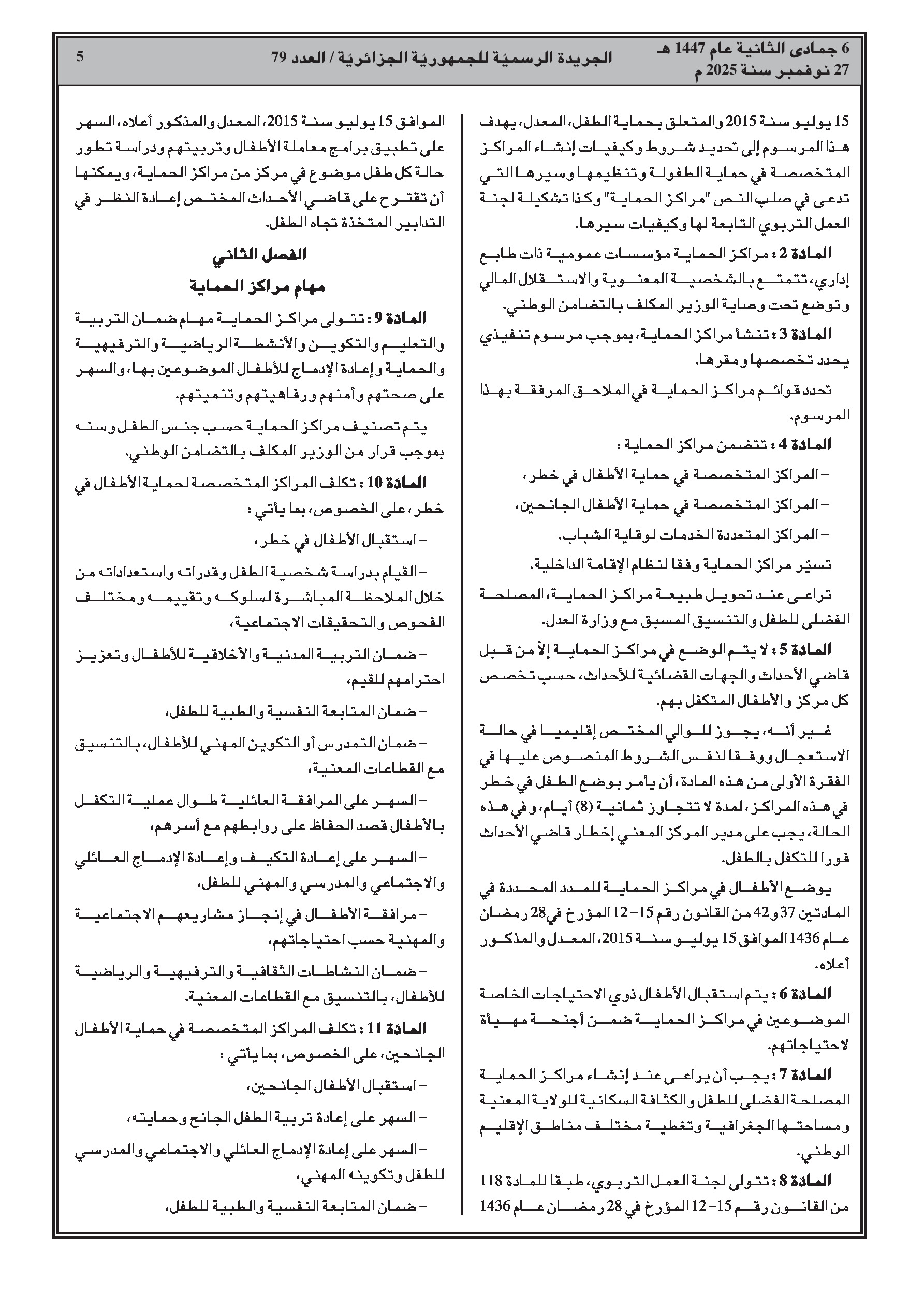 العدد 79 من الجريدة الرسمية الجزائرية الصادرة بتاريخ 27 نوفمبر 2025: تنظيم مراكز حماية الطفولة، اليقظة السيبرانية وبرامج تكوين لموظفي التربية