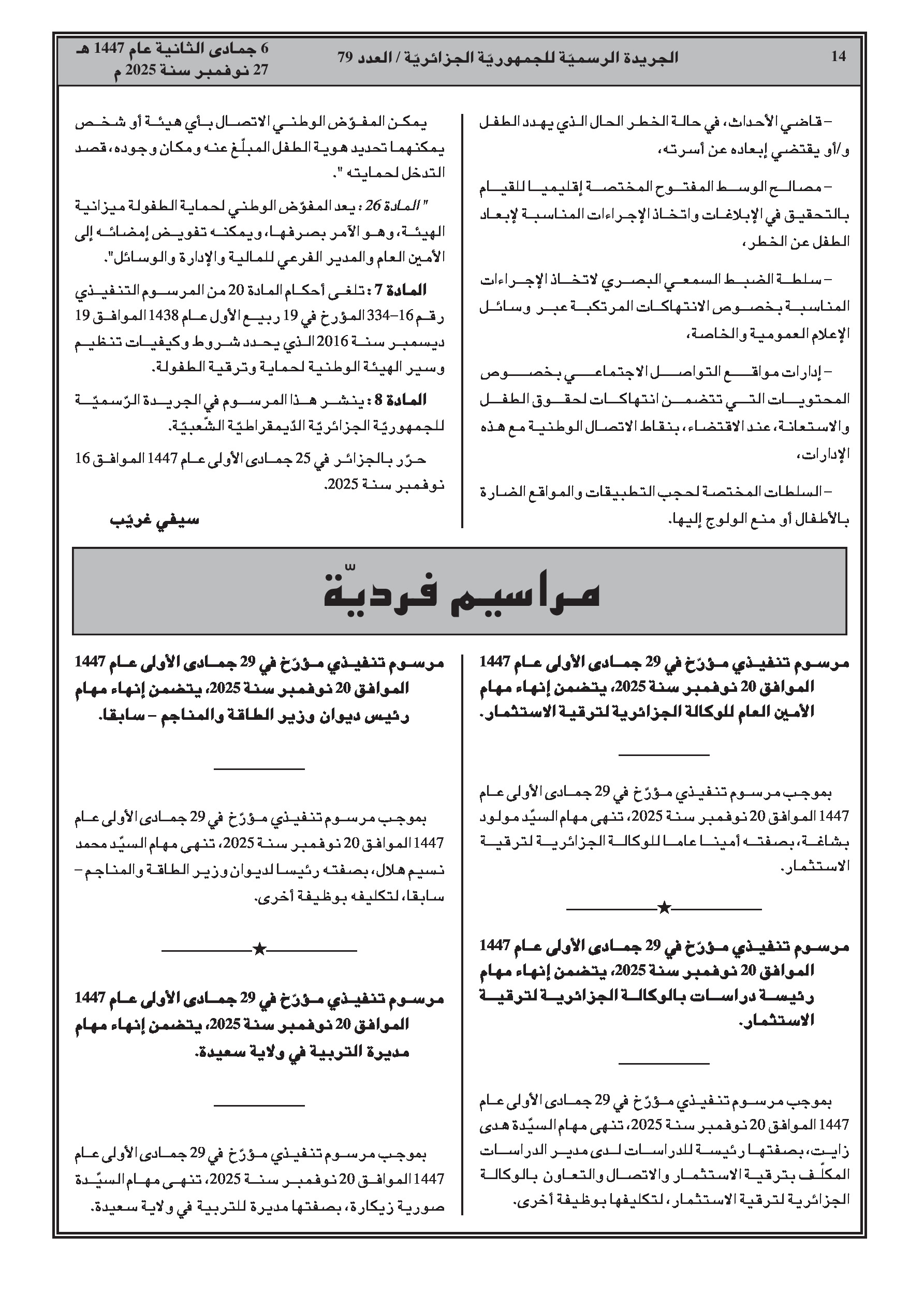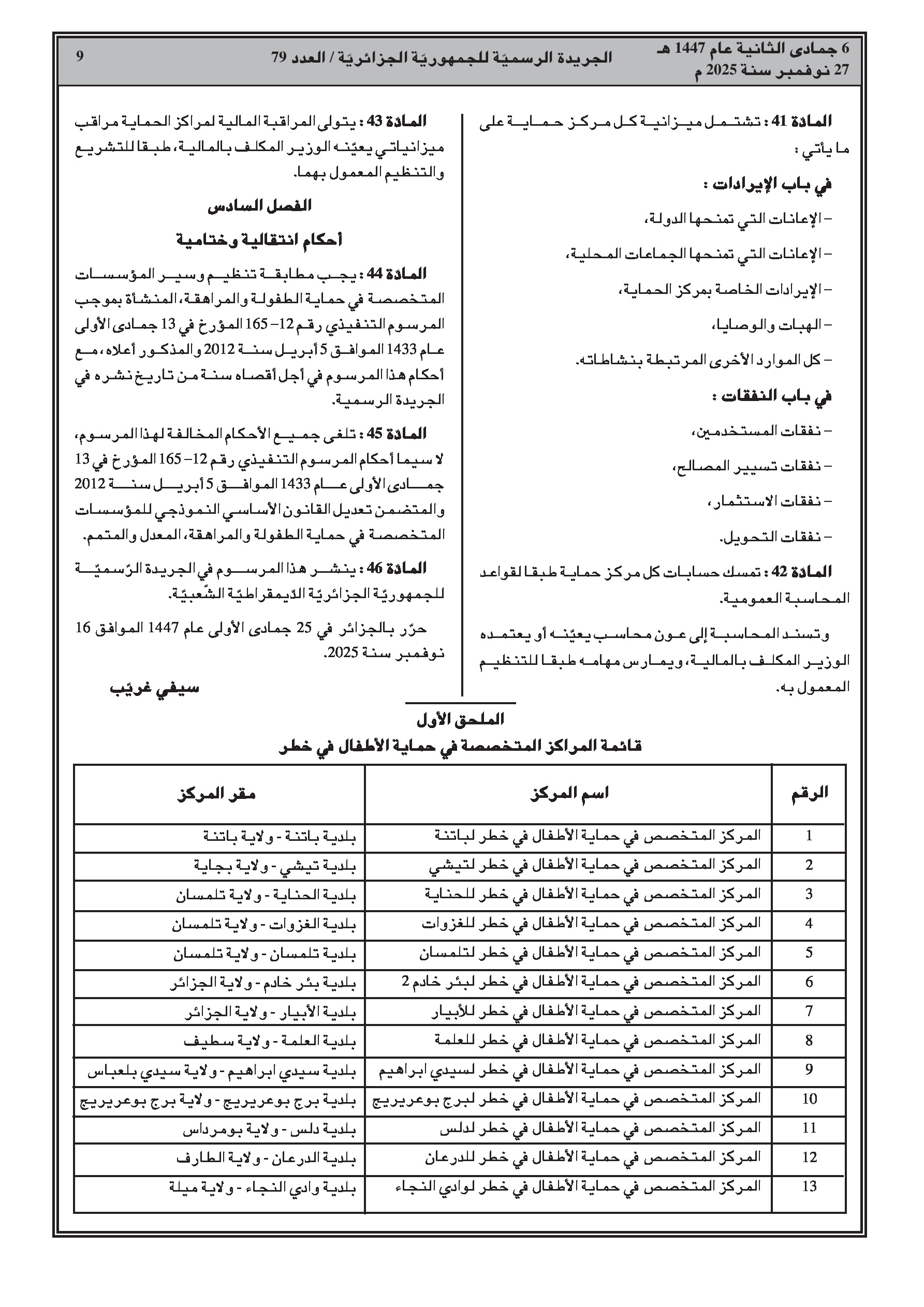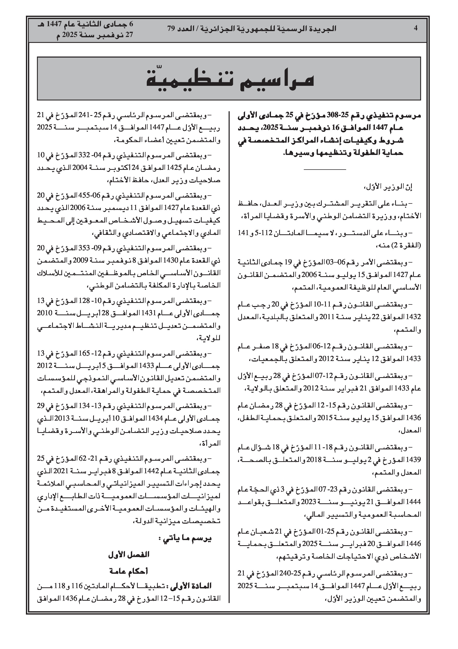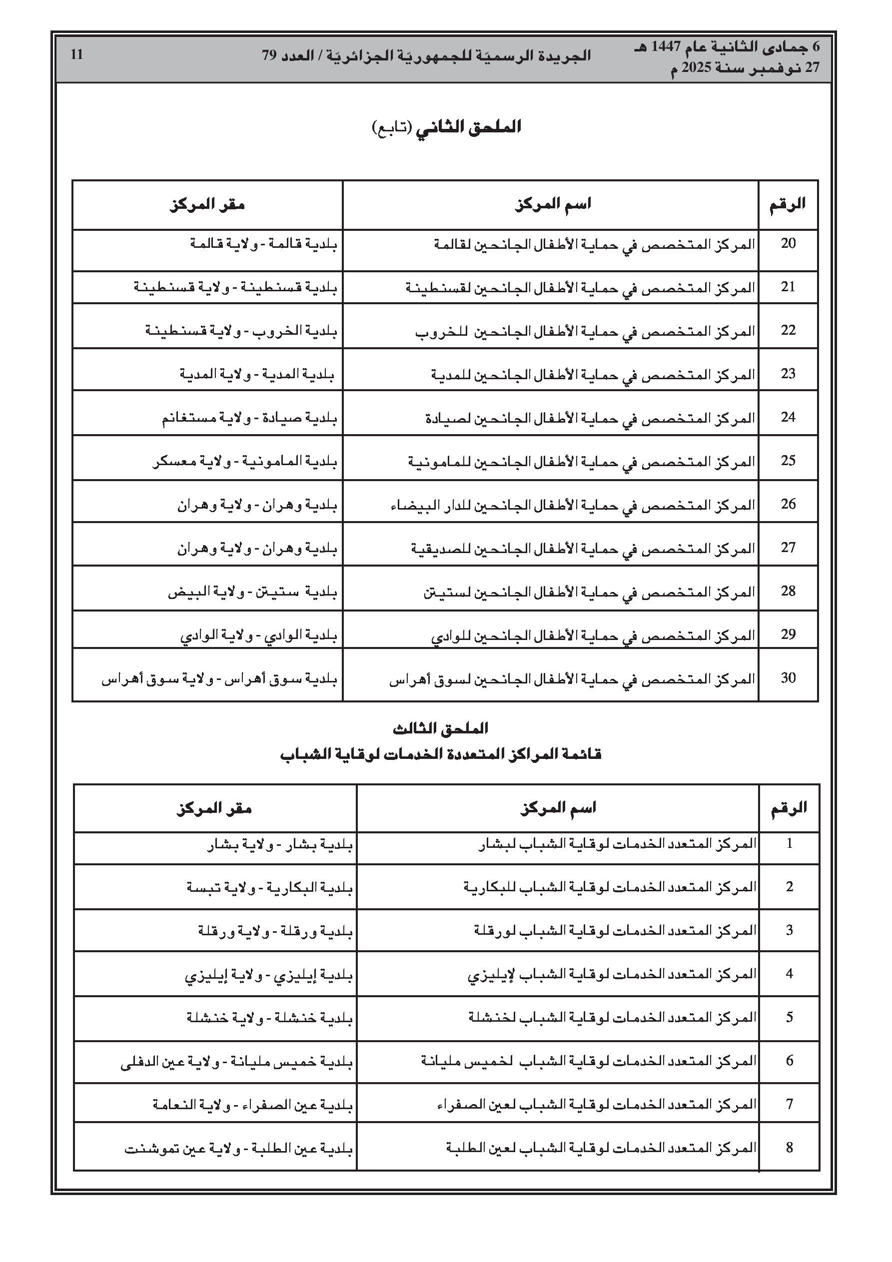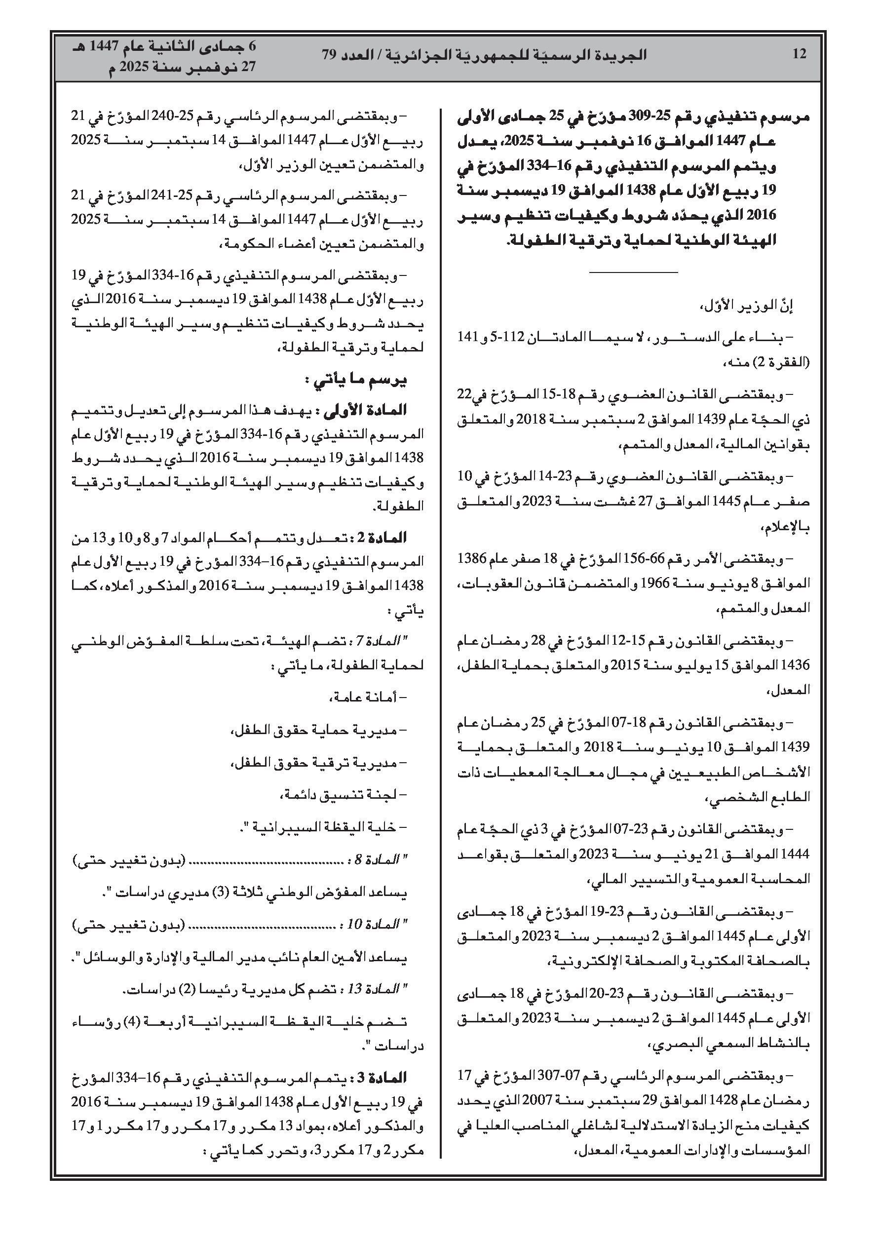 العدد 79 من الجريدة الرسمية الجزائرية الصادرة بتاريخ 27 نوفمبر 2025: تنظيم مراكز حماية الطفولة، اليقظة السيبرانية وبرامج تكوين لموظفي التربية