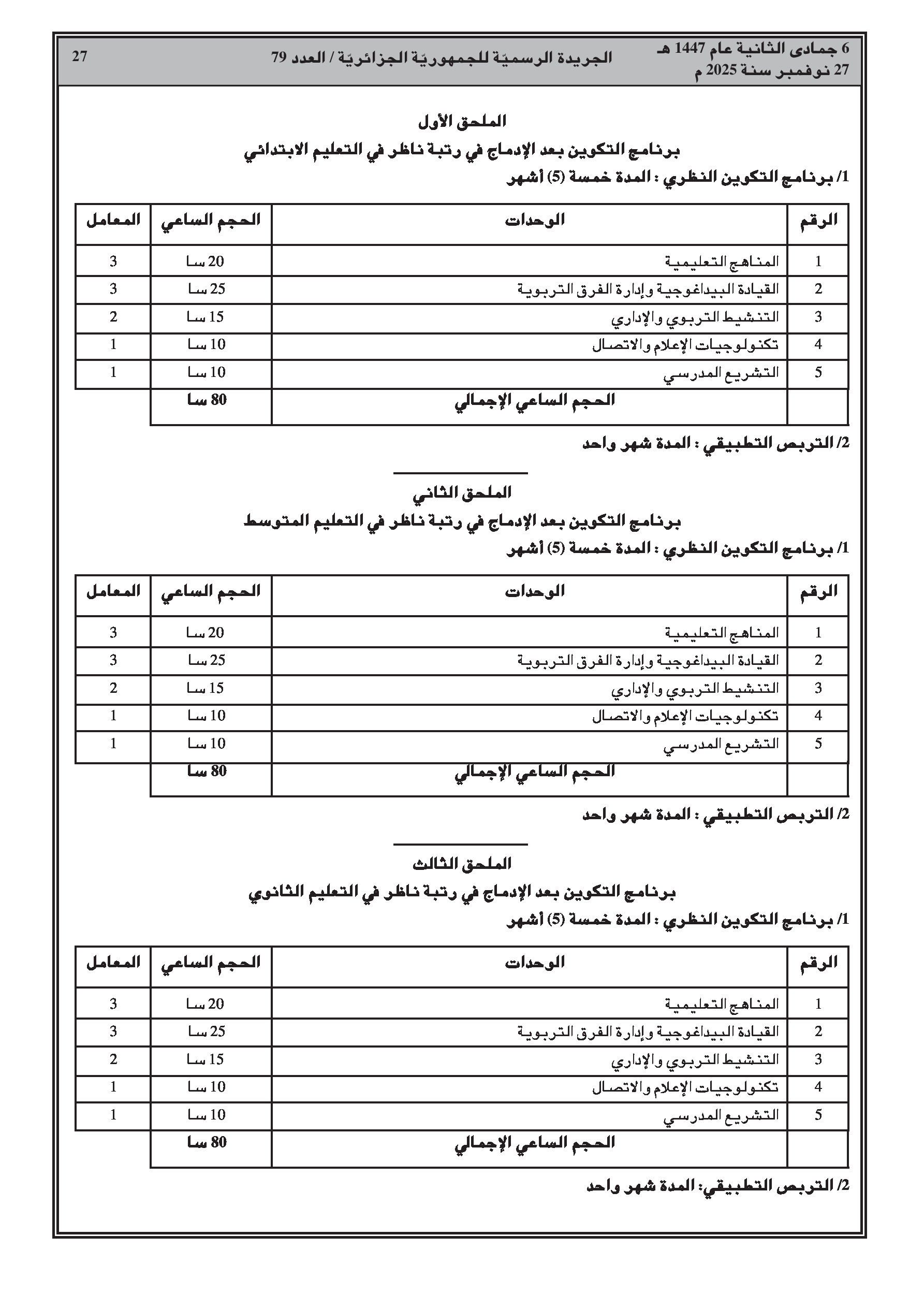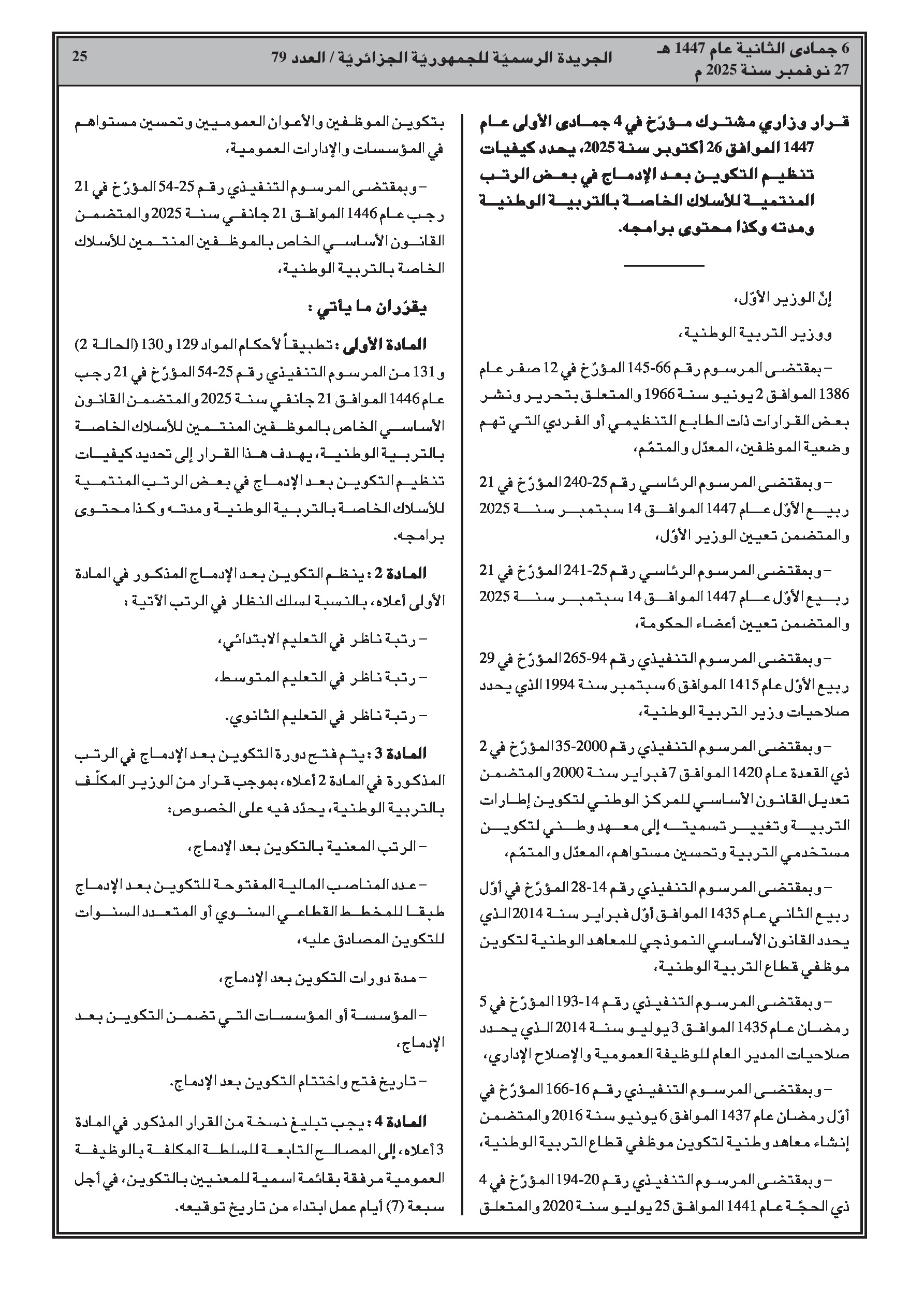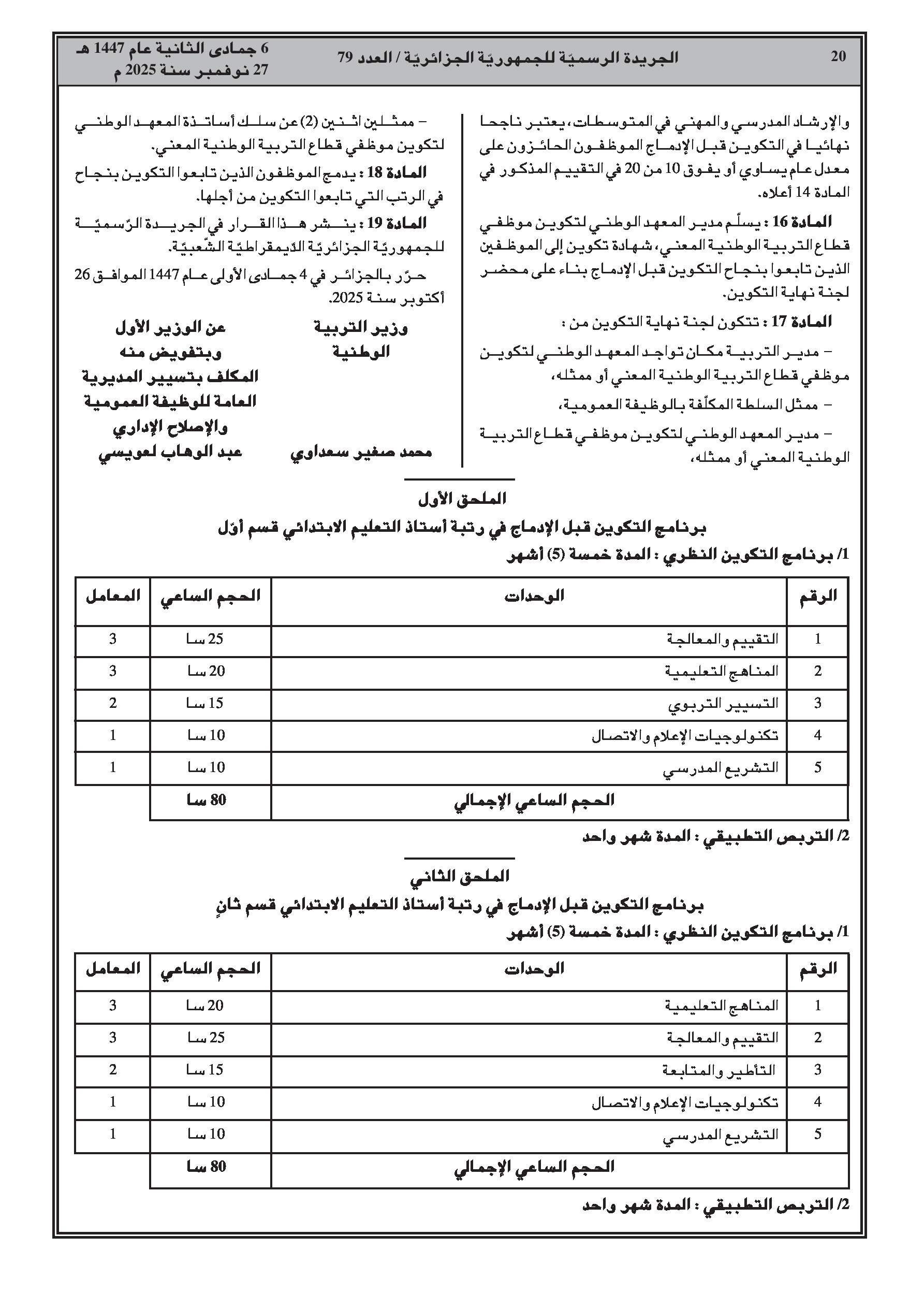 - ضبط مدة ومحتوى التكوين المسبق للإدماج في رتب أساتذة التعليم (ابتدائي، متوسط، ثانوي) والمفتشين.