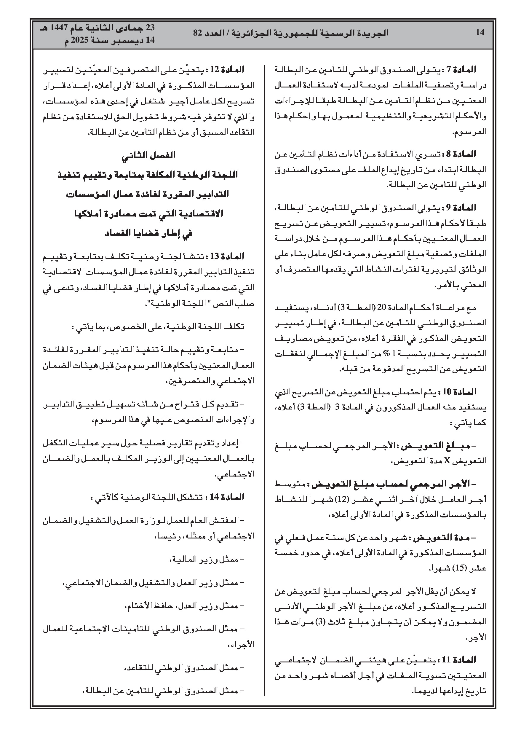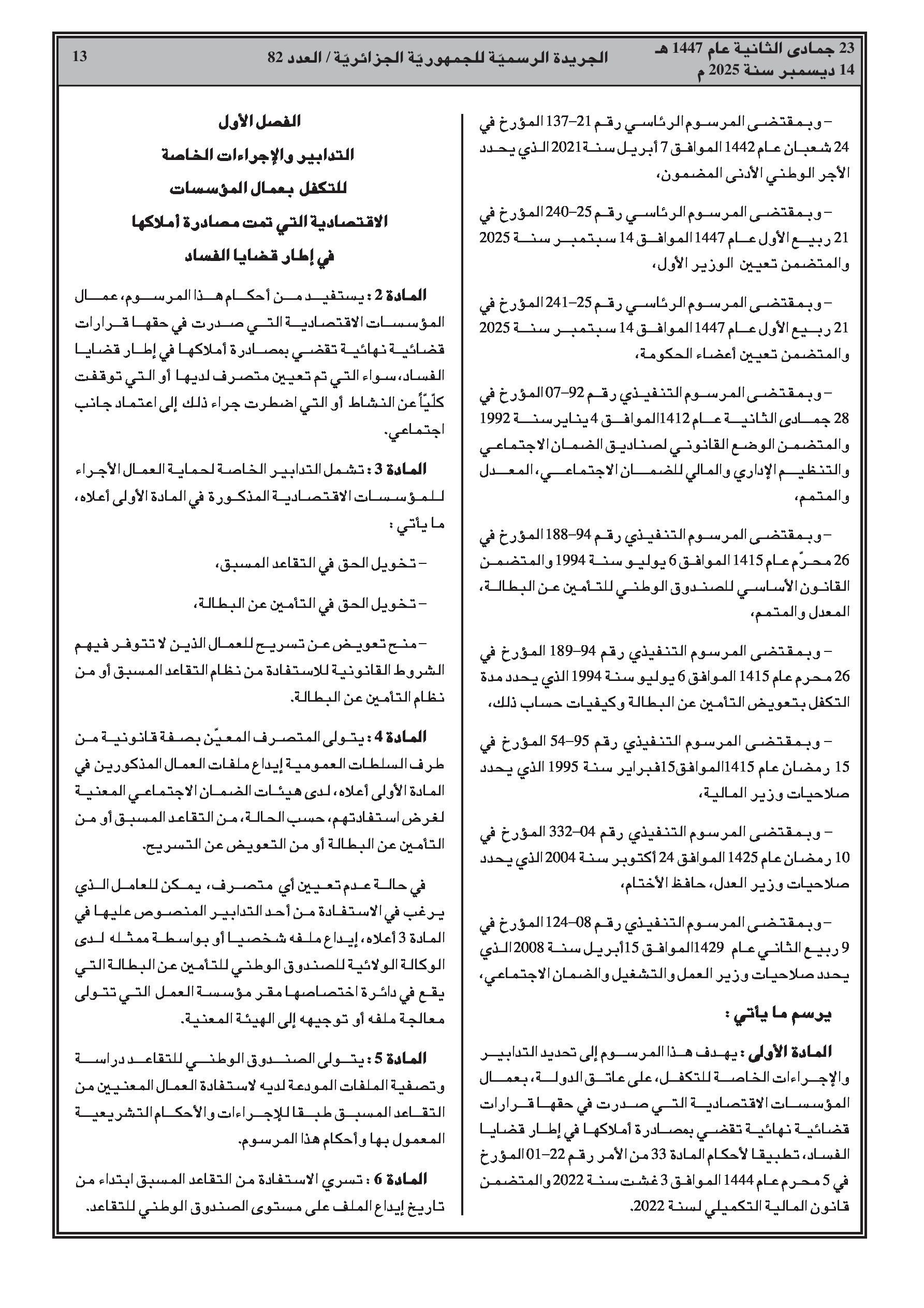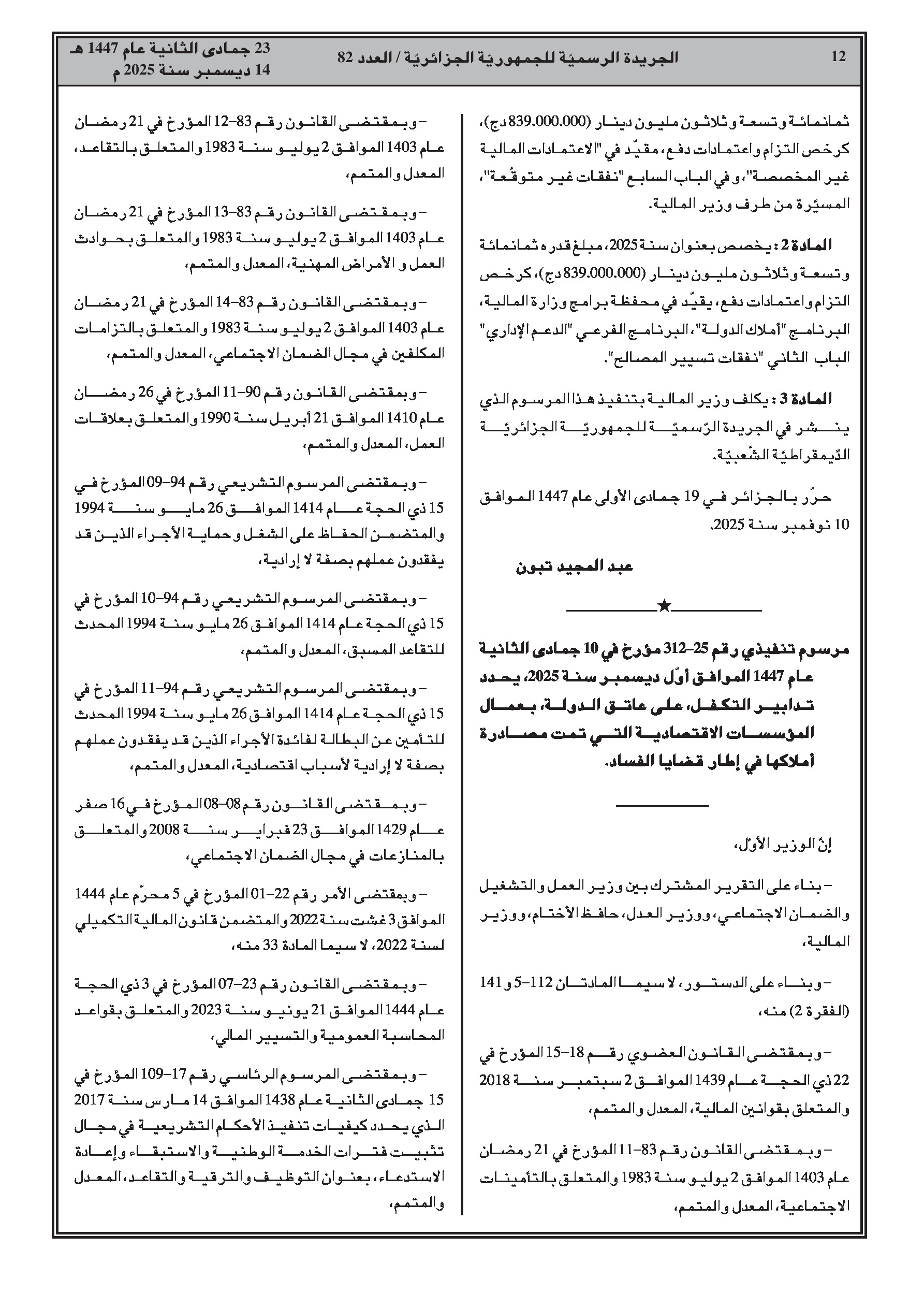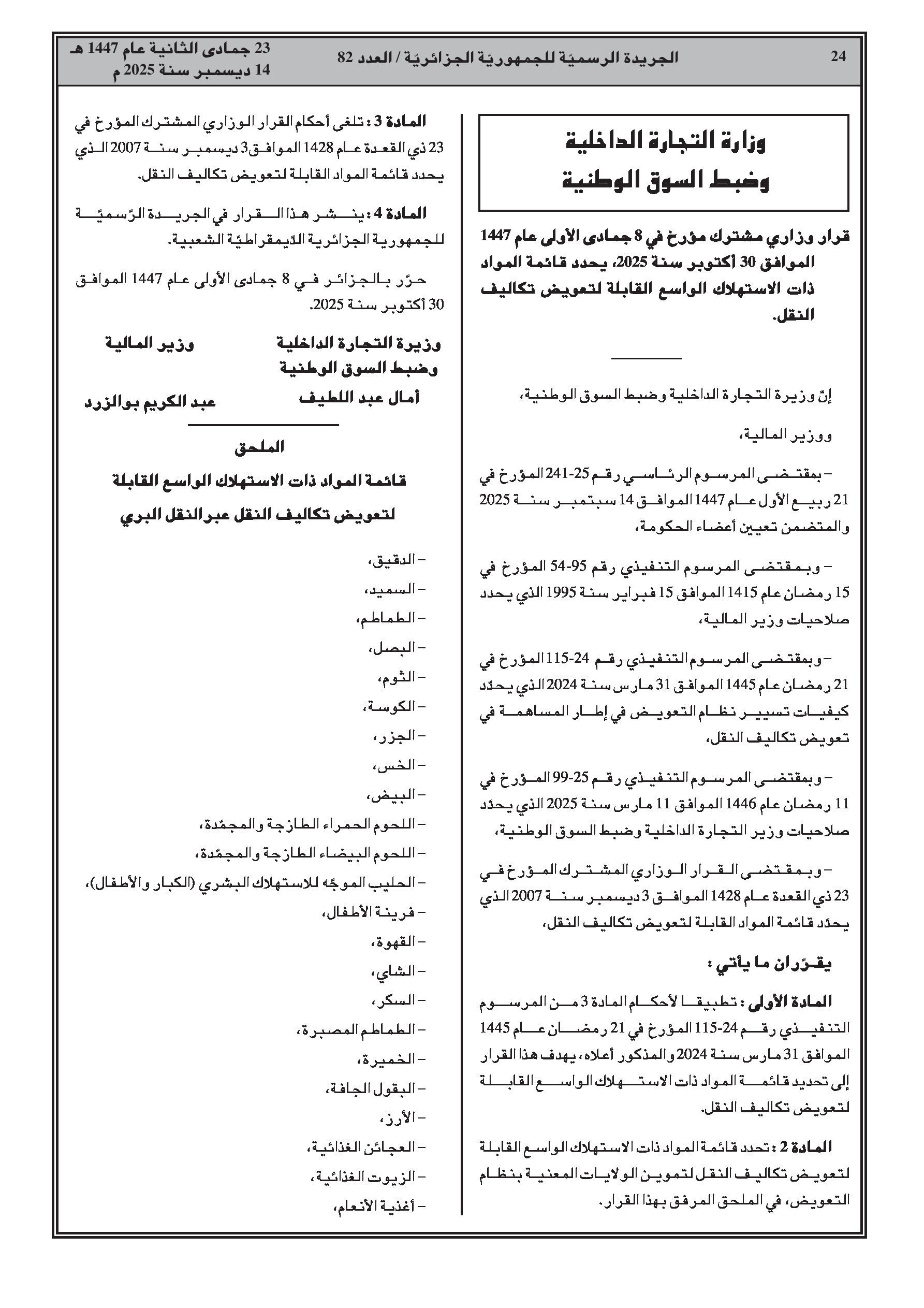 العدد 82 من الجريدة الرسمية الجزائرية الصادرة بتاريخ 14 ديسمبر 2025: تحديد سعر سكنات عدل 2024، حماية عمال الشركات المصادرة ودعم نقل المواد الاستهلاكية