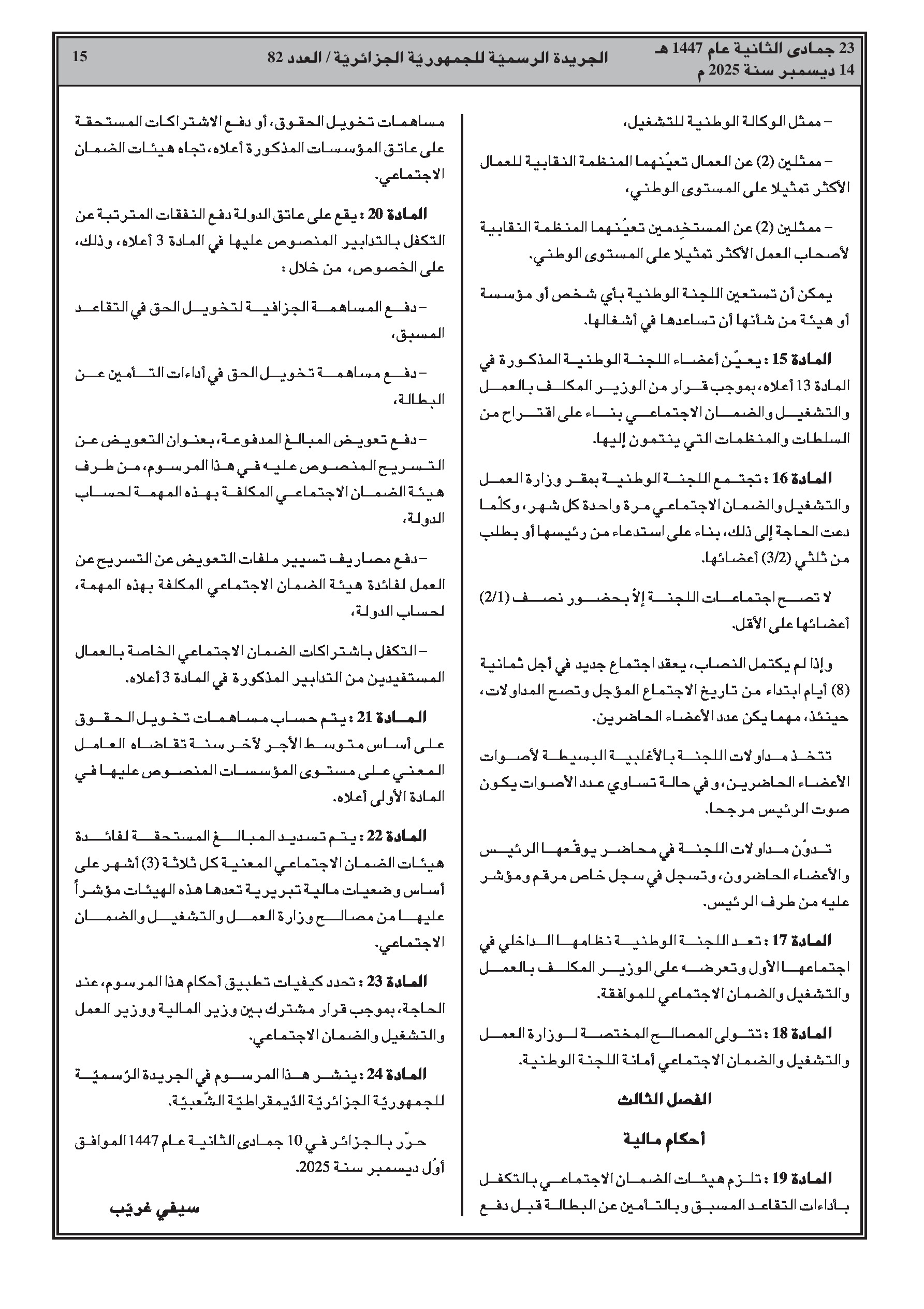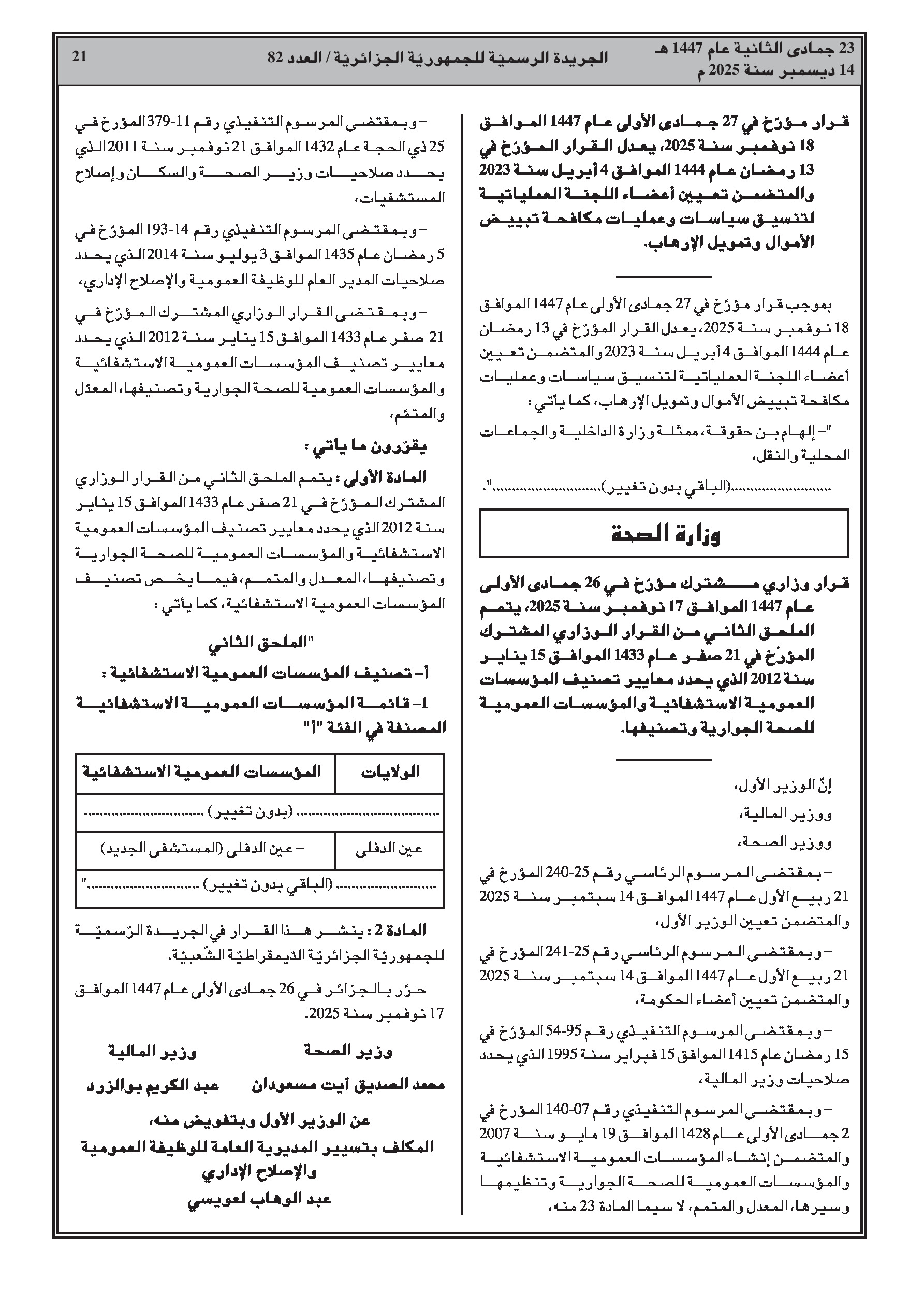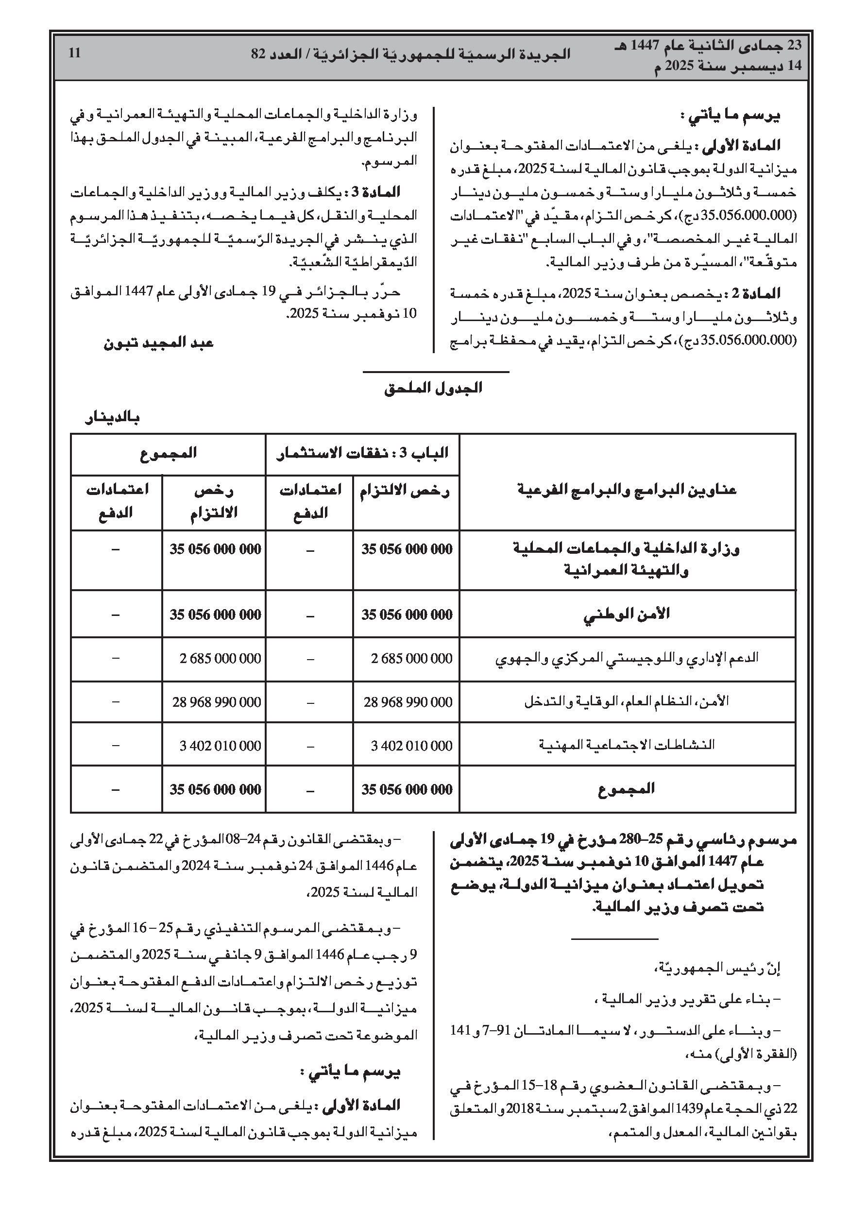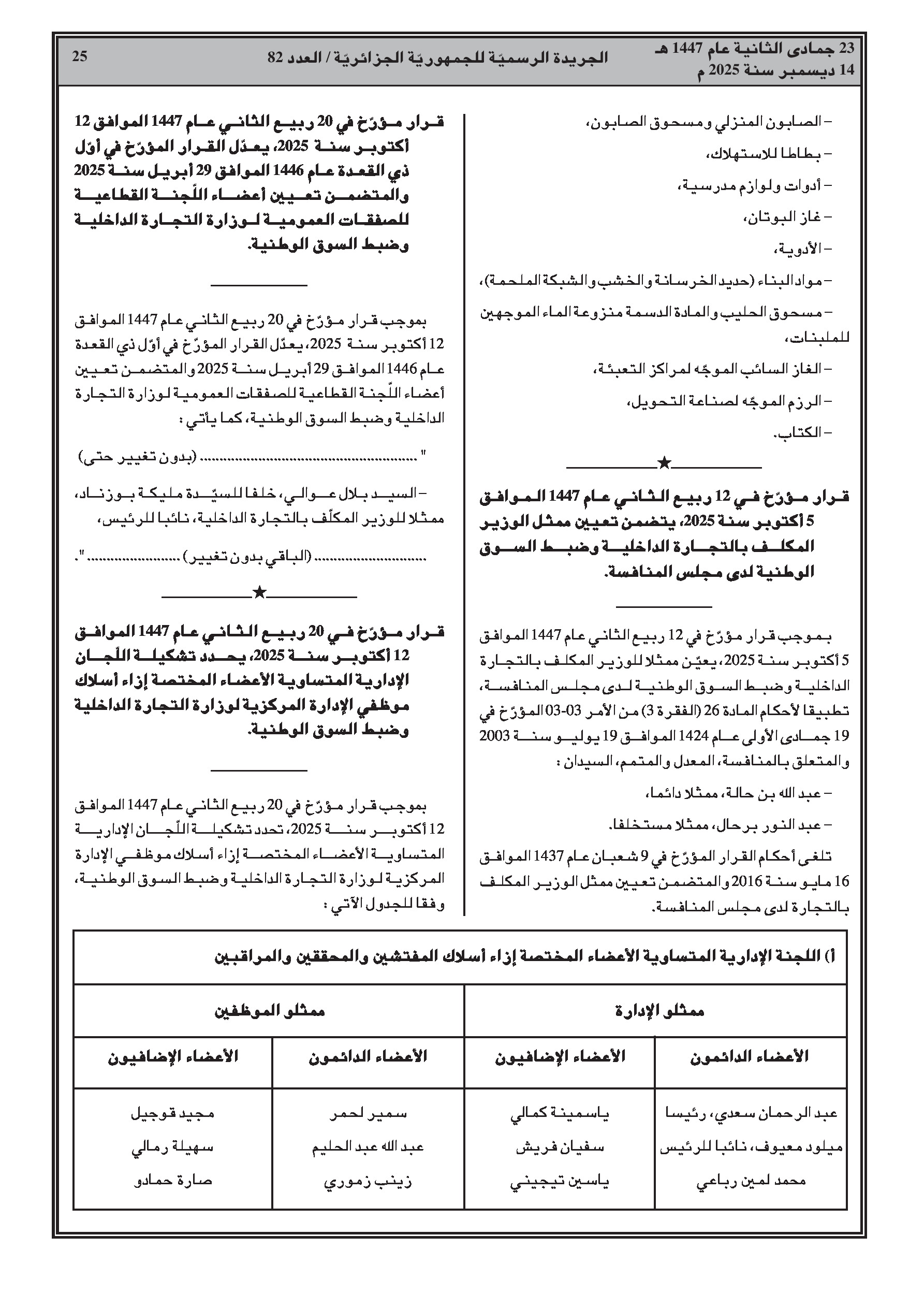 العدد 82 من الجريدة الرسمية الجزائرية الصادرة بتاريخ 14 ديسمبر 2025: تحديد سعر سكنات عدل 2024، حماية عمال الشركات المصادرة ودعم نقل المواد الاستهلاكية