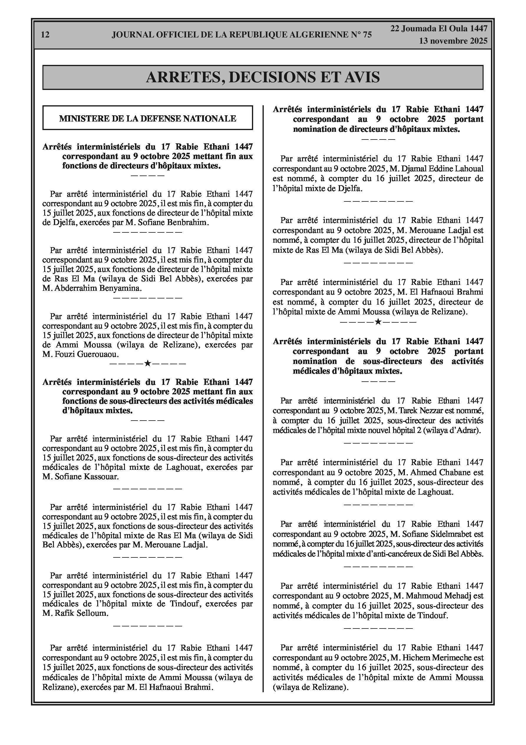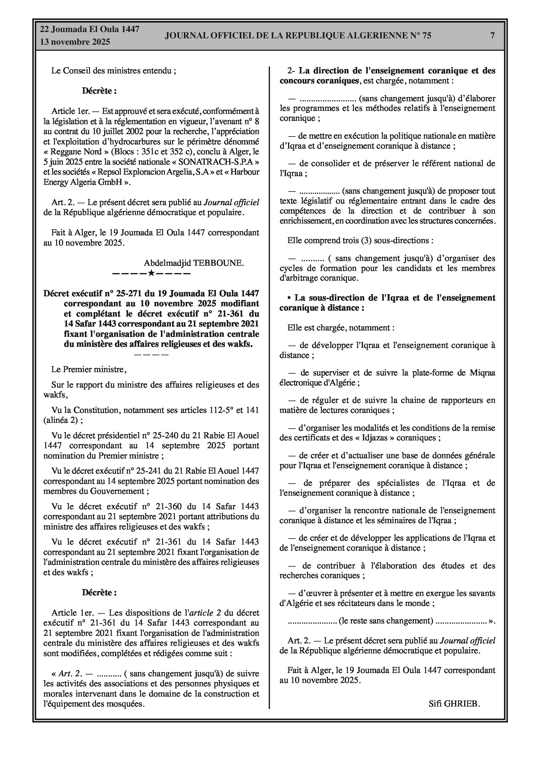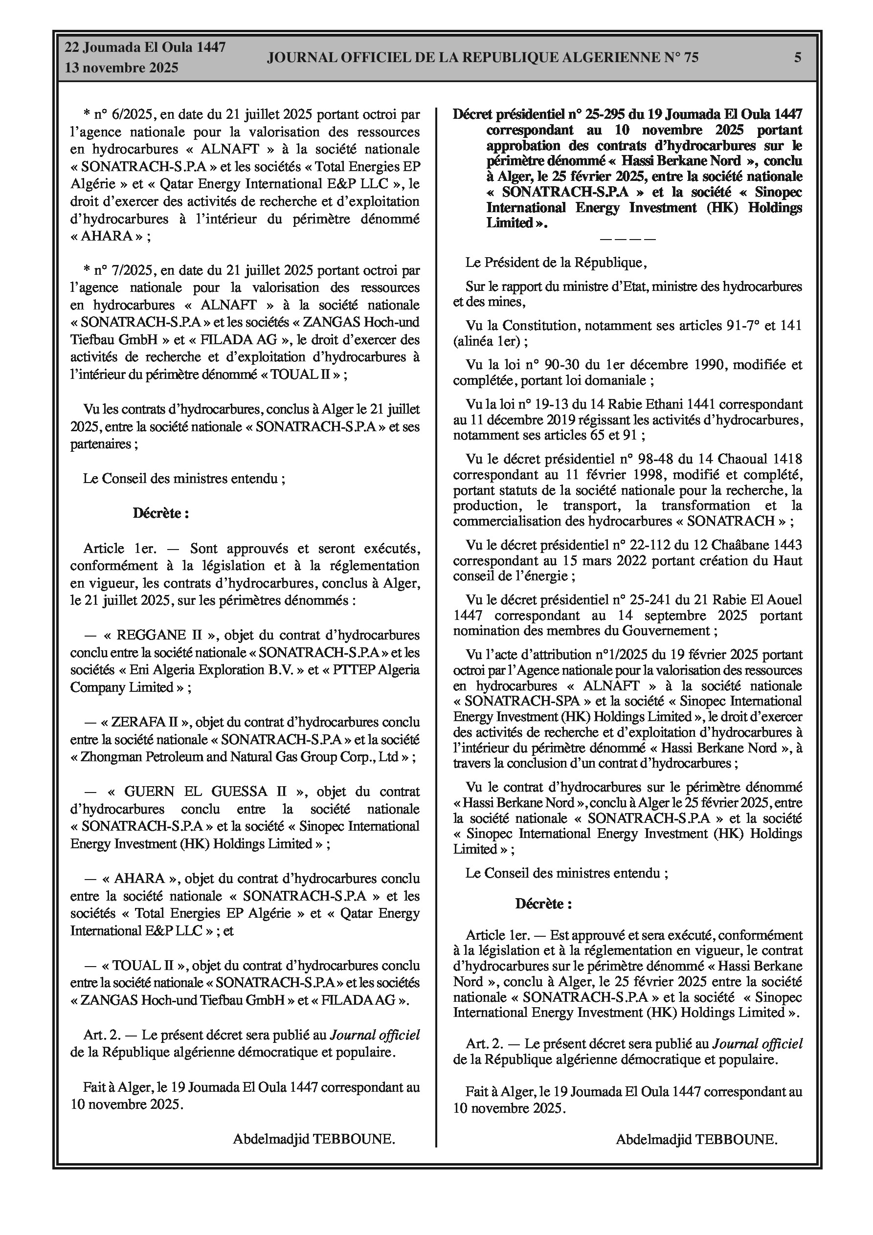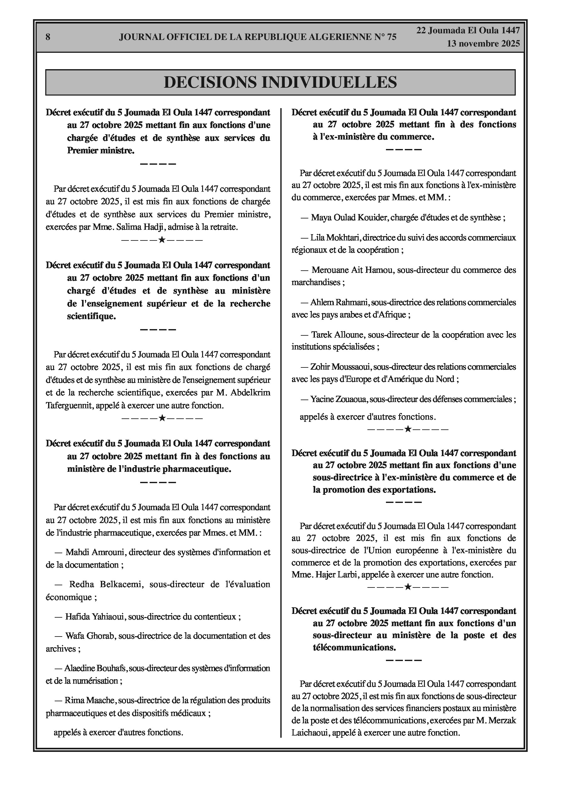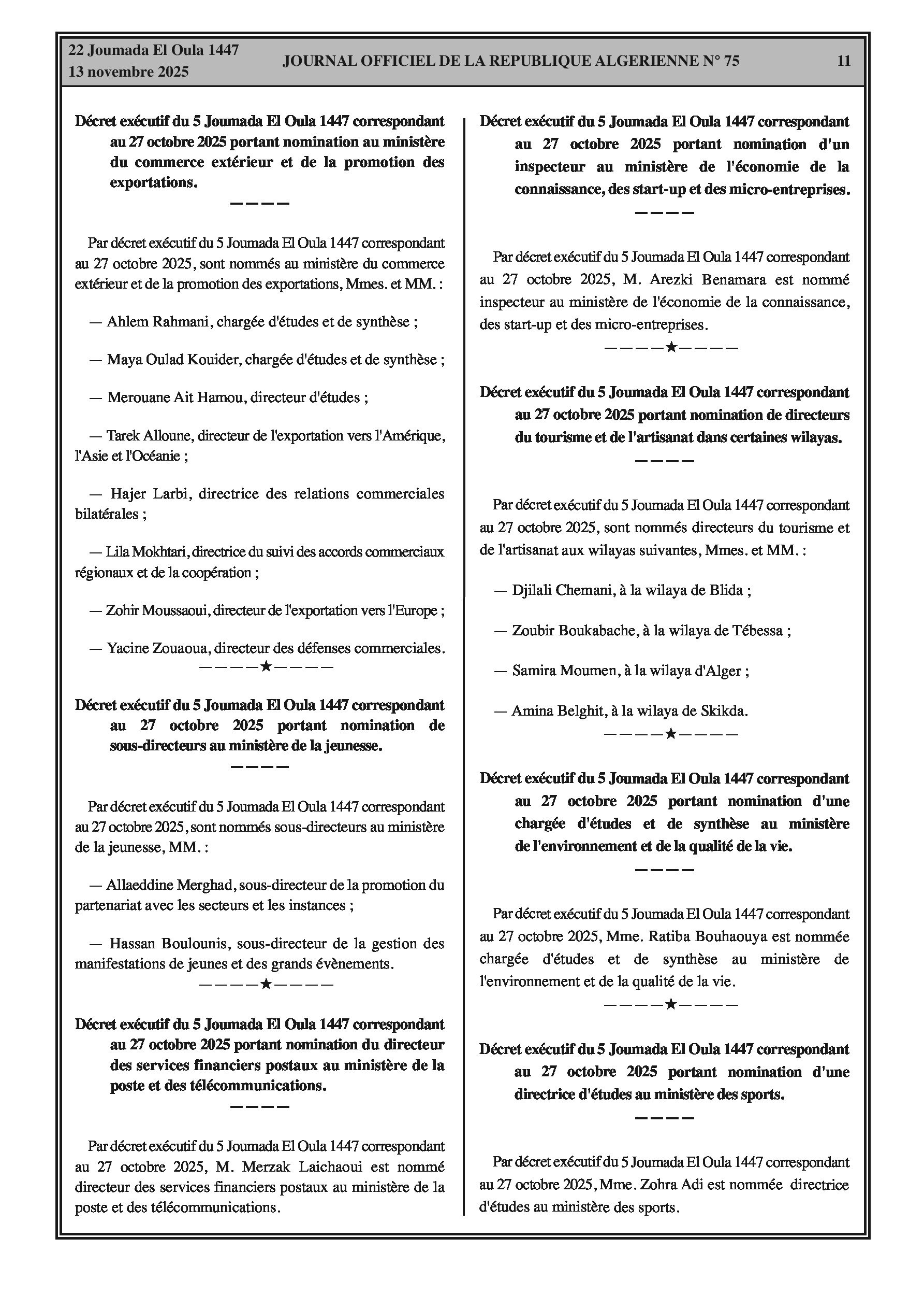 Issue #75 of the Official Gazette of the People's Democratic Republic of Algeria published on 13 November 2025: