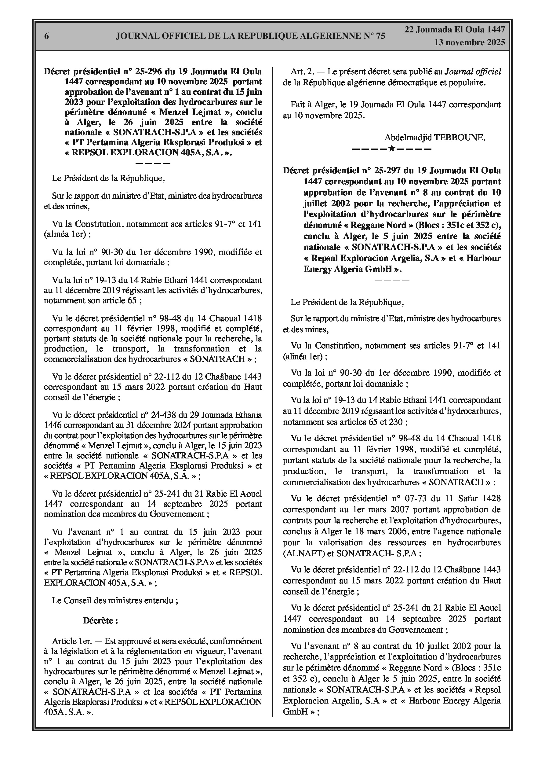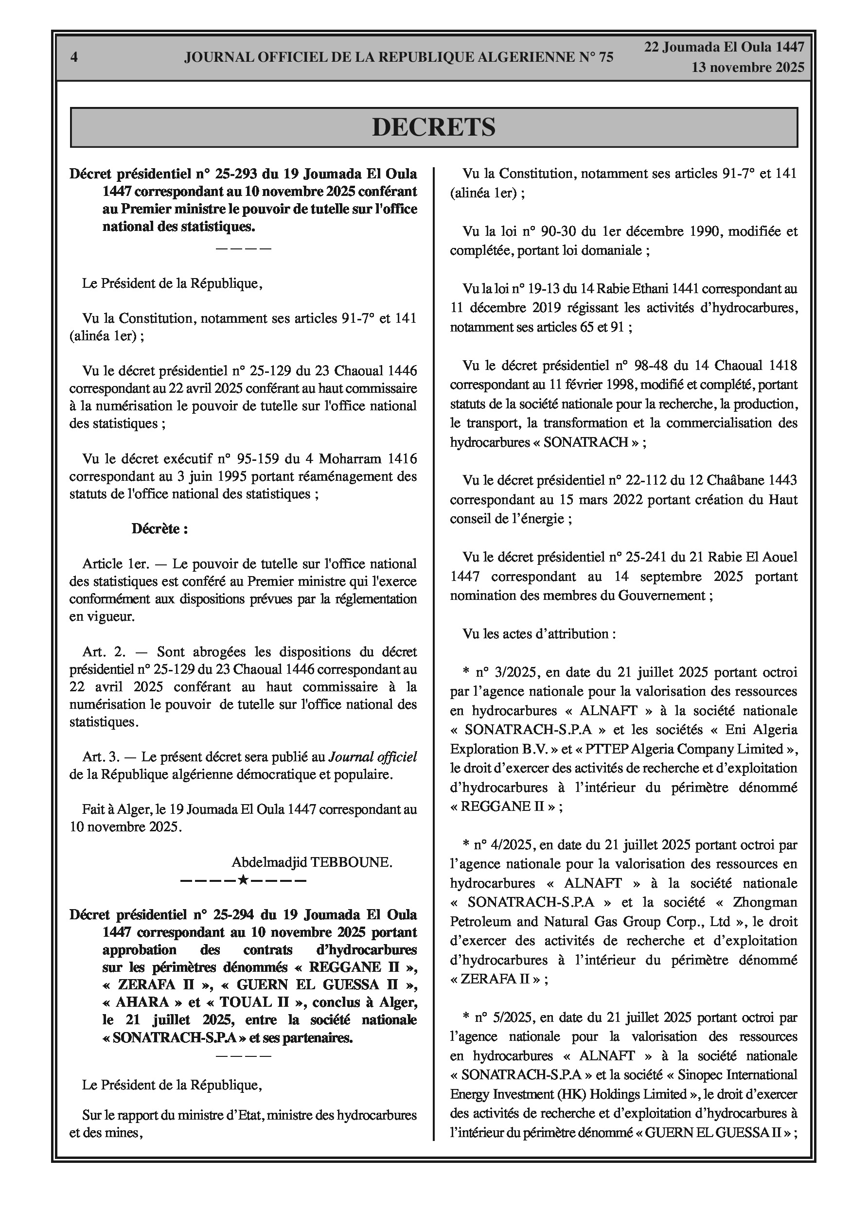 Several contracts and amendments between the national company SONATRACH and its international partners have been approved by presidential decrees for the research and exploitation of hydrocarbons in various perimeters.