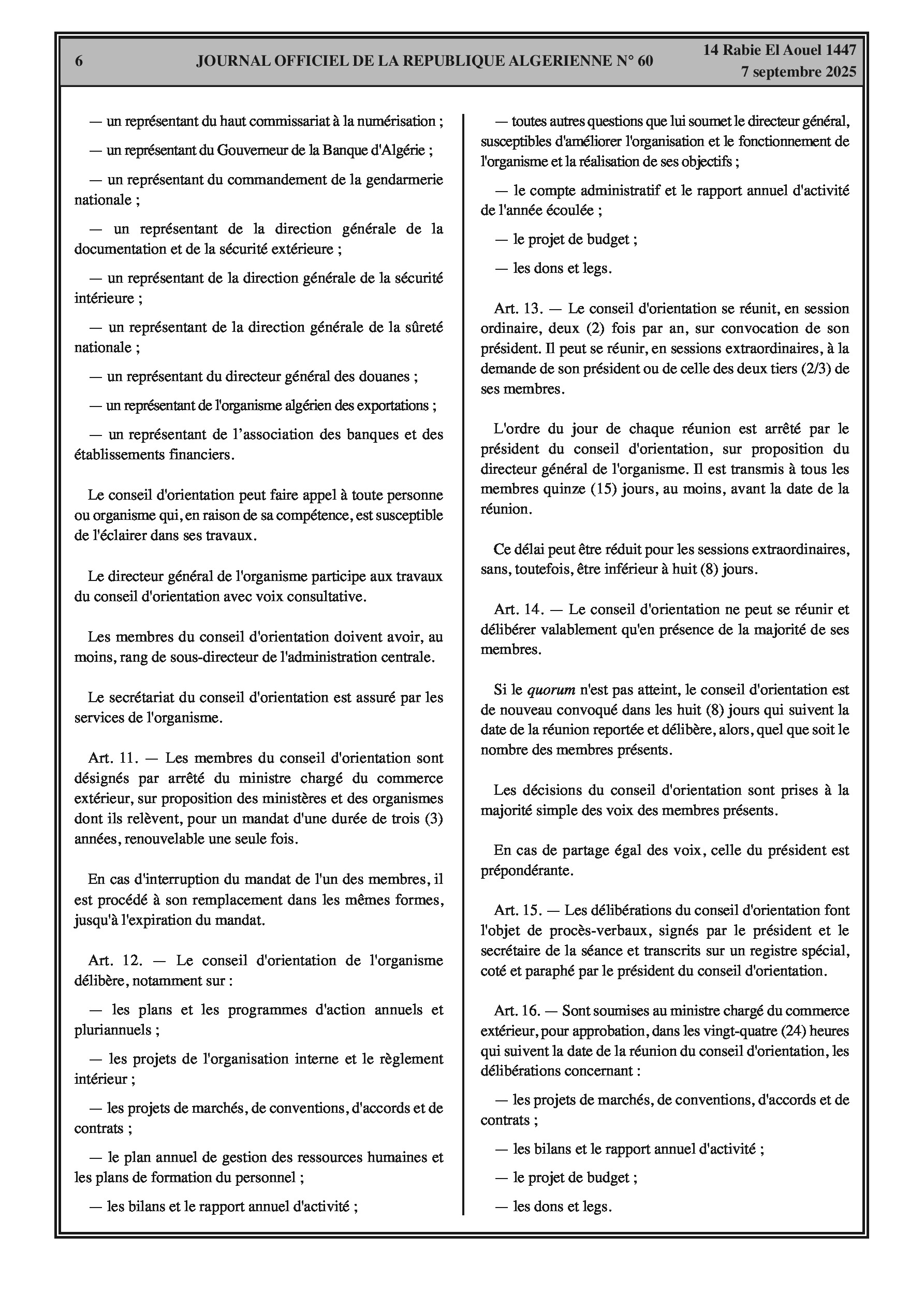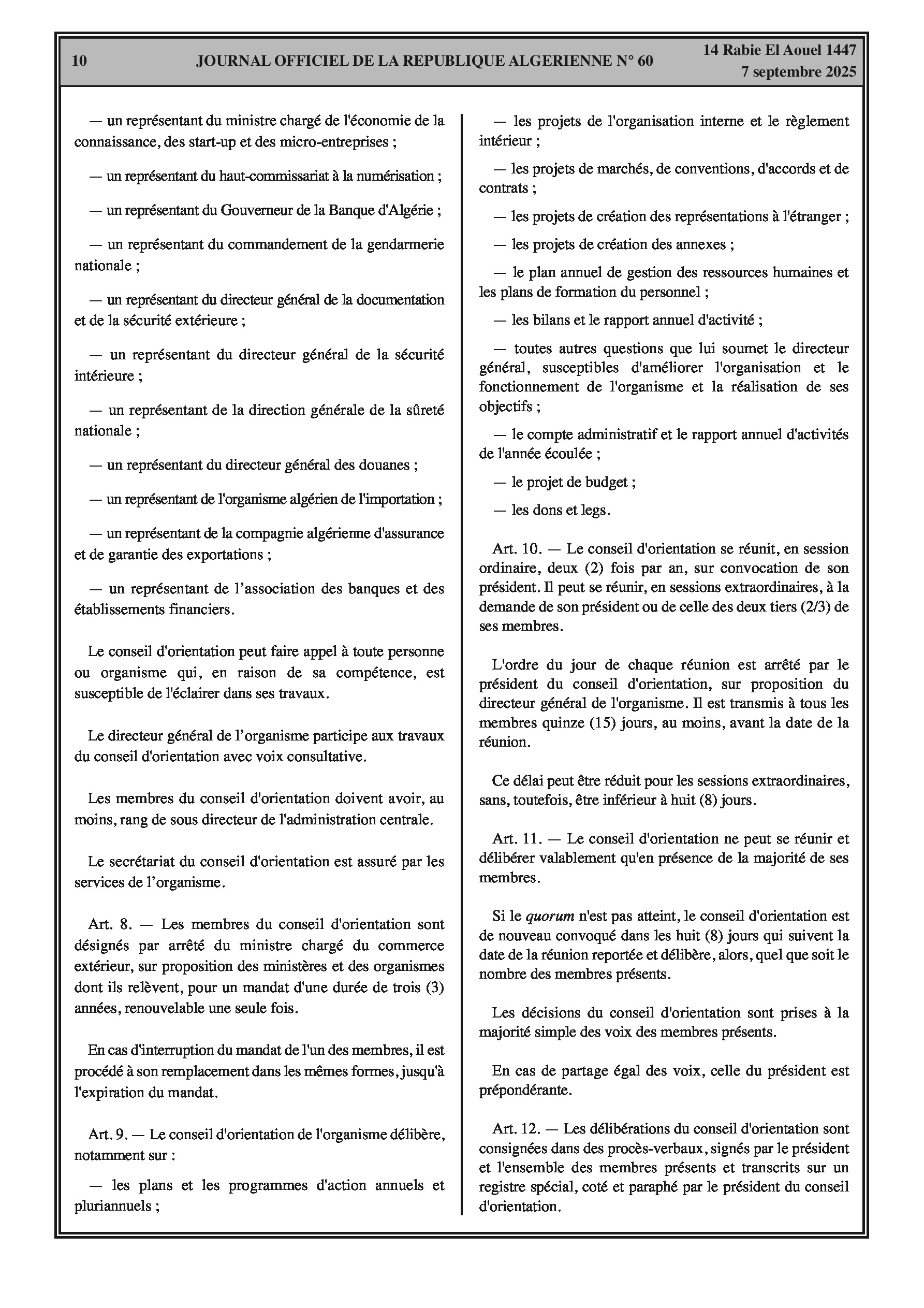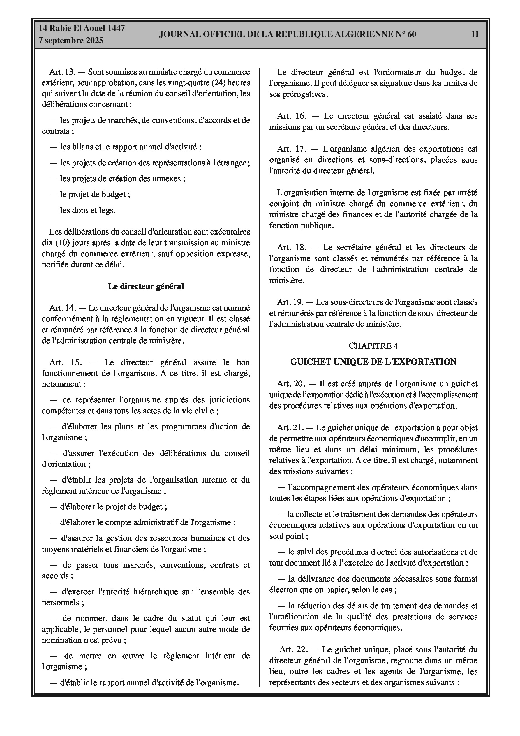 • Décret exécutif n° 25-234 : Création, organisation et fonctionnement de l'organisme algérien des exportations, incluant un guichet unique et une plateforme numérique pour faciliter les procédures.