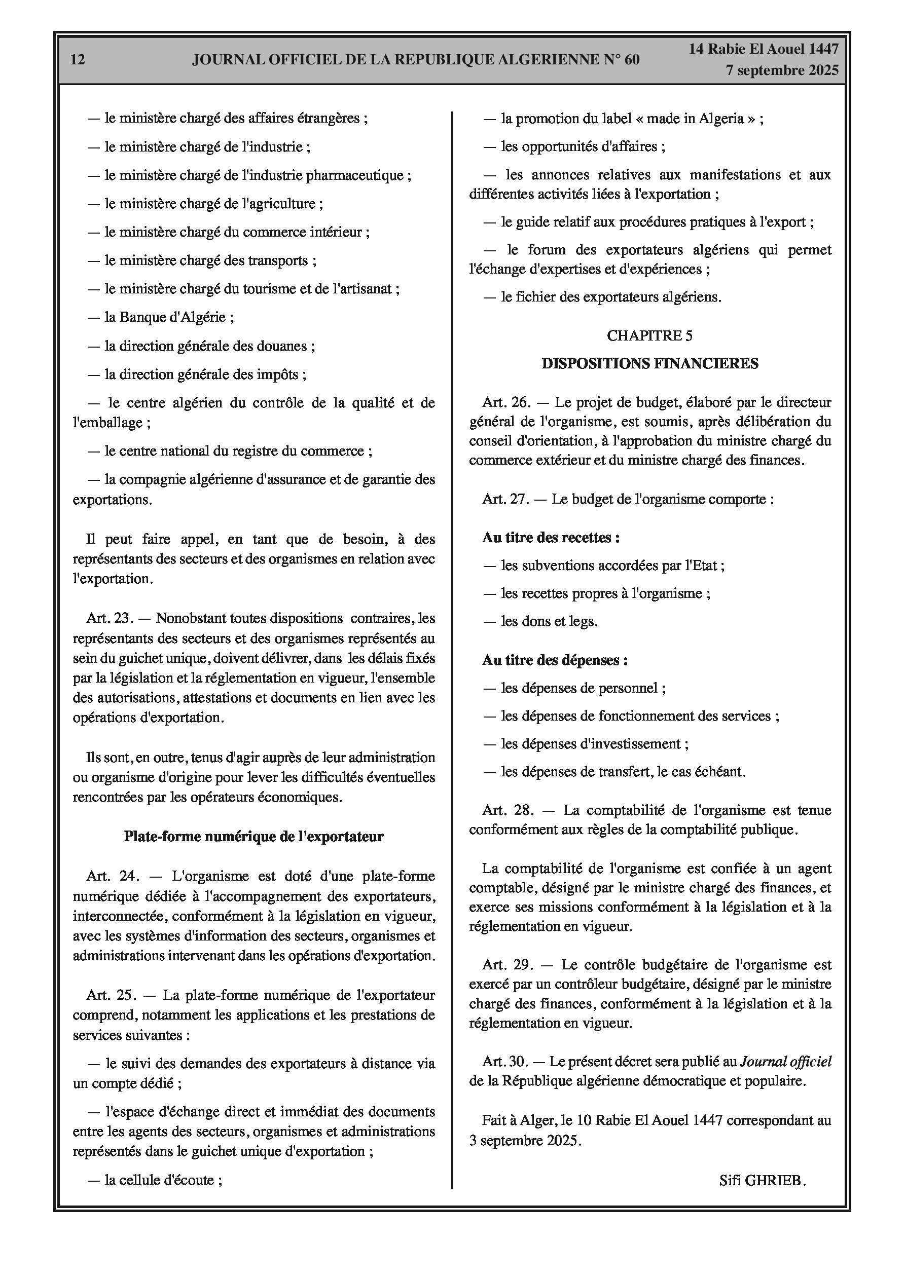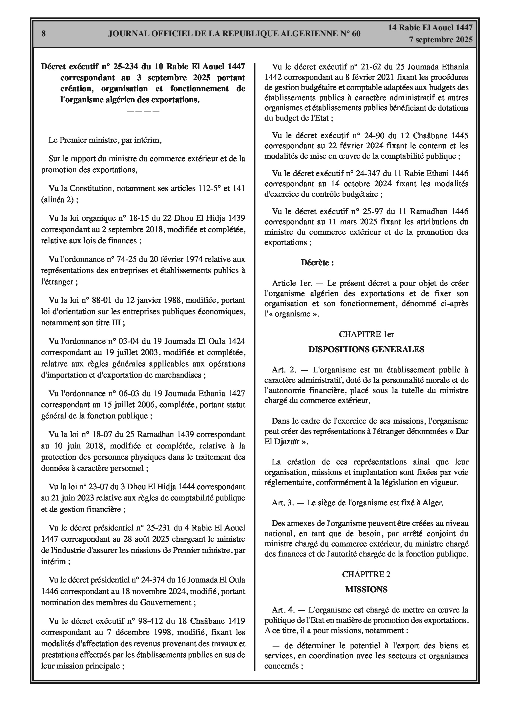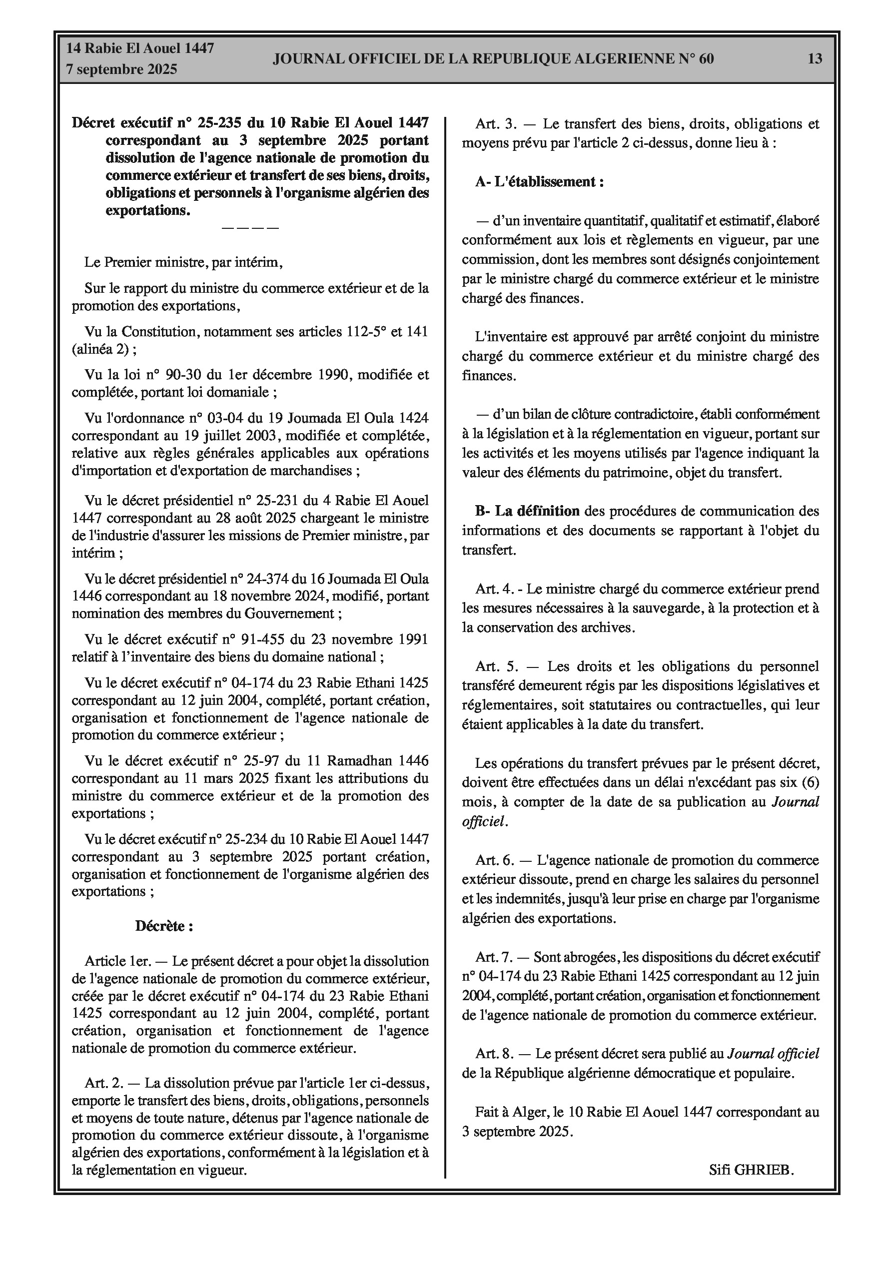 • Décret exécutif n° 25-235 : Dissolution de l'agence nationale de promotion du commerce extérieur et transfert de ses biens, droits, obligations et personnels au nouvel organisme algérien des exportations.