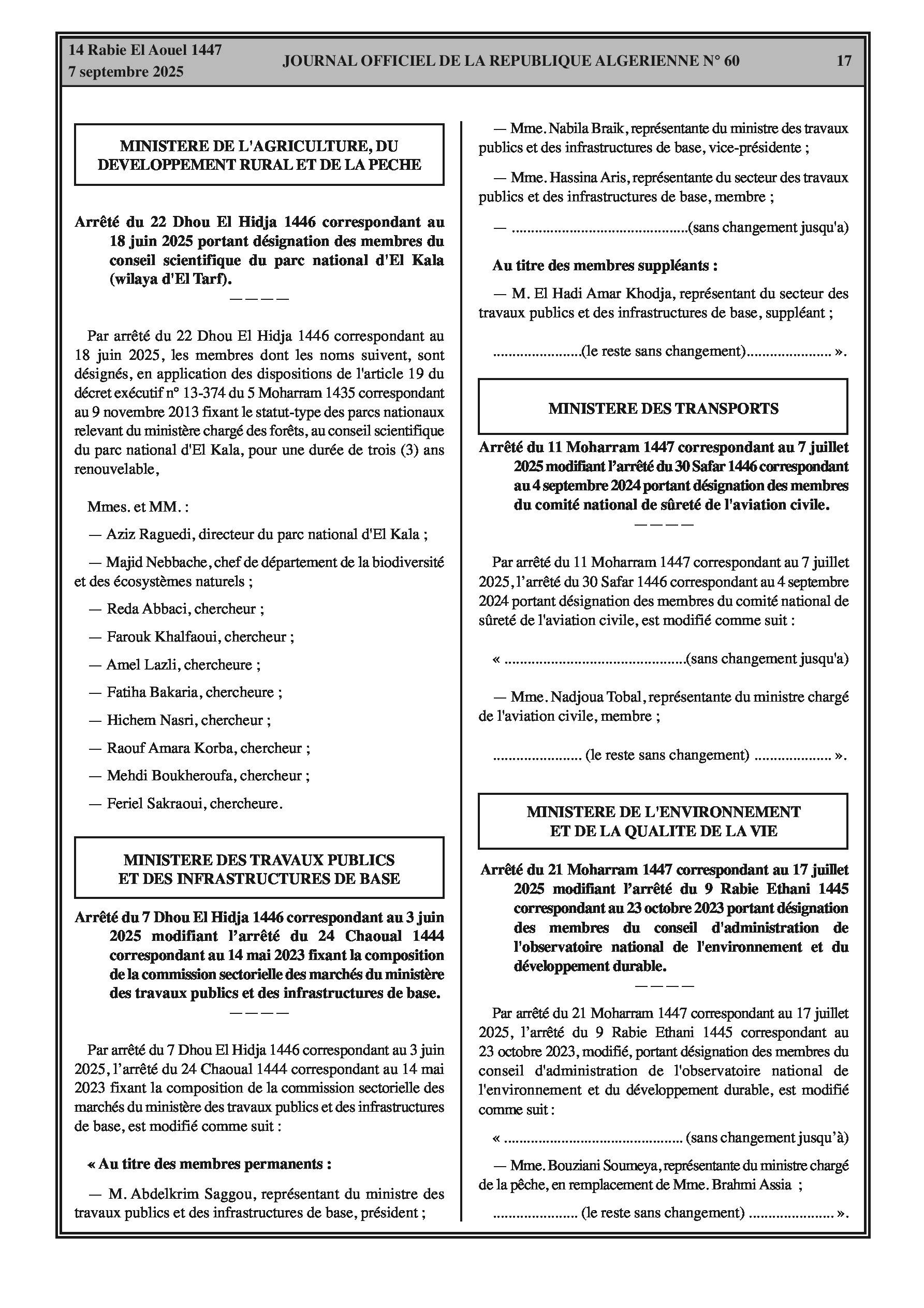 • Nomination de nouveaux membres au conseil scientifique du parc national d'El Kala et à la commission nationale des aires protégées.