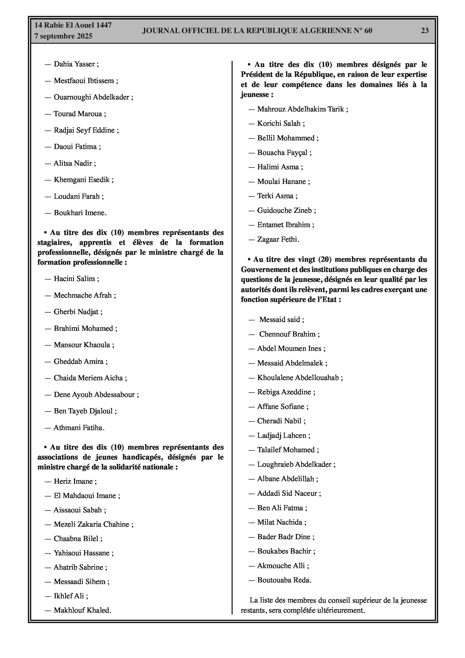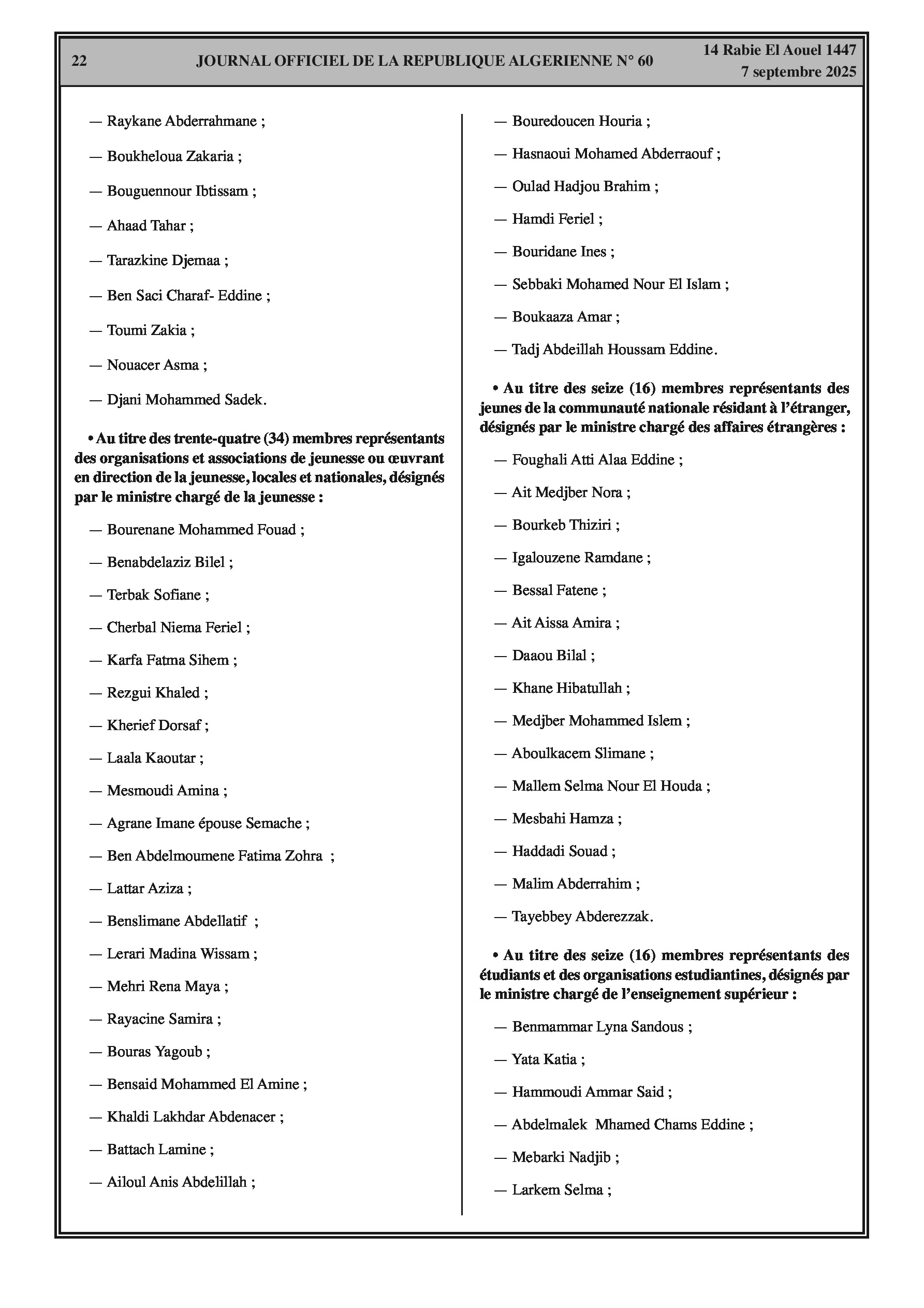 Décision fixant la liste nominative complète des membres du Conseil Supérieur de la Jeunesse, représentant les jeunes des wilayas, les associations, la communauté à l'étranger et les experts désignés par le Président de la République.