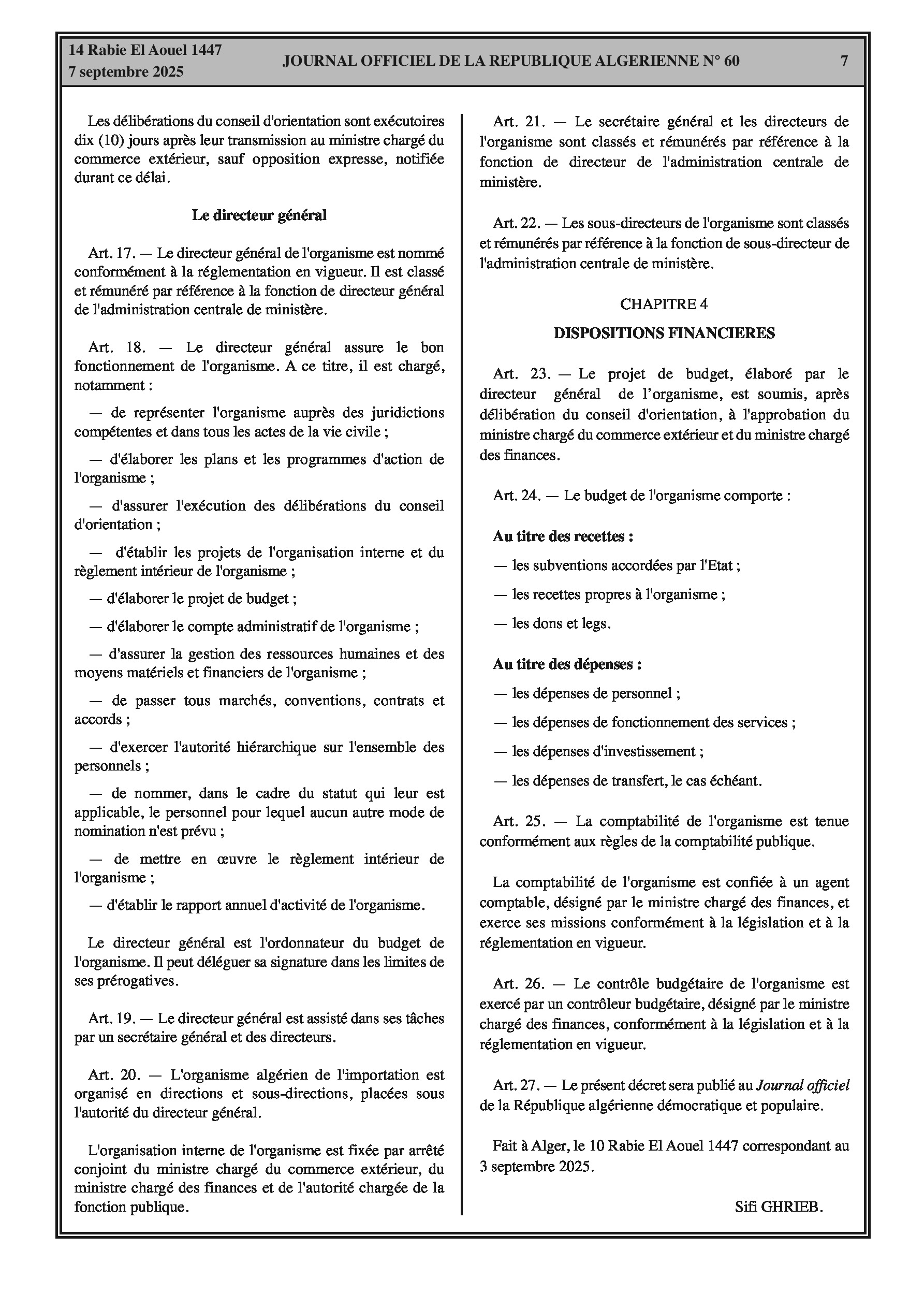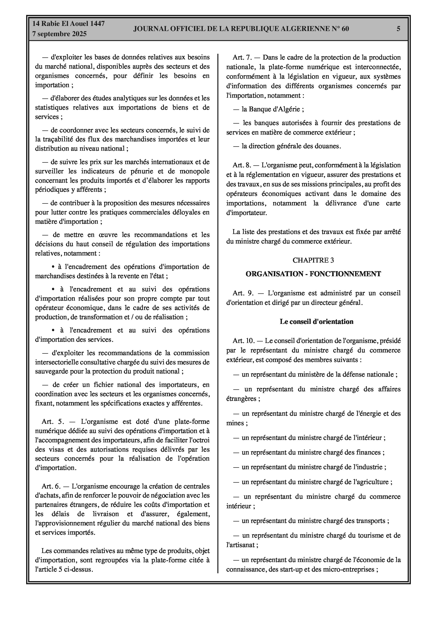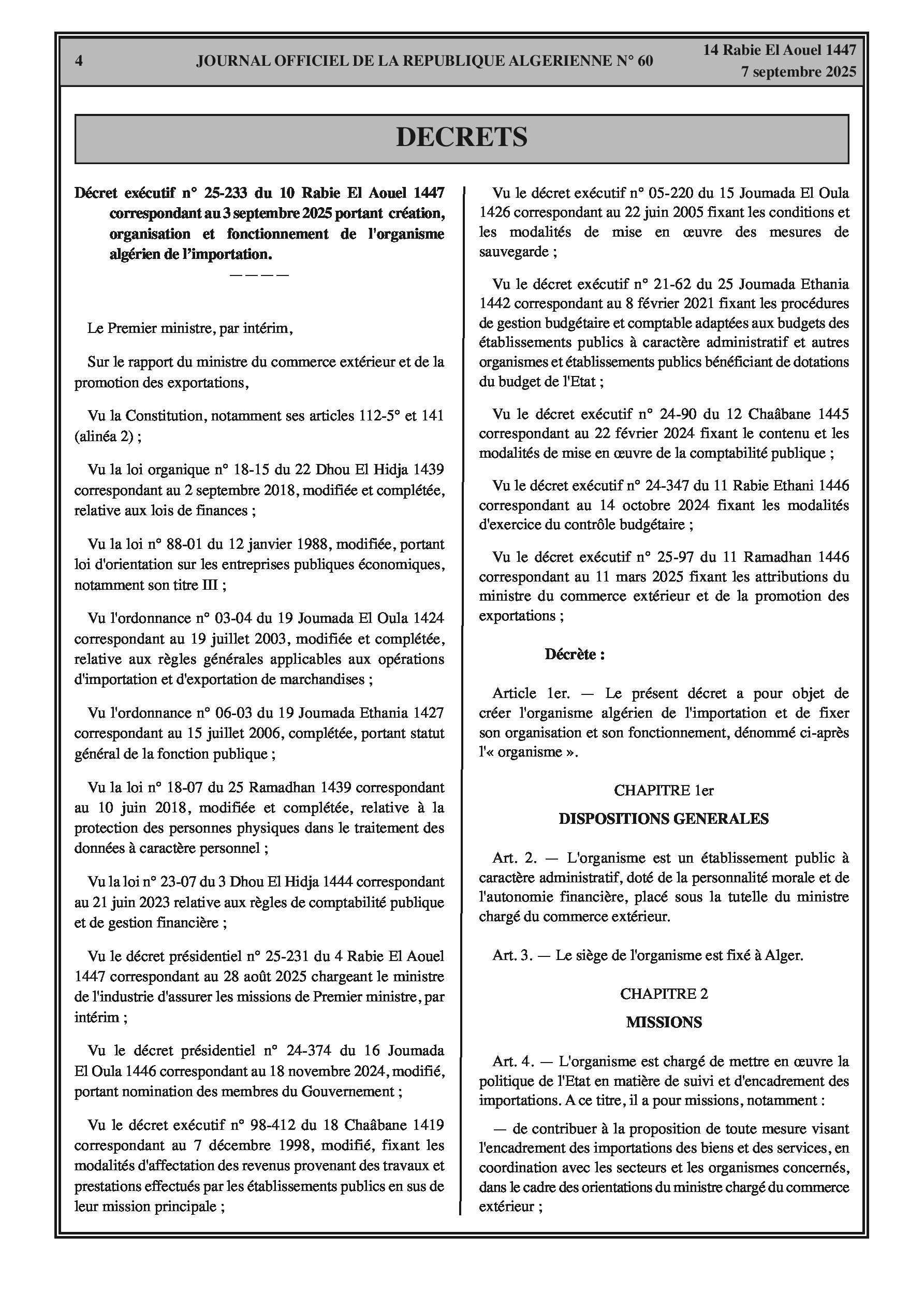 • Décret exécutif n° 25-233 : Création, organisation et fonctionnement de l'organisme algérien de l'importation, un établissement public administratif chargé de la mise en œuvre de la politique de l'État en matière de suivi des importations.