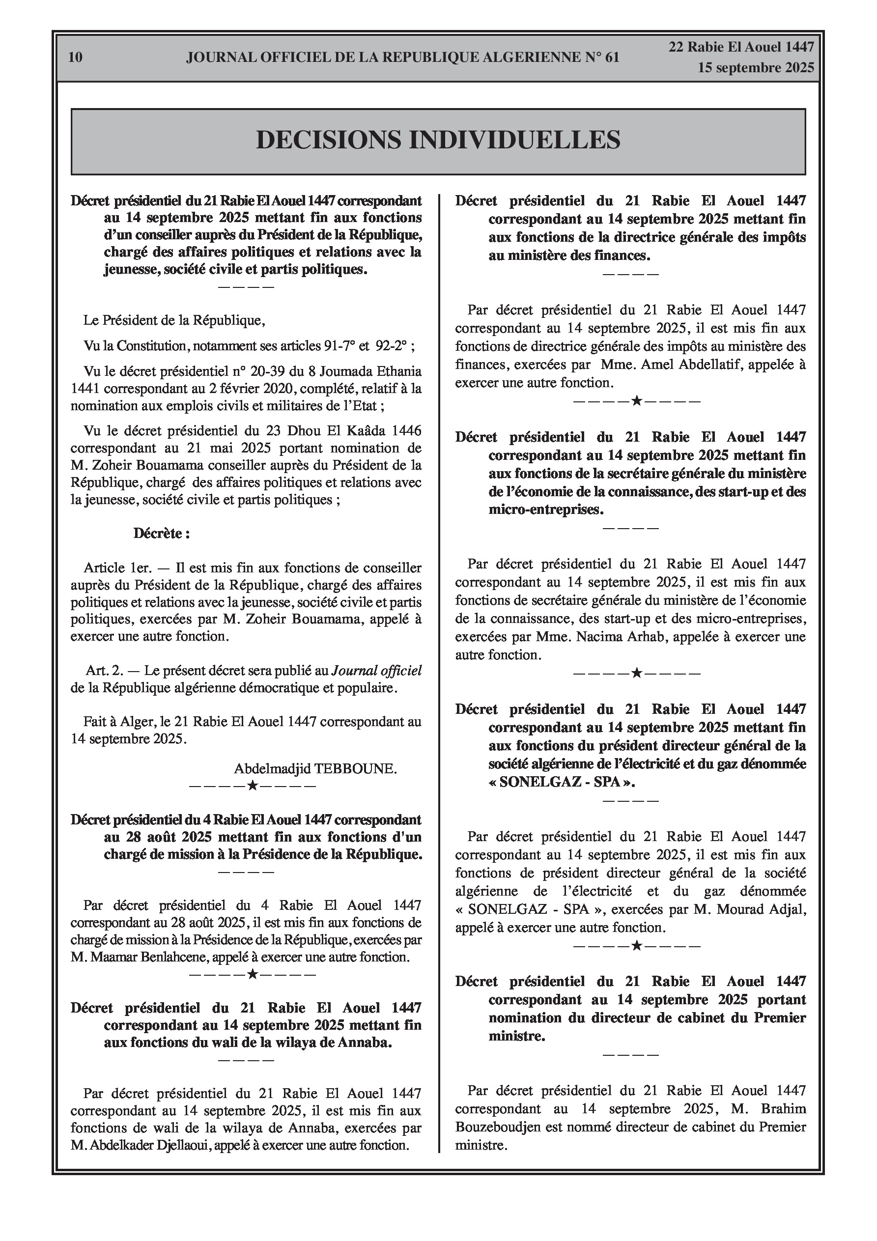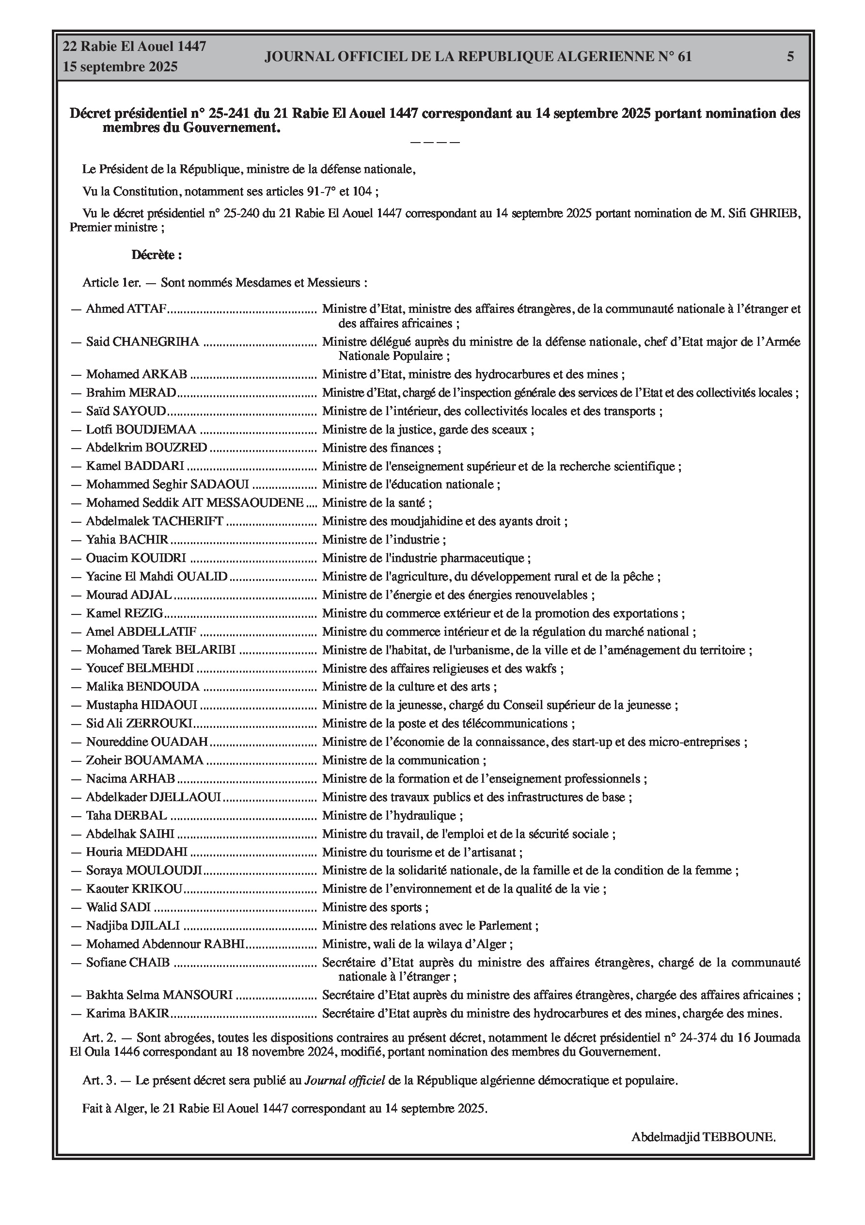 - Décret présidentiel n° 25-241 nommant les membres du nouveau Gouvernement aux différents portefeuilles ministériels.
