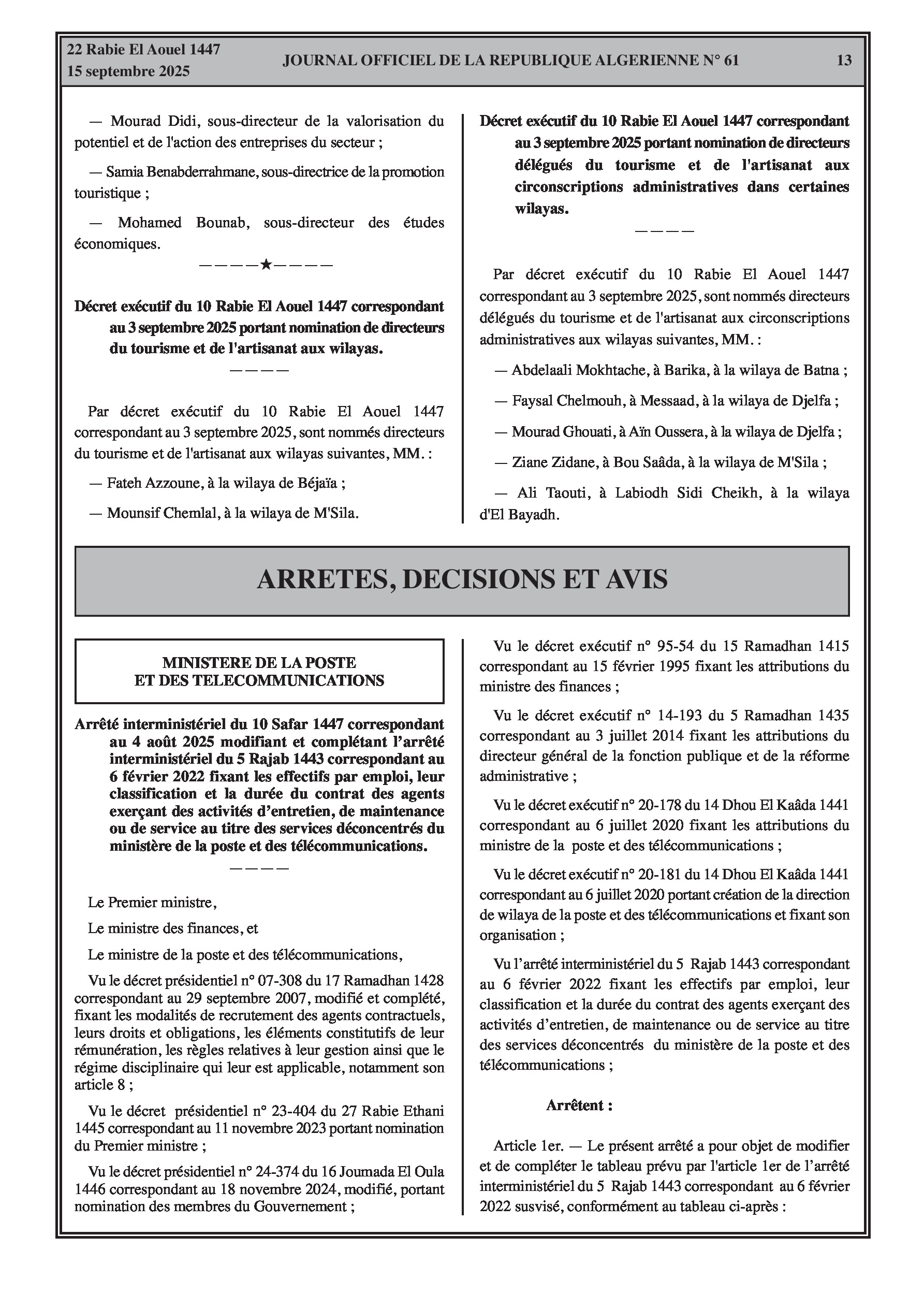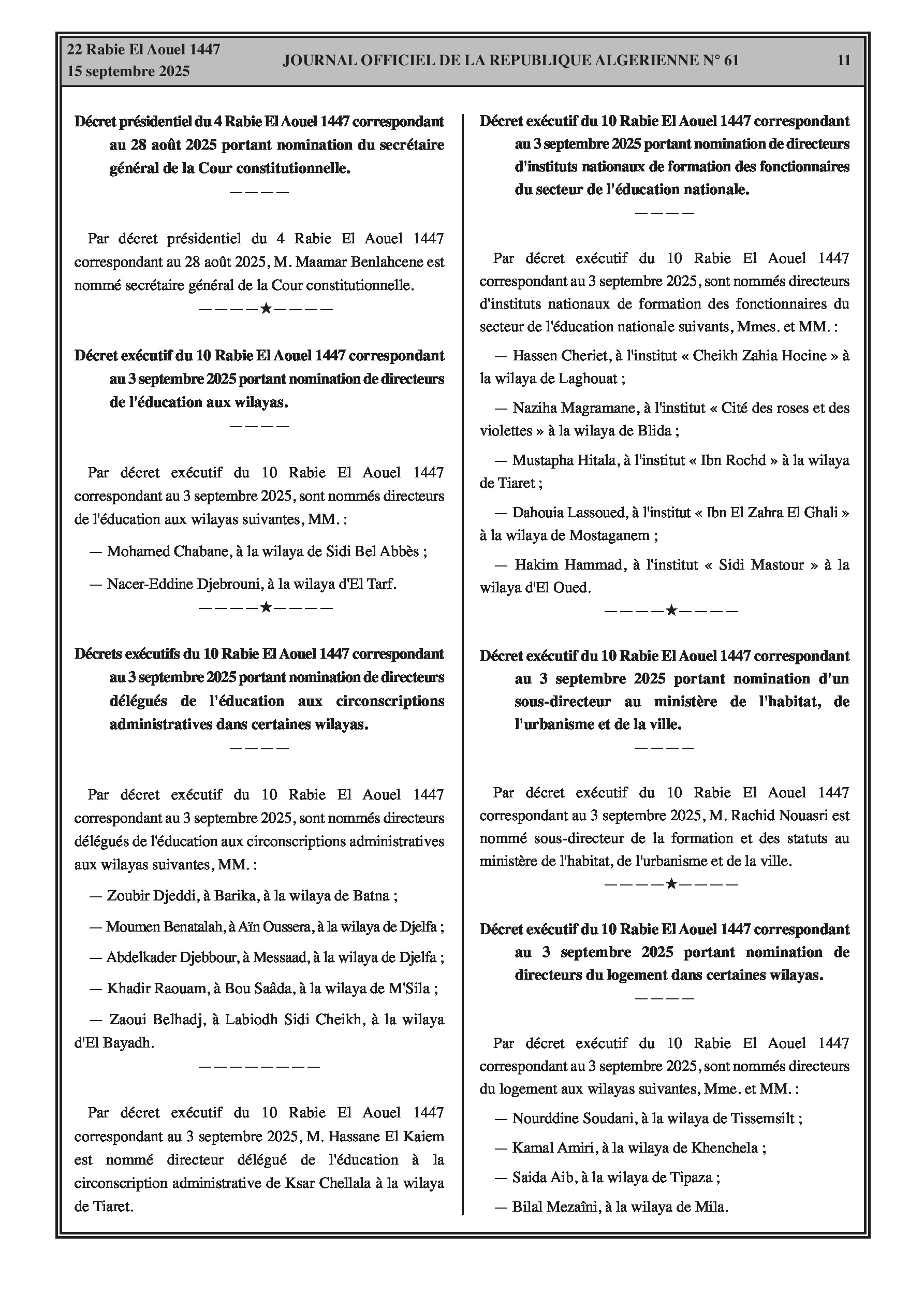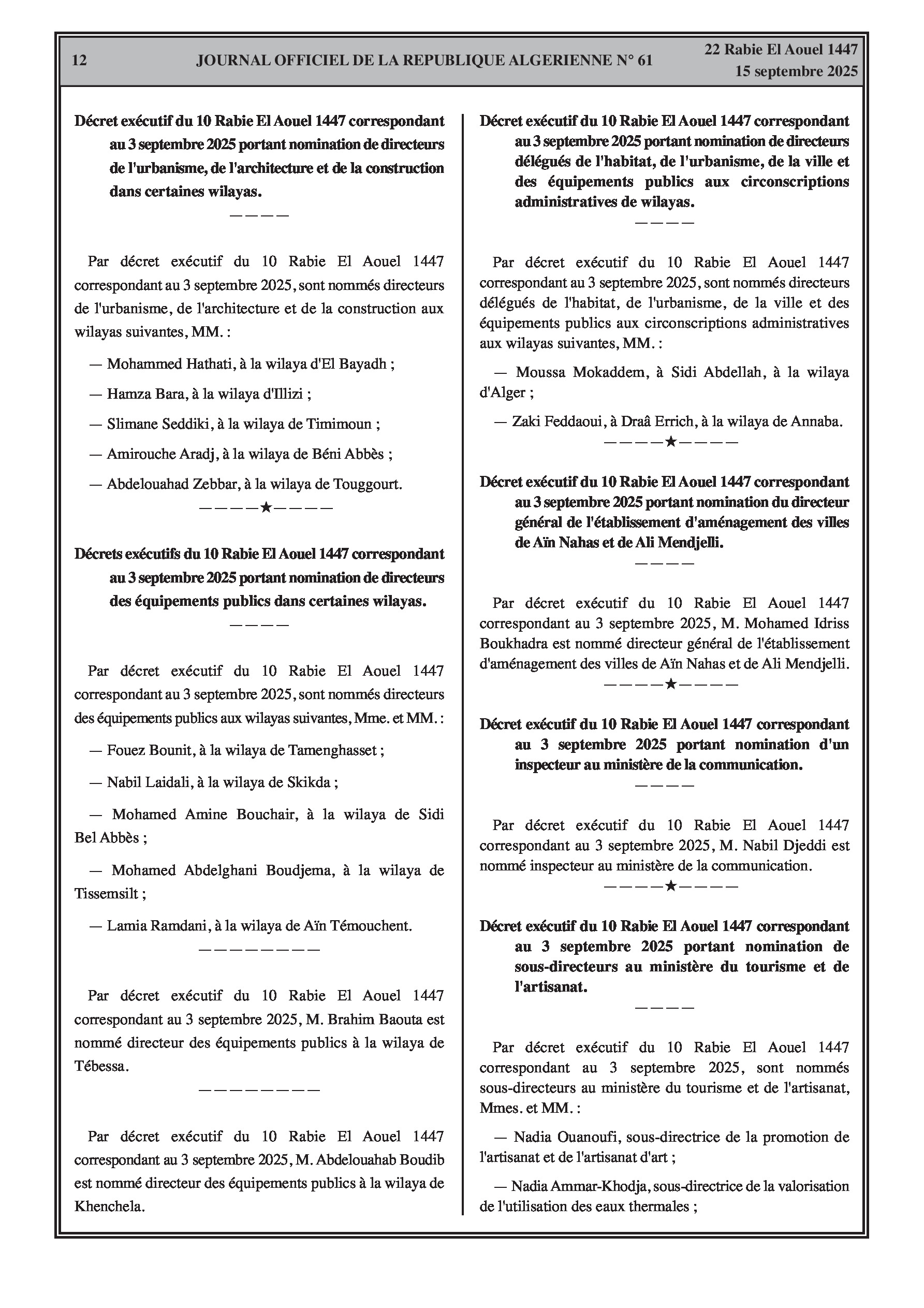 - Nomination de nouveaux directeurs dans les secteurs de l'éducation, de l'habitat, de l'urbanisme, du tourisme et des équipements publics dans plusieurs wilayas.