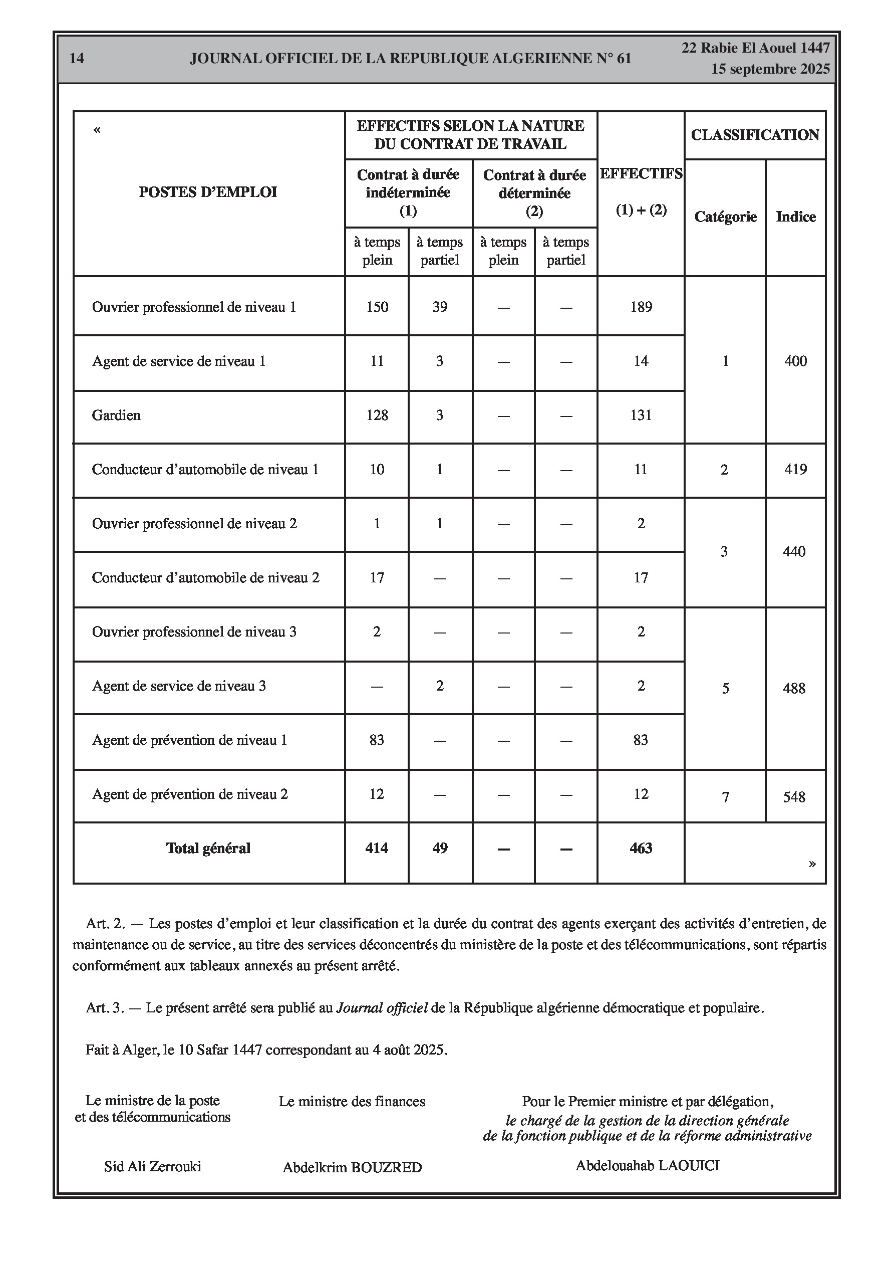 - Poste et Télécommunications : Modification de l'arrêté fixant les effectifs, la classification et la durée des contrats des agents contractuels dans les services déconcentrés du ministère.