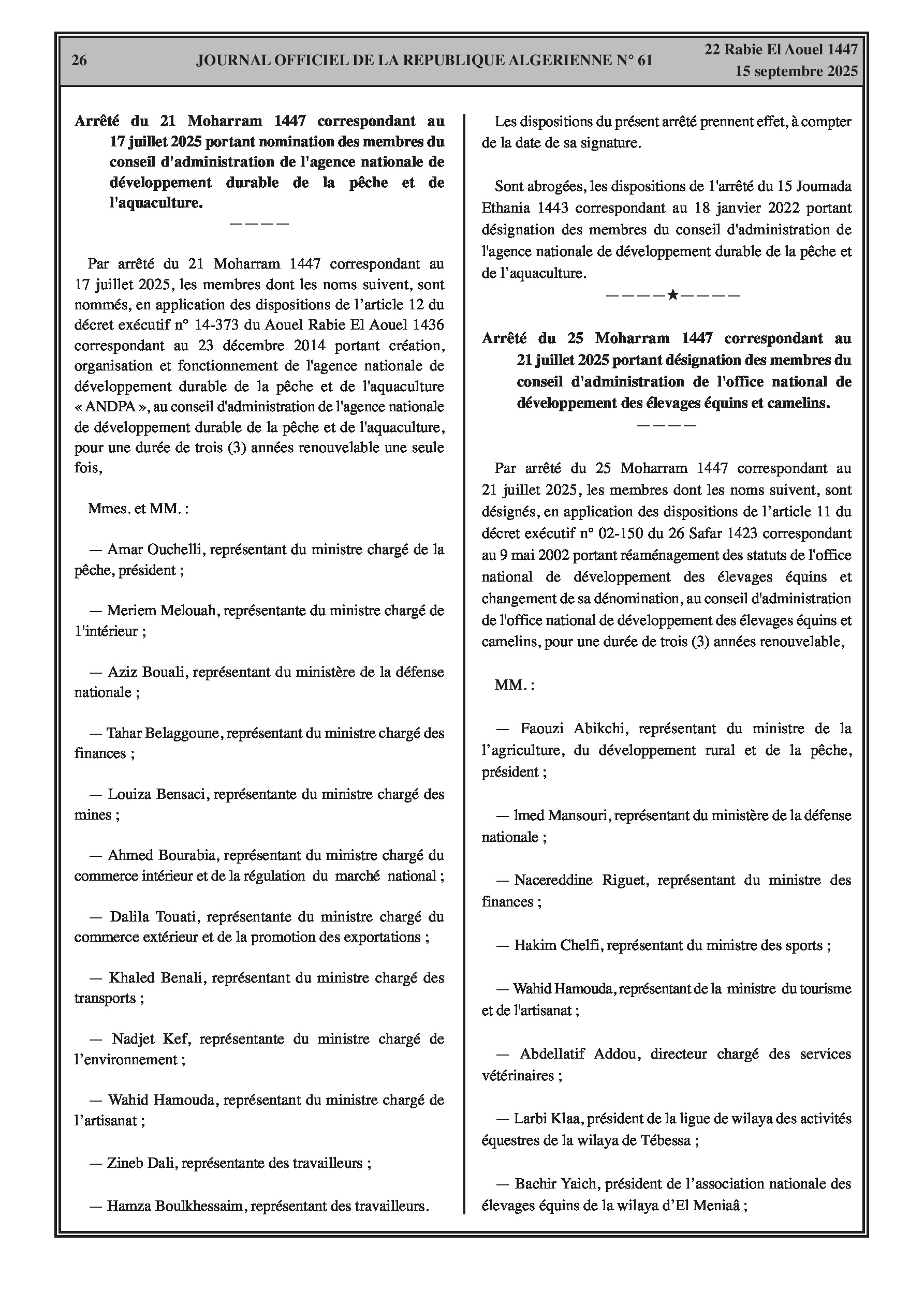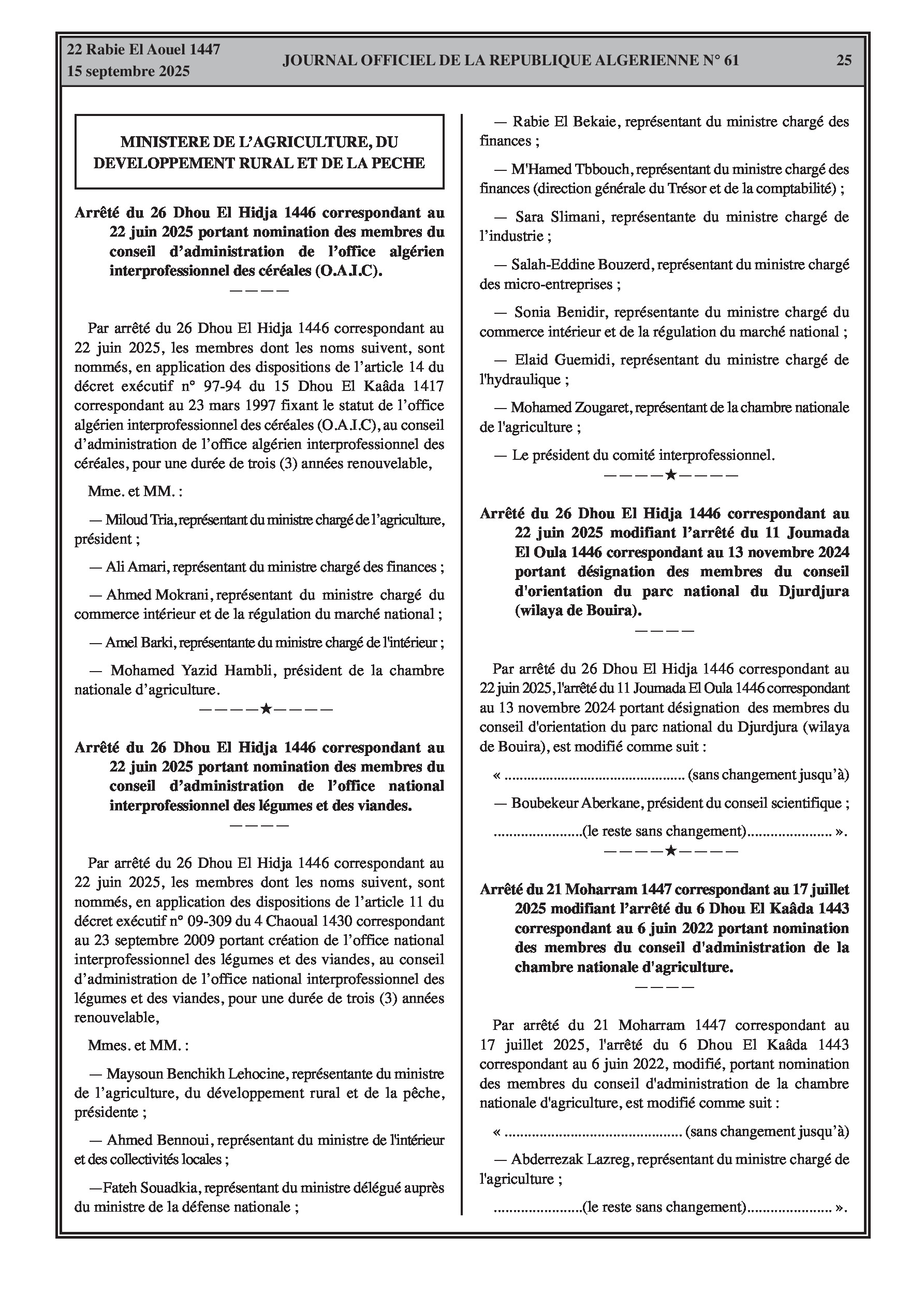 - Agriculture : Nomination des membres des conseils d'administration de l'Office algérien interprofessionnel des céréales (OAIC), de l'Office national interprofessionnel des légumes et des viandes, de l'Agence nationale de développement durable de la pêche et de l'aquaculture, et de l'Office national de développement des élevages équins et camelins.