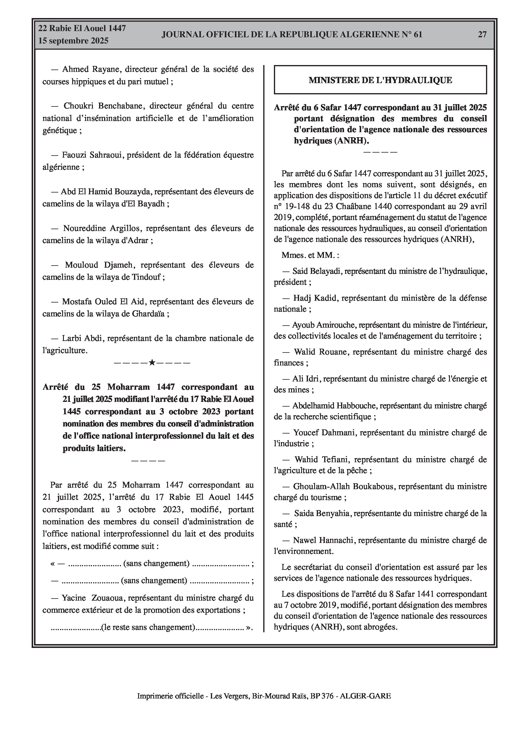 - Hydraulique : Désignation des membres du conseil d'orientation de l'Agence nationale des ressources hydriques (ANRH).