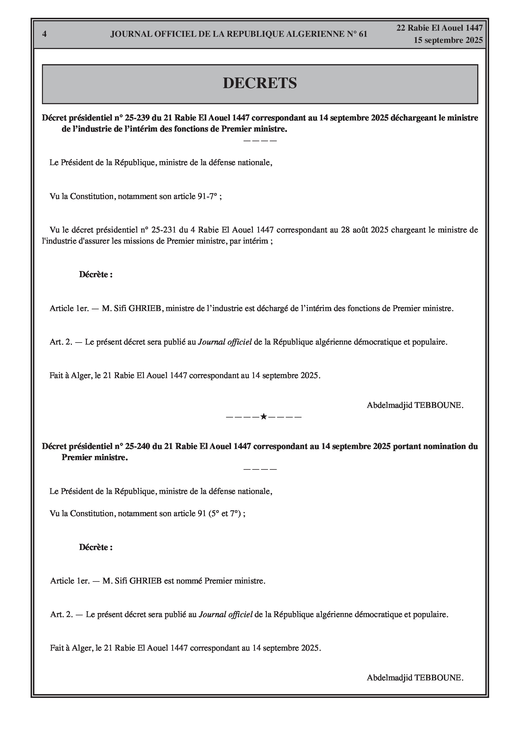 - Décret présidentiel n° 25-240 nommant M. Sifi GHRIEB Premier ministre.