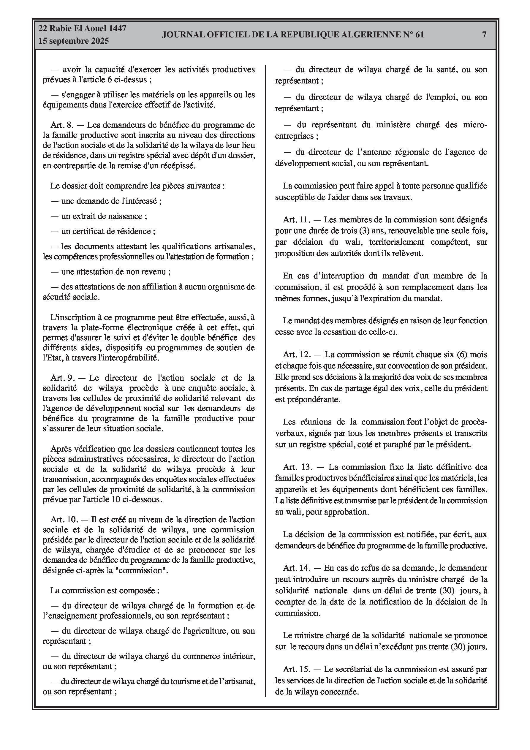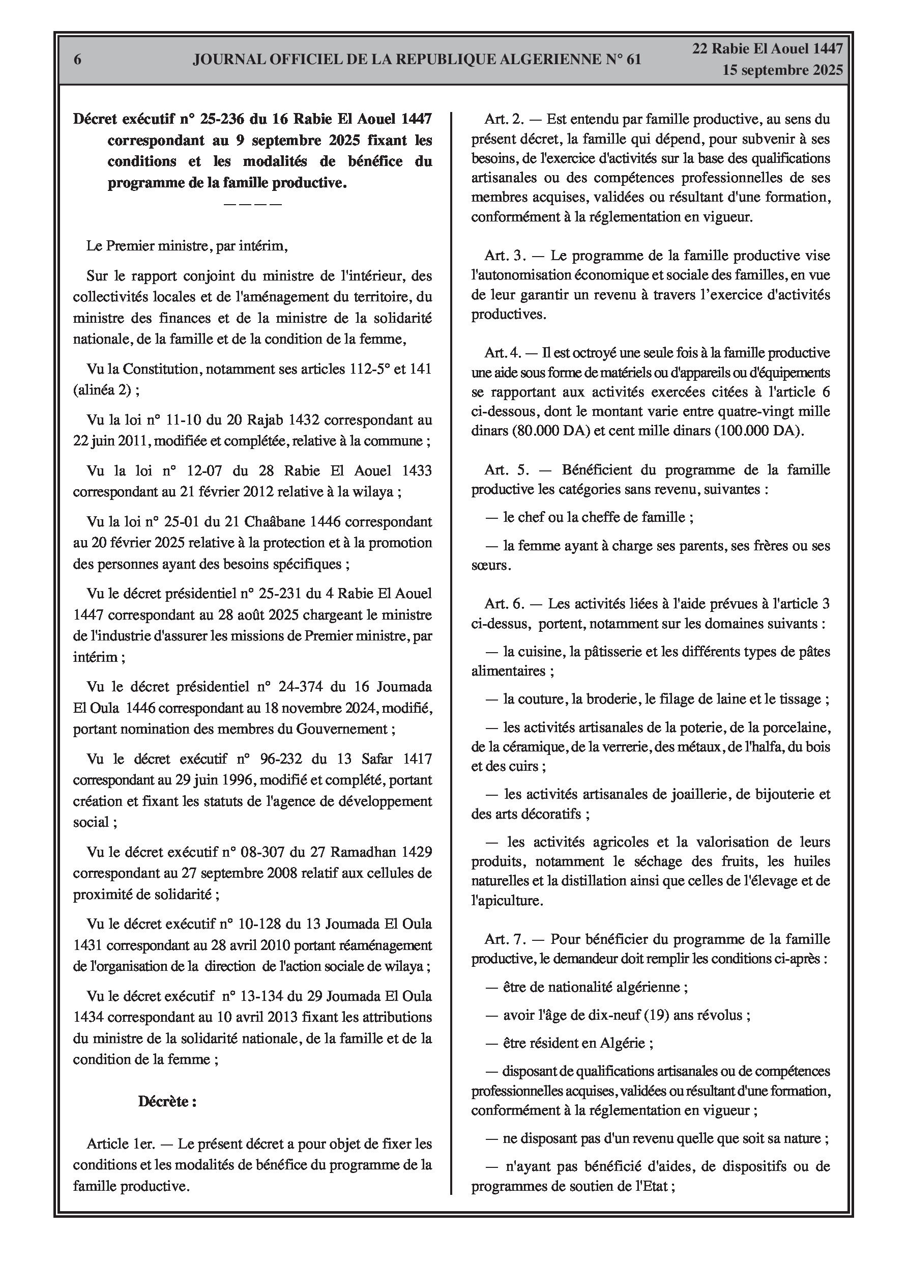 Un décret exécutif fixe les conditions et modalités pour bénéficier du programme de la 'famille productive', visant l'autonomisation économique et sociale des familles sans revenu en soutenant leurs activités productives.