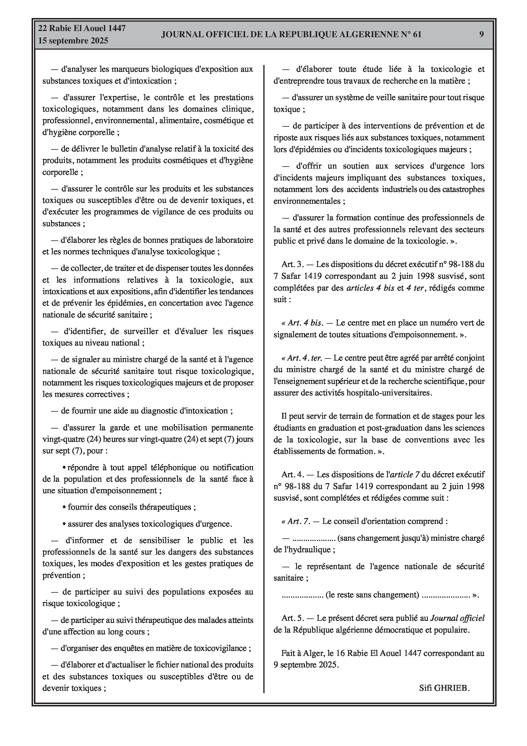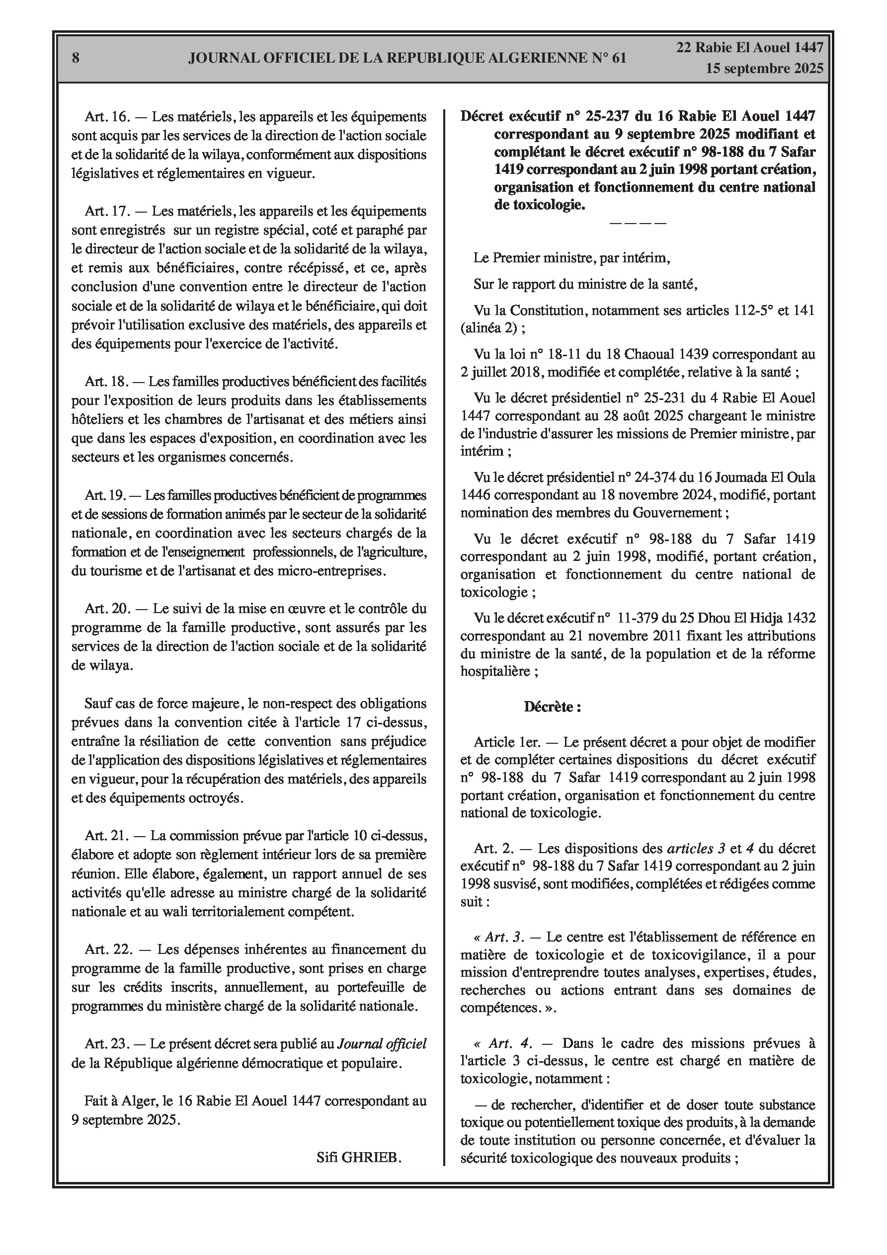 N°61 du Journal officiel de la République Algérienne Démocratique et Populaire publié le 15 septembre 2025: