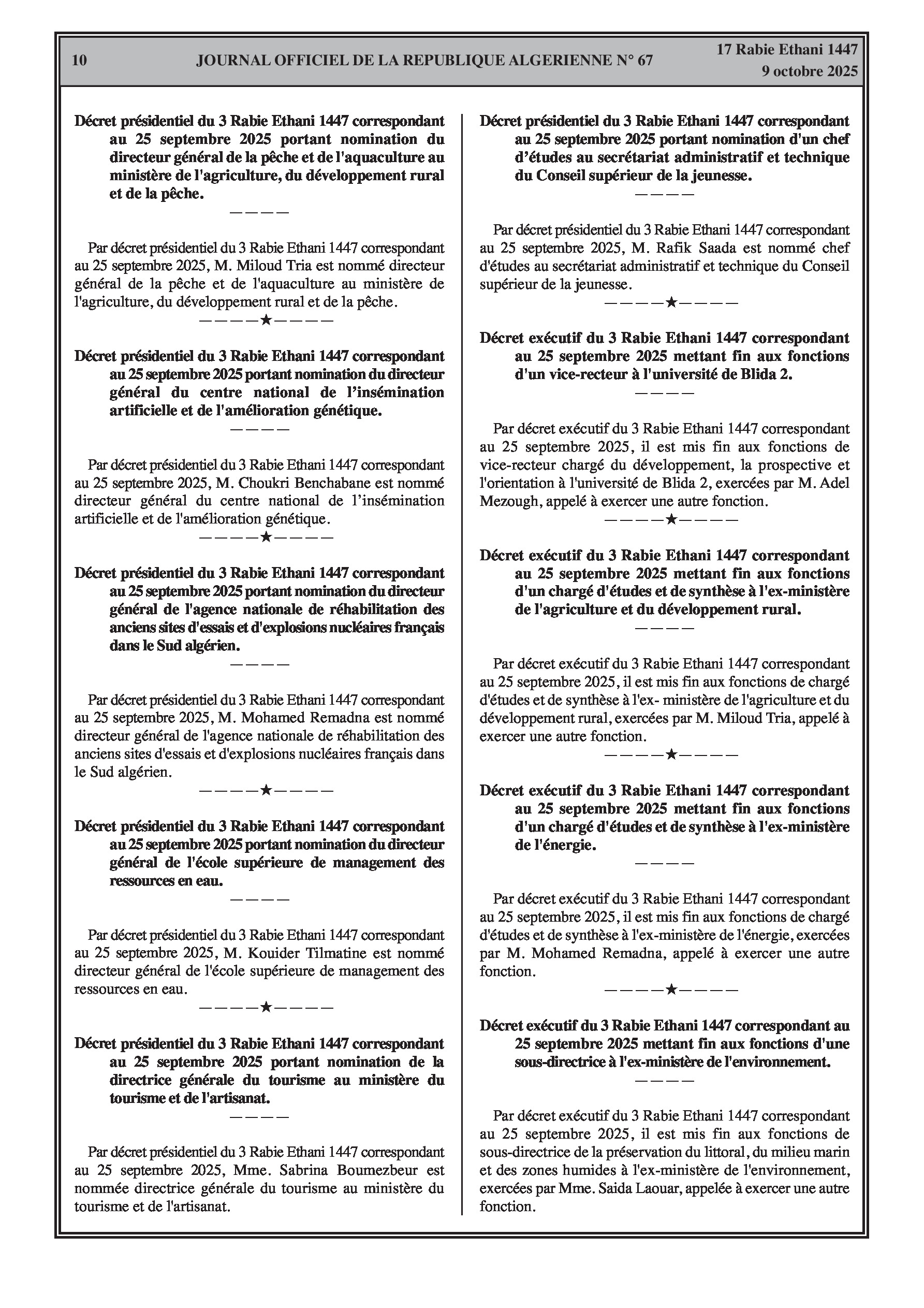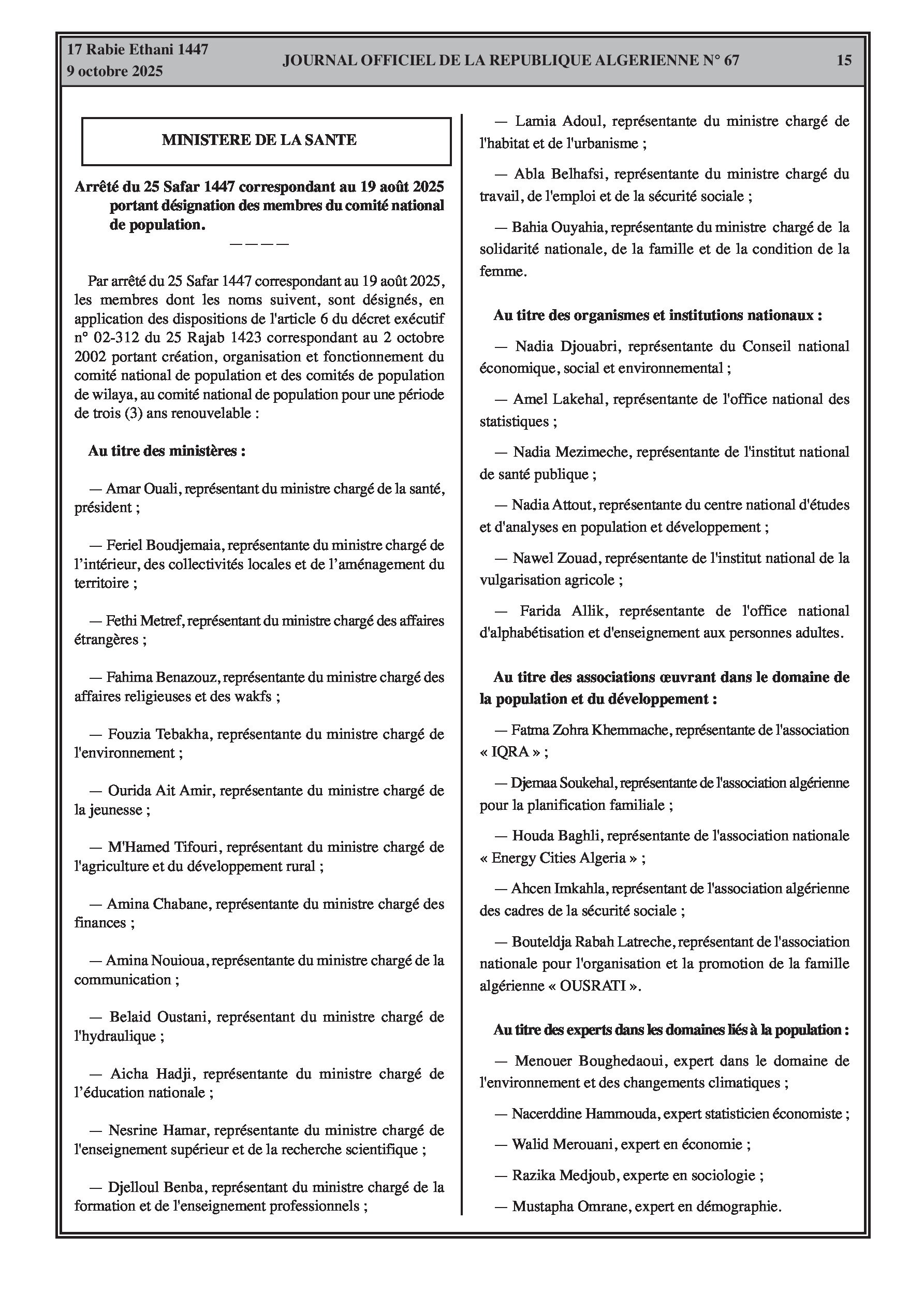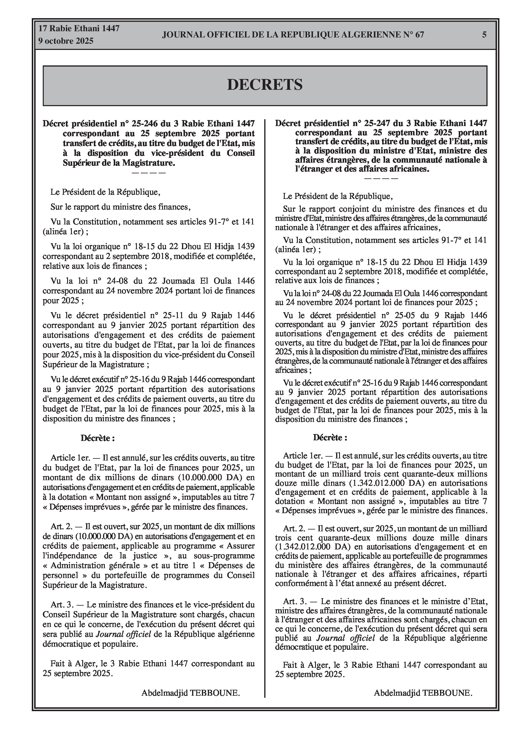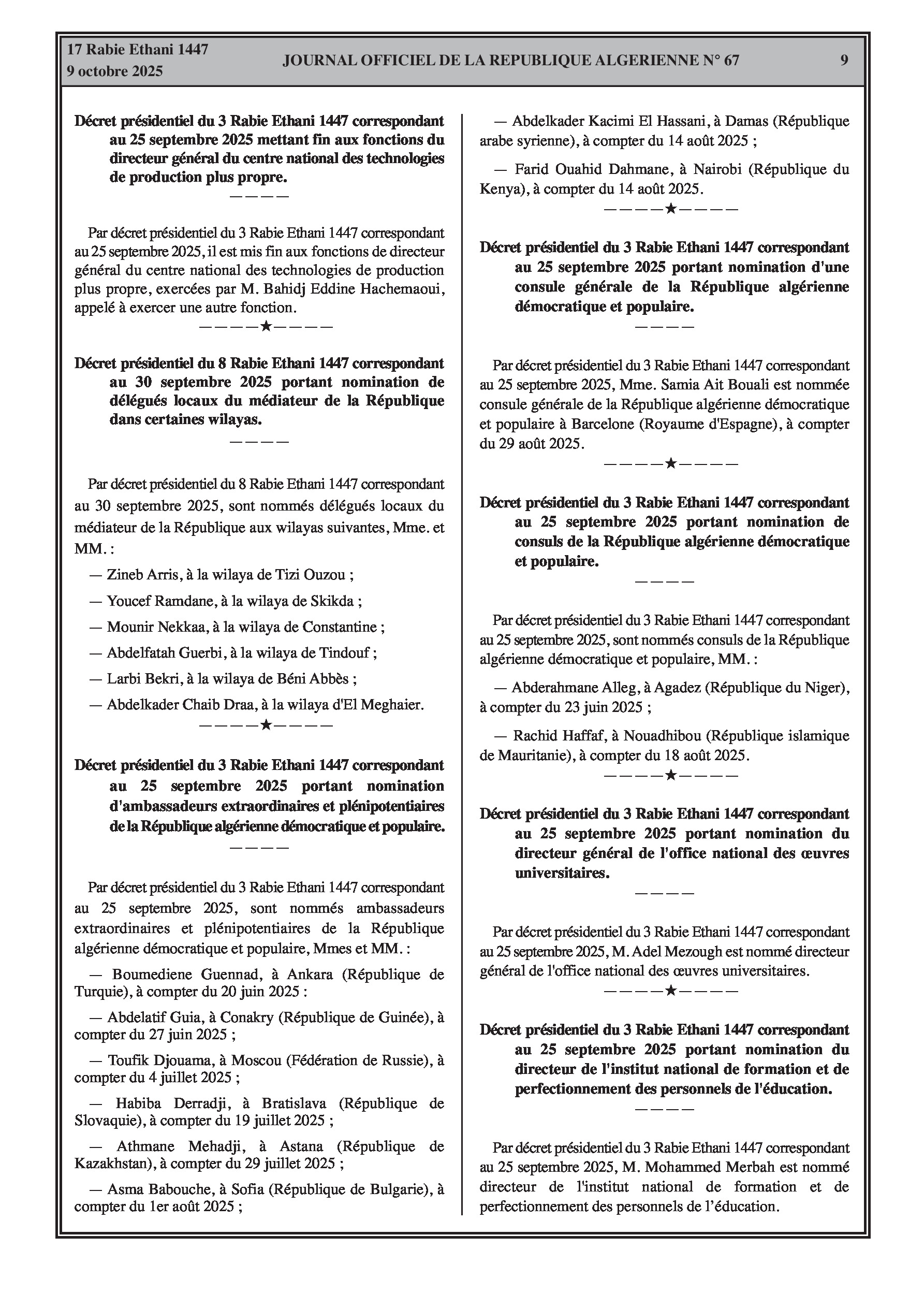 N°67 du Journal officiel de la République Algérienne Démocratique et Populaire publié le 09 octobre 2025: