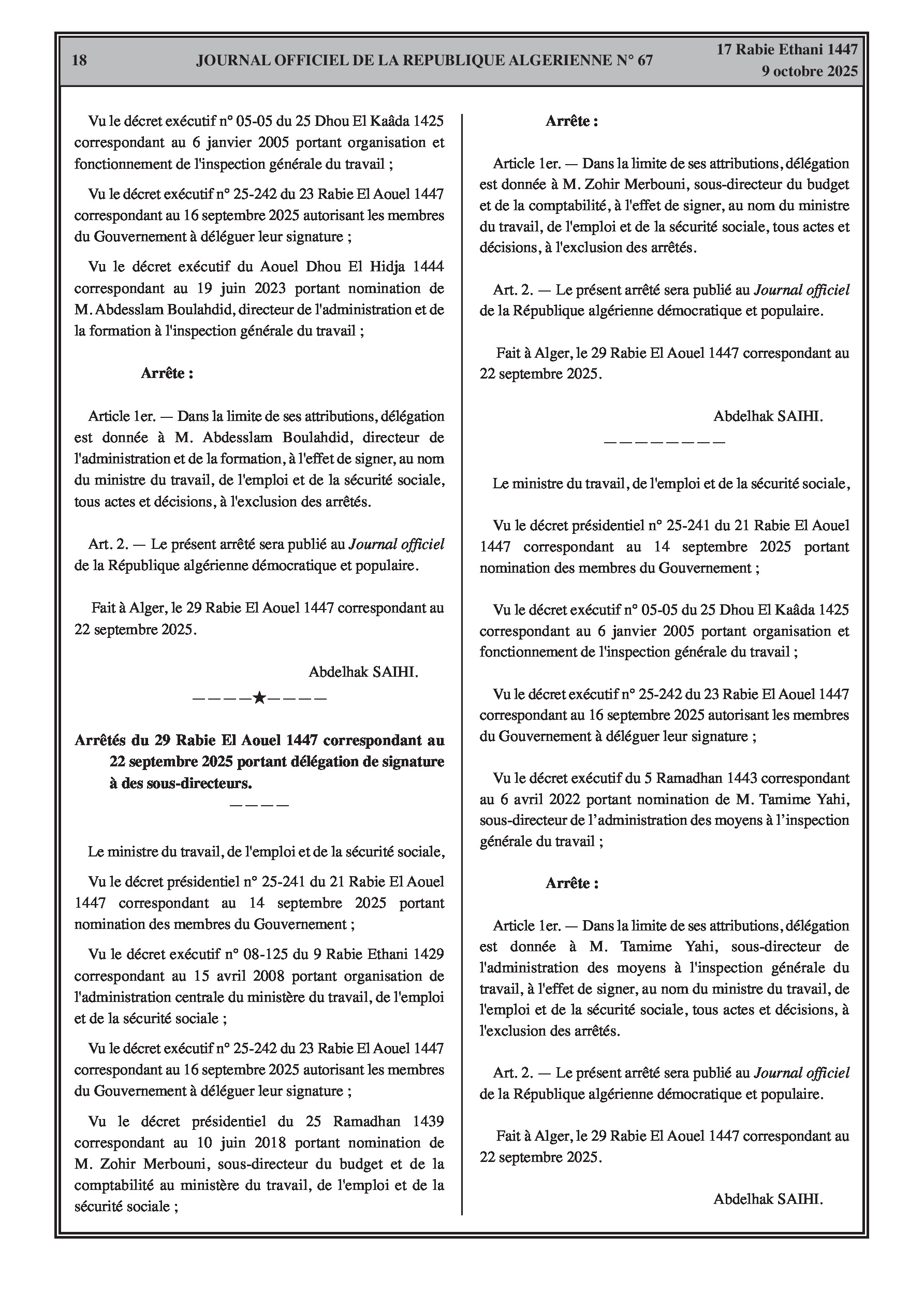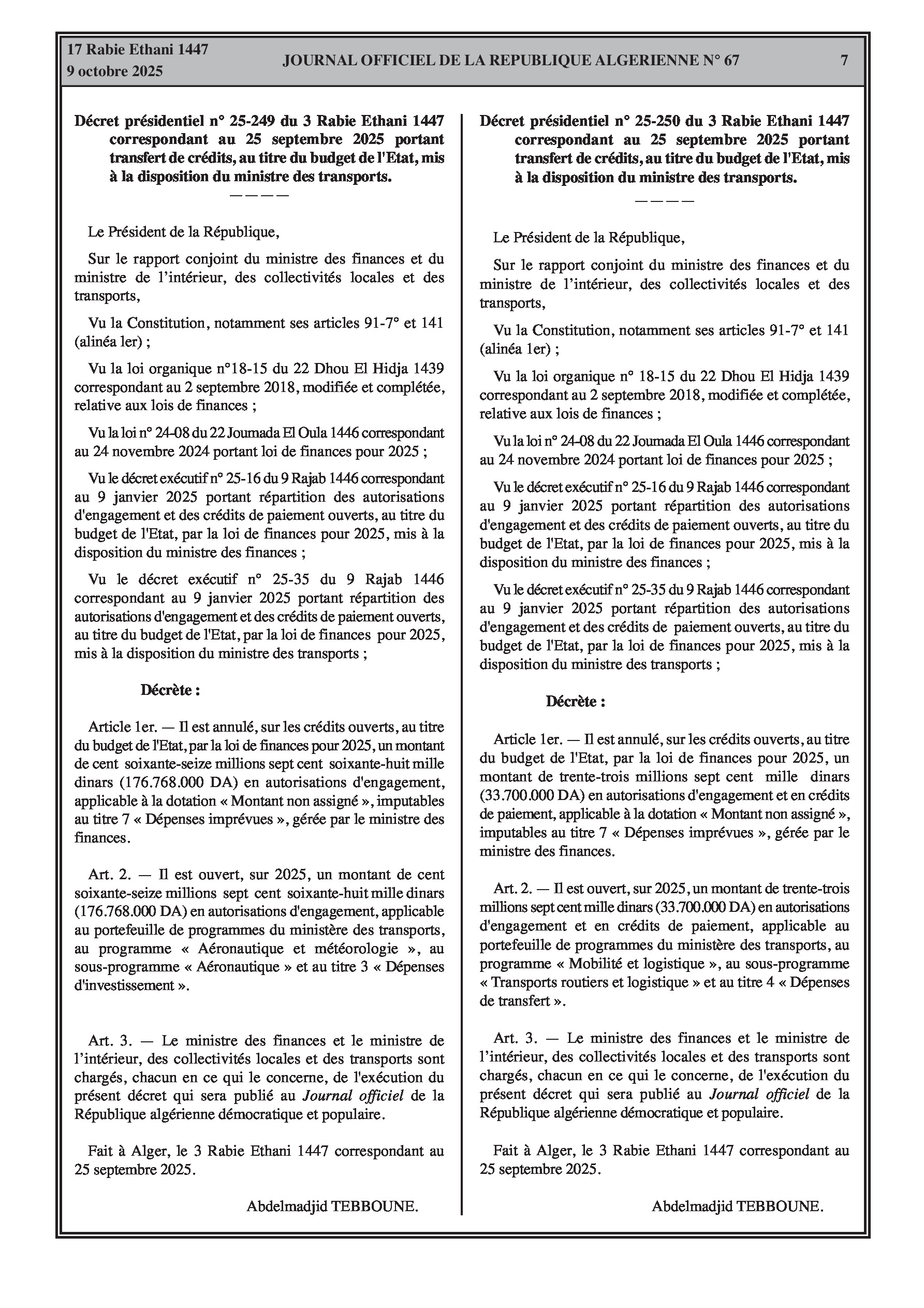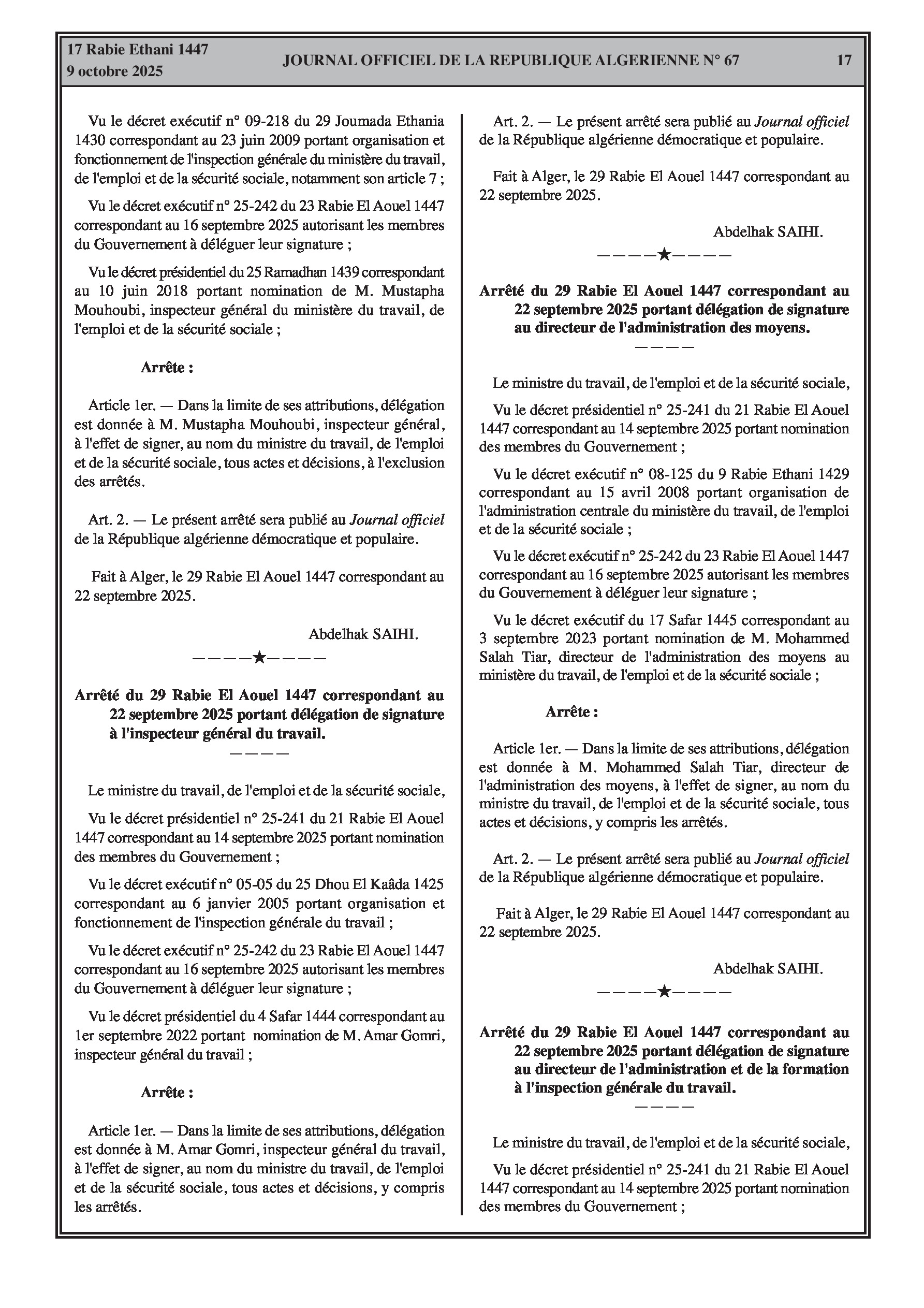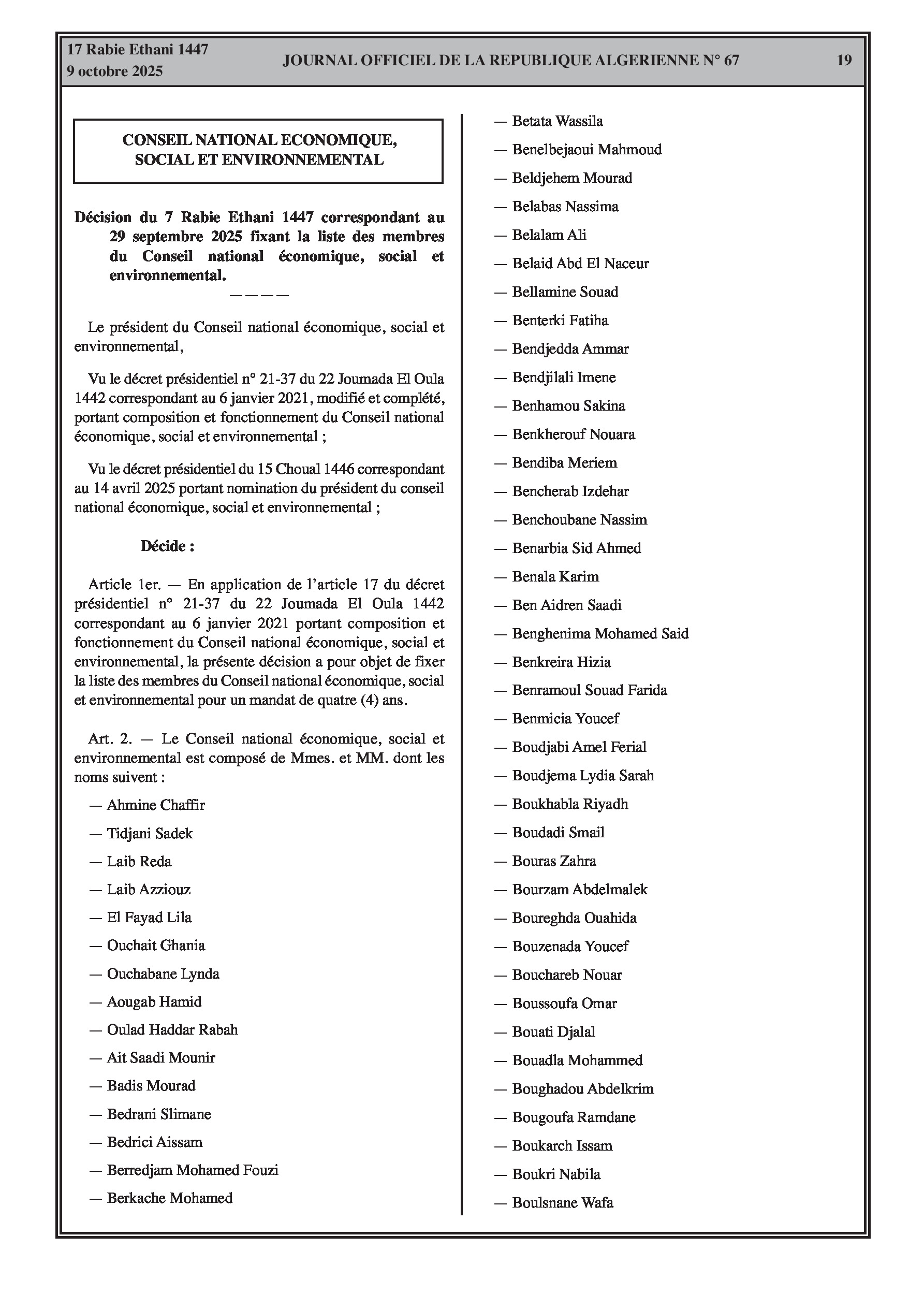 N°67 du Journal officiel de la République Algérienne Démocratique et Populaire publié le 09 octobre 2025: