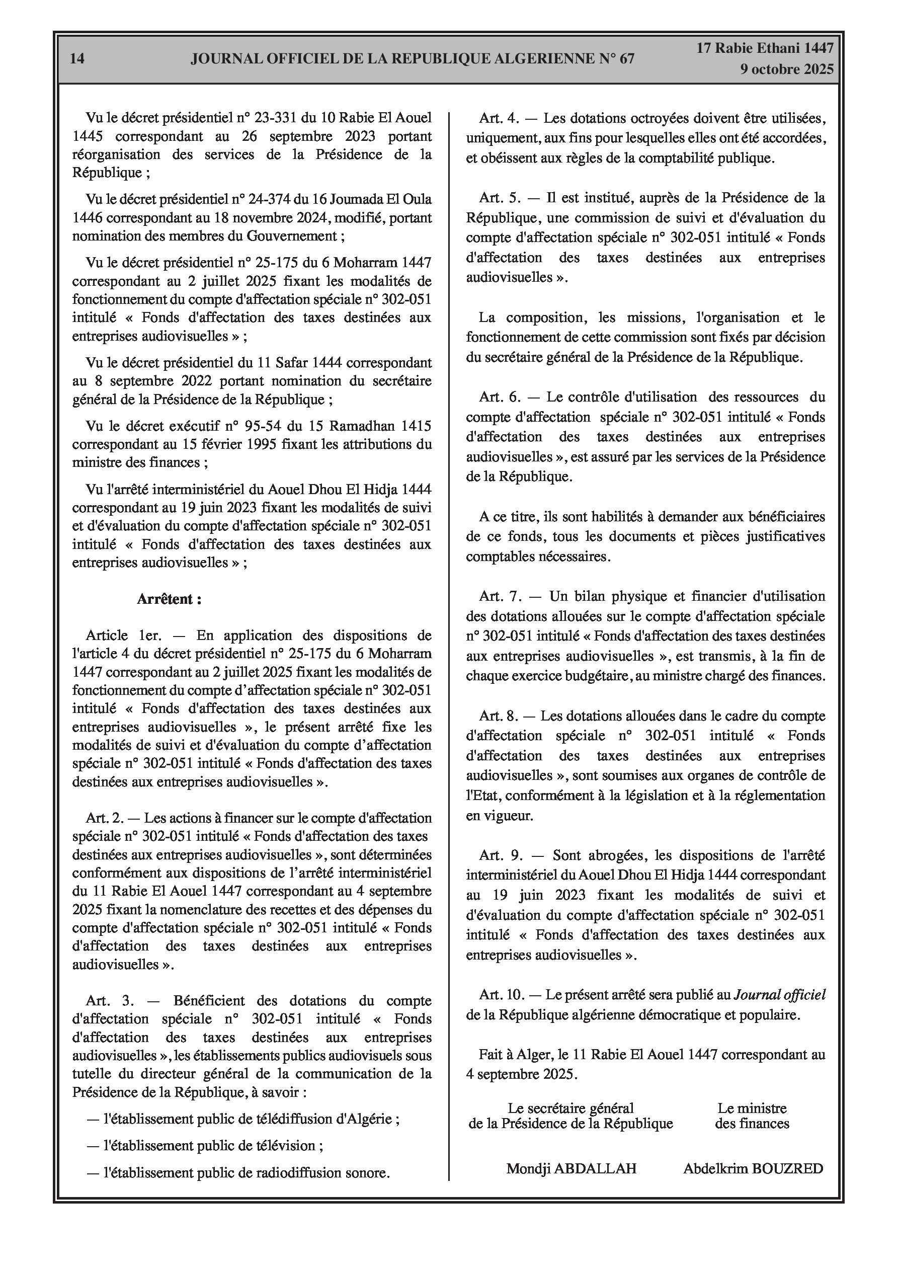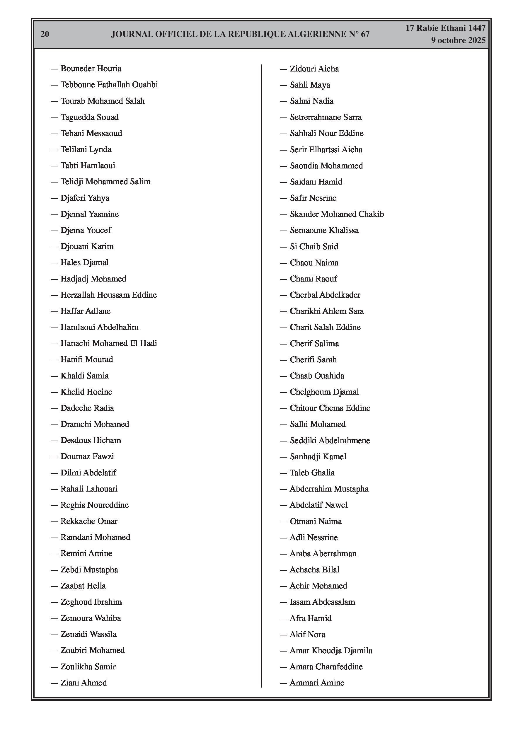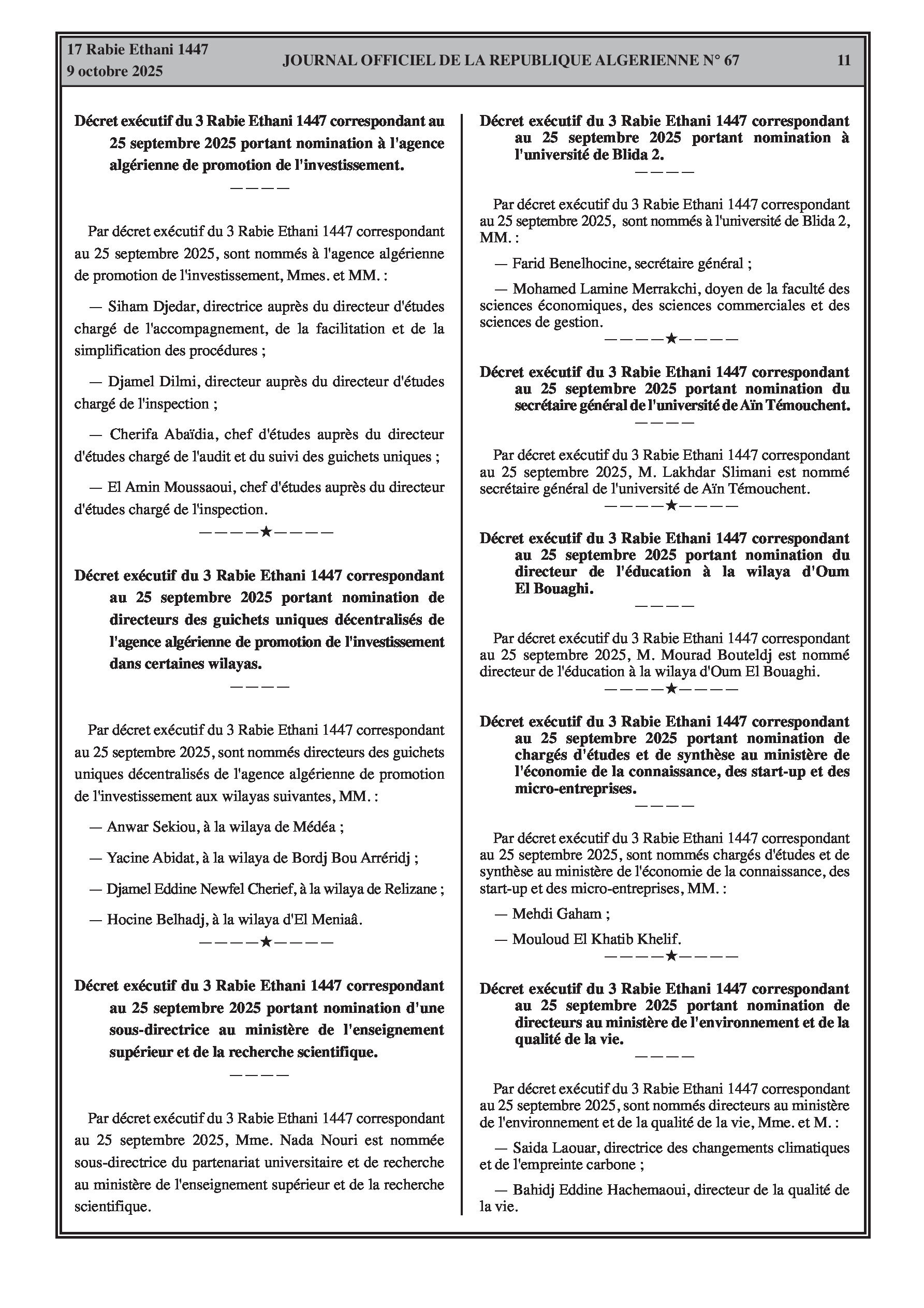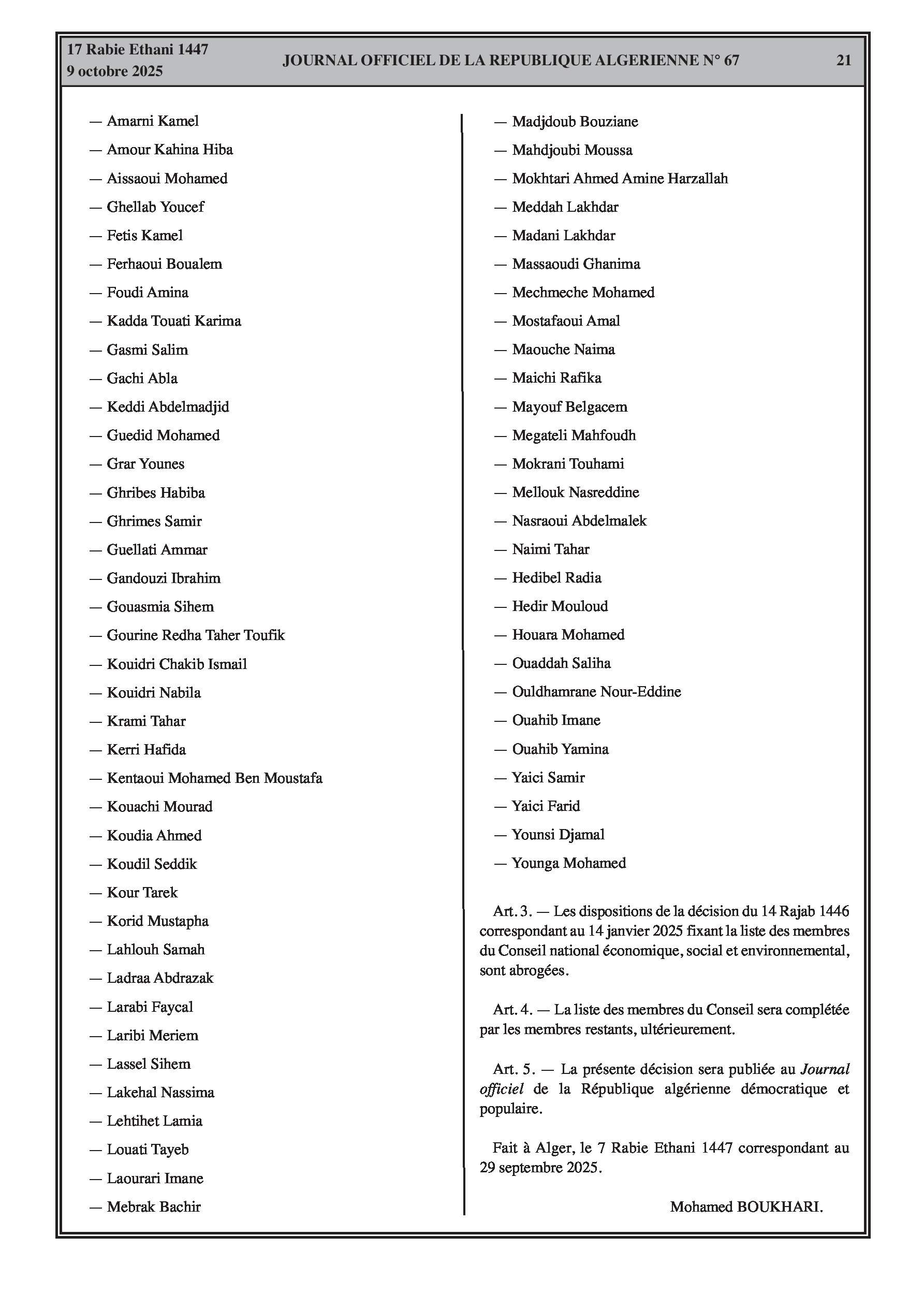 N°67 du Journal officiel de la République Algérienne Démocratique et Populaire publié le 09 octobre 2025: