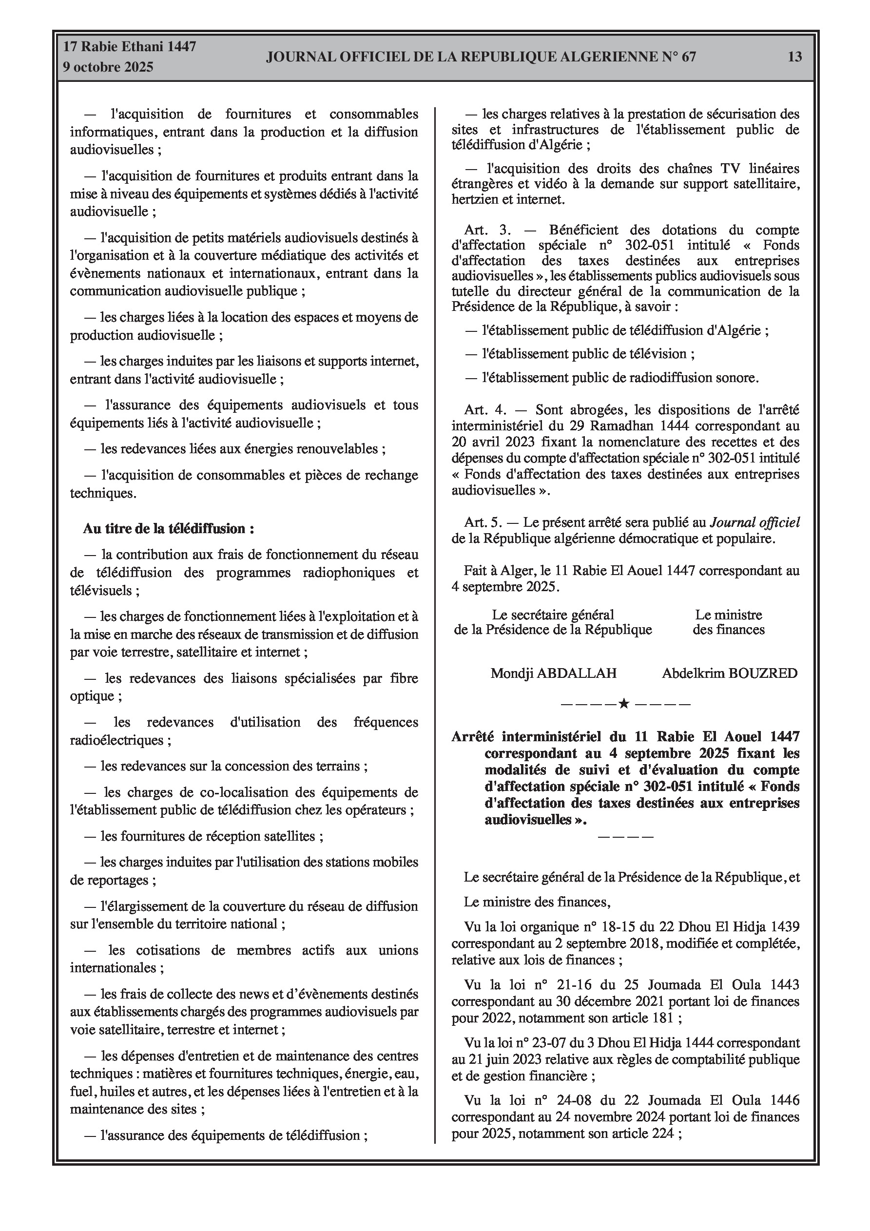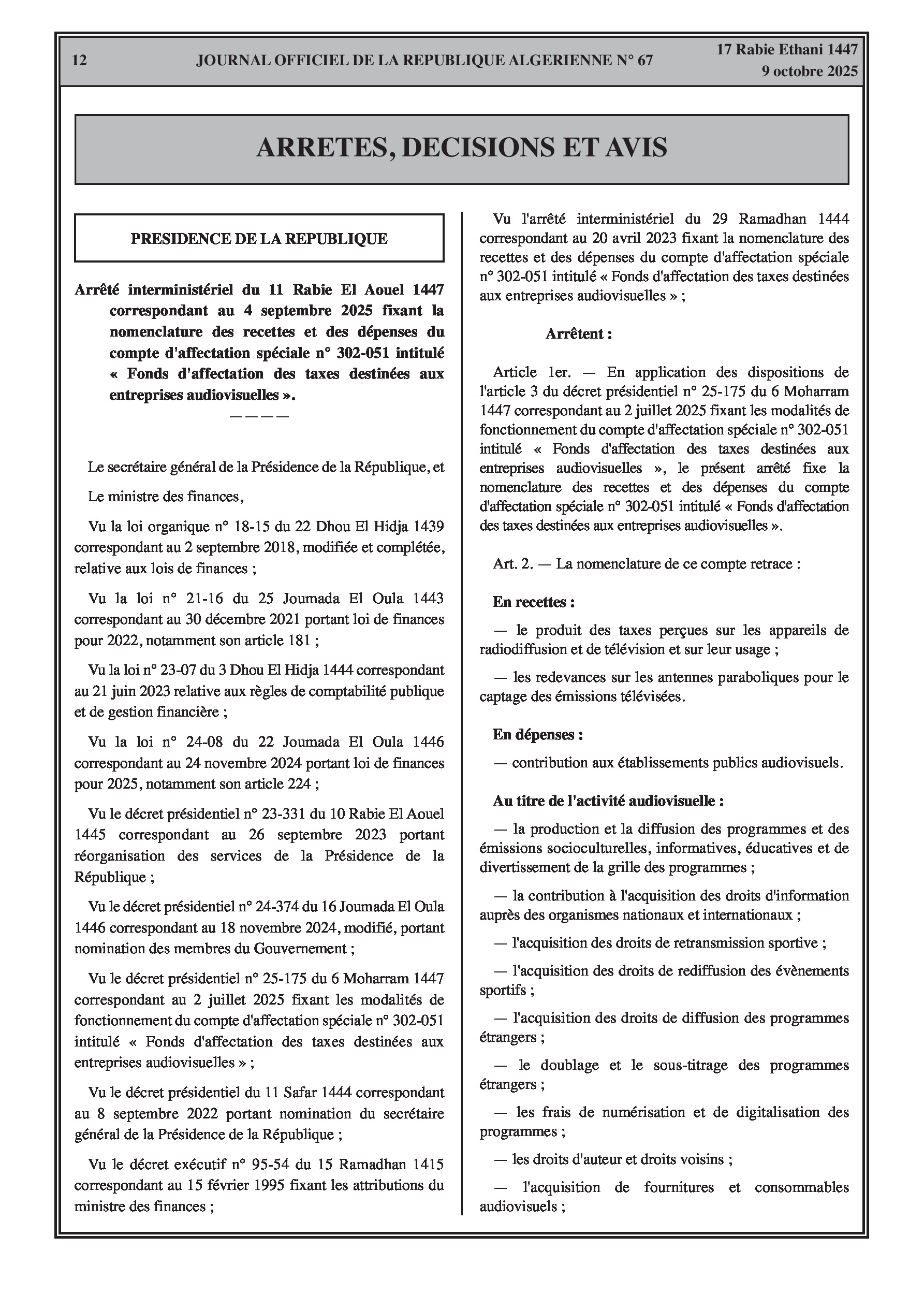 Deux arrêtés interministériels de la Présidence de la République définissent la nomenclature des recettes et dépenses ainsi que les modalités de suivi et d'évaluation du compte d'affectation spéciale destiné au financement des entreprises audiovisuelles publiques.