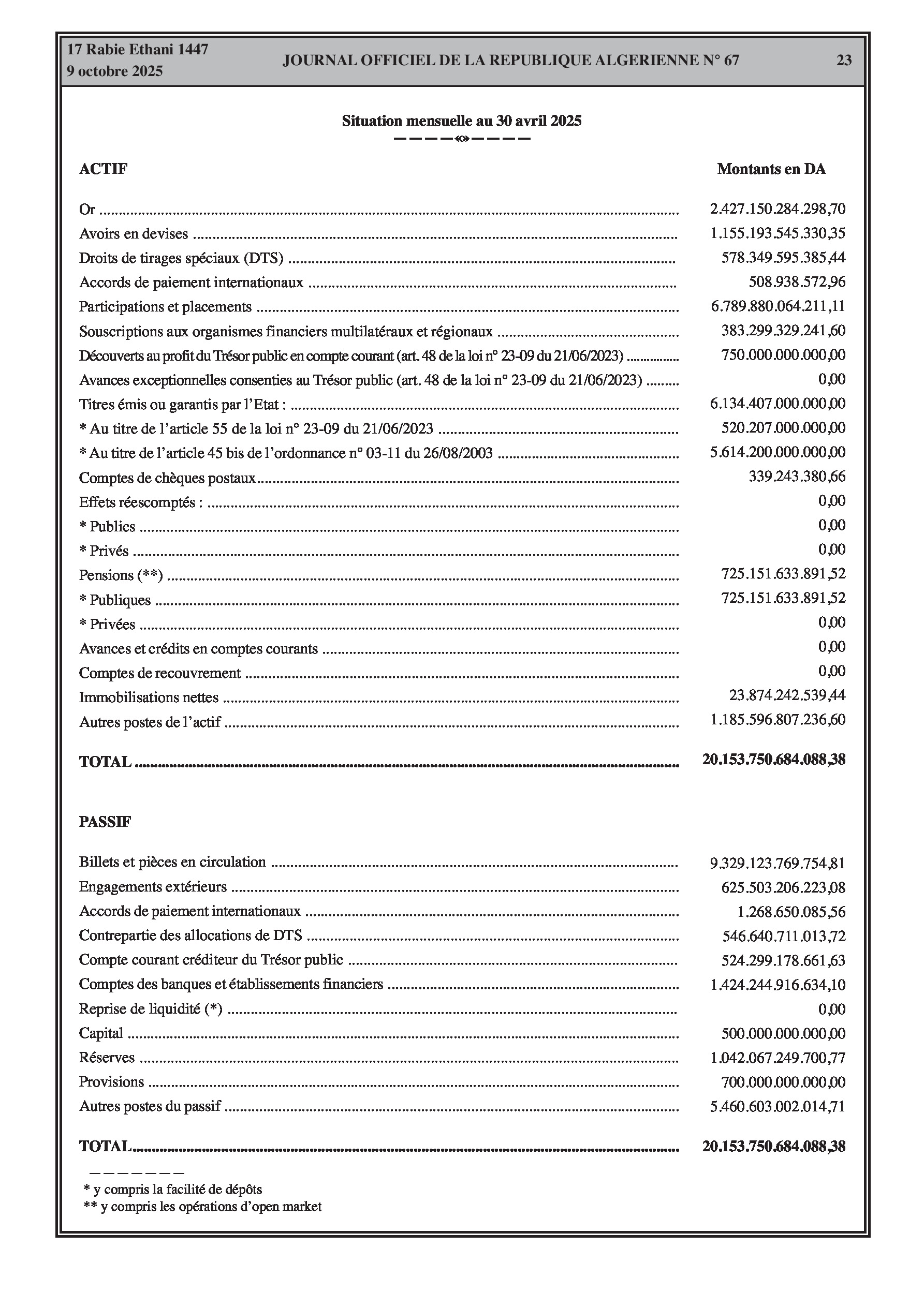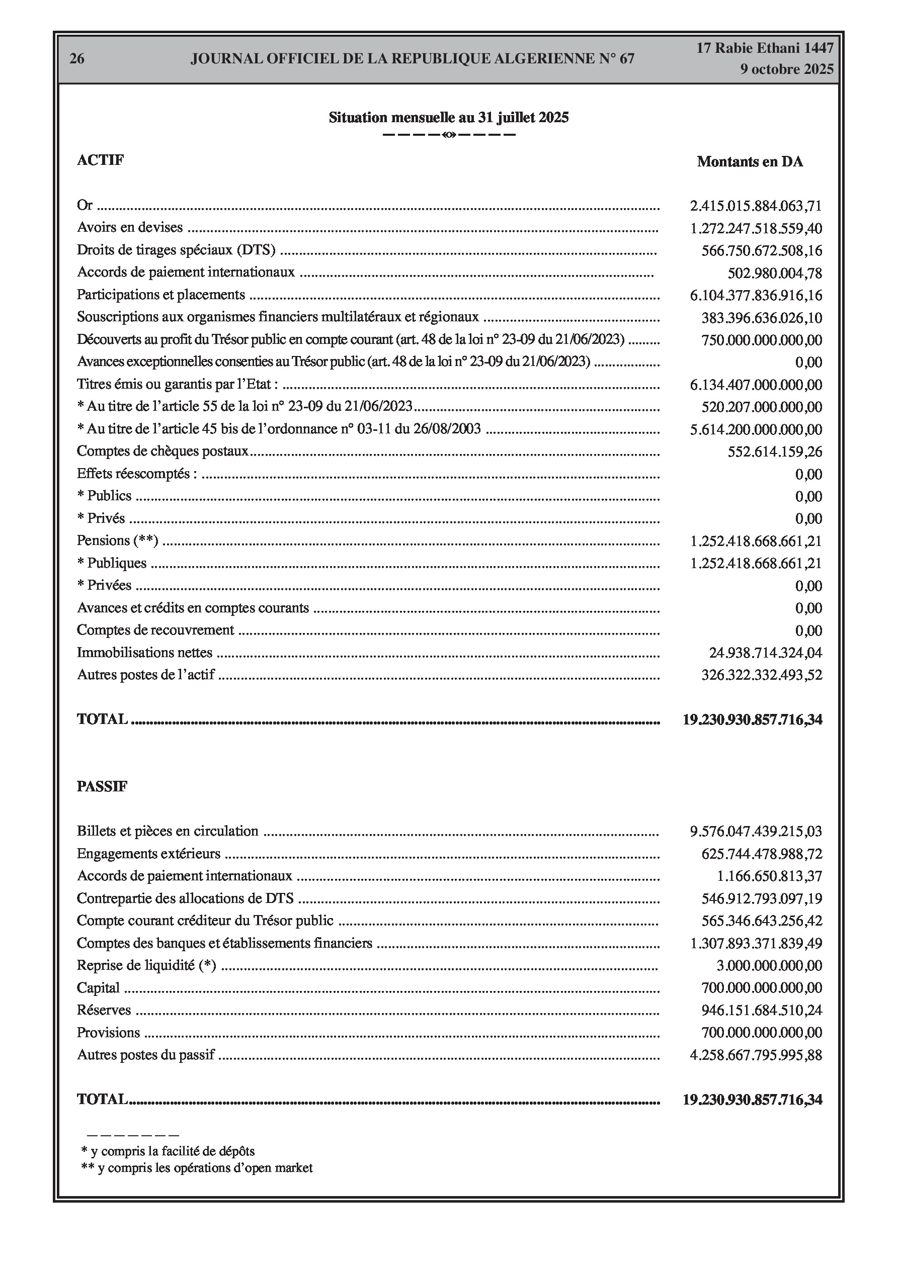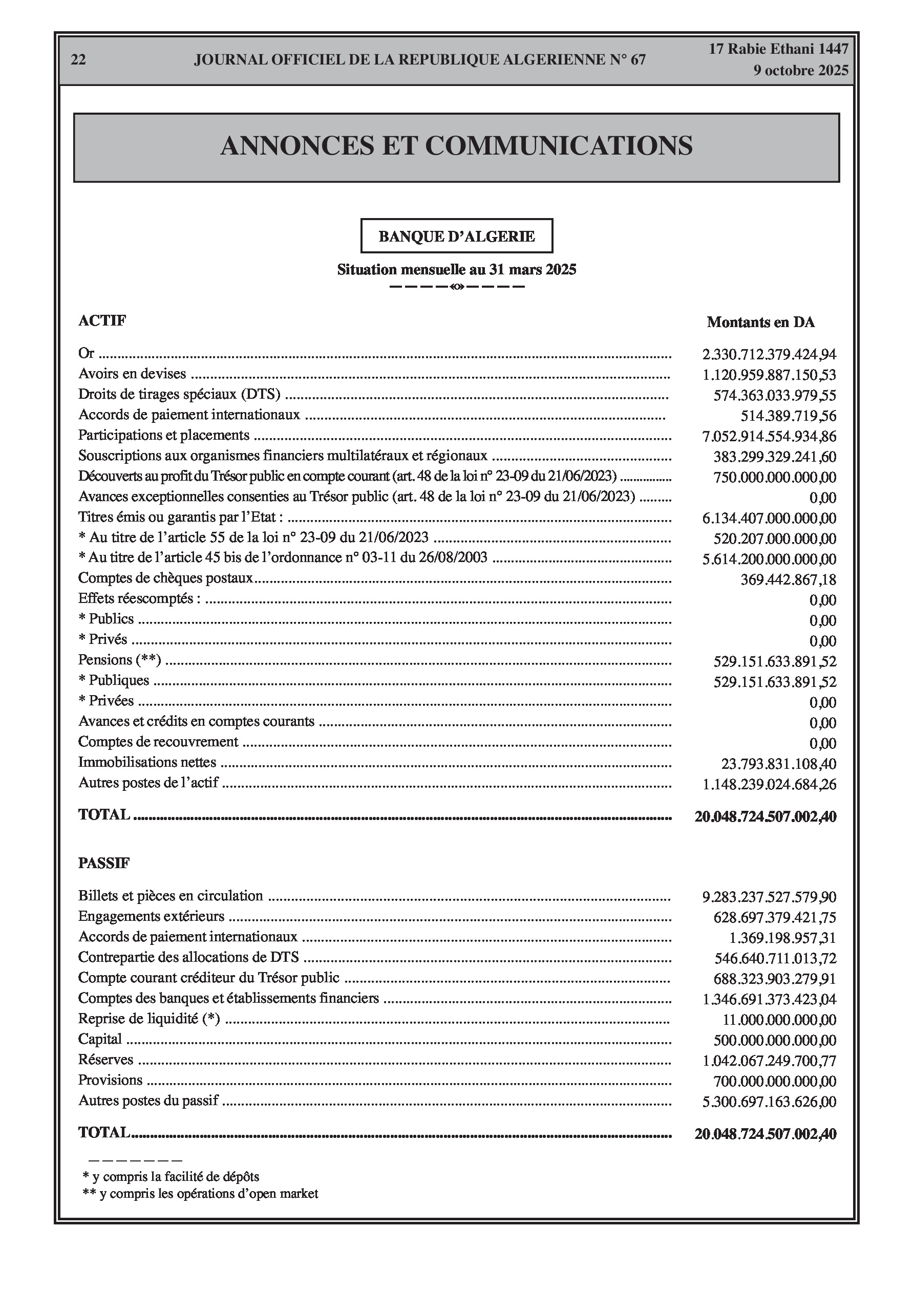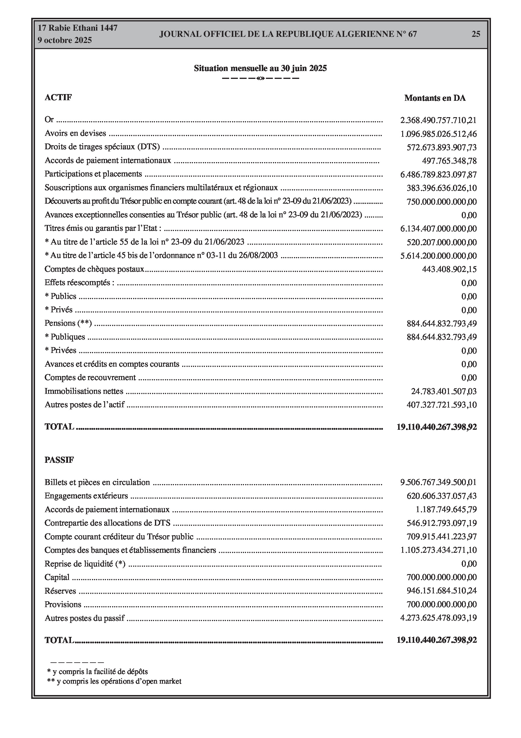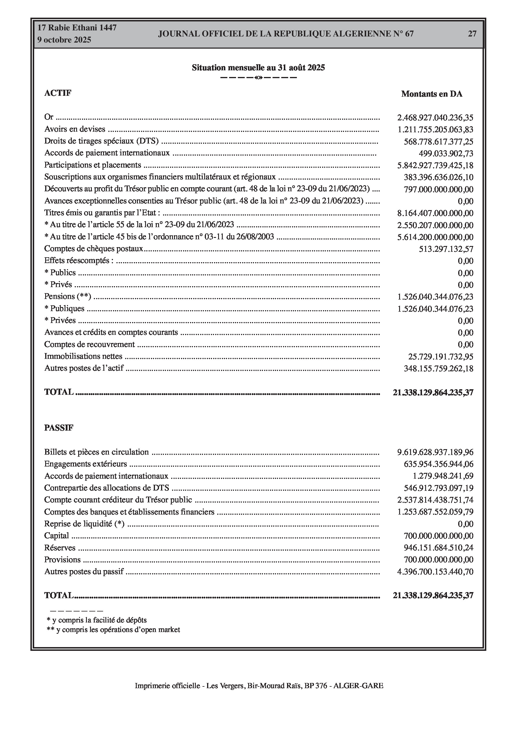 Publication des situations financières mensuelles de la Banque d'Algérie pour la période de mars à août 2025. Ces données offrent un aperçu détaillé de l'actif et du passif de la banque centrale.