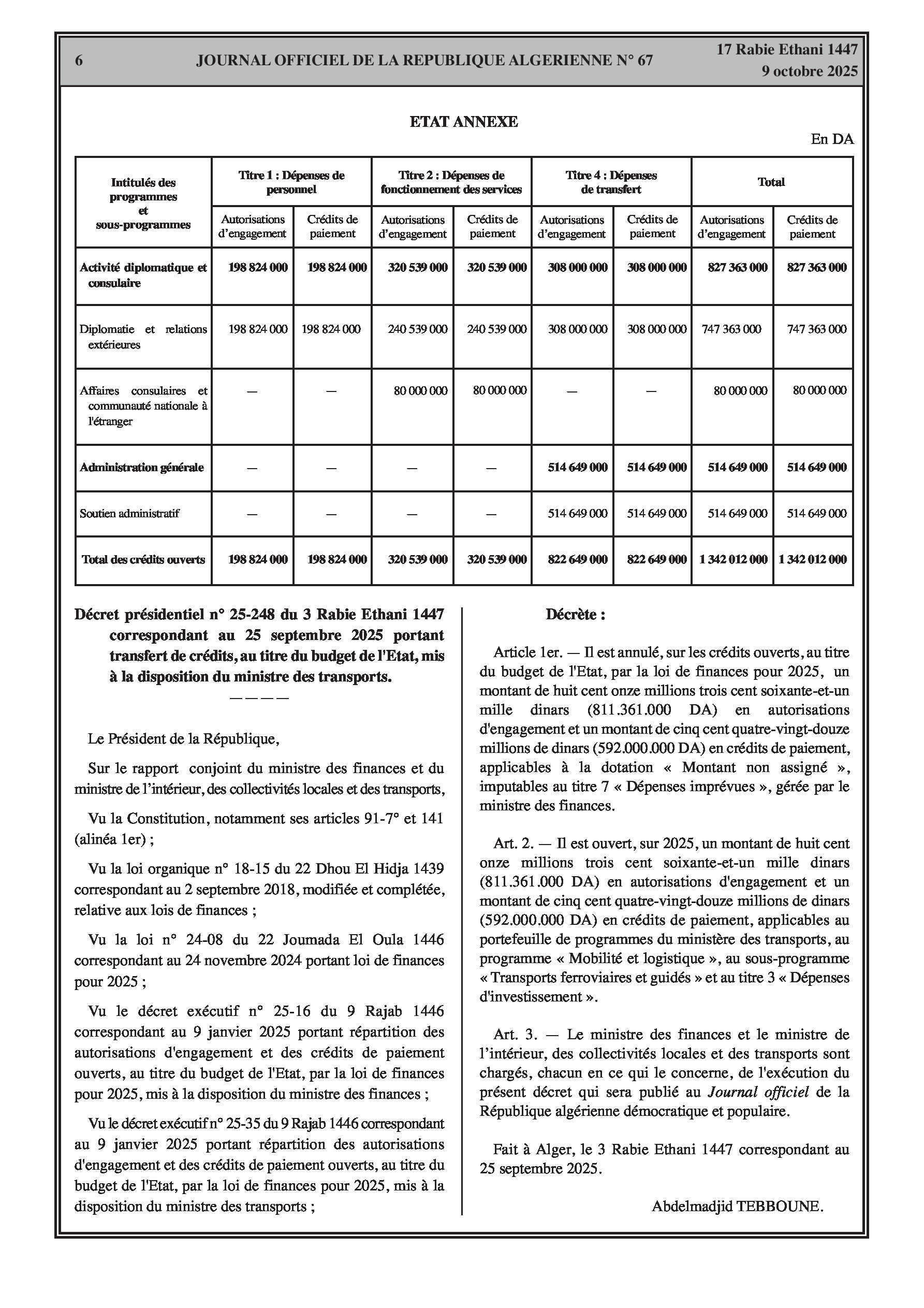 • Un décret présidentiel transfère 1,34 milliard de dinars au portefeuille de programmes du ministère des Affaires étrangères.