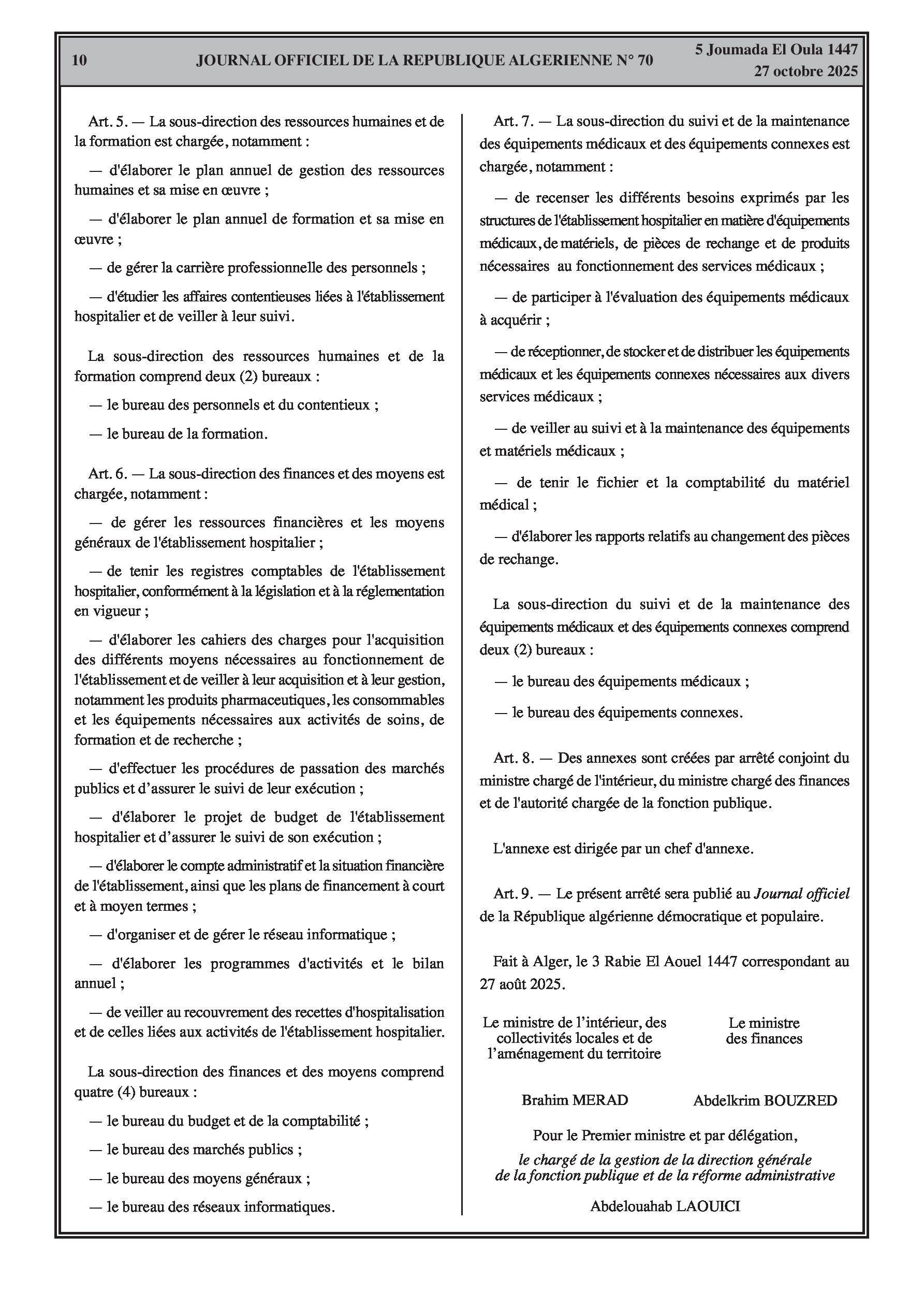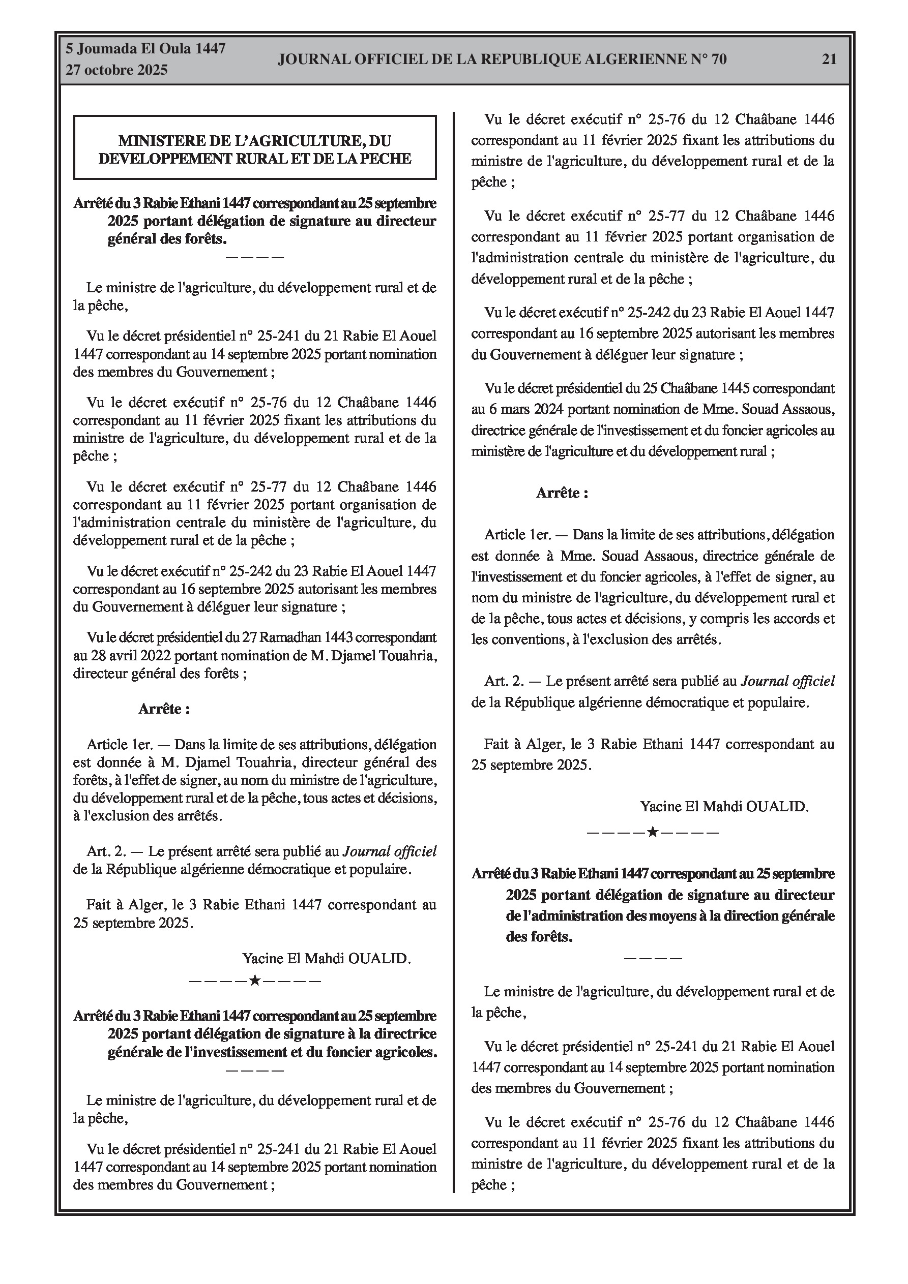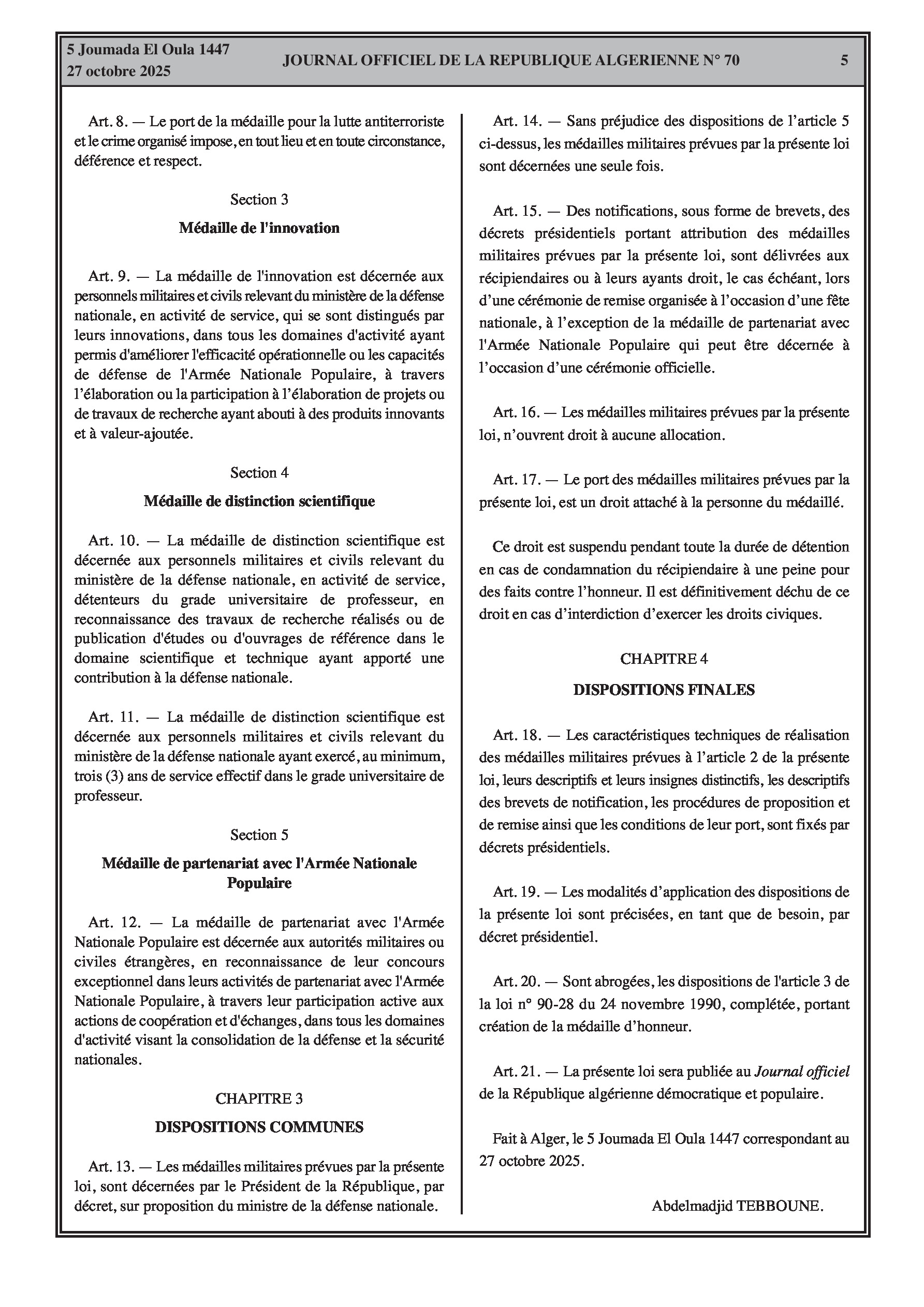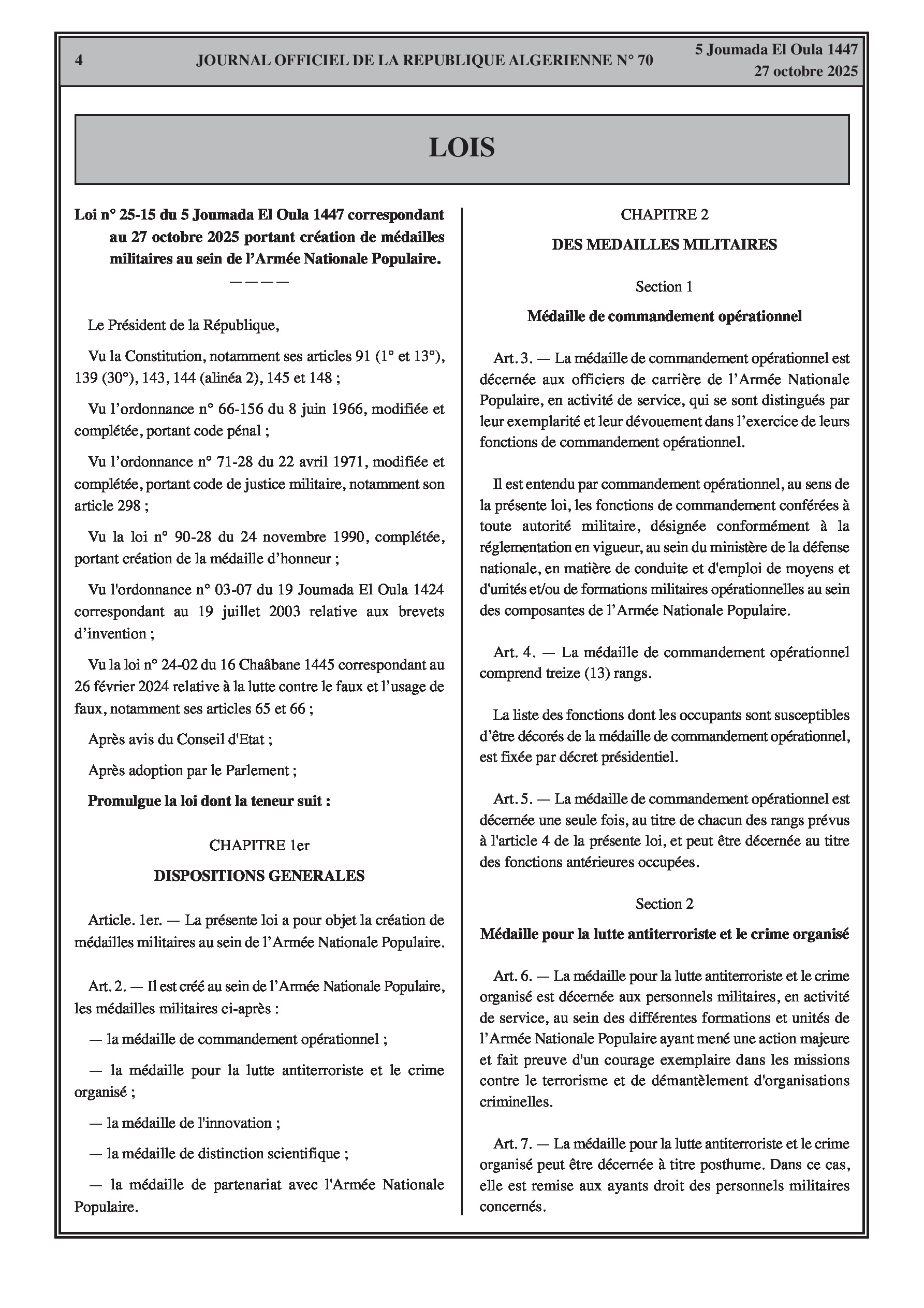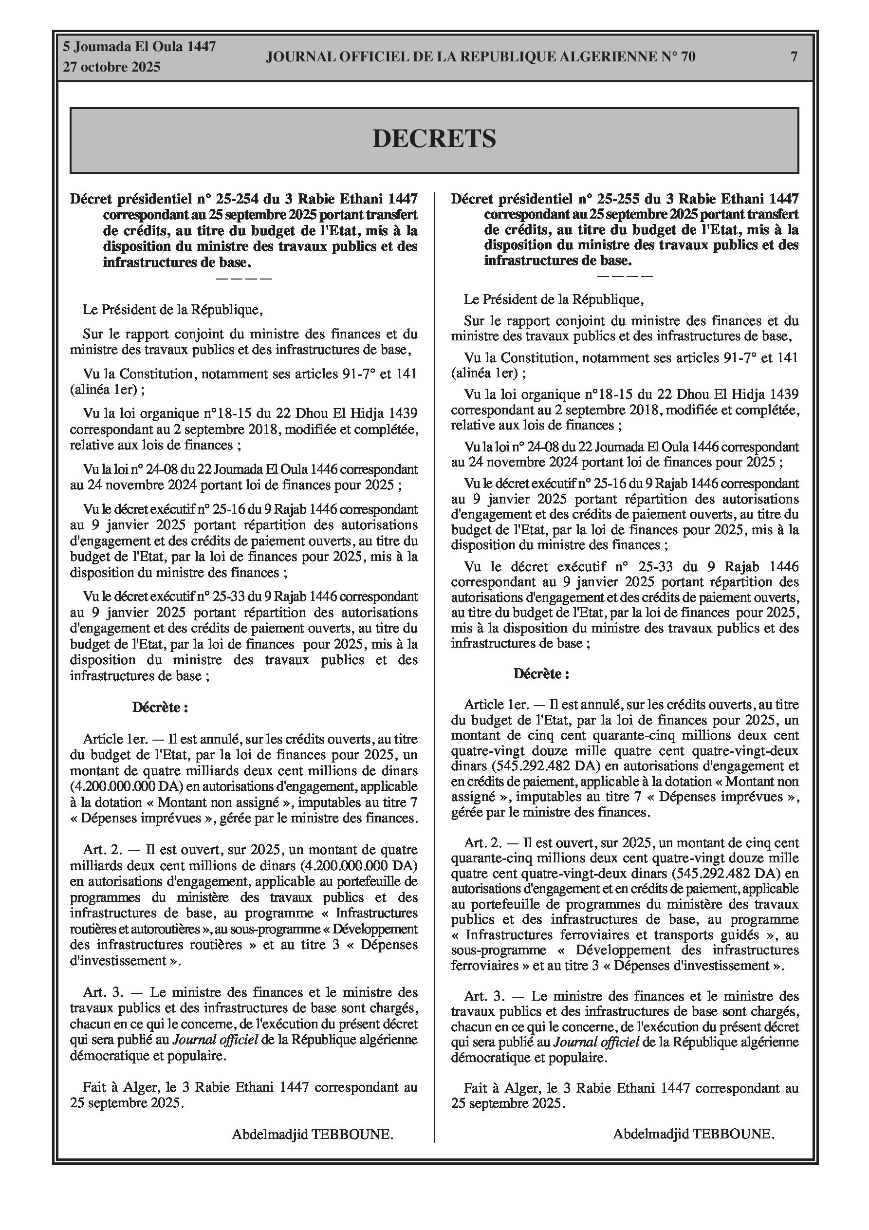 N°70 du Journal officiel de la République Algérienne Démocratique et Populaire publié le 27 octobre 2025: