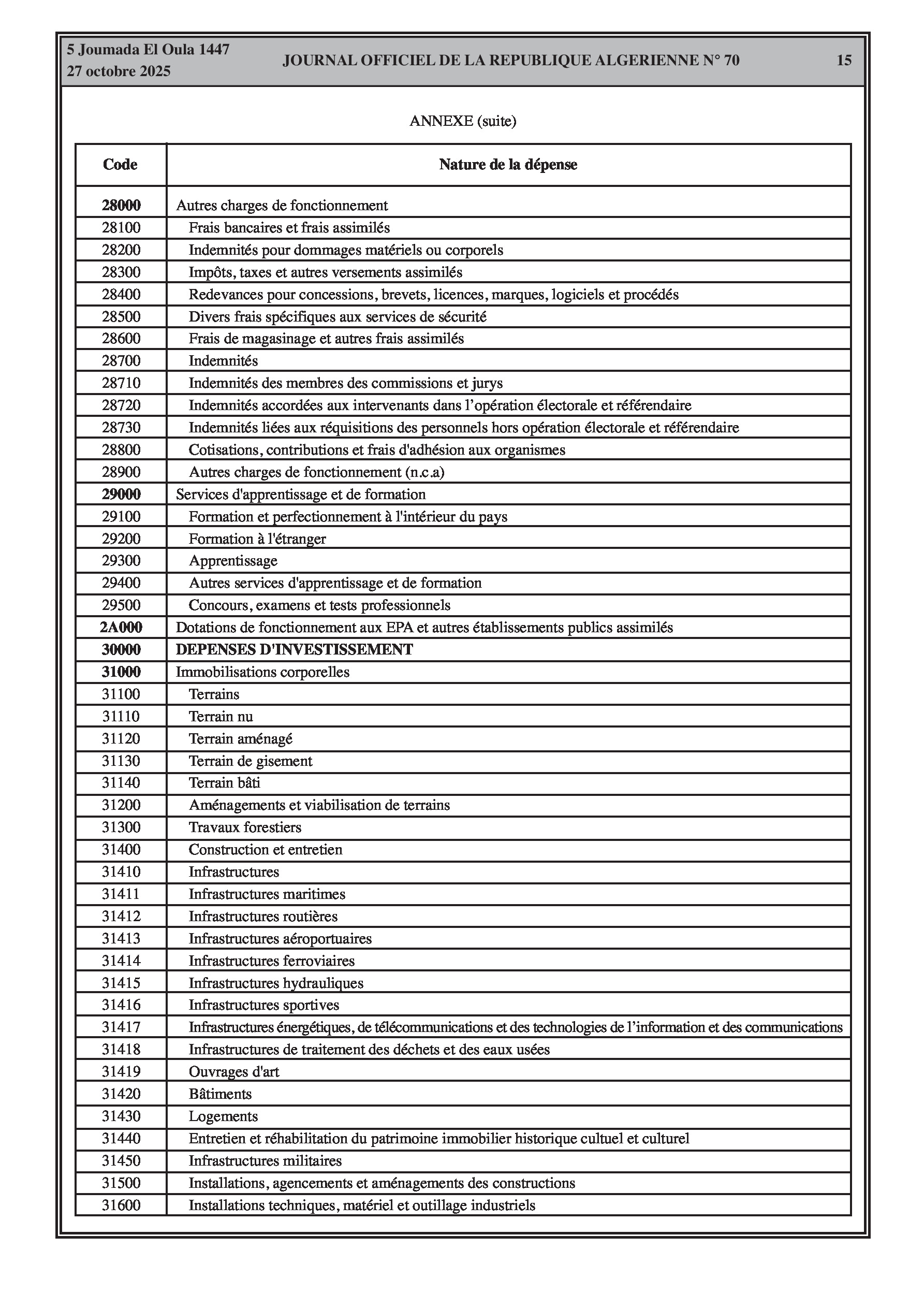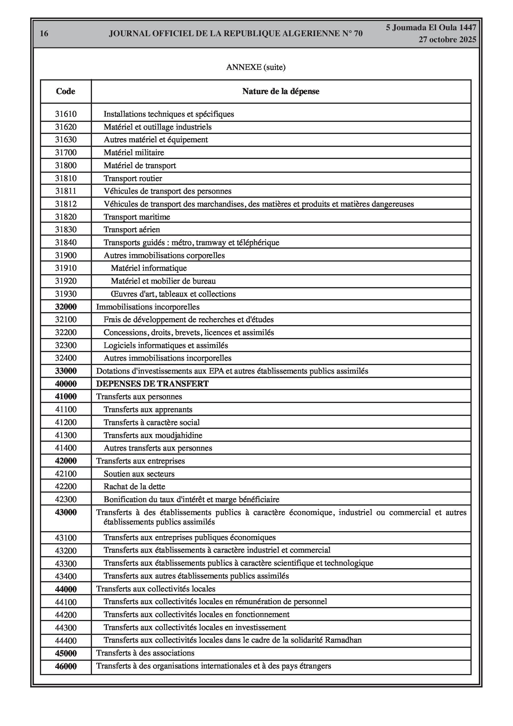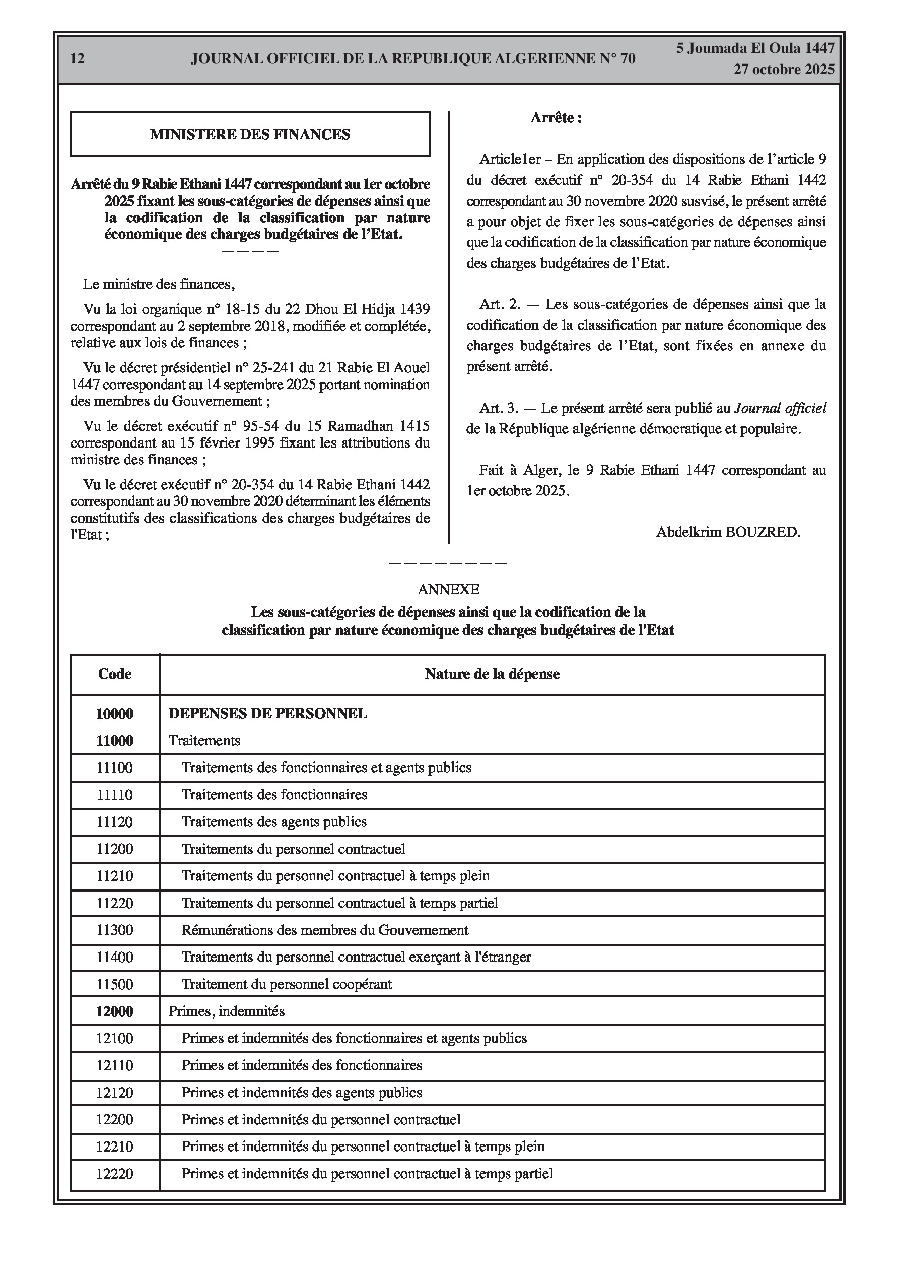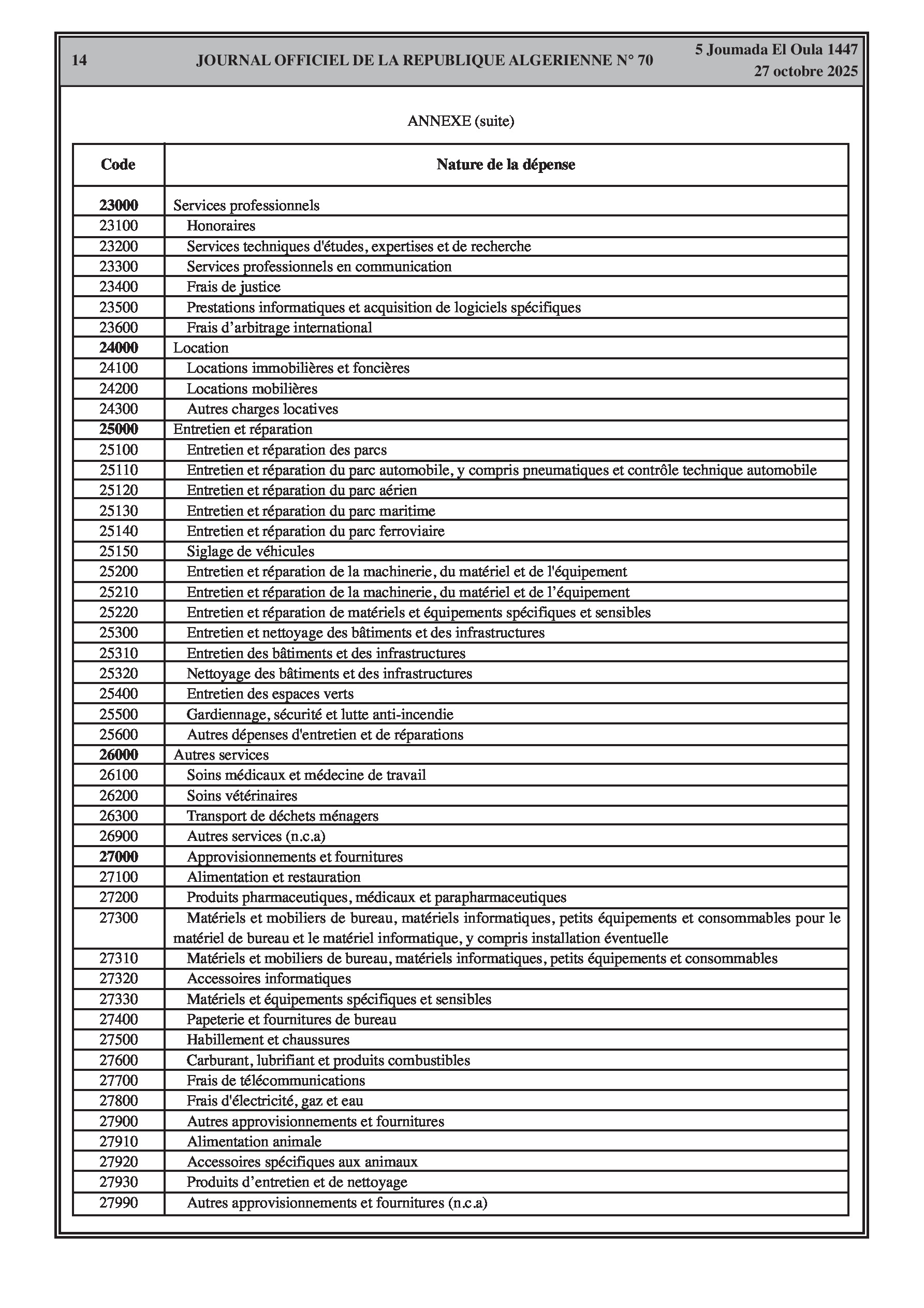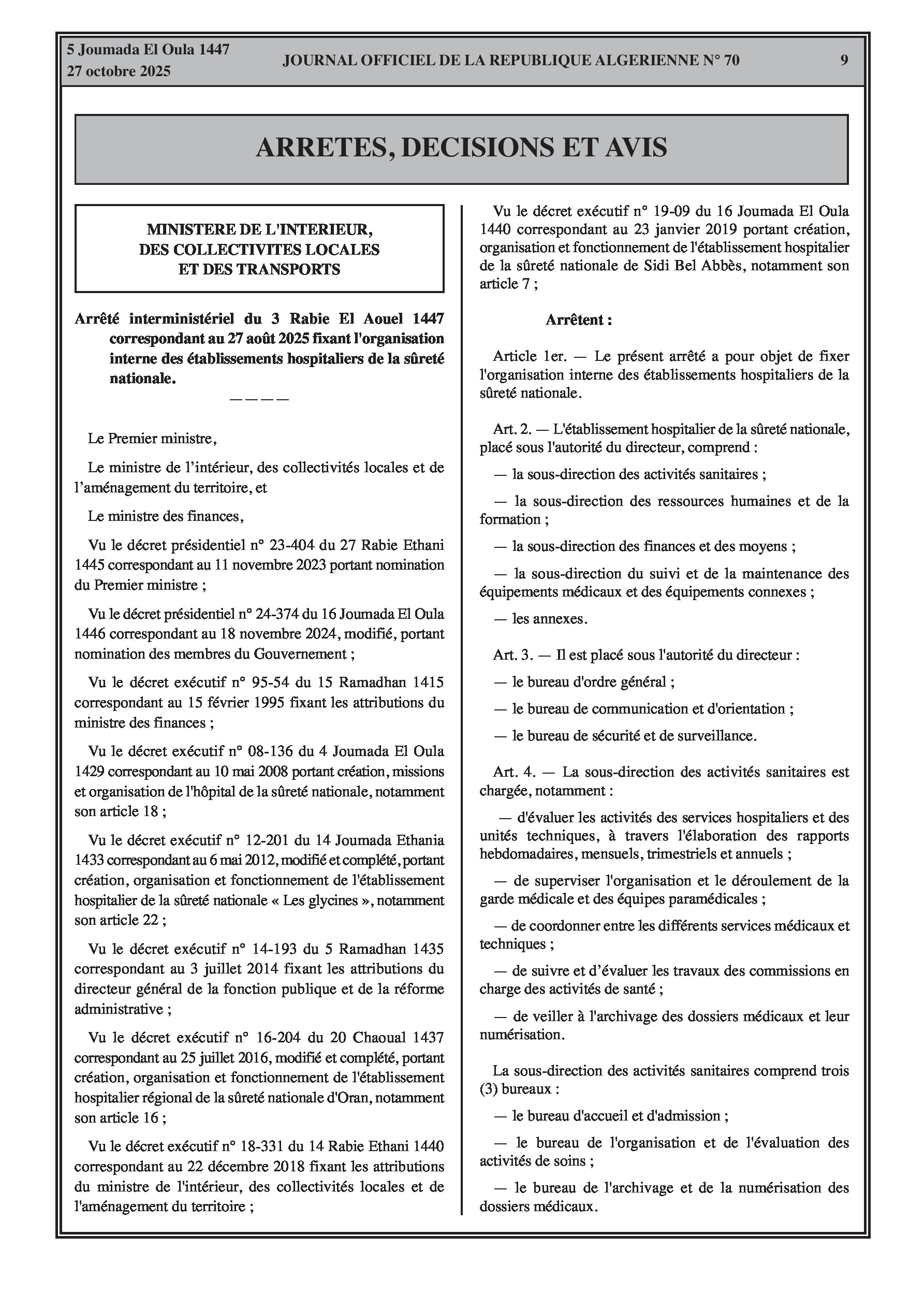 N°70 du Journal officiel de la République Algérienne Démocratique et Populaire publié le 27 octobre 2025: