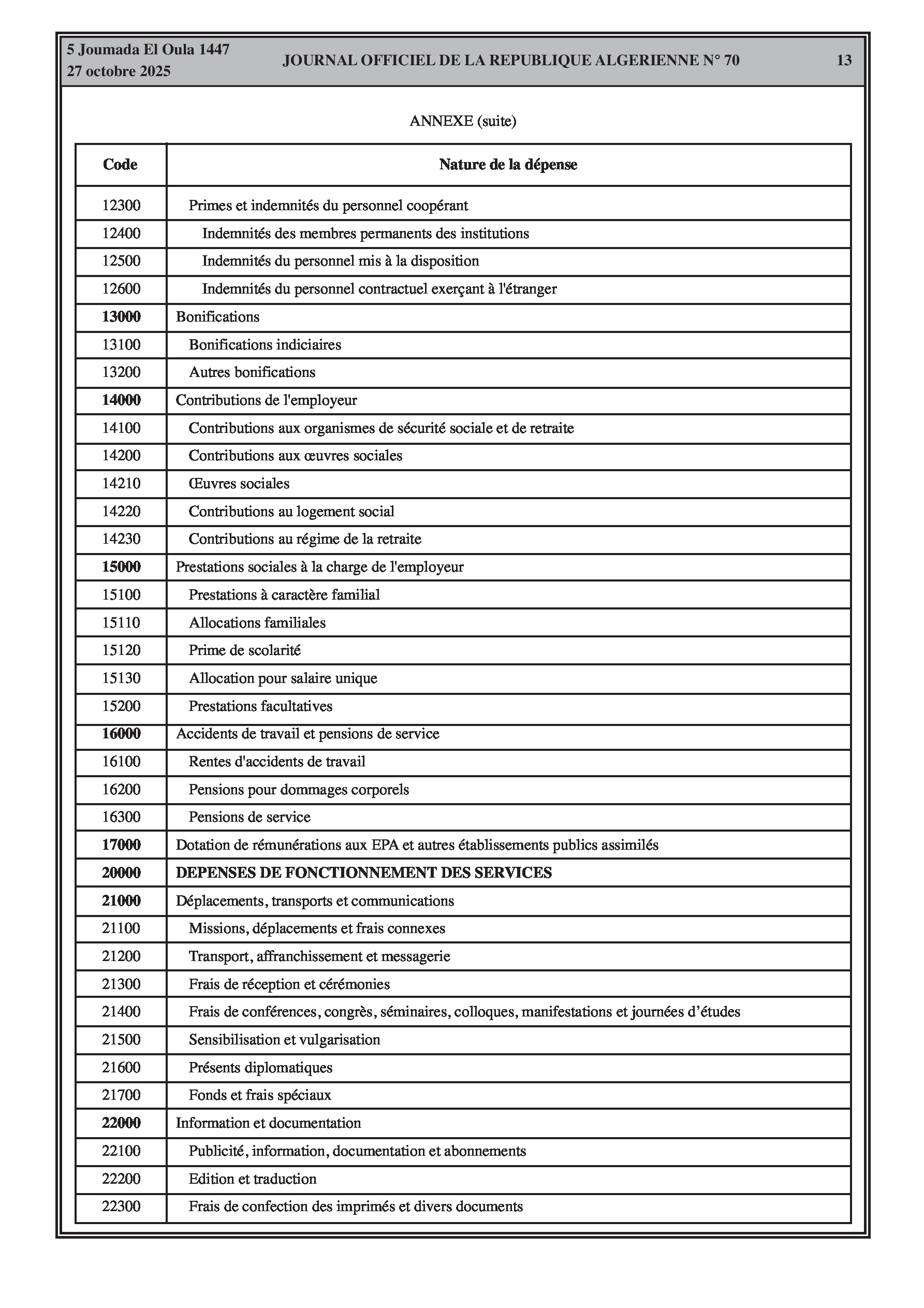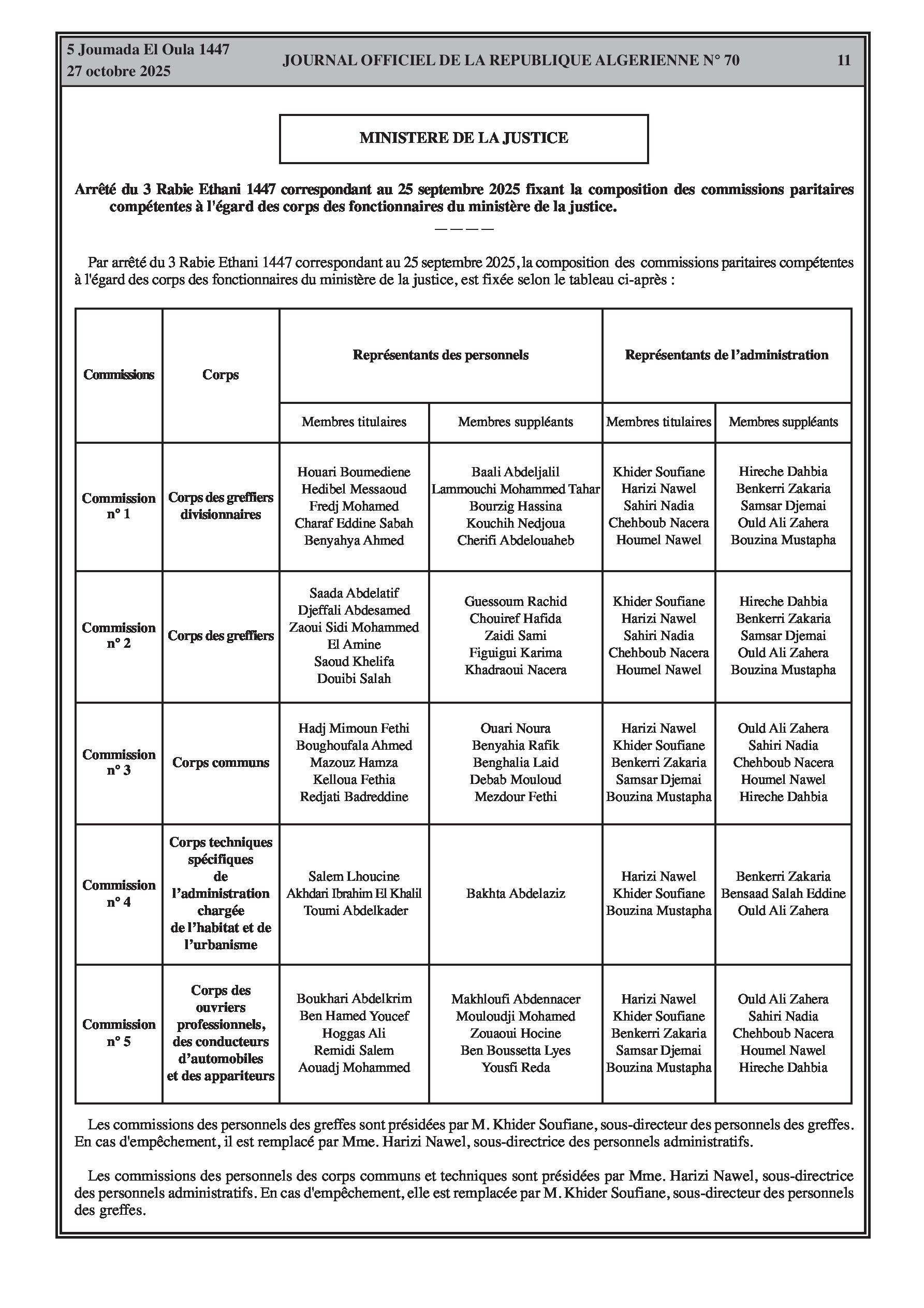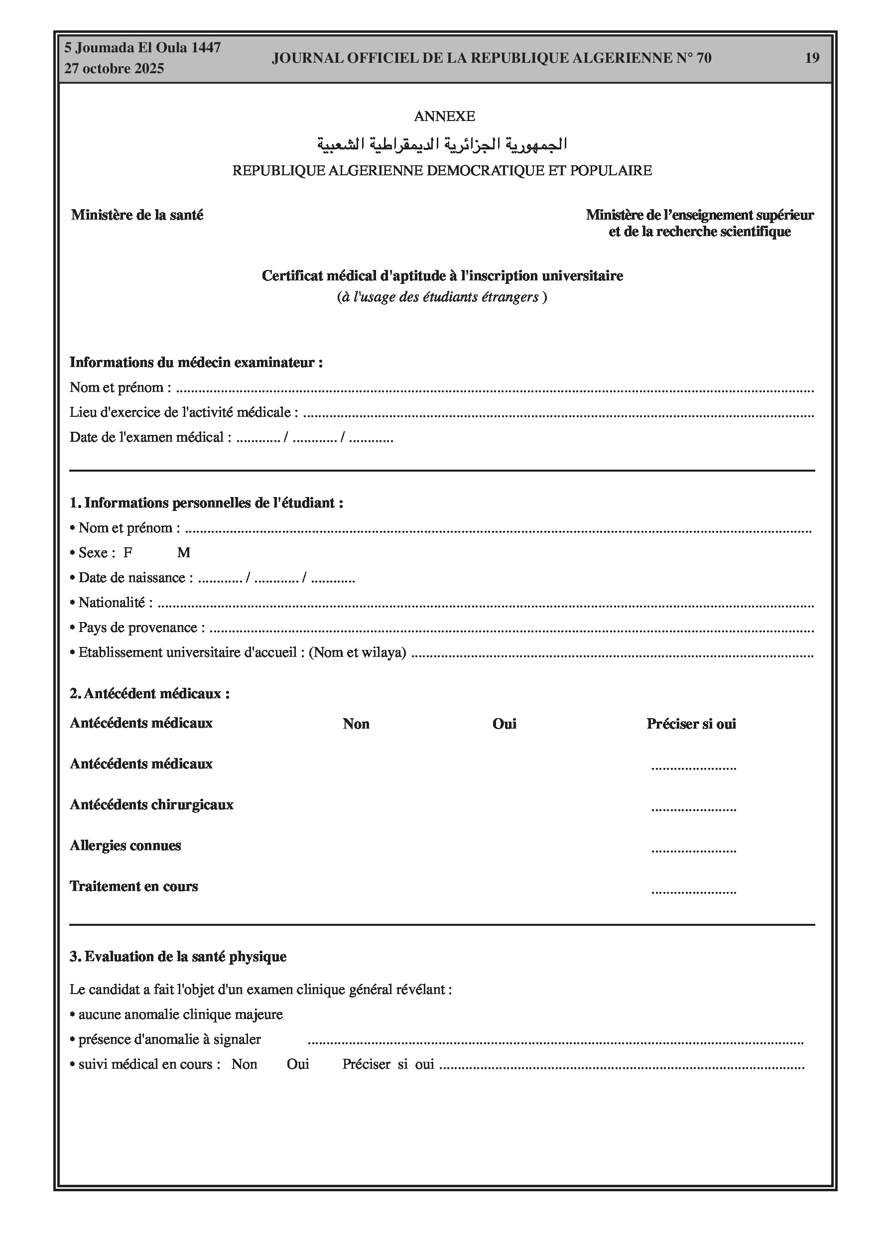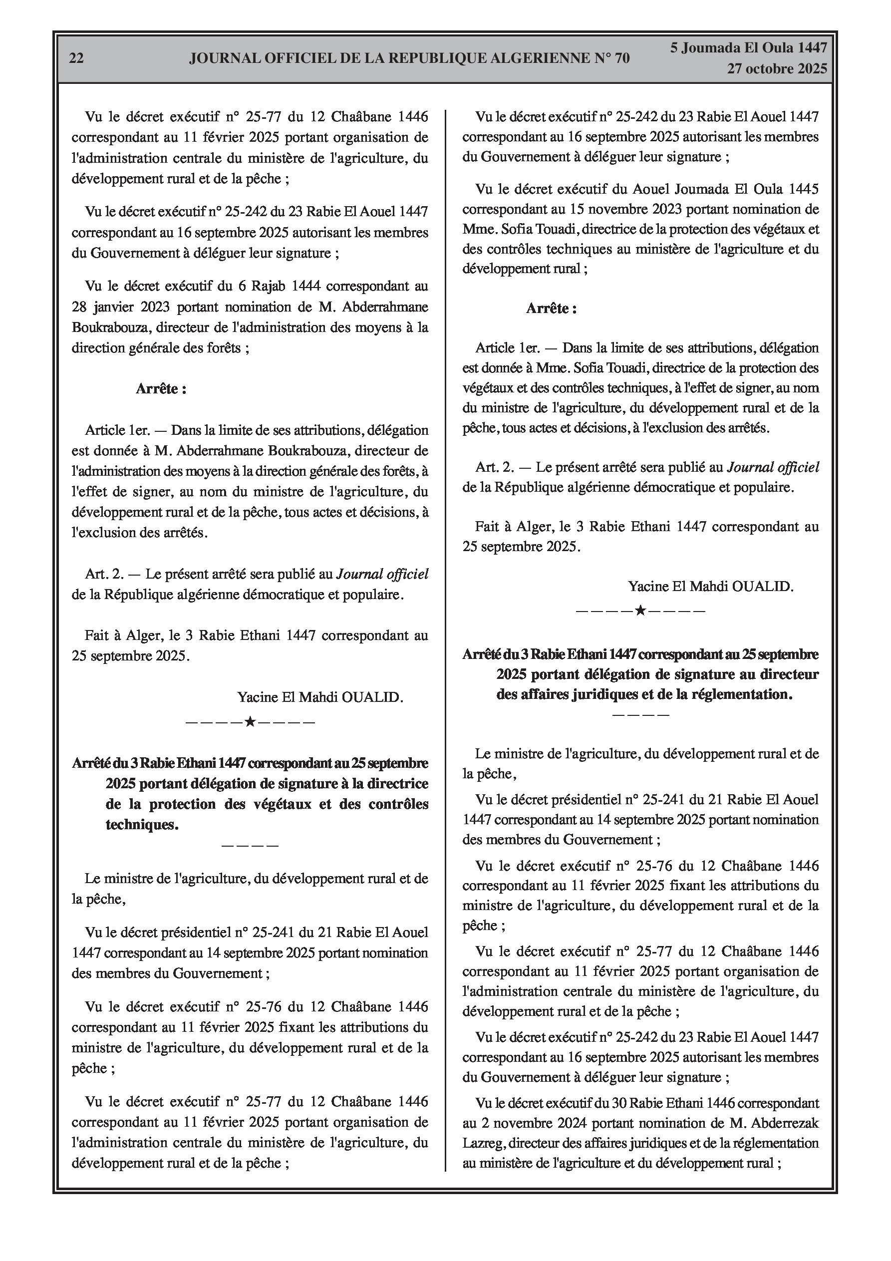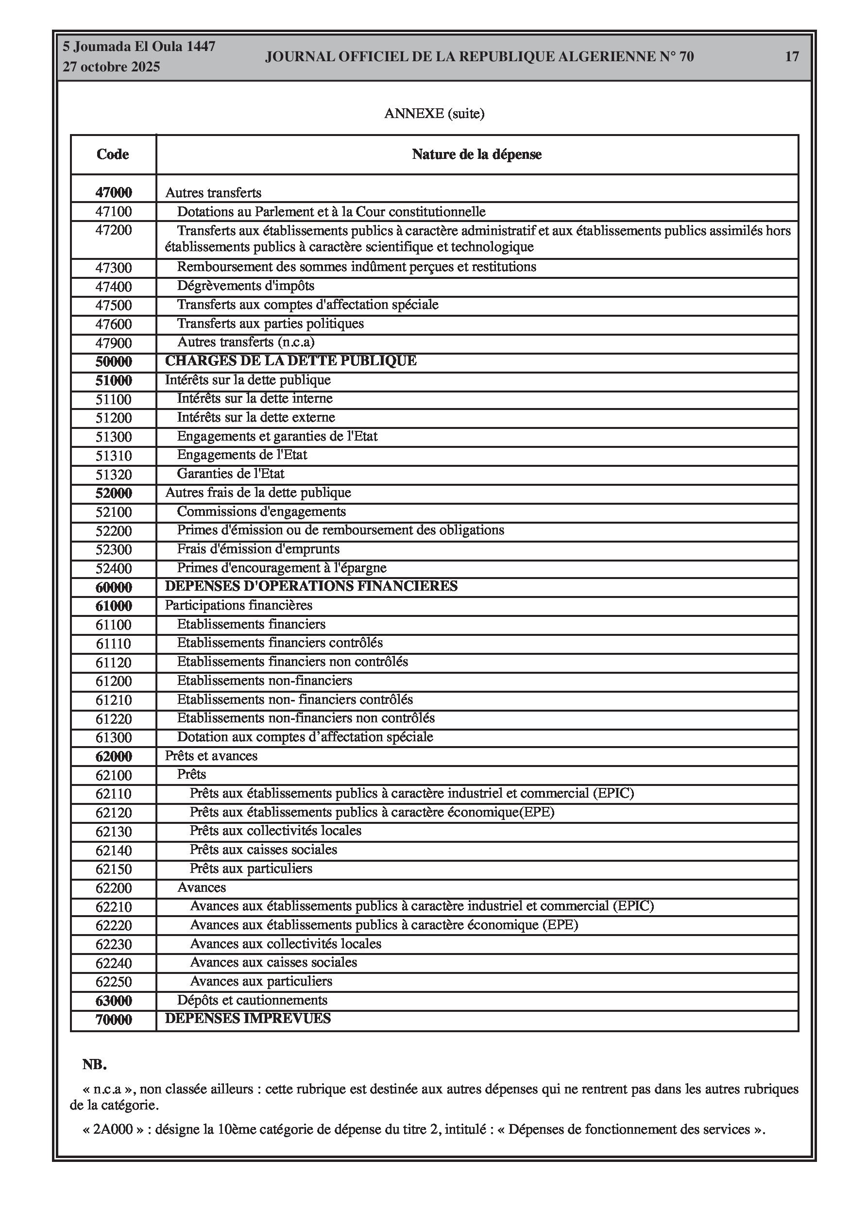 N°70 du Journal officiel de la République Algérienne Démocratique et Populaire publié le 27 octobre 2025: