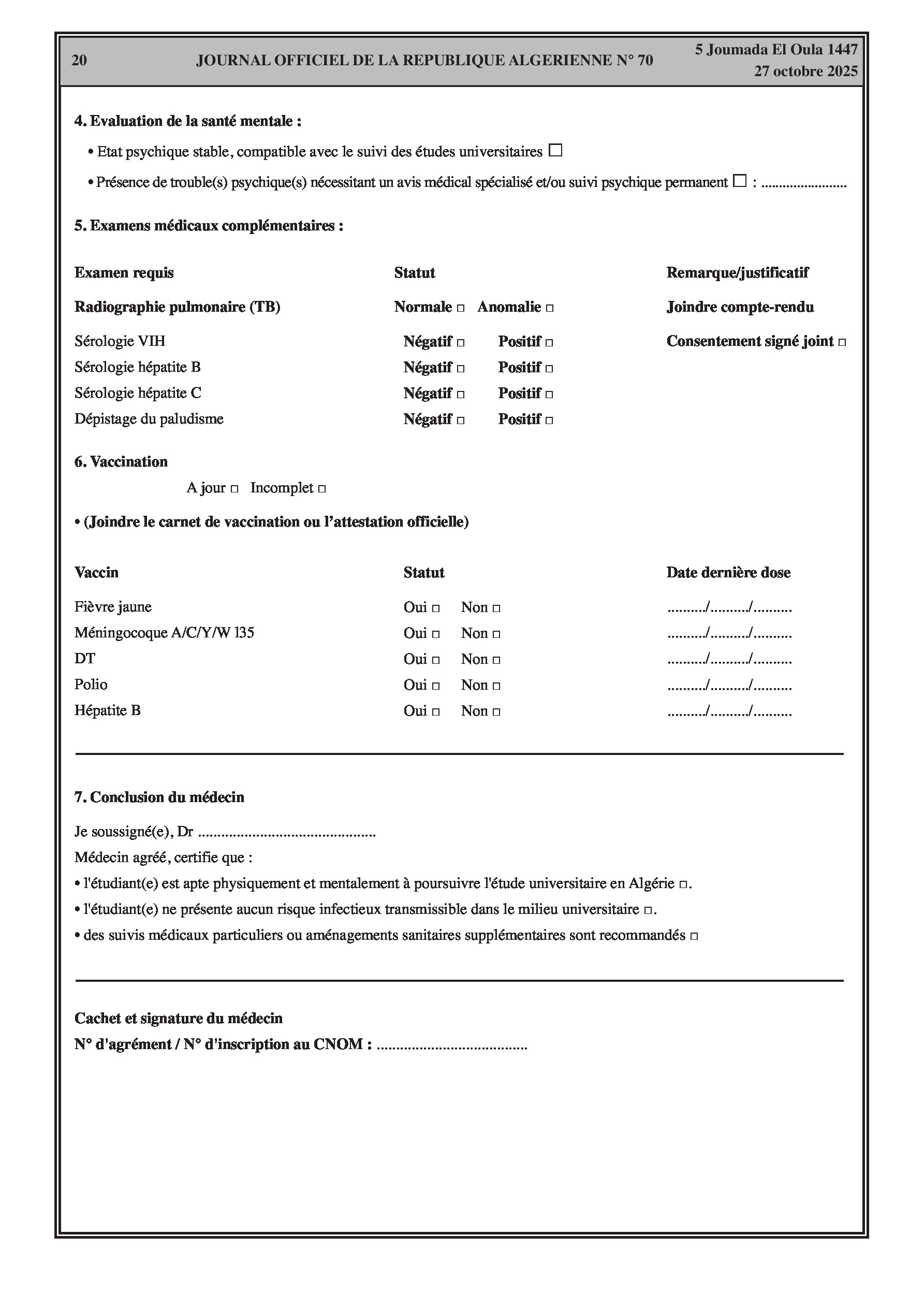 Un nouvel arrêté interministériel précise les examens médicaux et vaccinations obligatoires que les étudiants étrangers doivent effectuer avant leur inscription dans les établissements d'enseignement supérieur algériens.