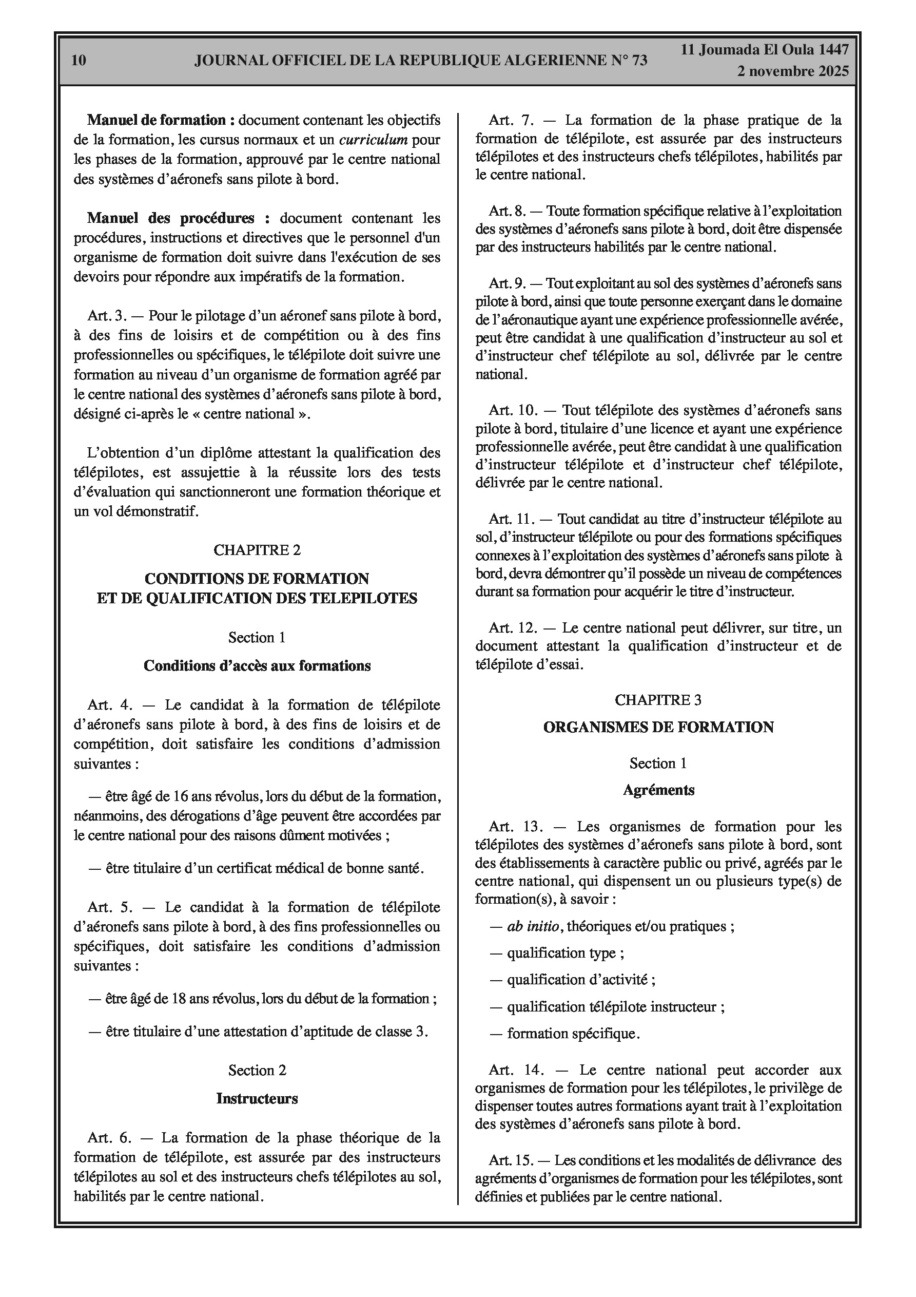 Les nouveaux textes définissent les conditions de formation et de qualification des télépilotes. Ils régissent également les règles d'utilisation et de coordination des drones de l'État pour les opérations de sécurité, de secours et de lutte contre les incendies. Les zones de survol autorisées pour le loisir et la compétition, les missions de la commission intersectorielle, et les procédures de sécurisation des appareils saisis sont également définies.