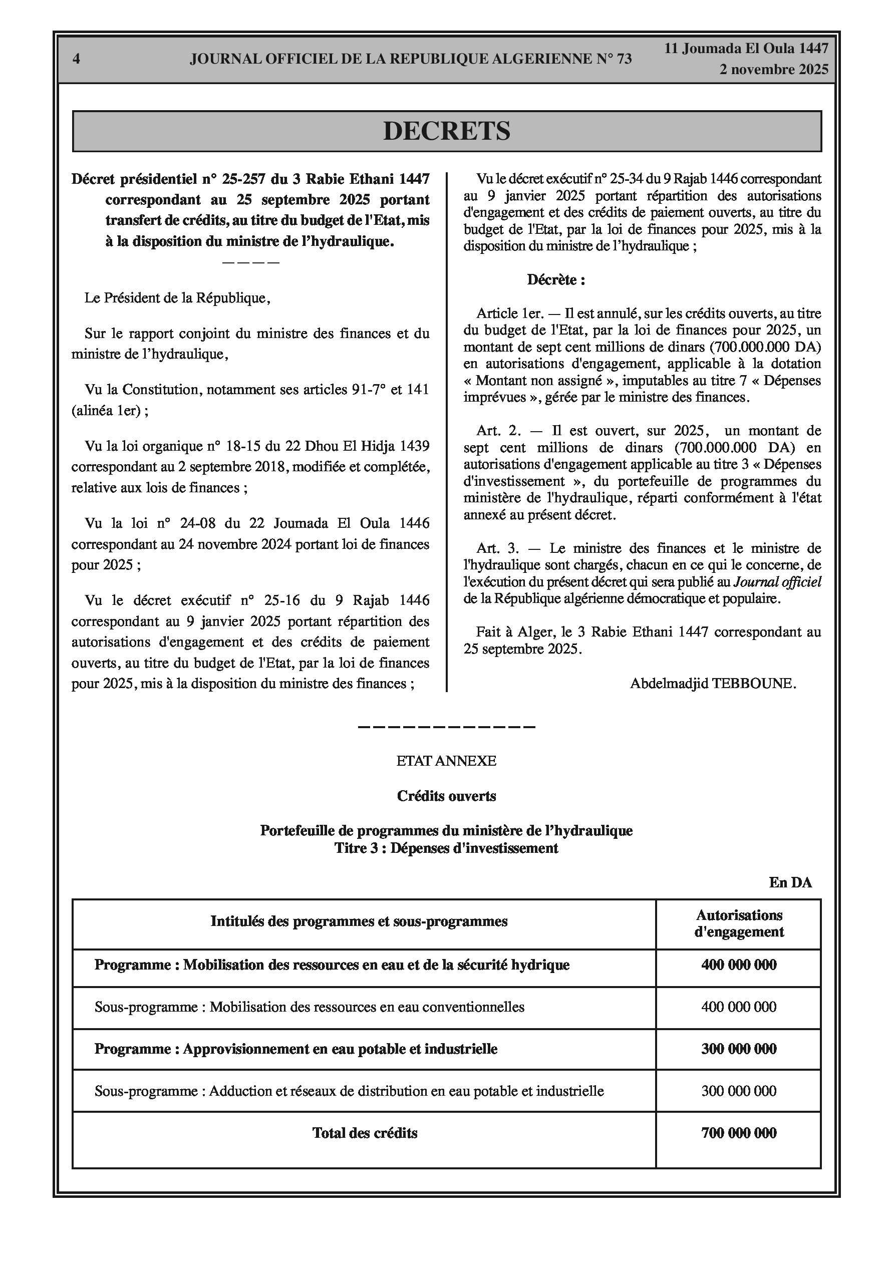 Un décret présidentiel autorise le transfert de 700 millions de dinars du budget des dépenses imprévues de l'État vers le ministère de l'Hydraulique.
