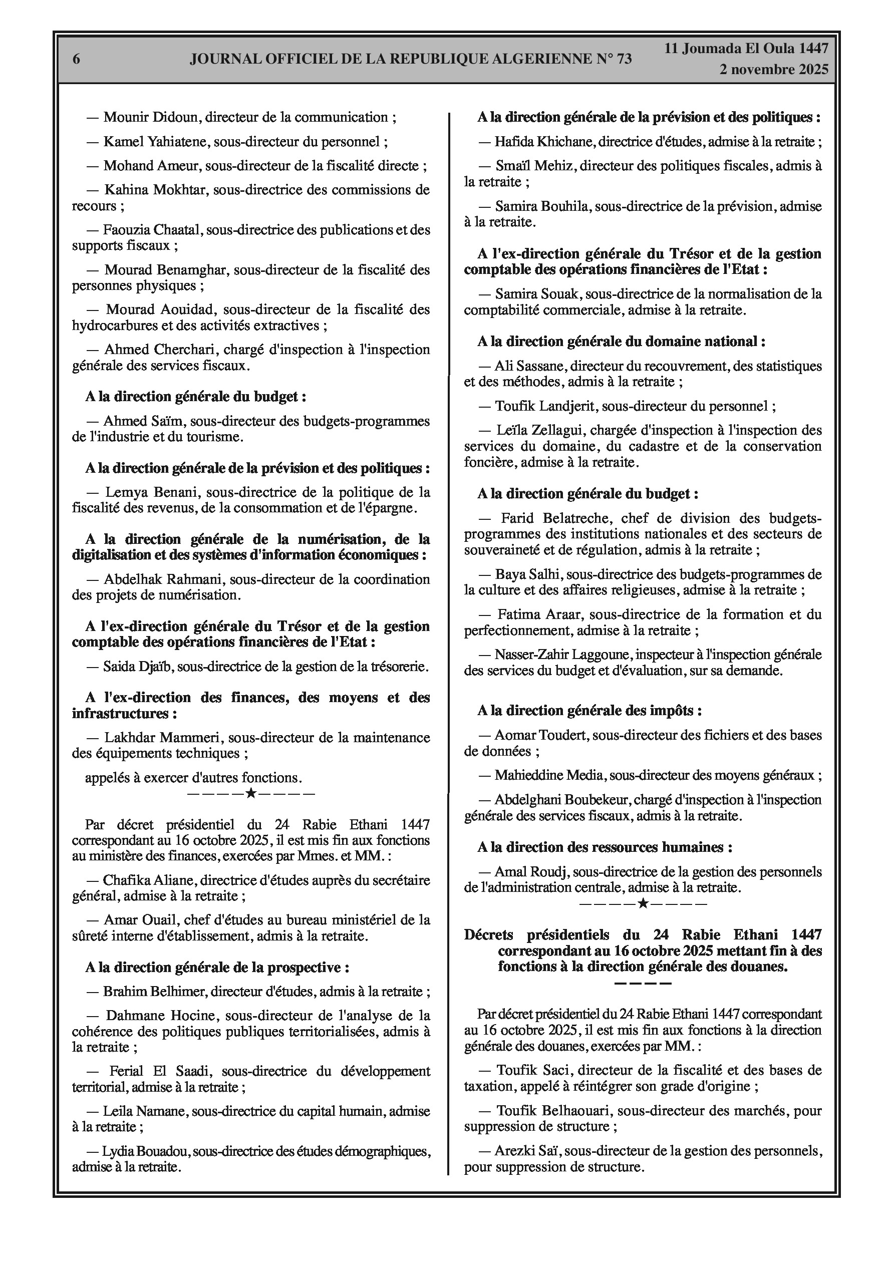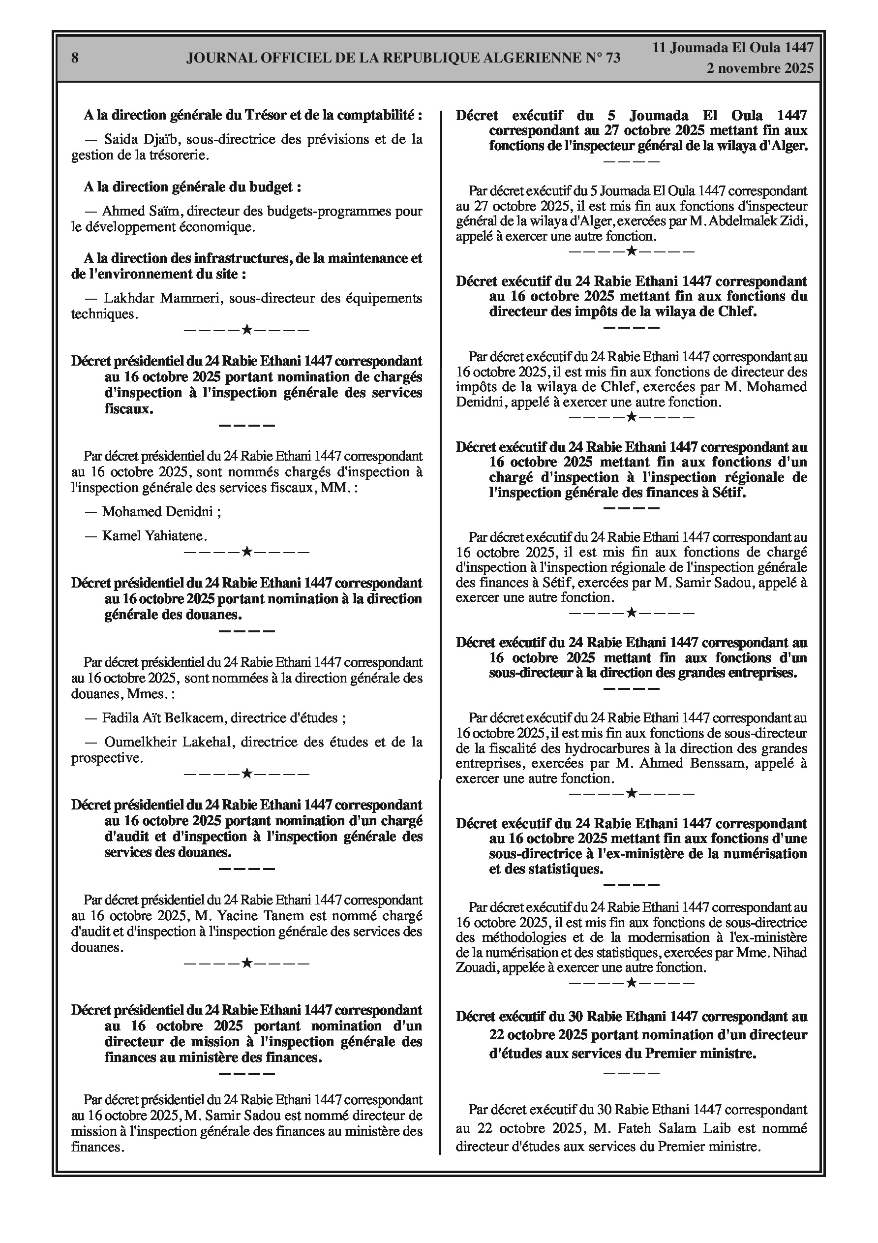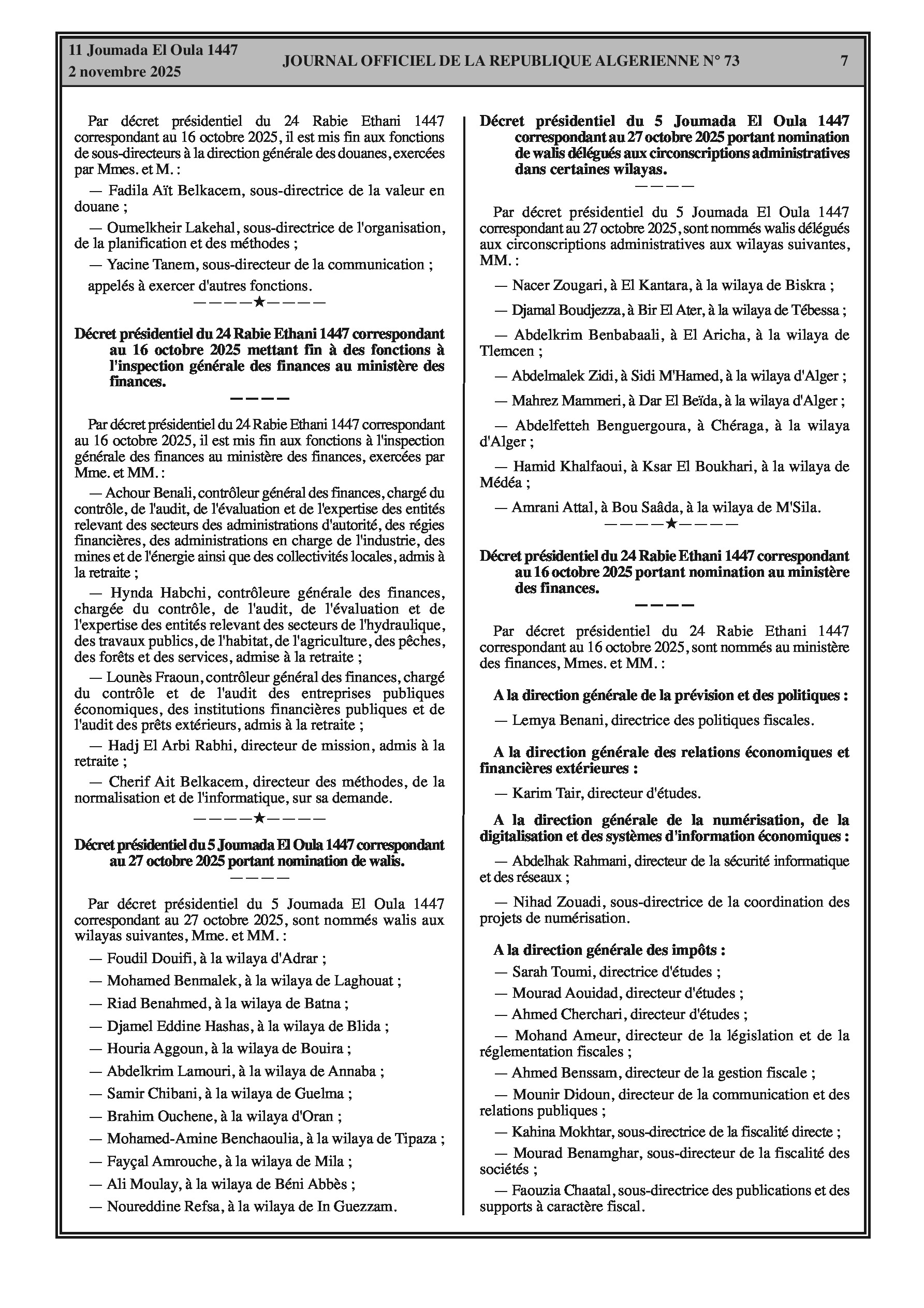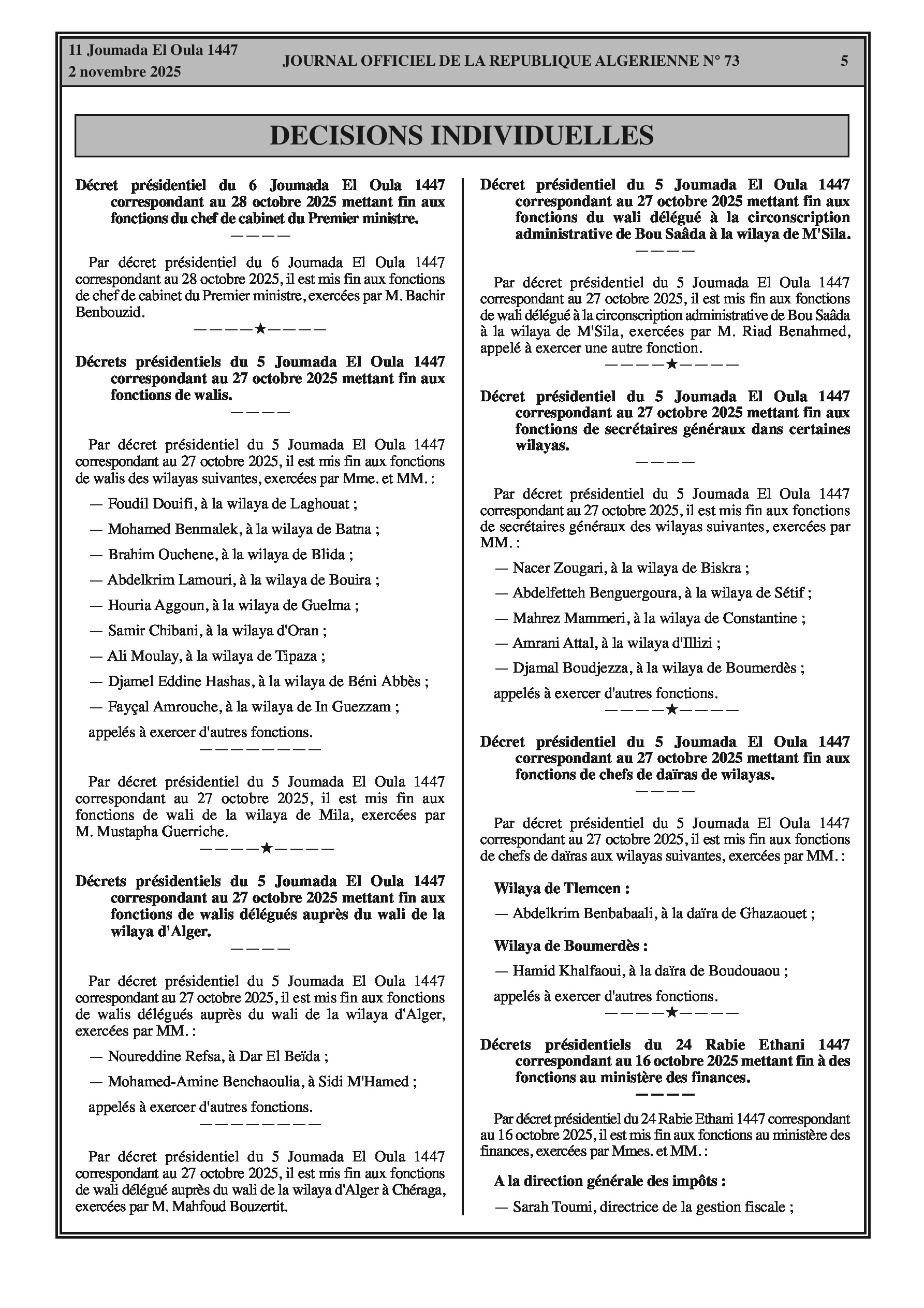 Fin de fonctions et nouvelles nominations de hauts responsables, incluant le chef de cabinet du Premier ministre, des walis, walis délégués, secrétaires généraux et chefs de daïras. Les changements concernent également des postes au ministère des Finances, au niveau des directions générales des impôts, des douanes, et de l'inspection générale des finances.