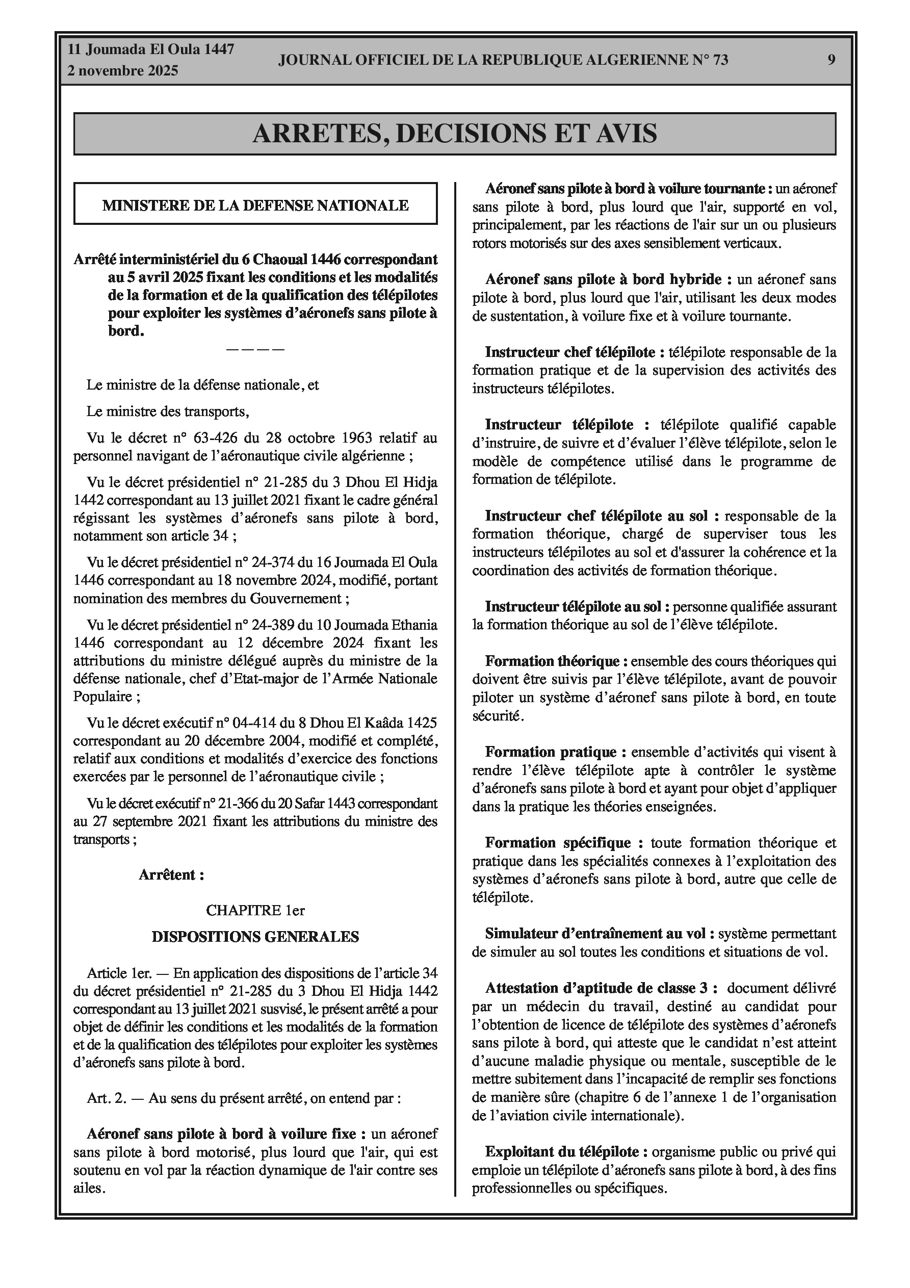 Une série d'arrêtés interministériels établit un cadre réglementaire complet pour les drones, couvrant la formation des pilotes, les règles d'utilisation par l'État, les directives pour les compétitions et la gestion des appareils saisis.