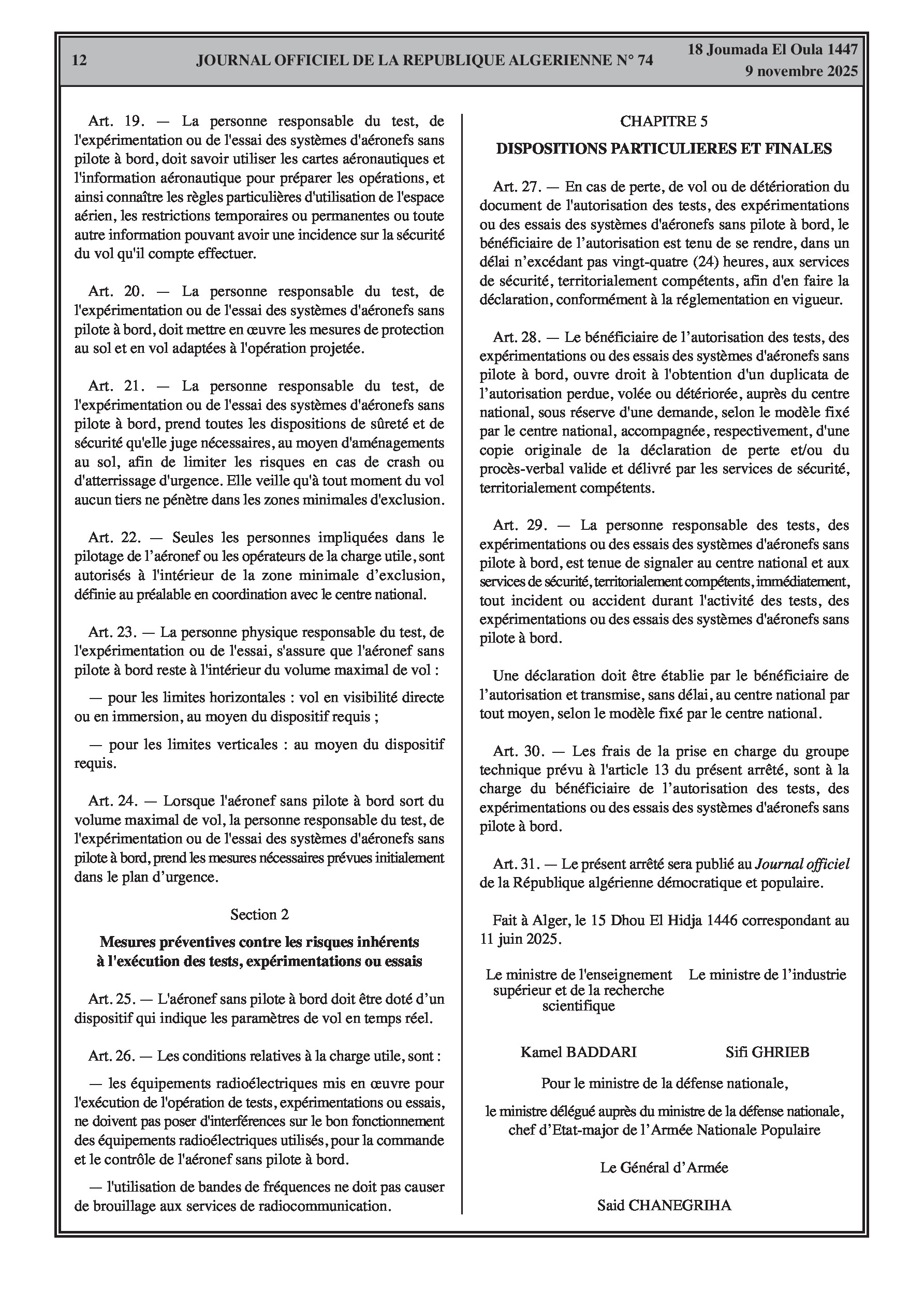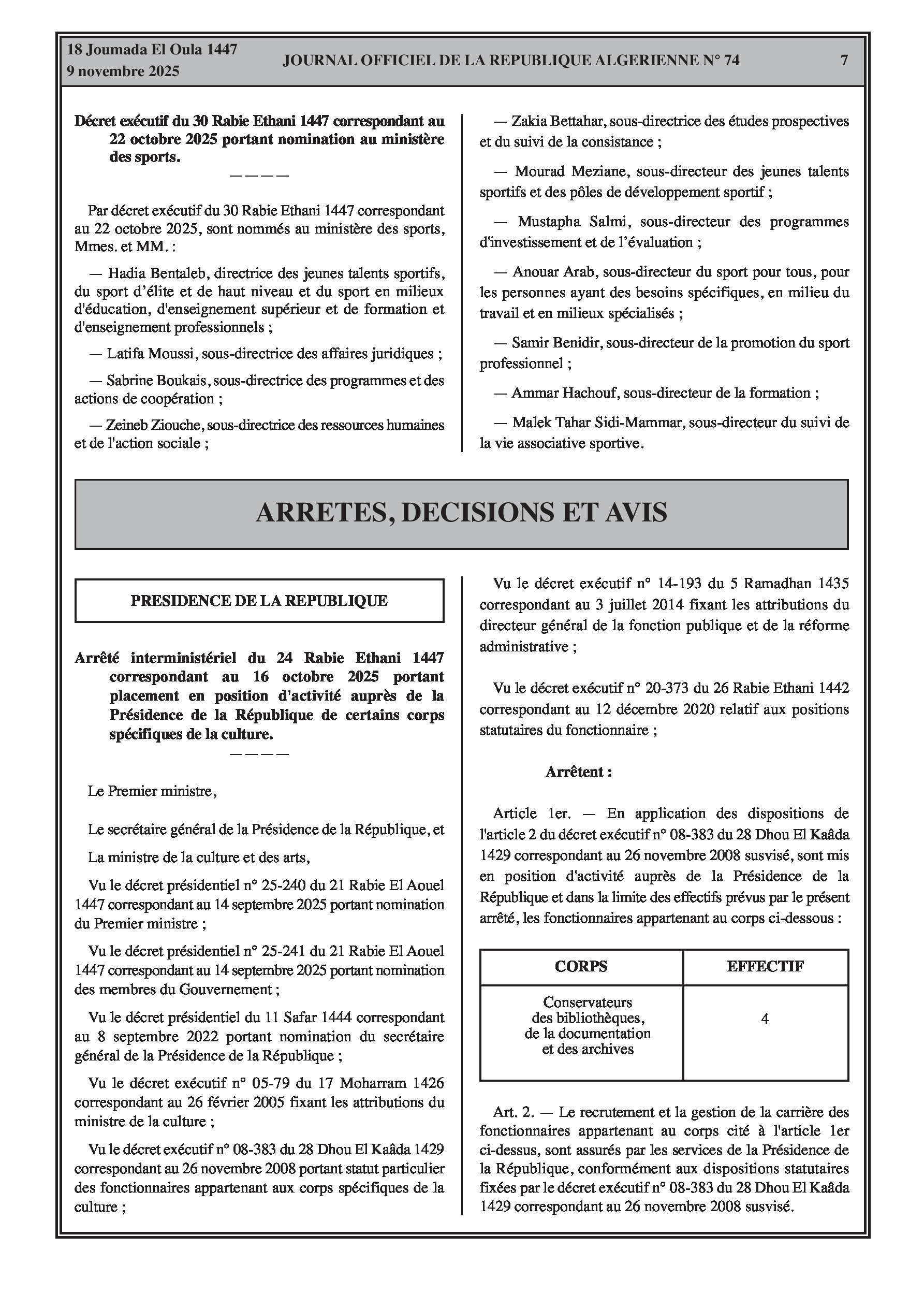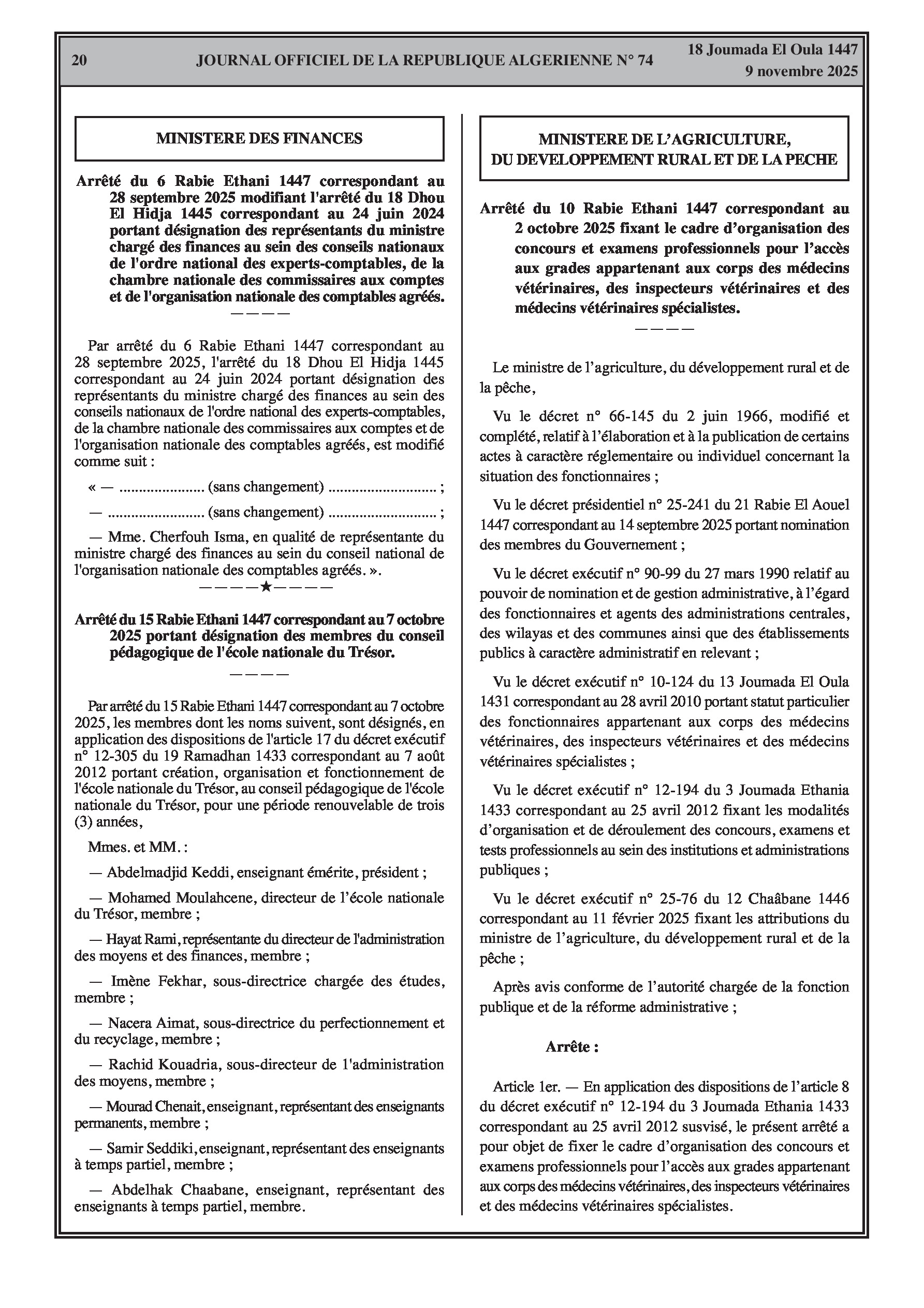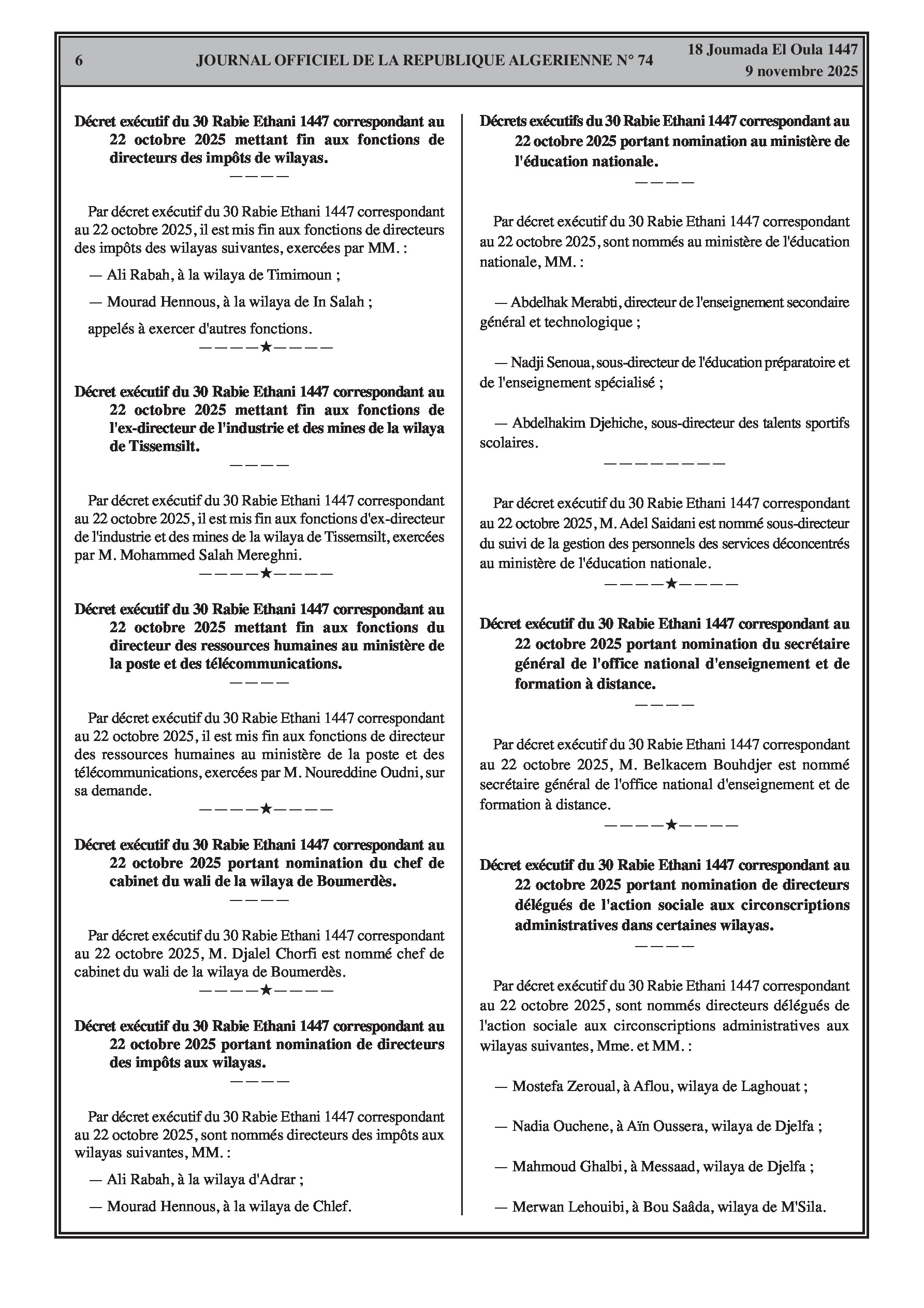 N°74 du Journal officiel de la République Algérienne Démocratique et Populaire publié le 09 novembre 2025: