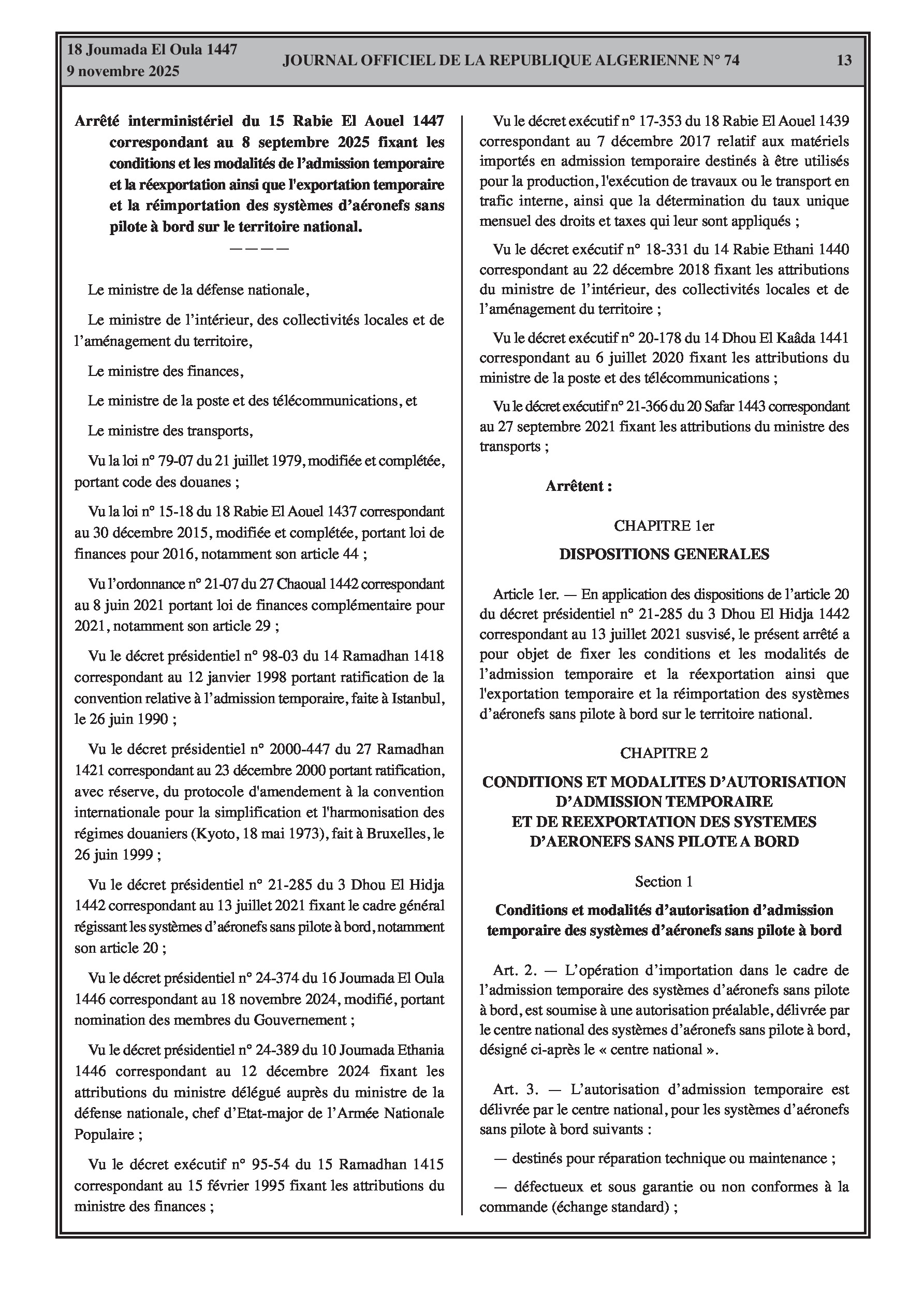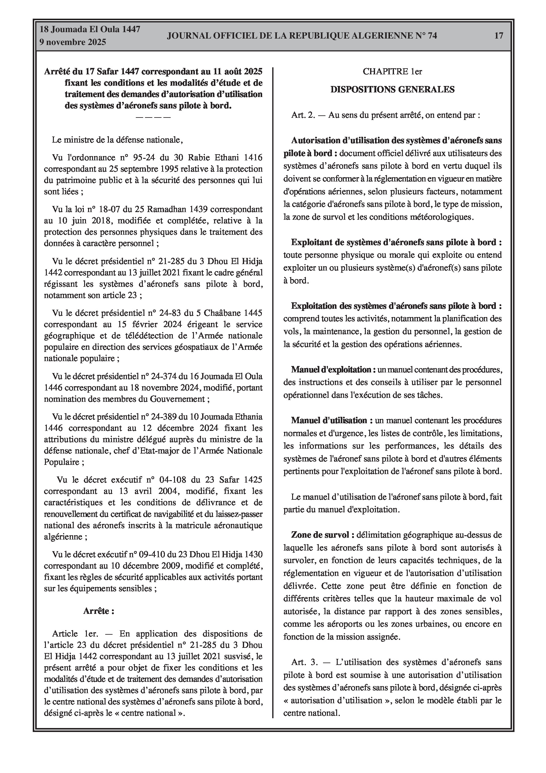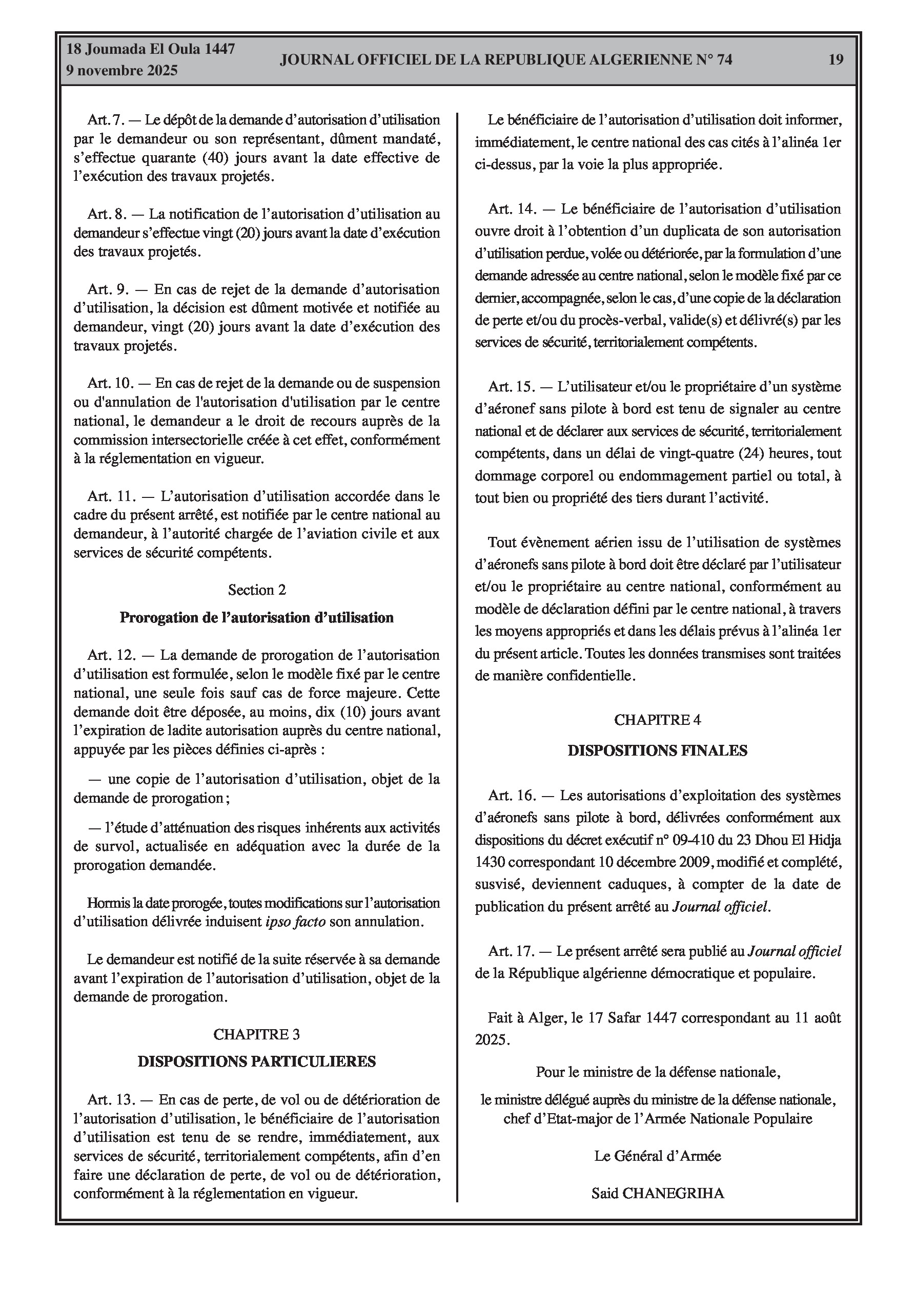 Publication d'un nouveau cadre juridique complet régissant l'utilisation des drones, désaffectation de 105 hectares de terres agricoles pour la création d'un pôle urbain à Ramdane Djamel (Skikda), et une série de nominations à de hauts postes de l'État.