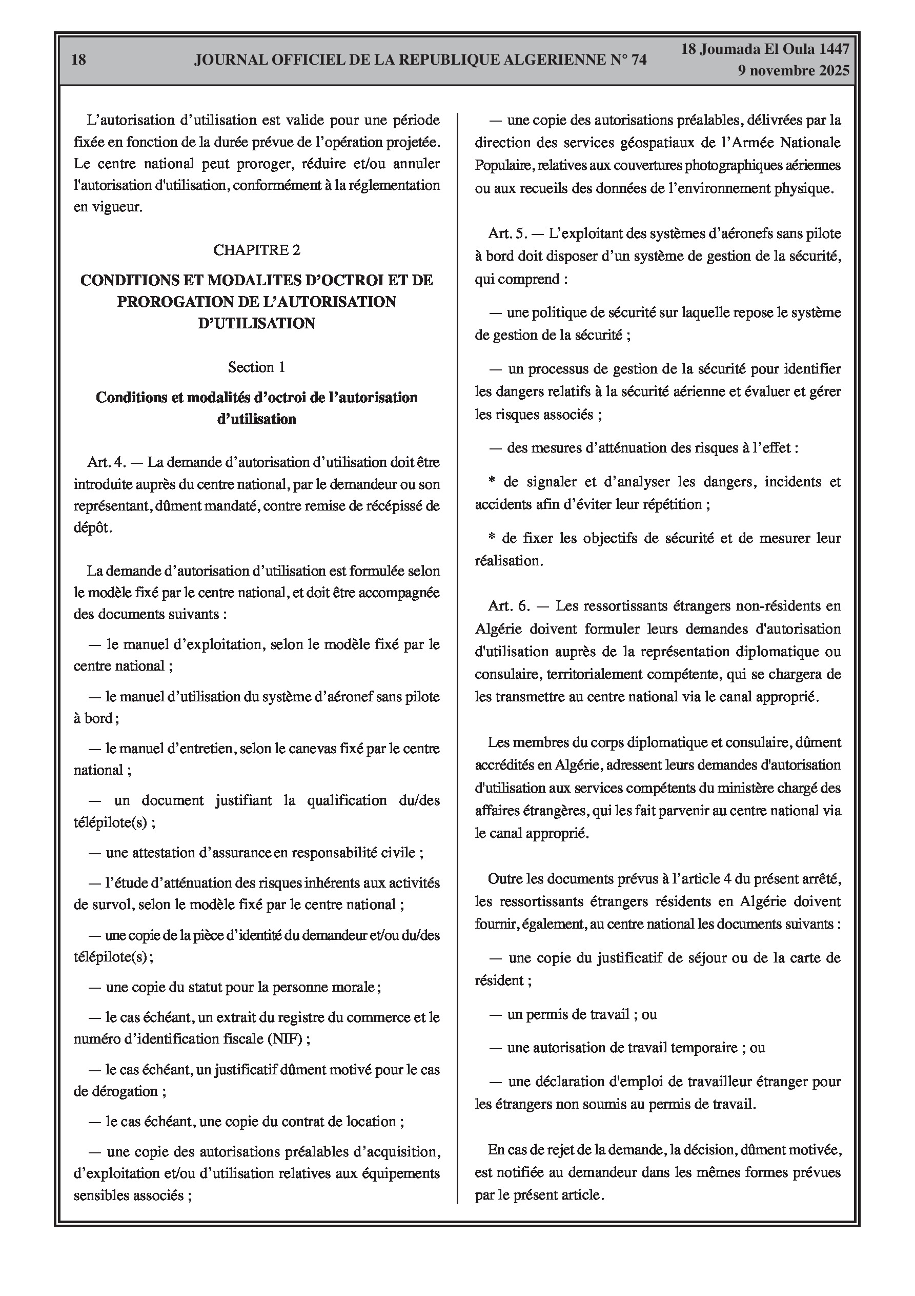 • **Autorisation d'Utilisation**: Un nouveau processus d'autorisation est créé pour toute utilisation de drone, définissant les exigences pour les opérateurs, y compris les ressortissants étrangers. Les autorisations précédentes sont annulées.
